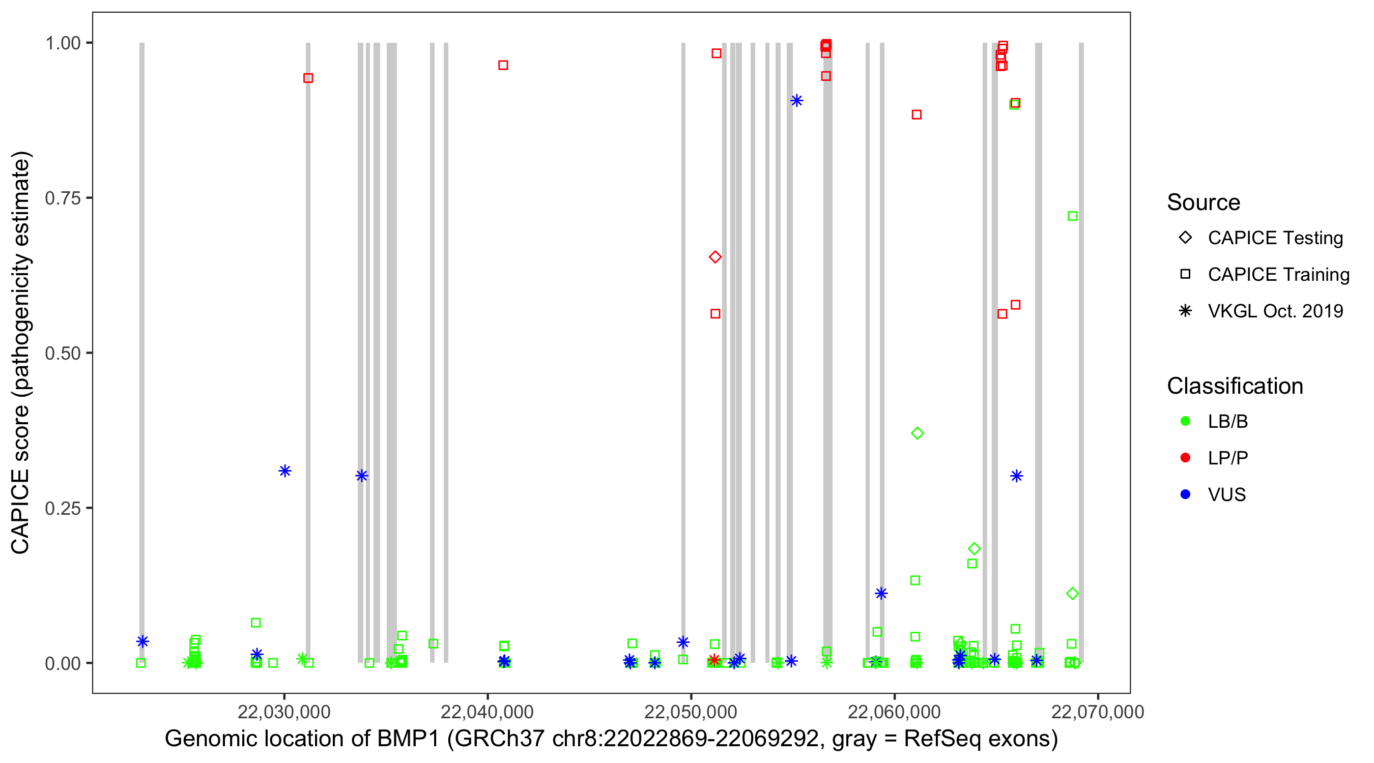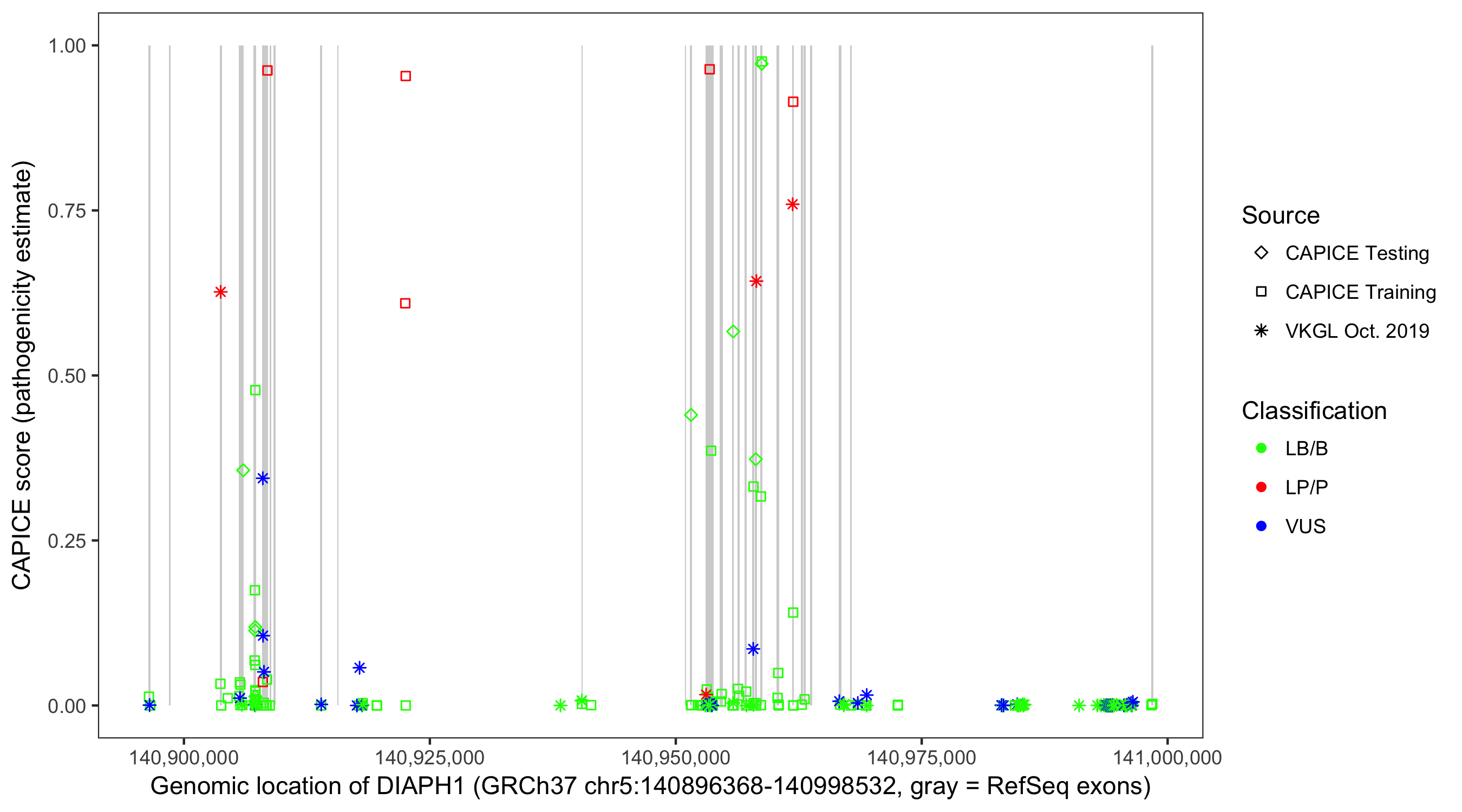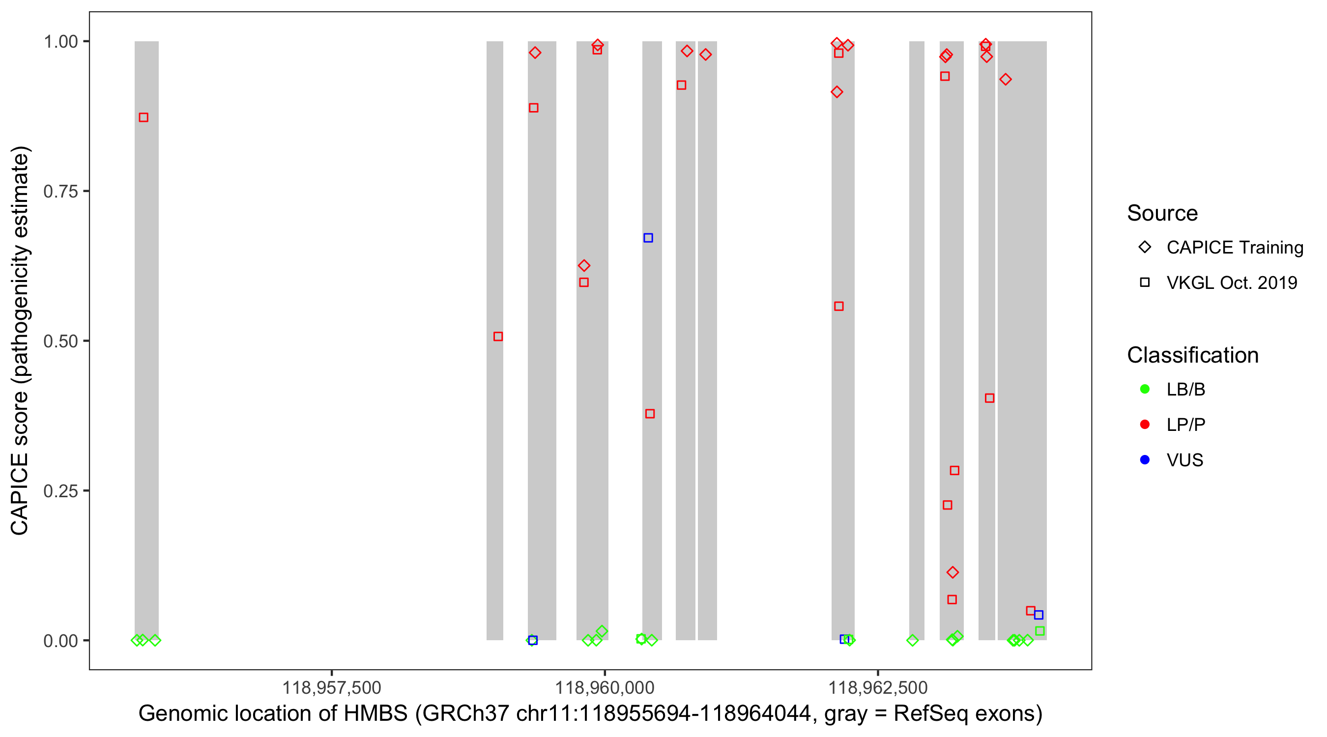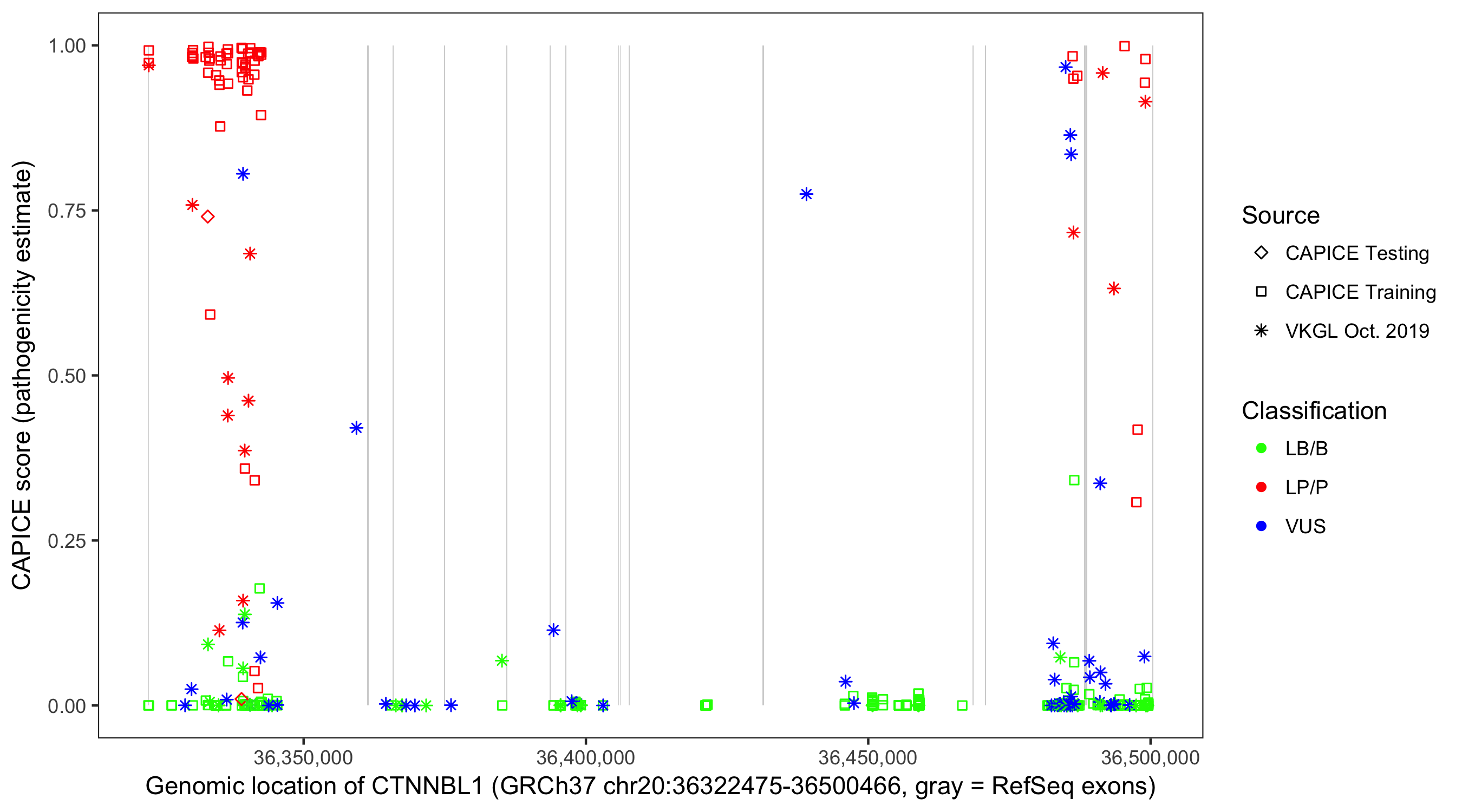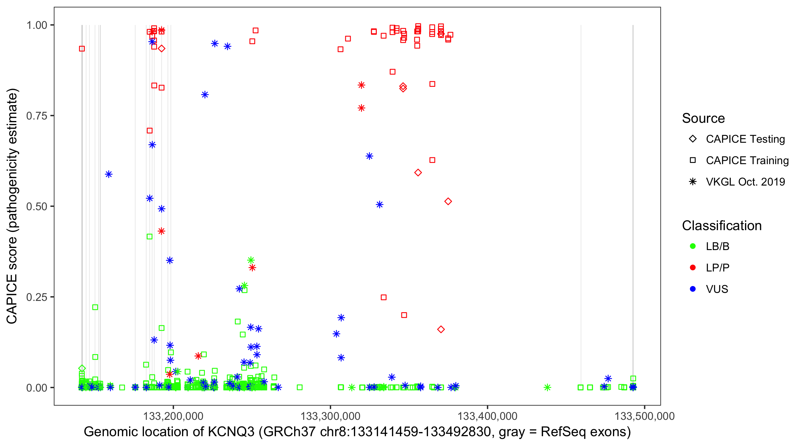 Shown are CAPICE train/test variants plus VKGL Oct 2019.