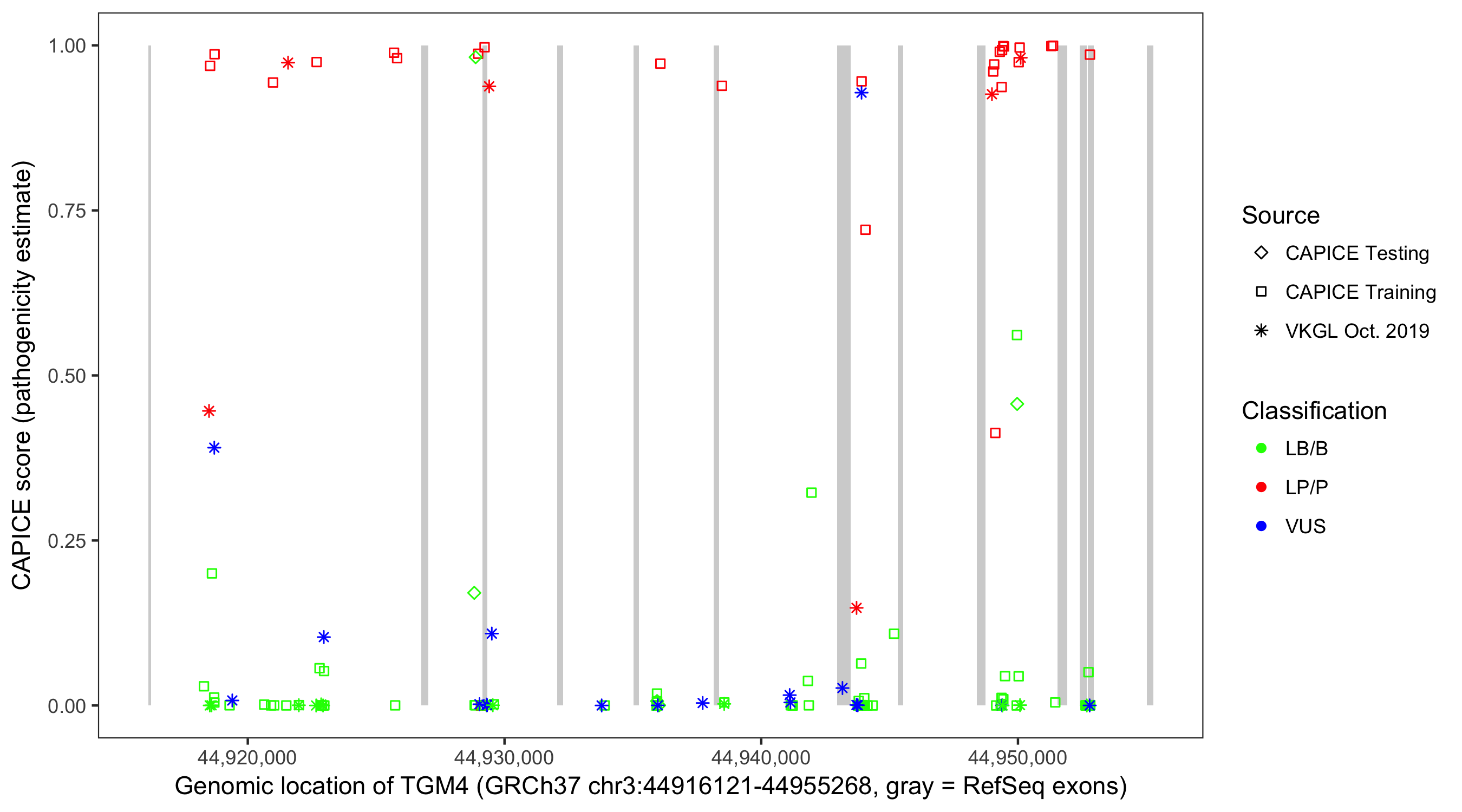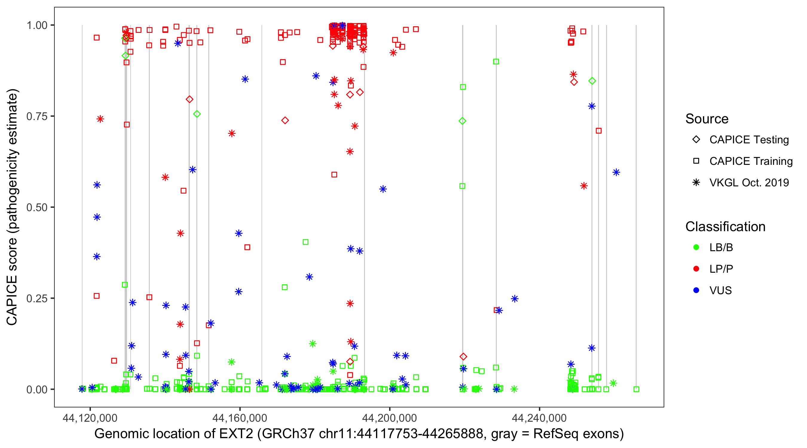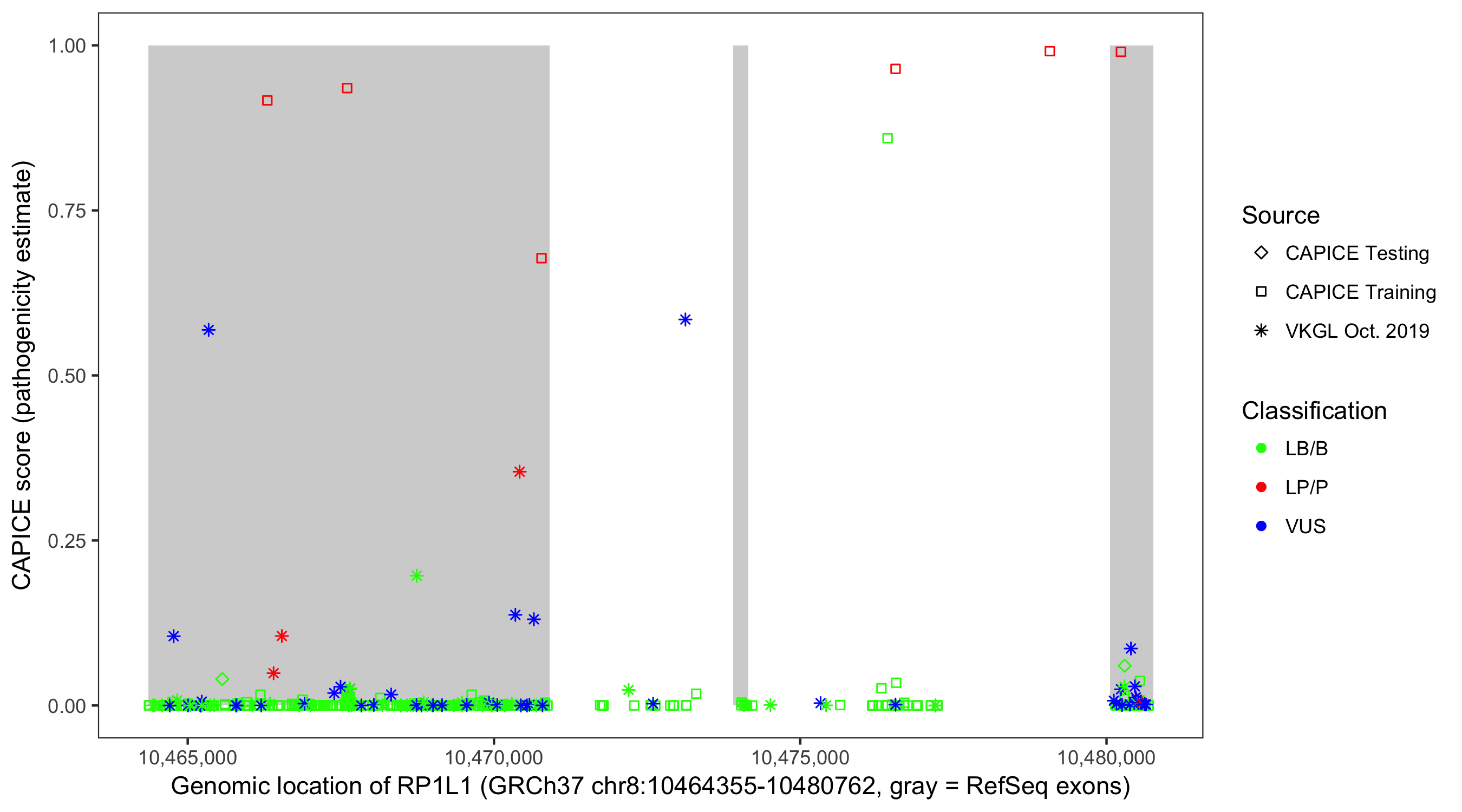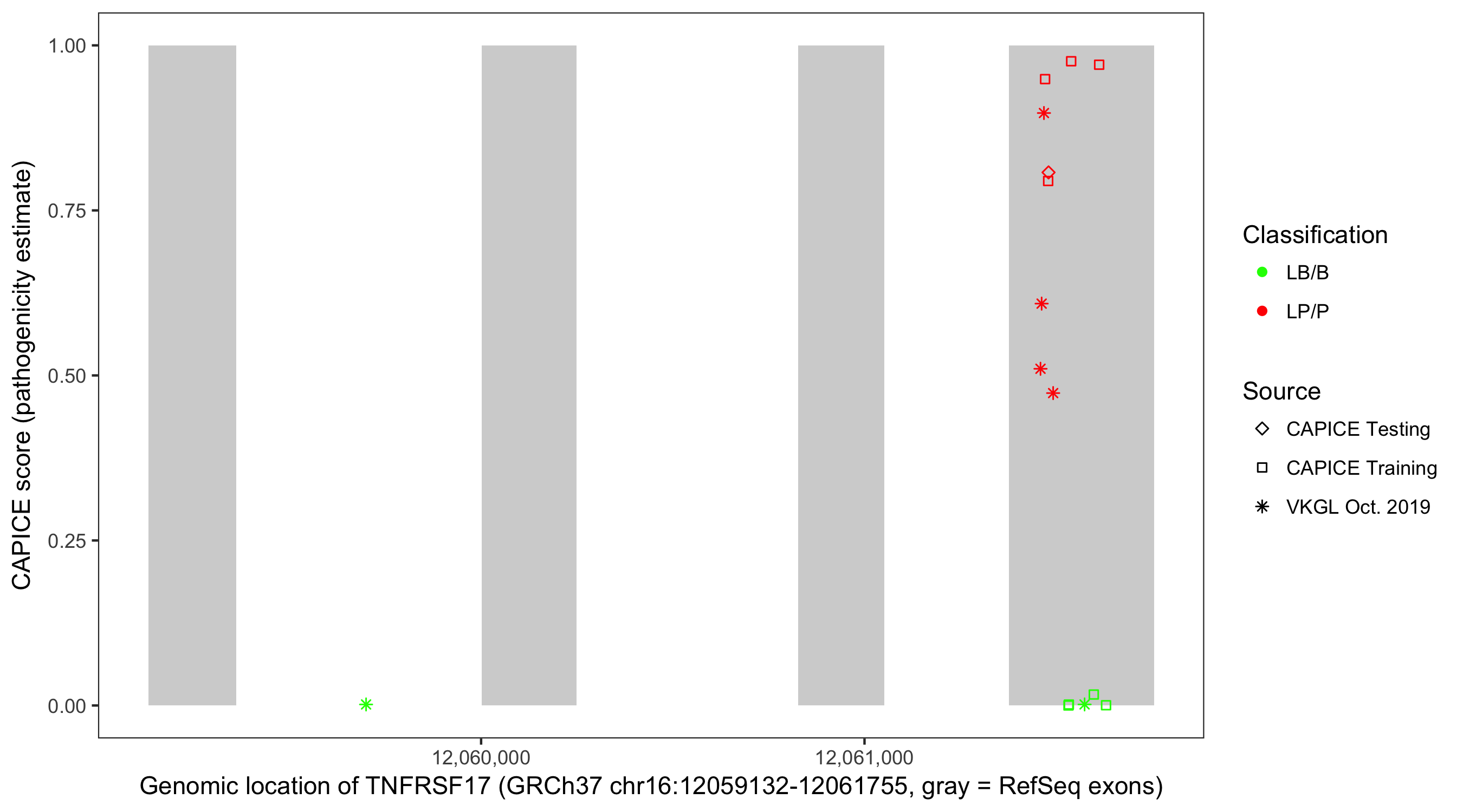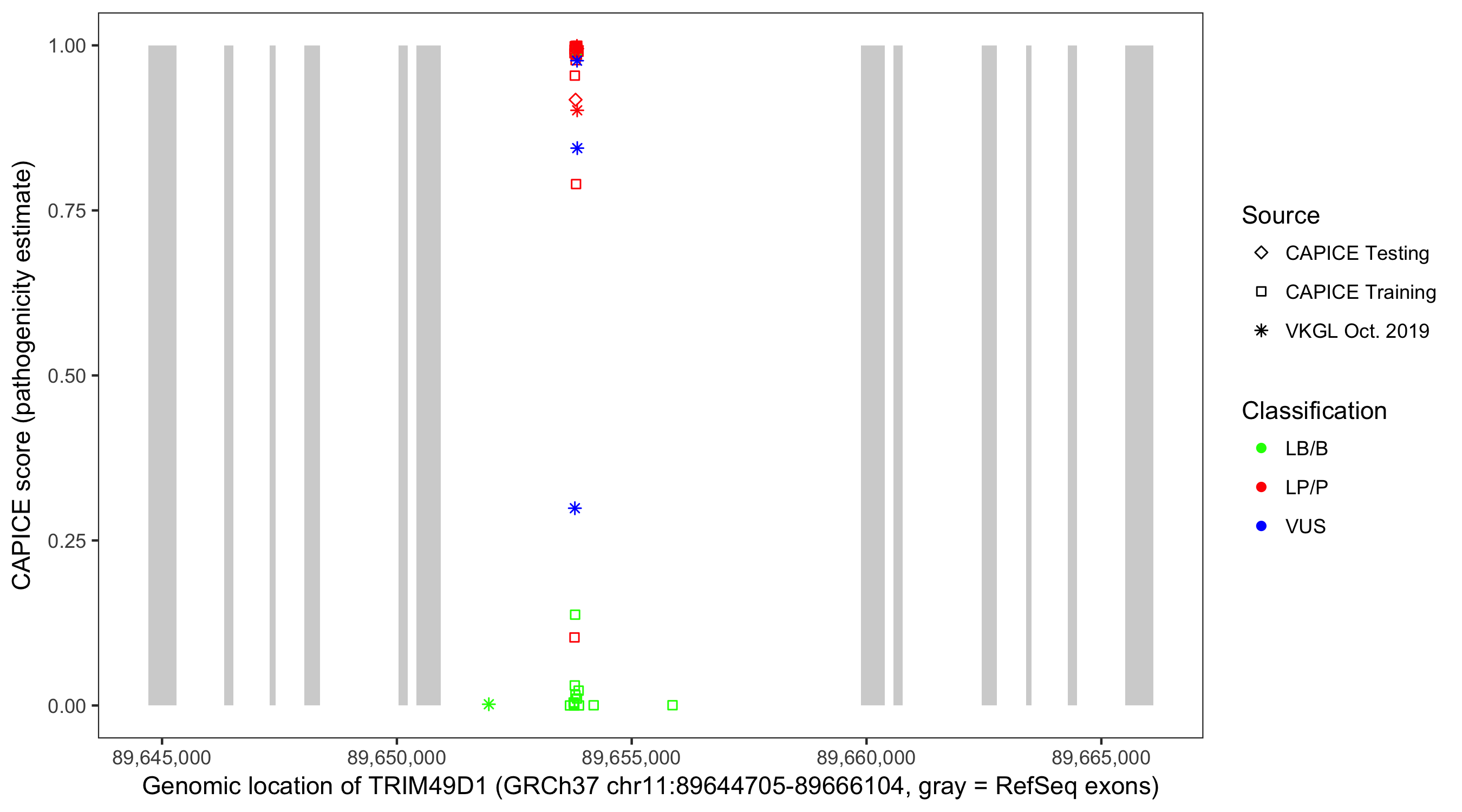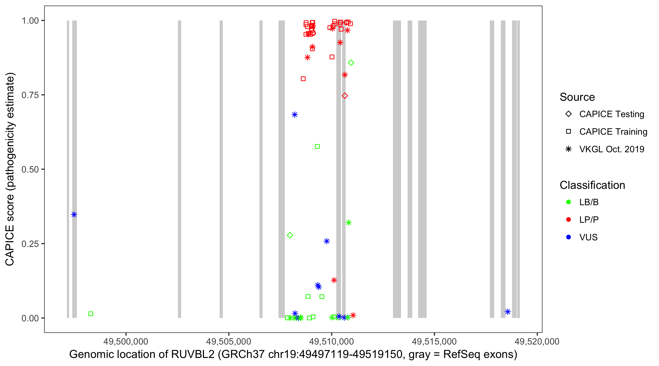 Shown are CAPICE train/test variants plus VKGL Oct 2019.