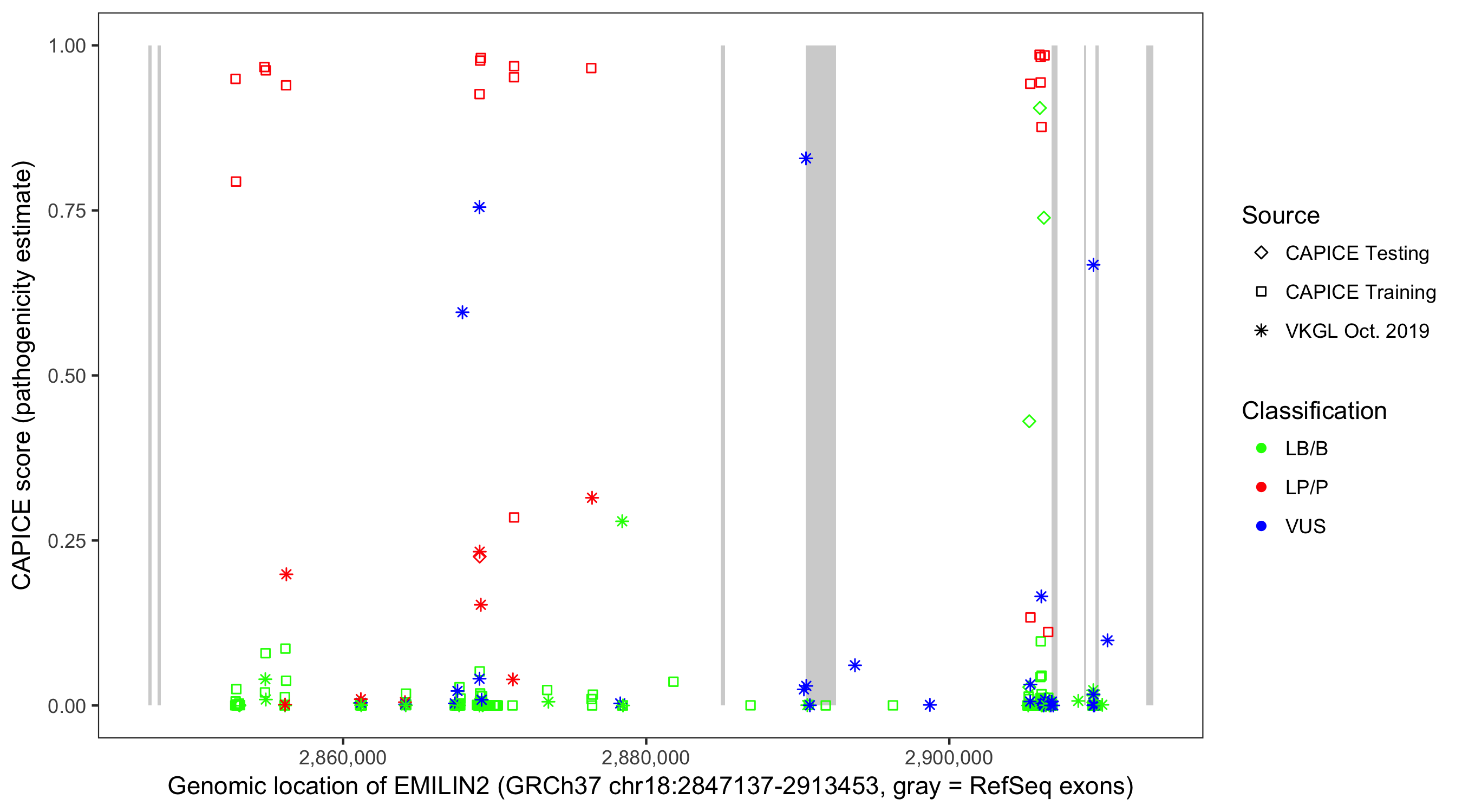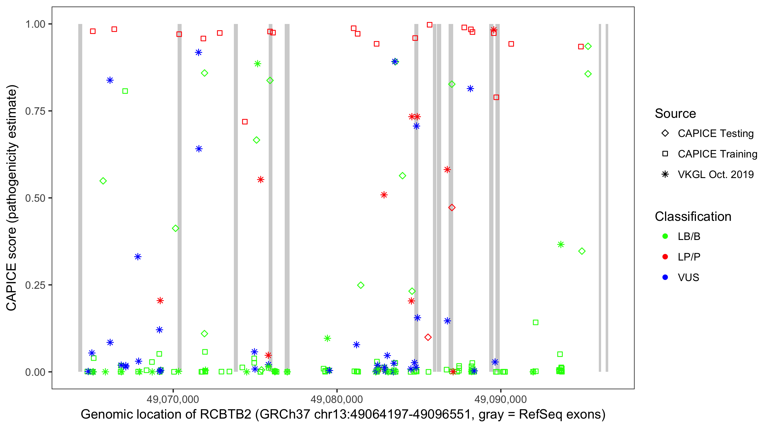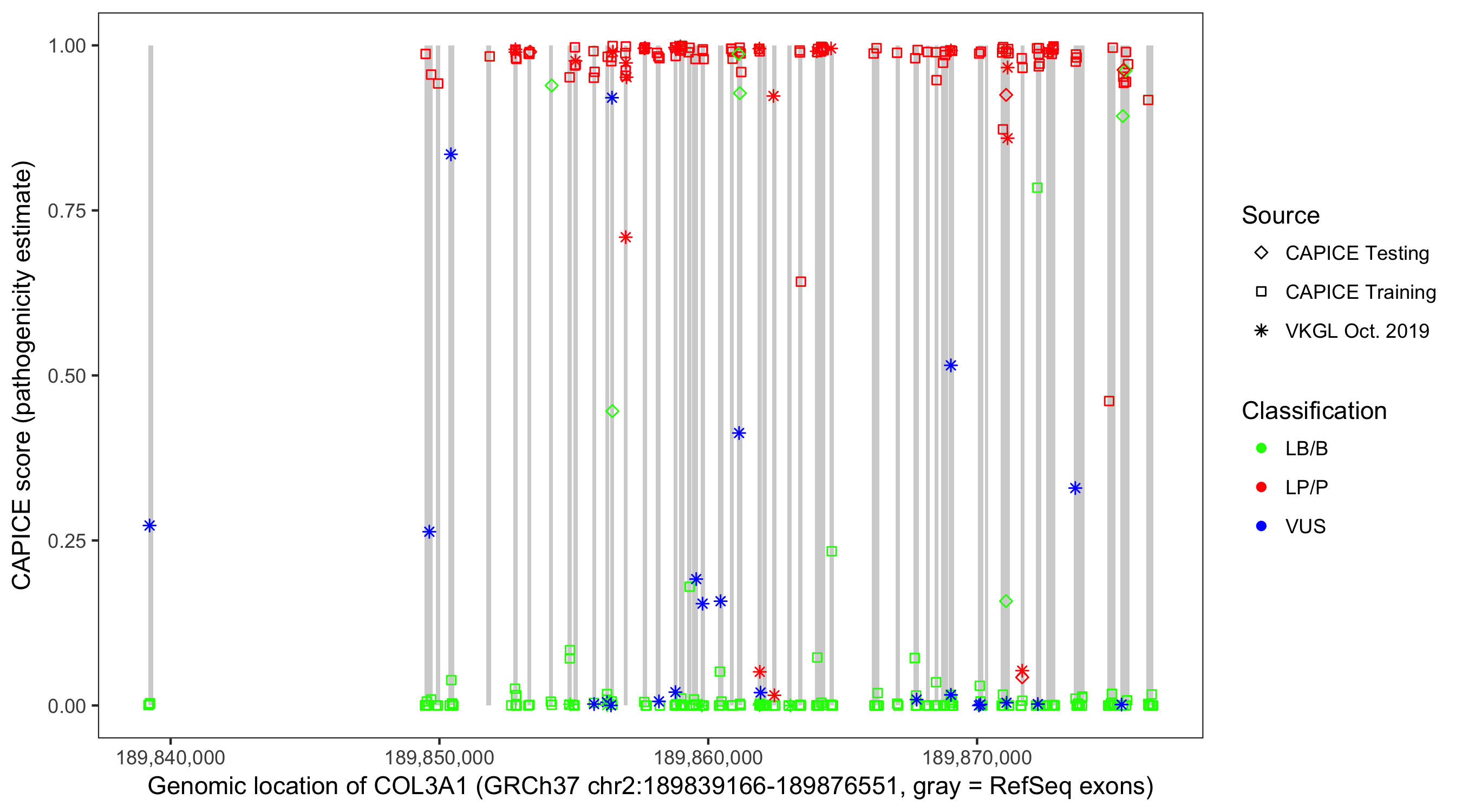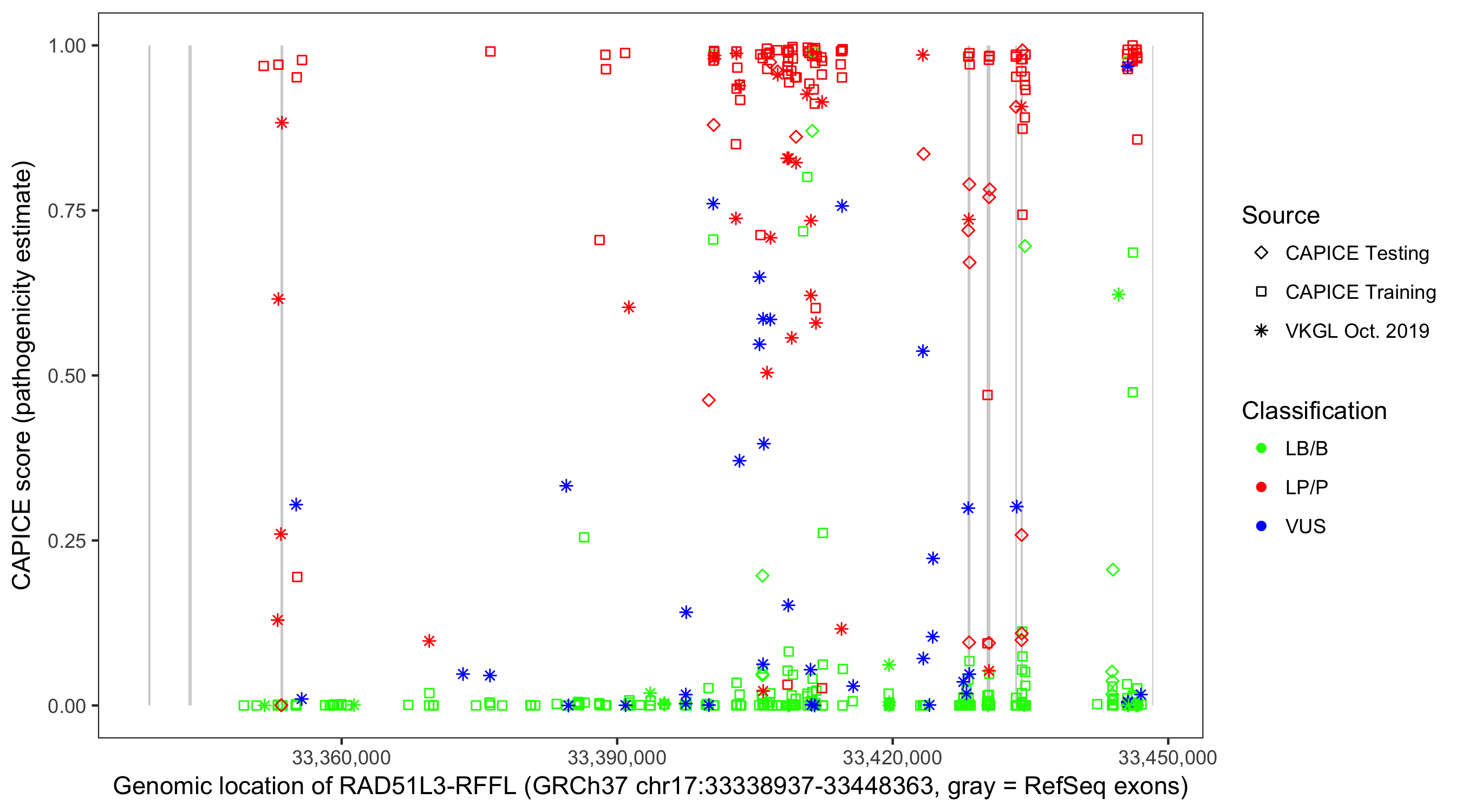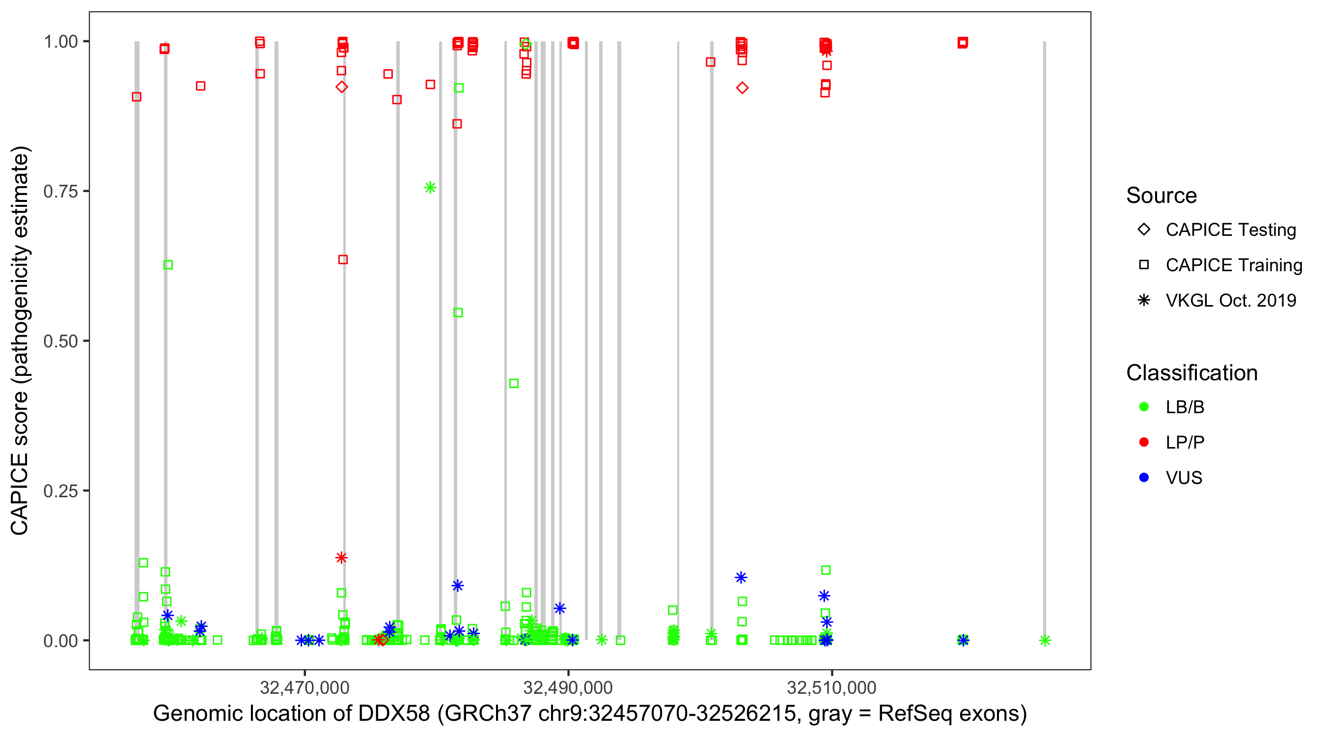 Shown are CAPICE train/test variants plus VKGL Oct 2019.
