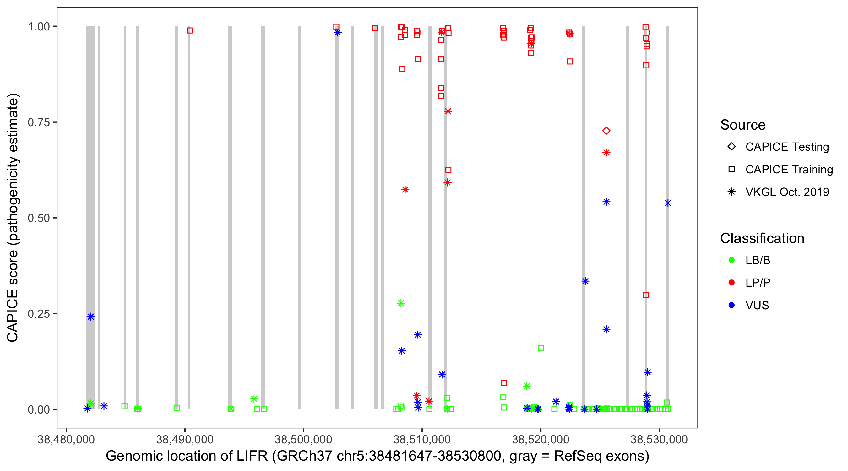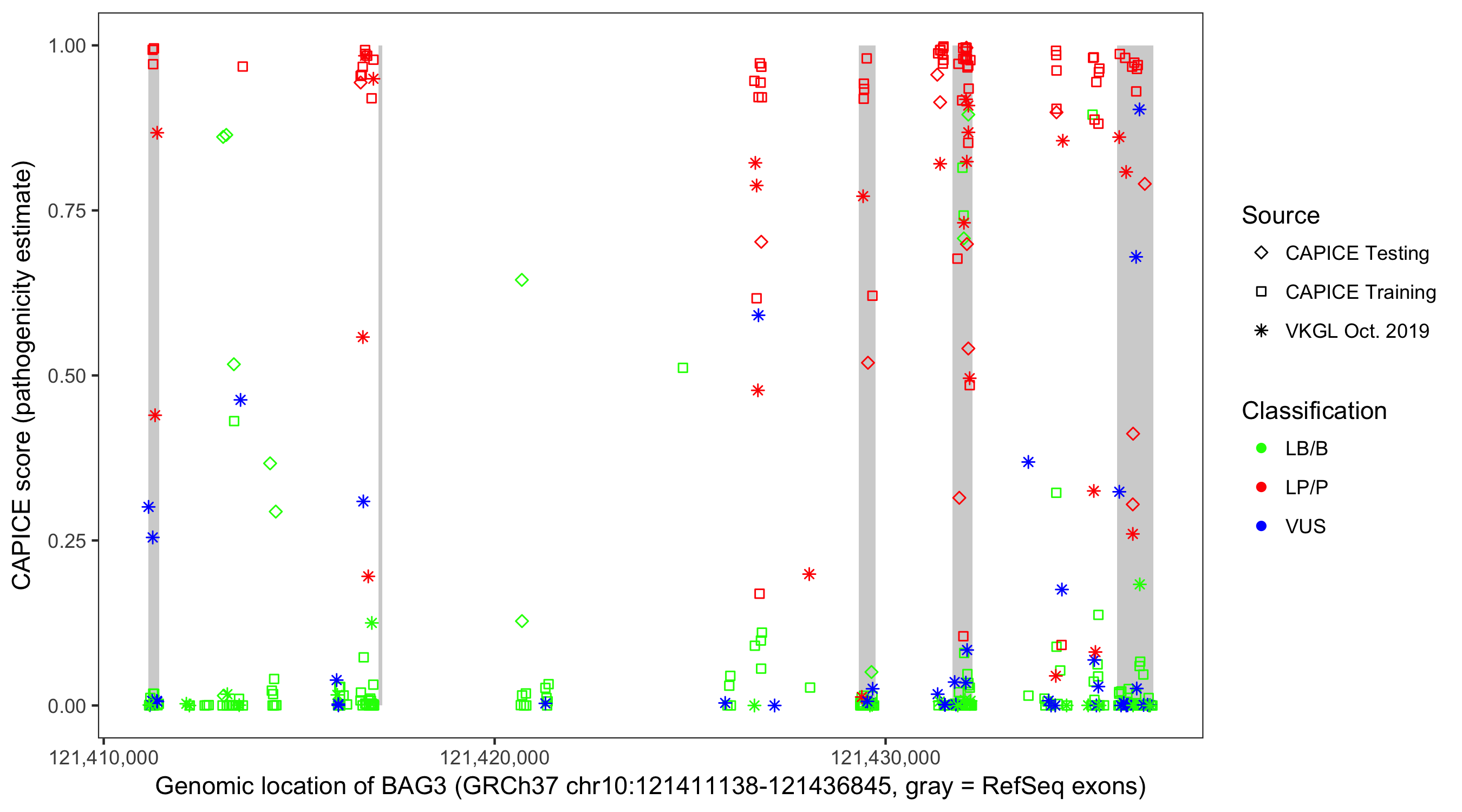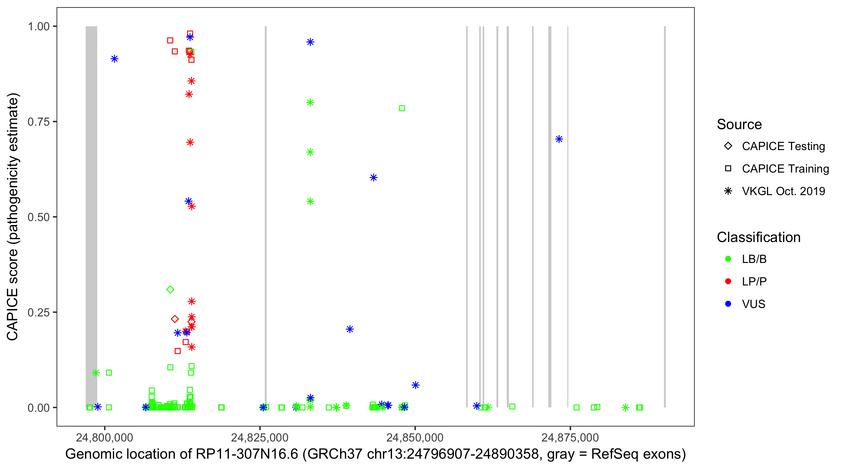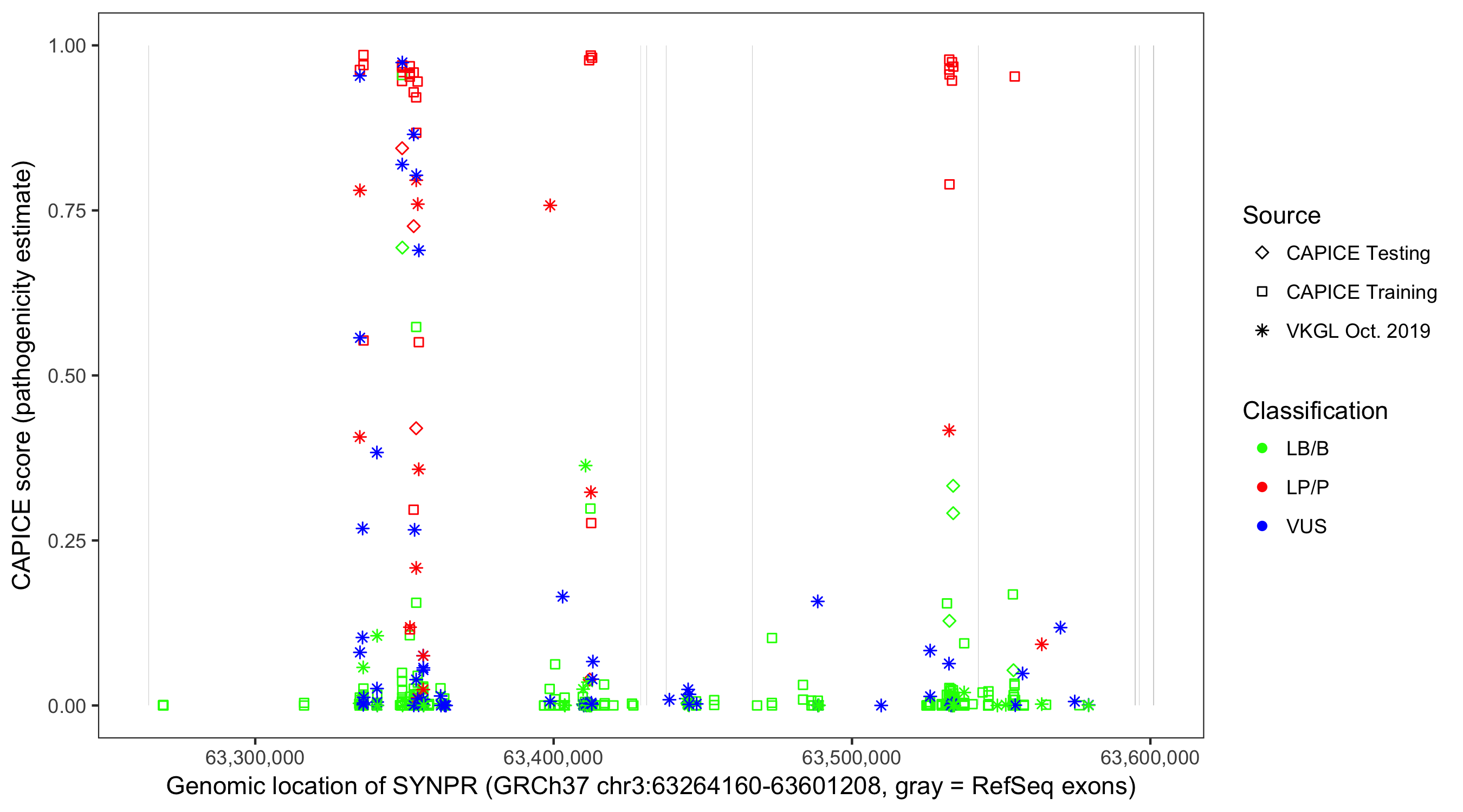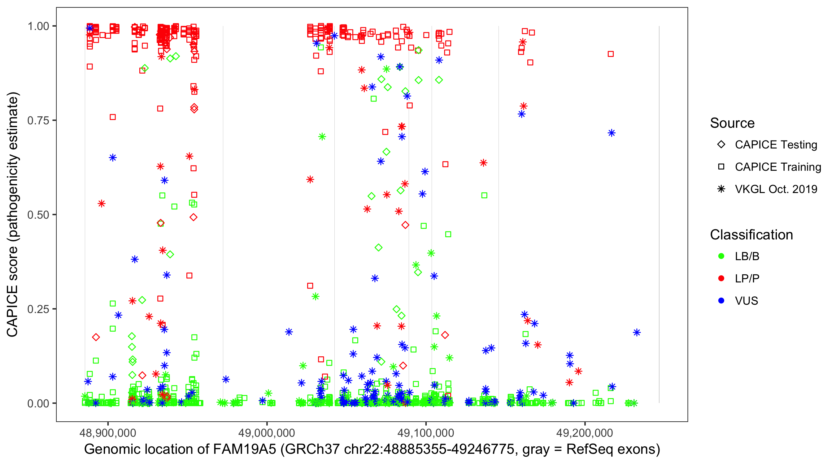 Shown are CAPICE train/test variants plus VKGL Oct 2019.