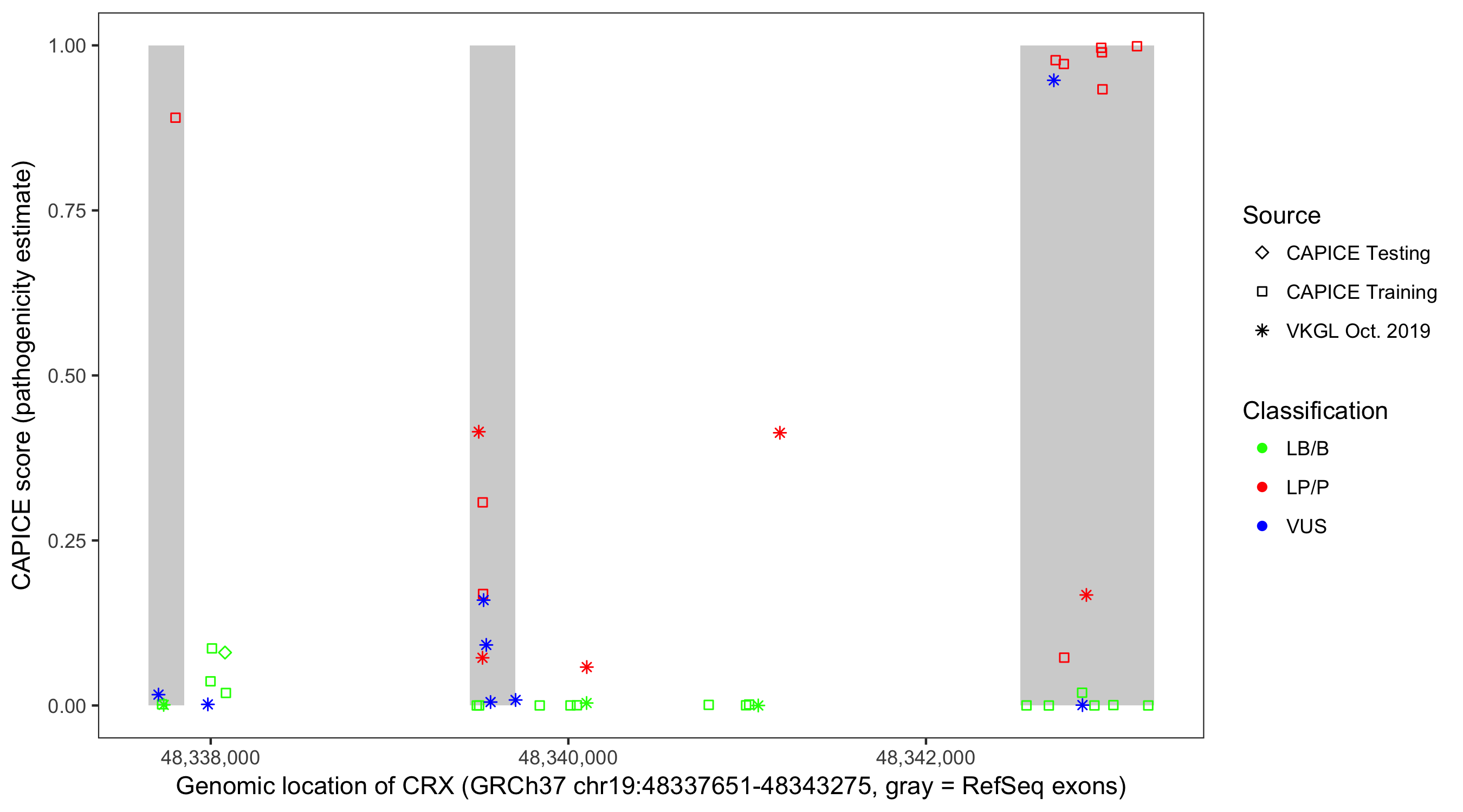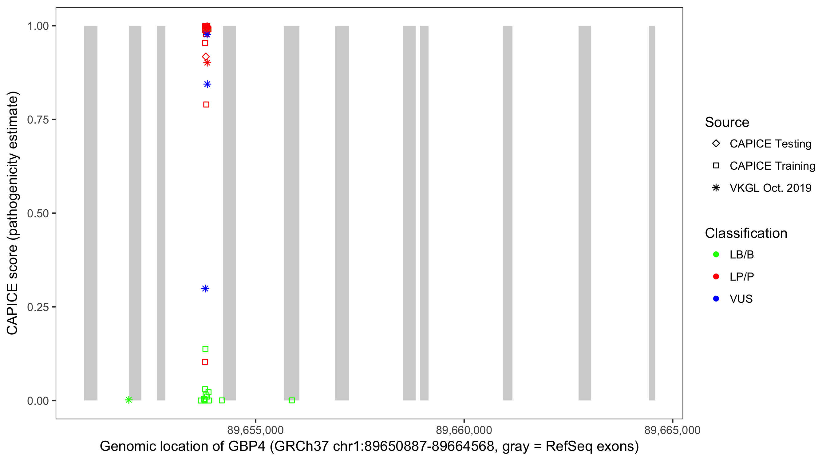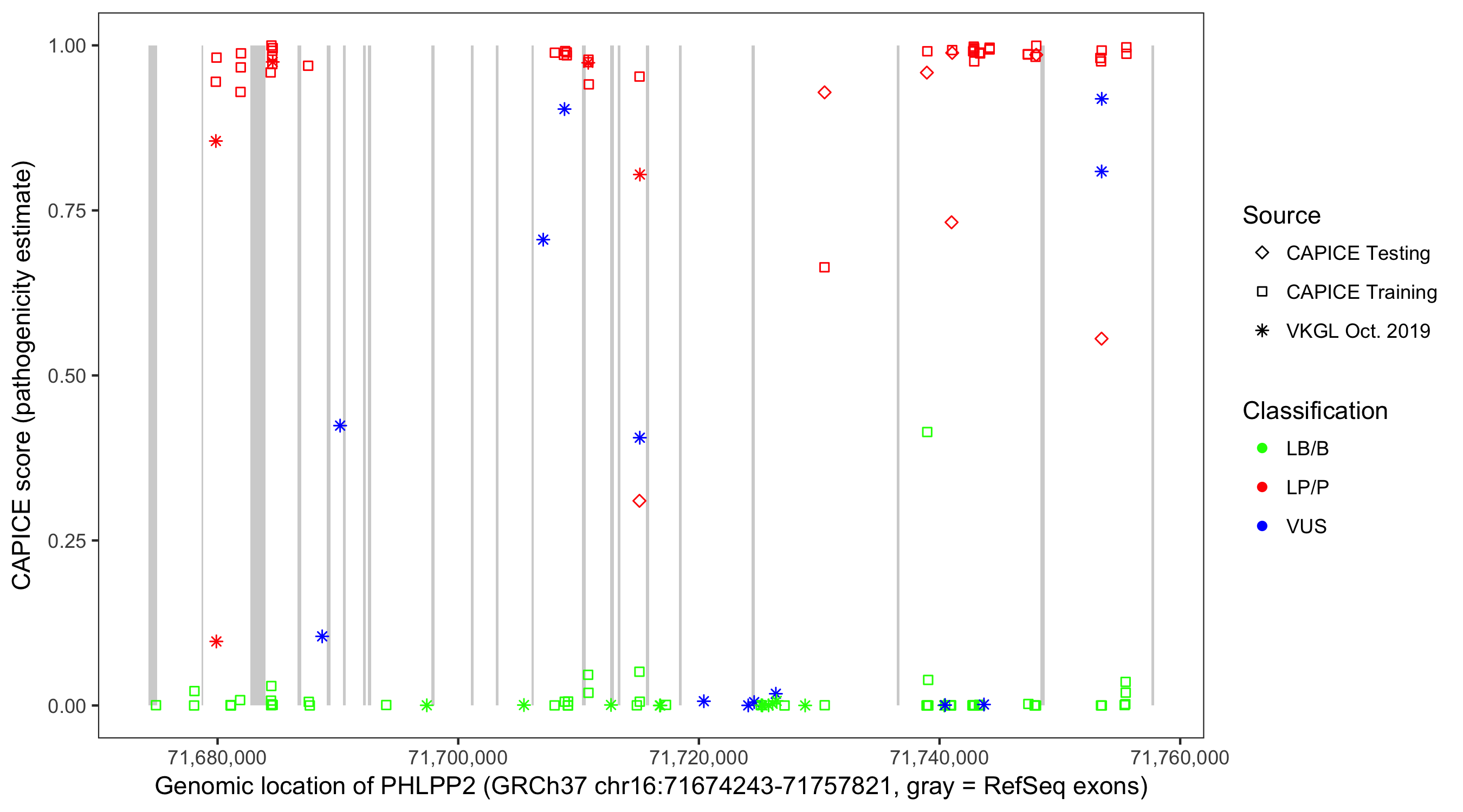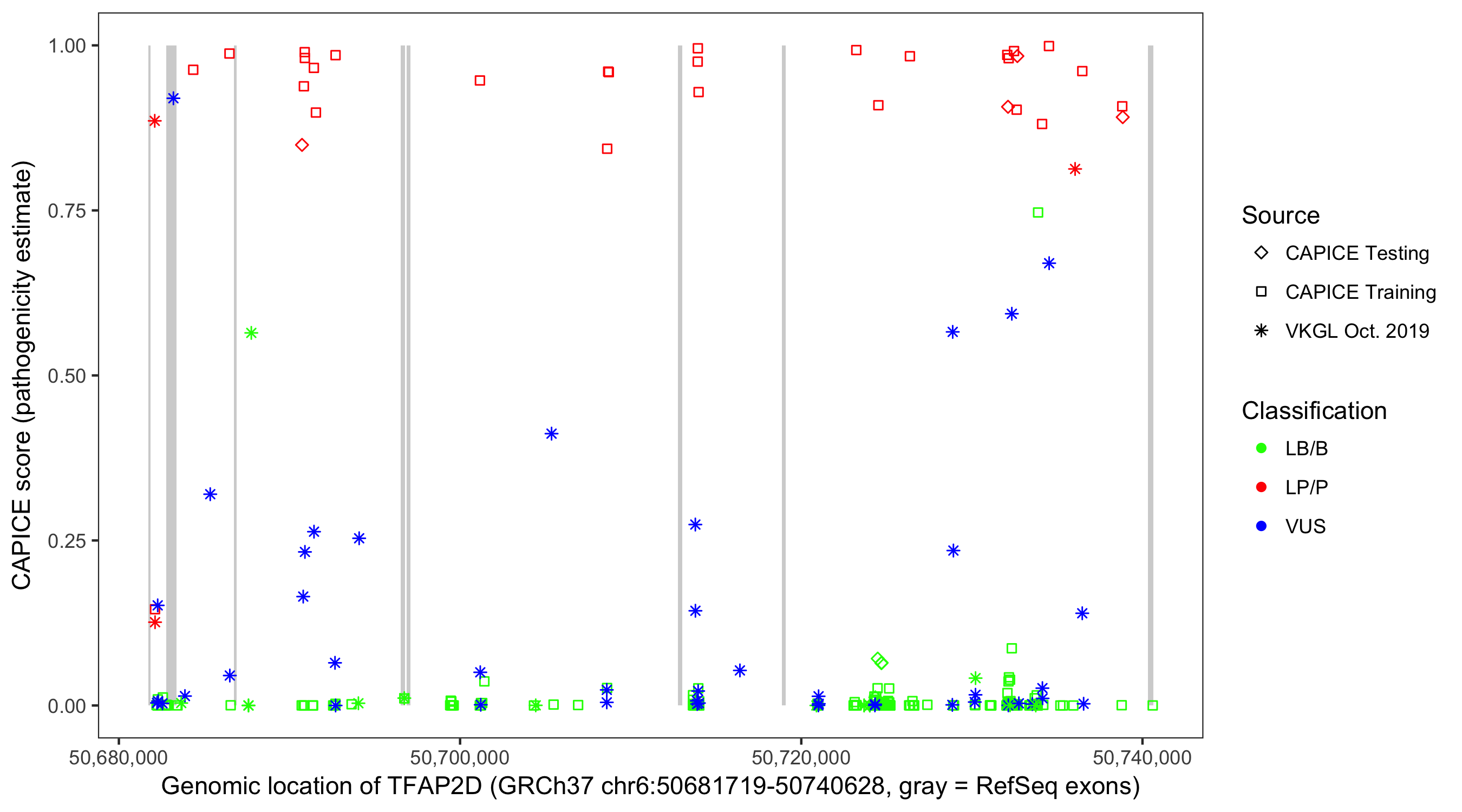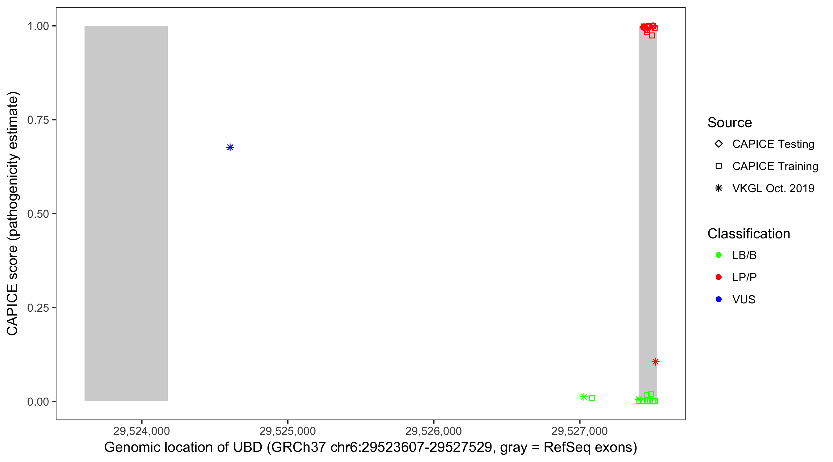 Shown are CAPICE train/test variants plus VKGL Oct 2019.