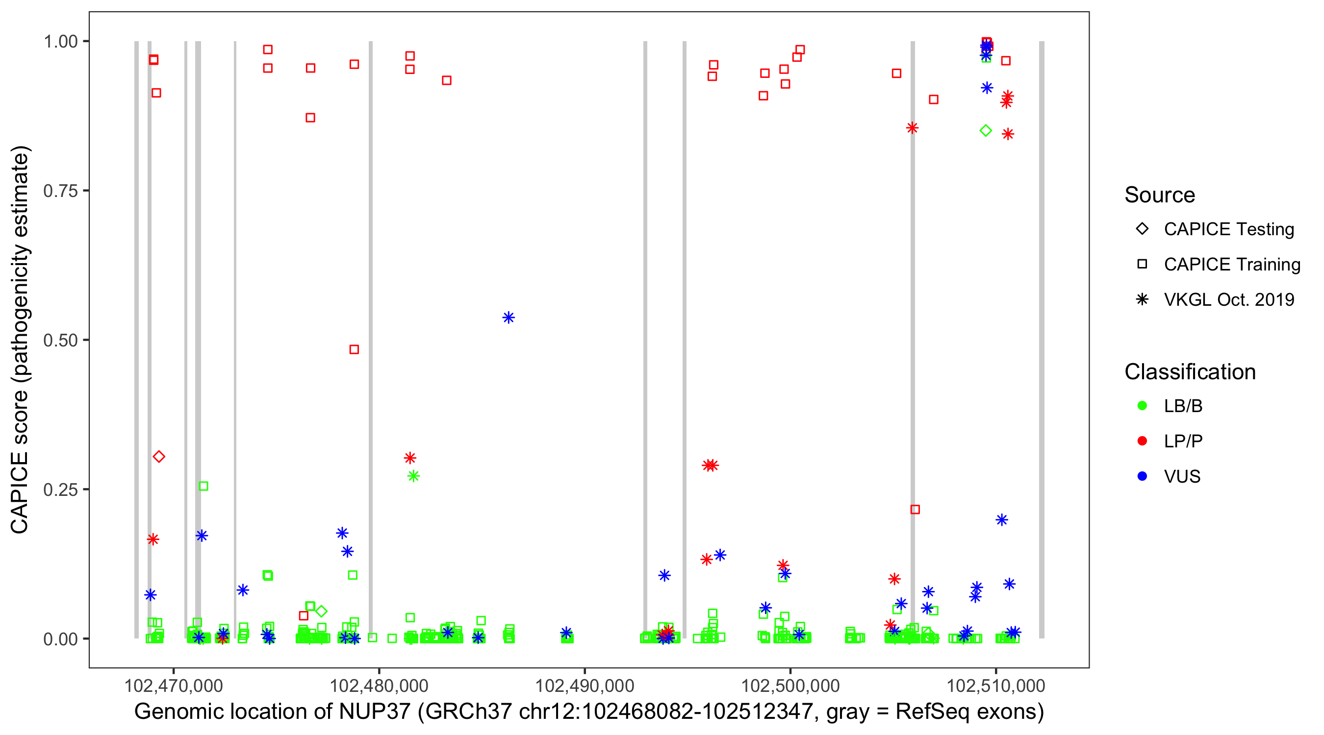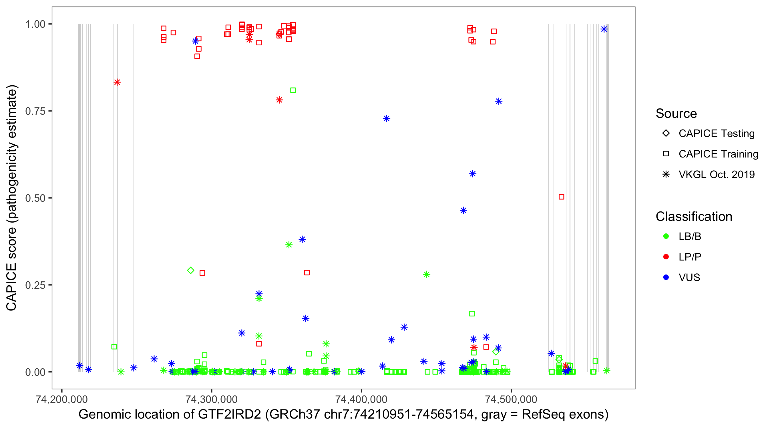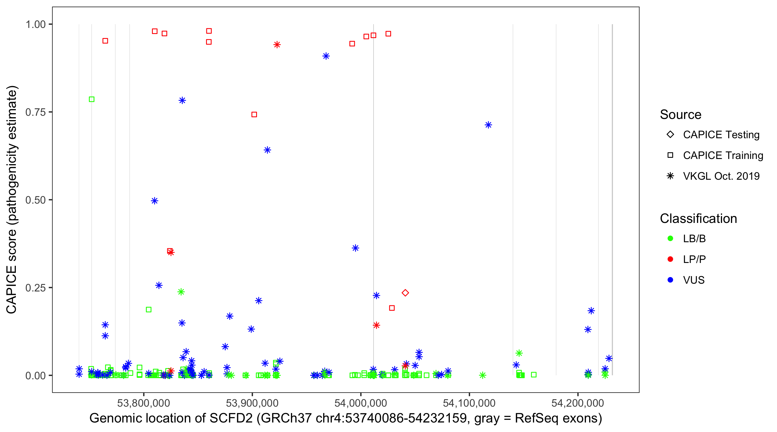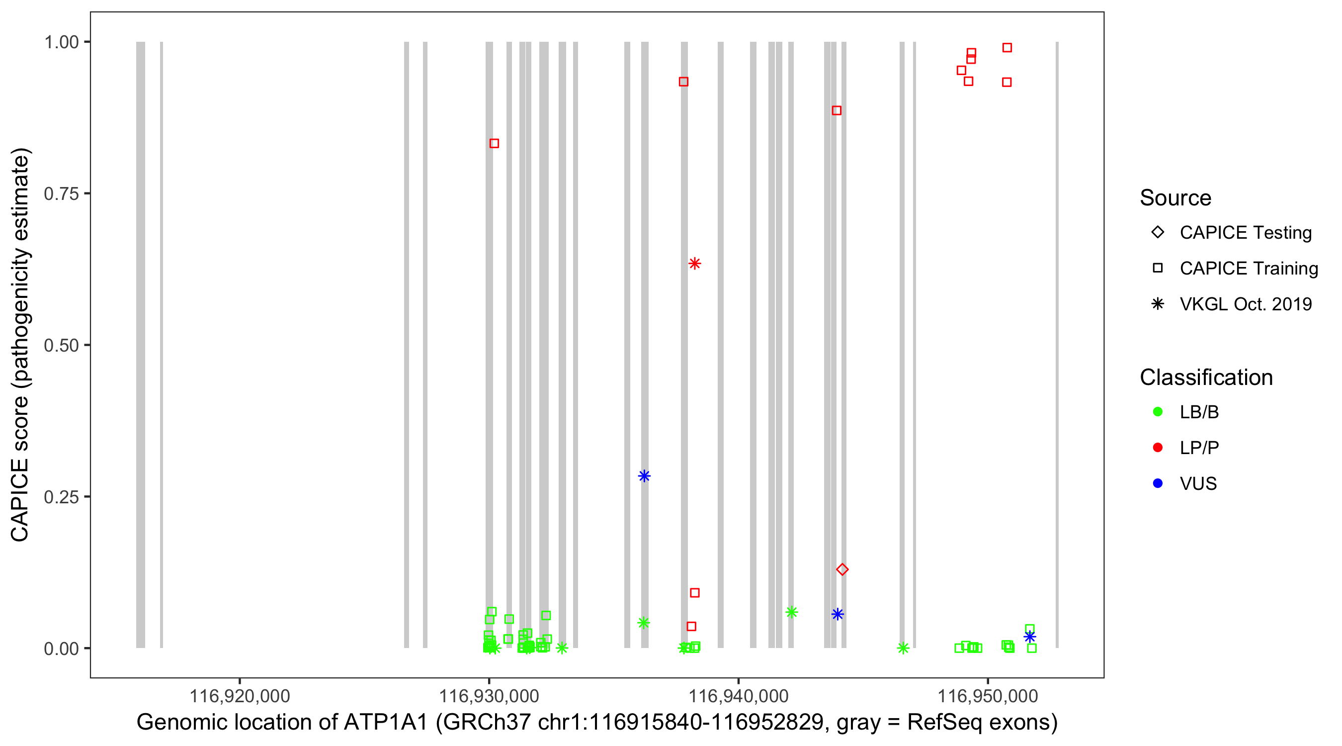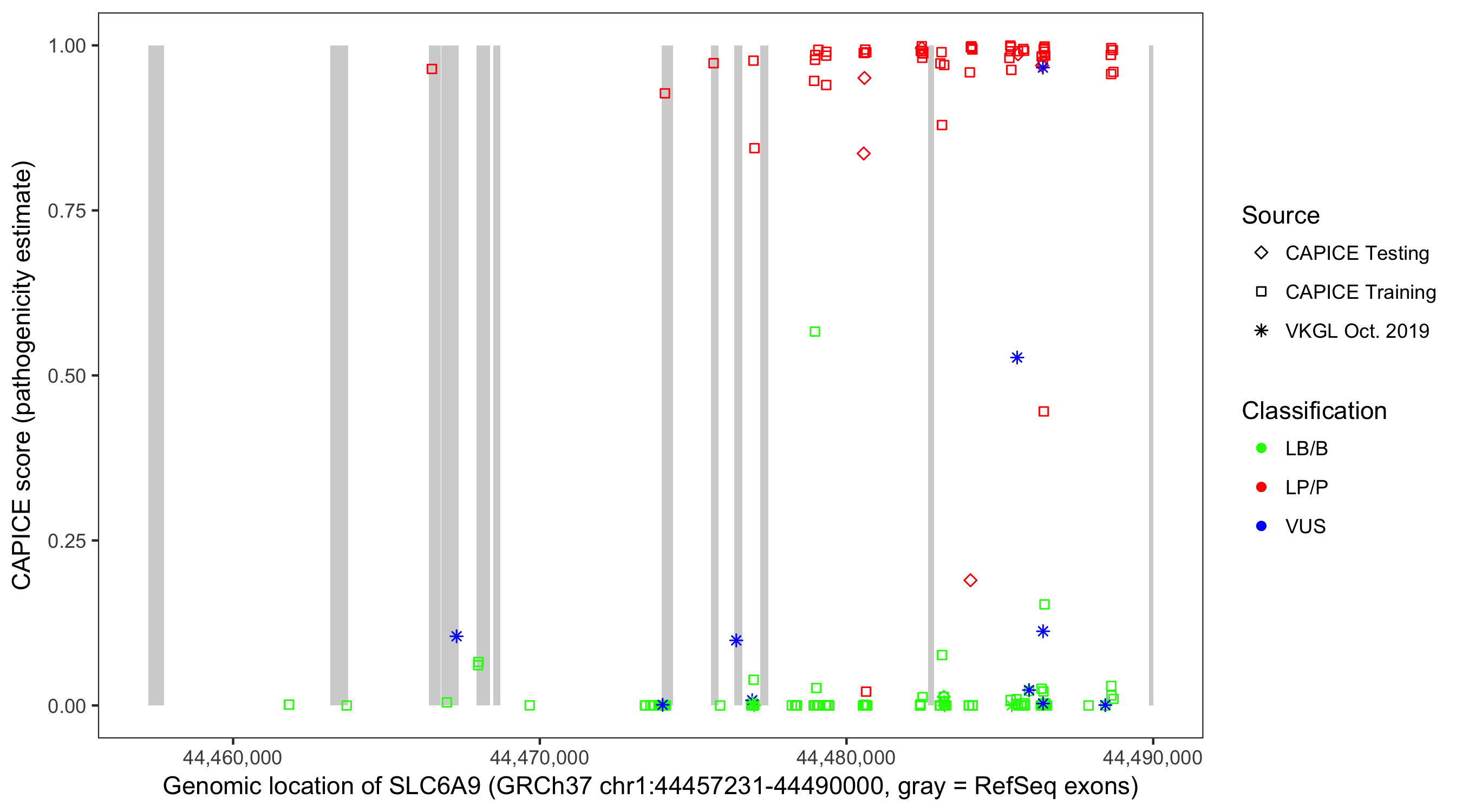Shown are CAPICE train/test variants plus VKGL Oct 2019.
