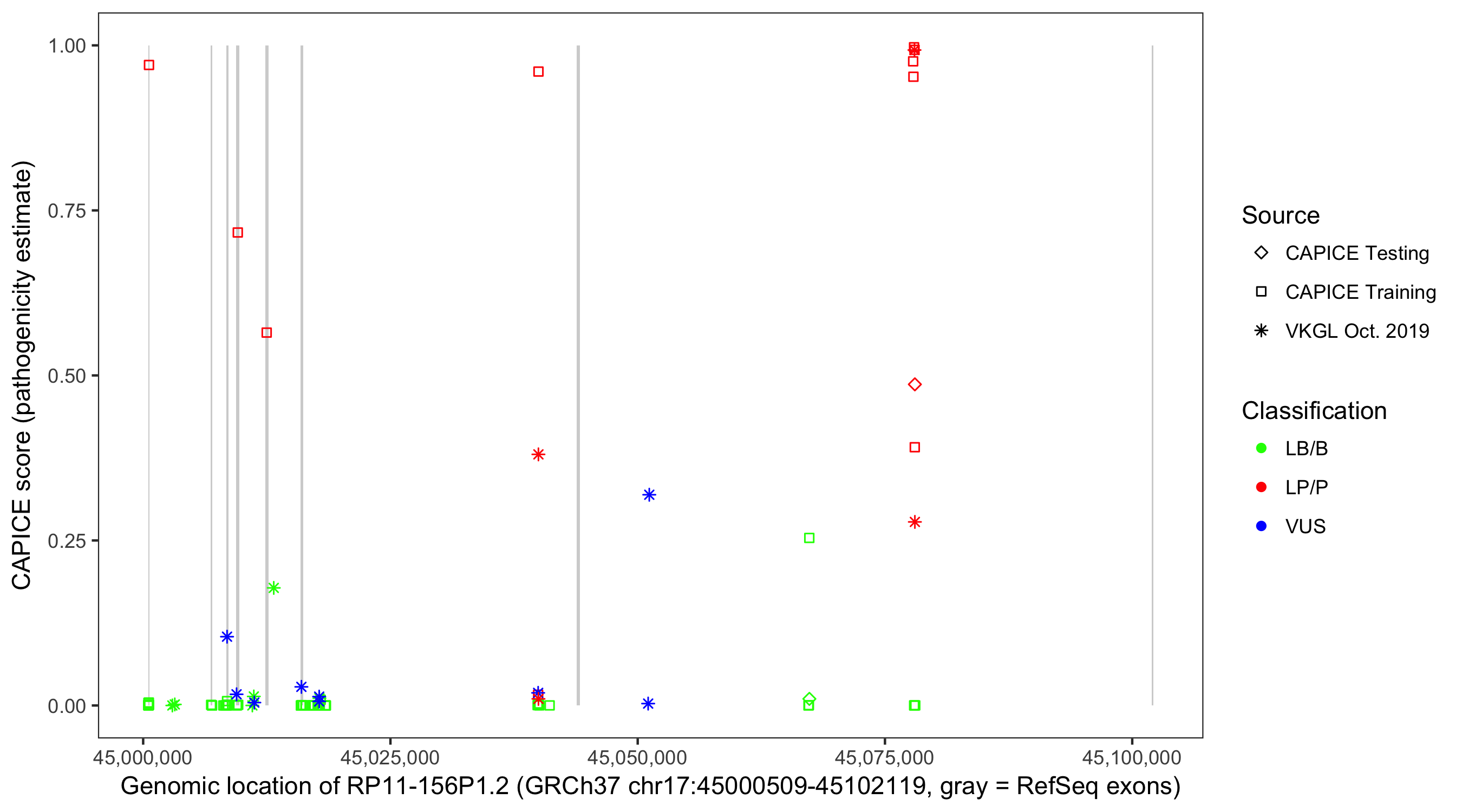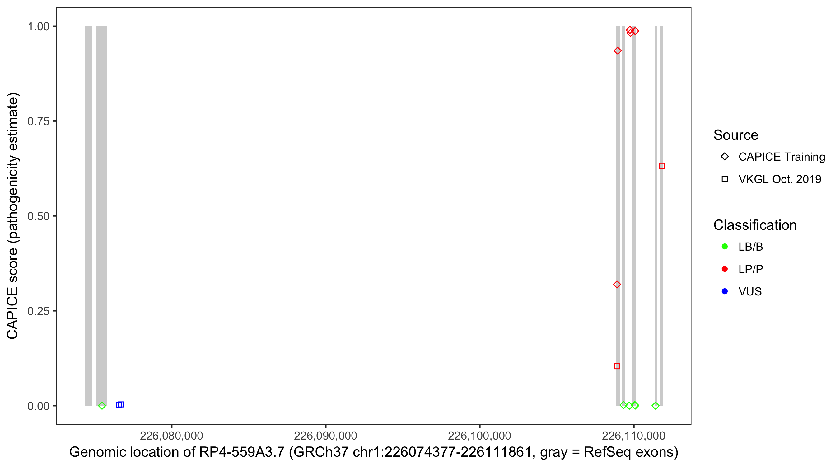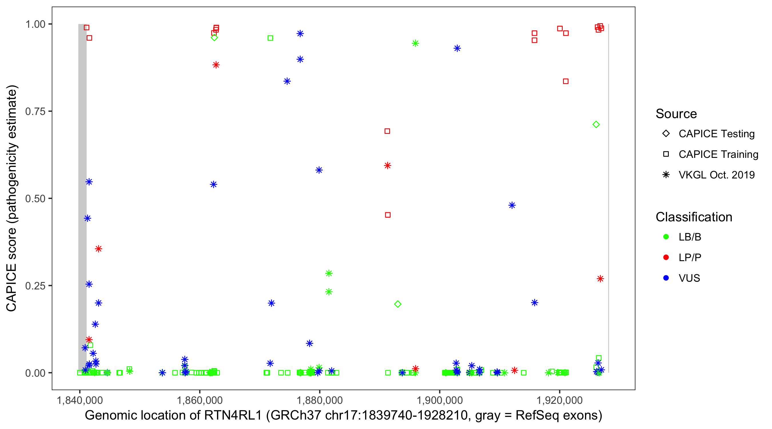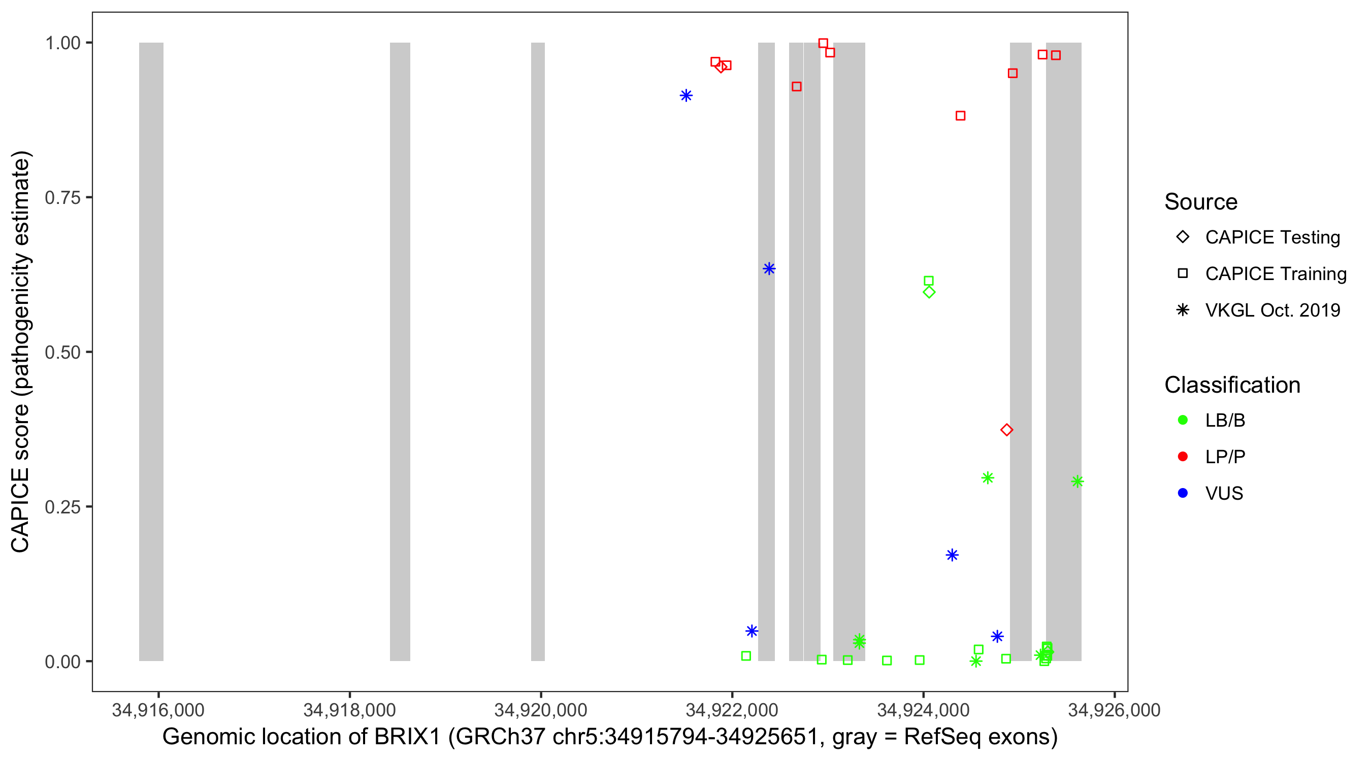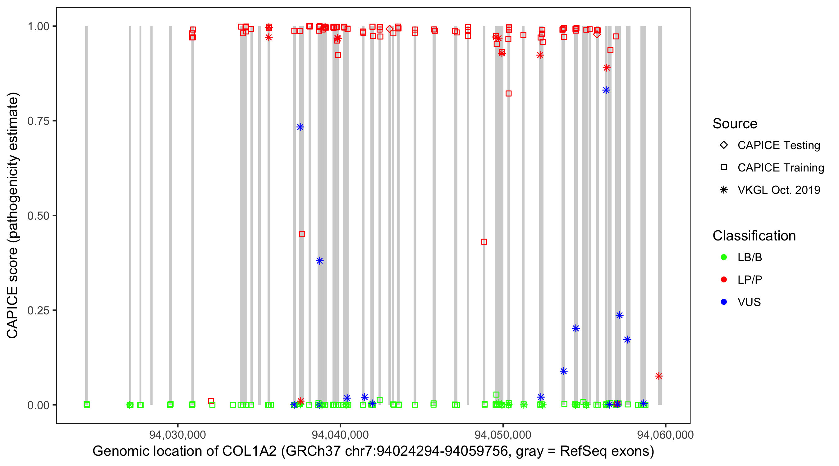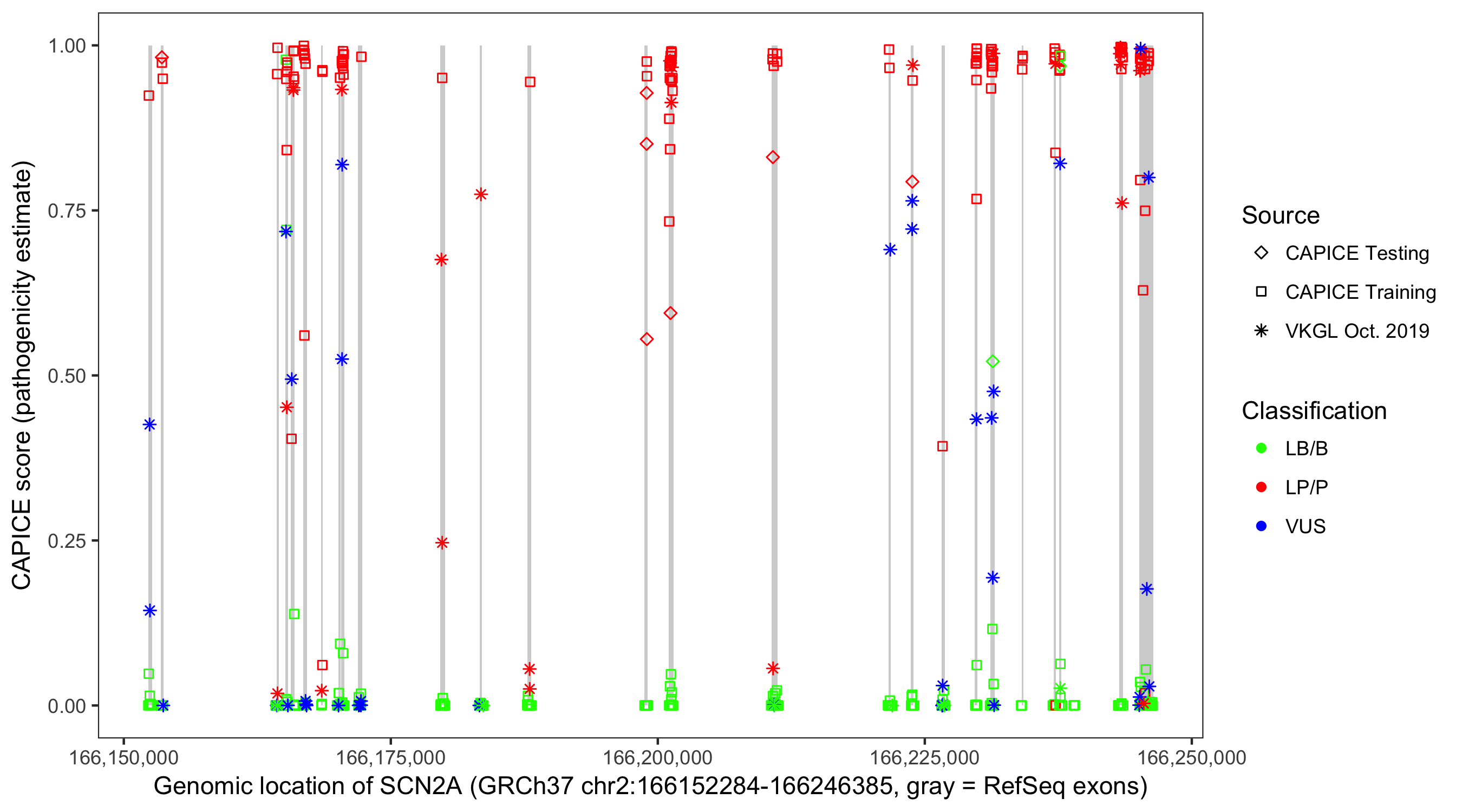 Shown are CAPICE train/test variants plus VKGL Oct 2019.