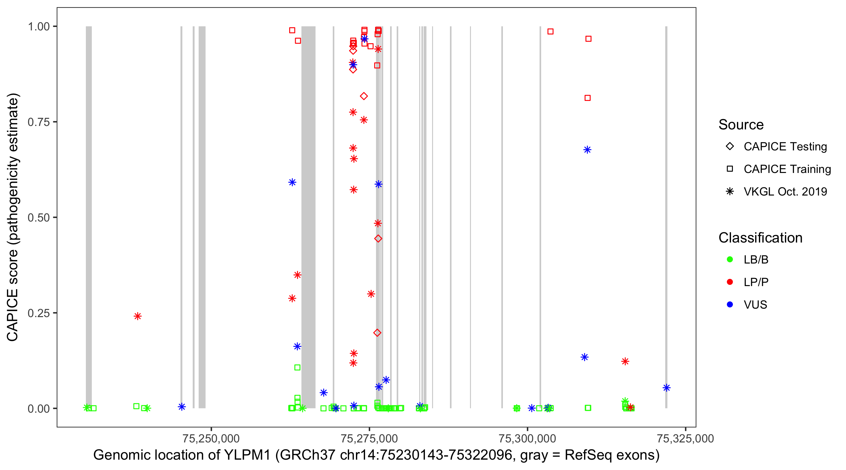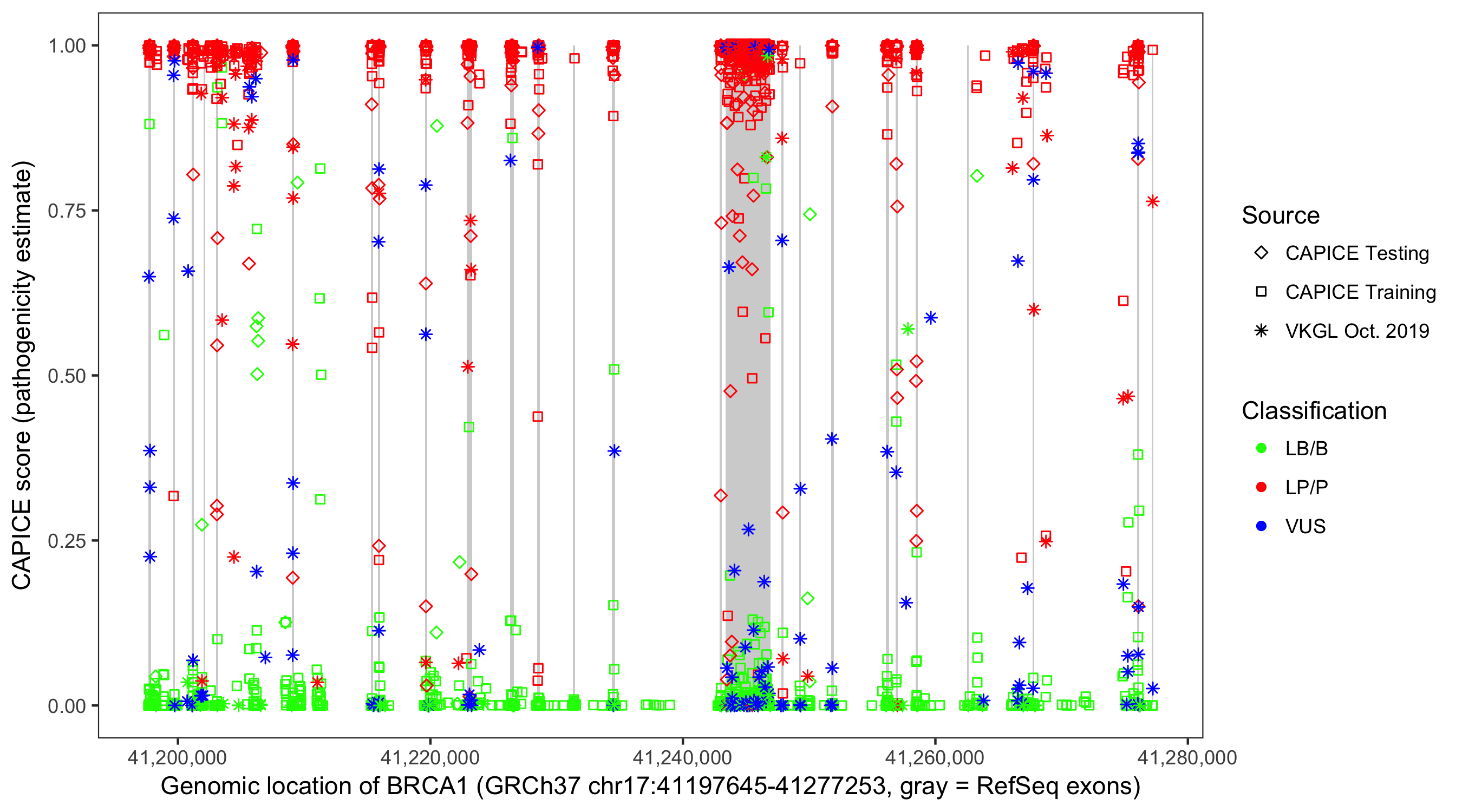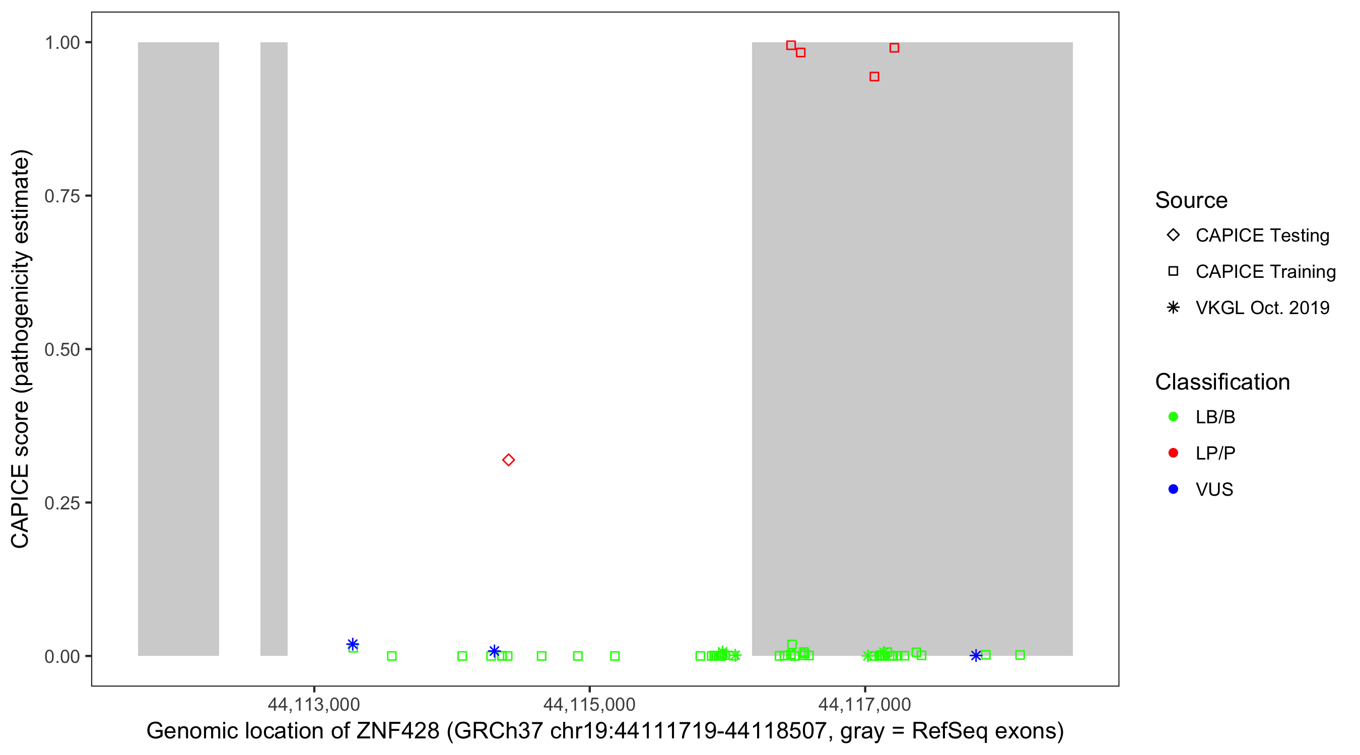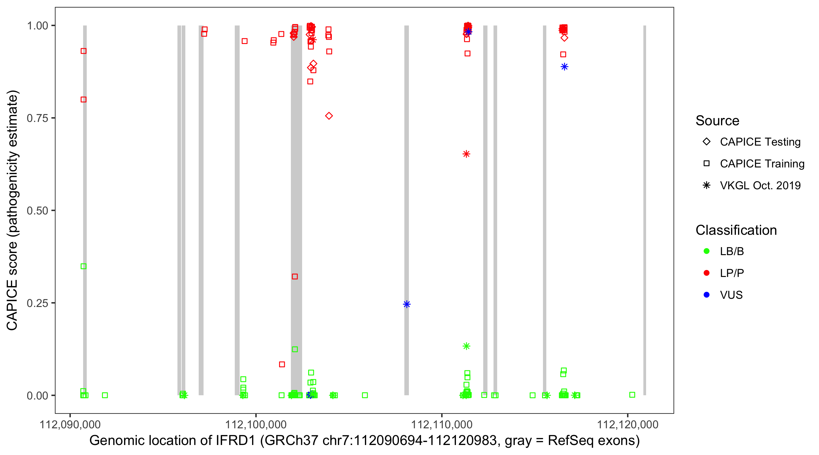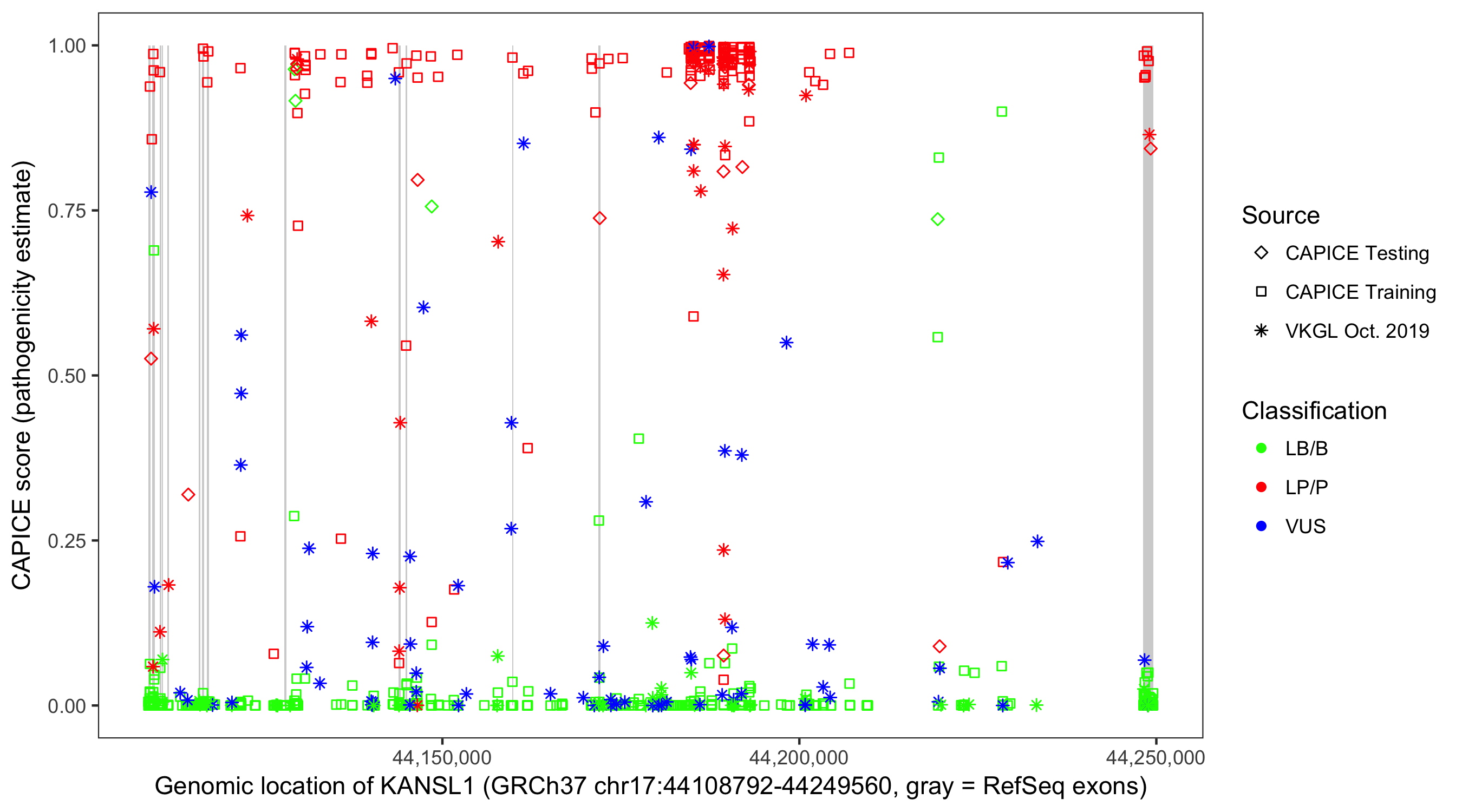 Shown are CAPICE train/test variants plus VKGL Oct 2019.