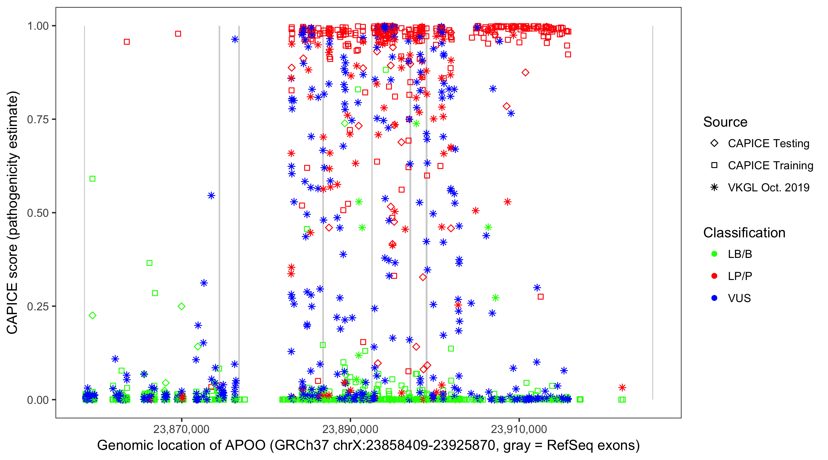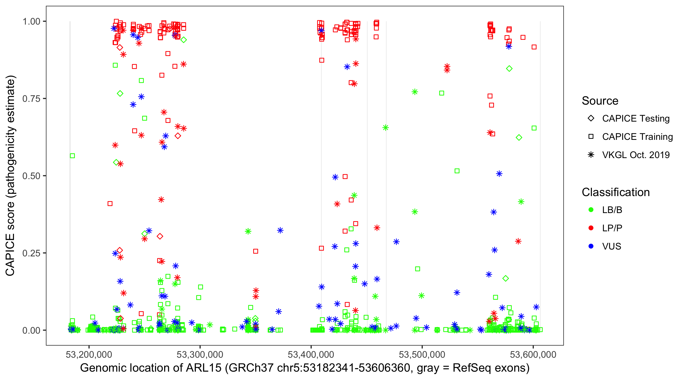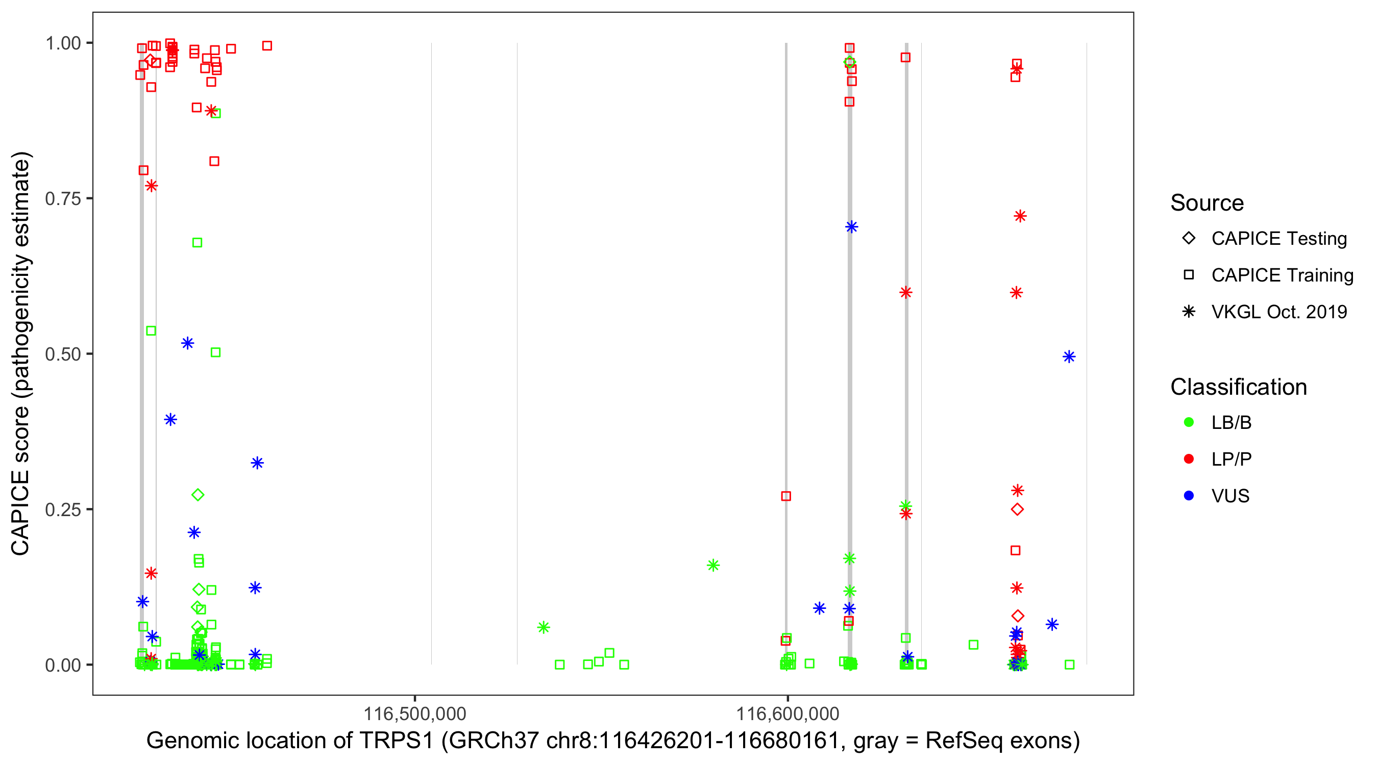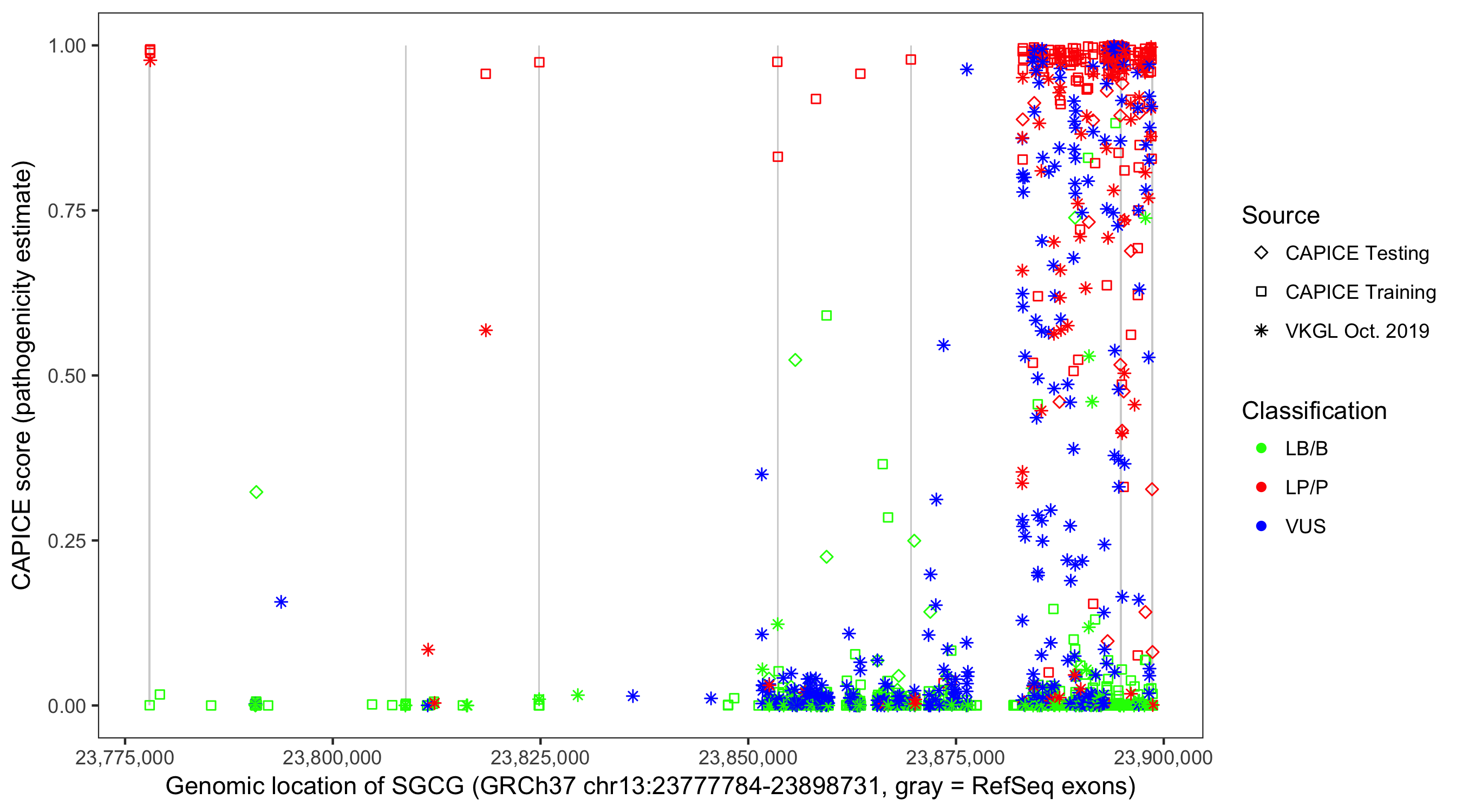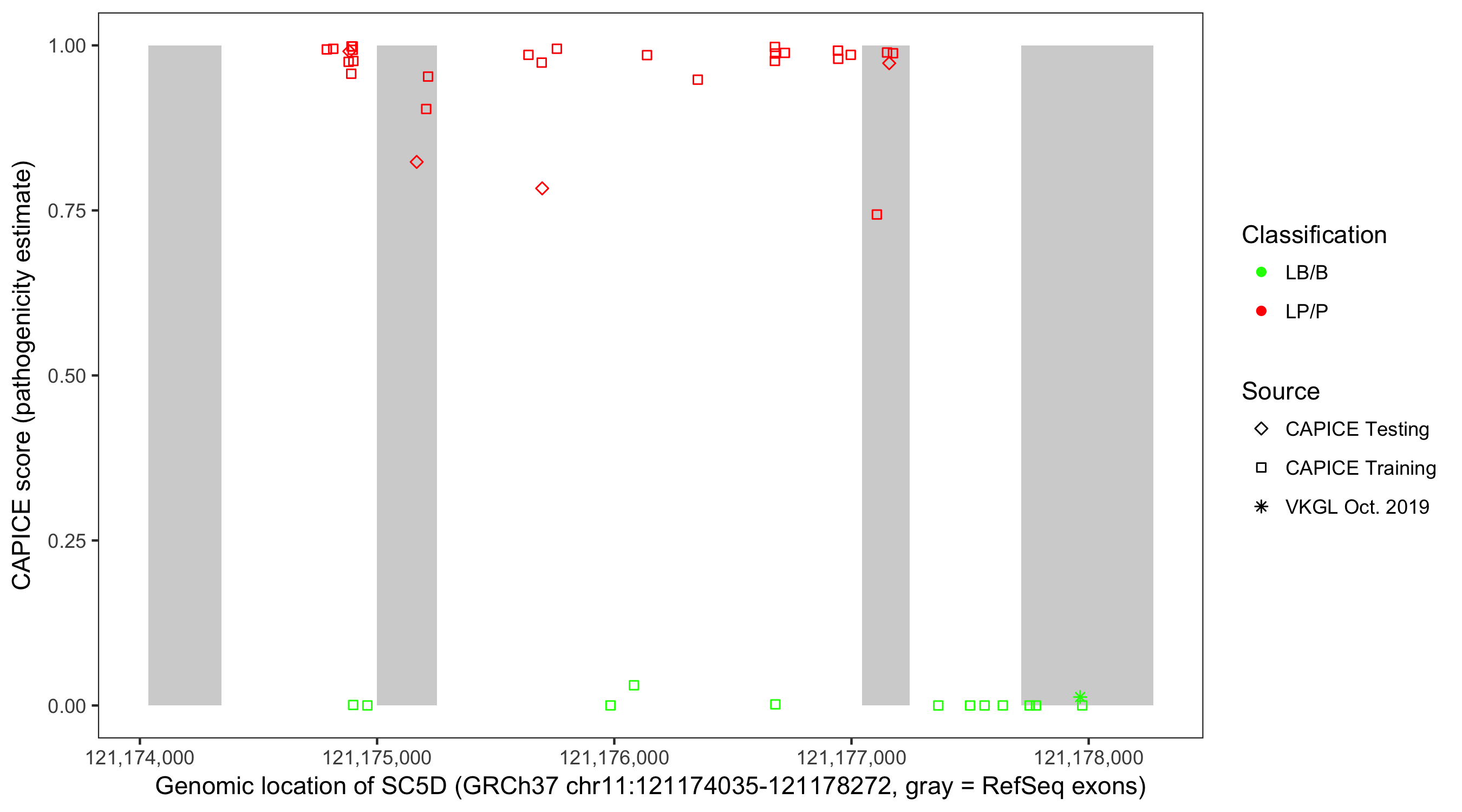 Shown are CAPICE train/test variants plus VKGL Oct 2019.