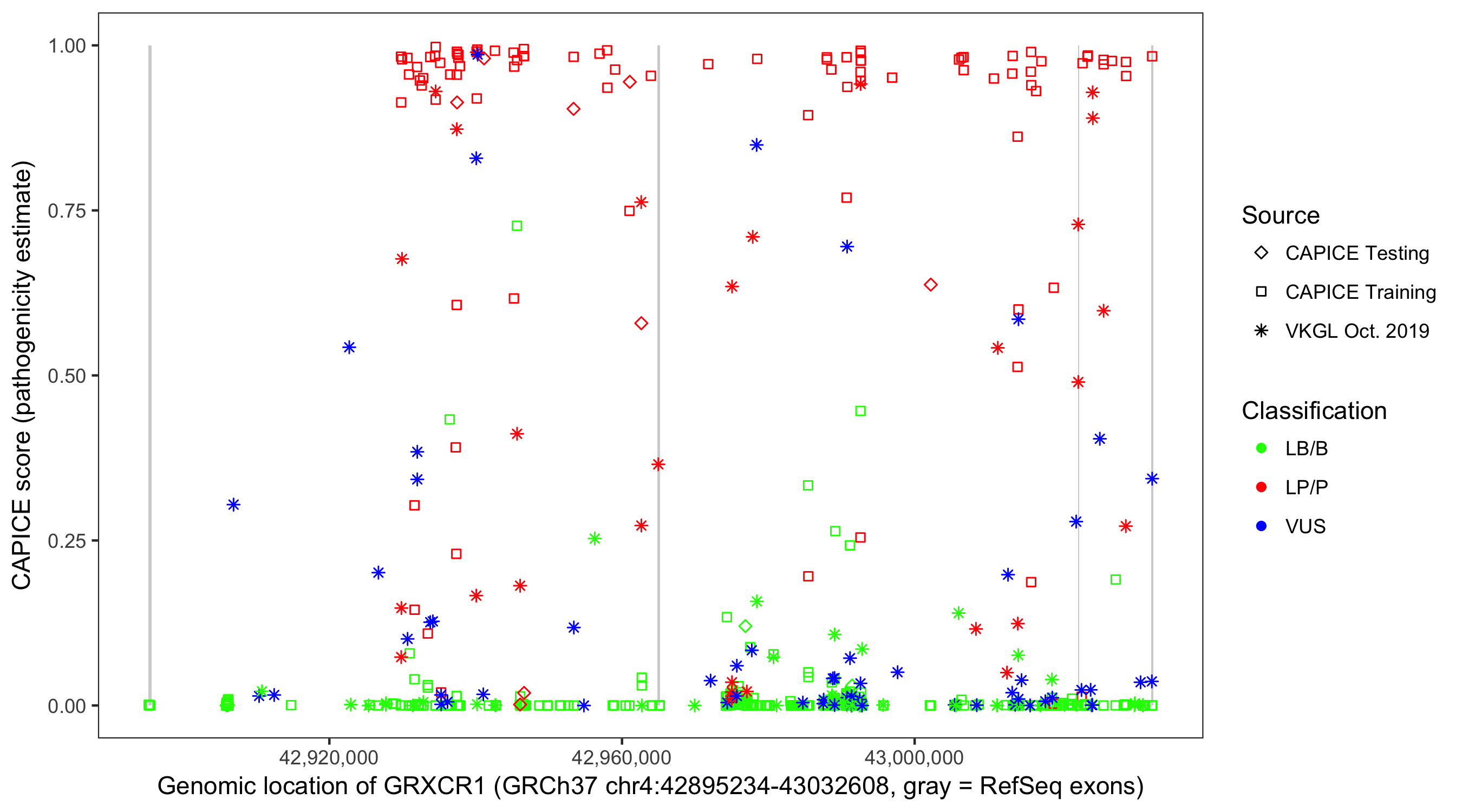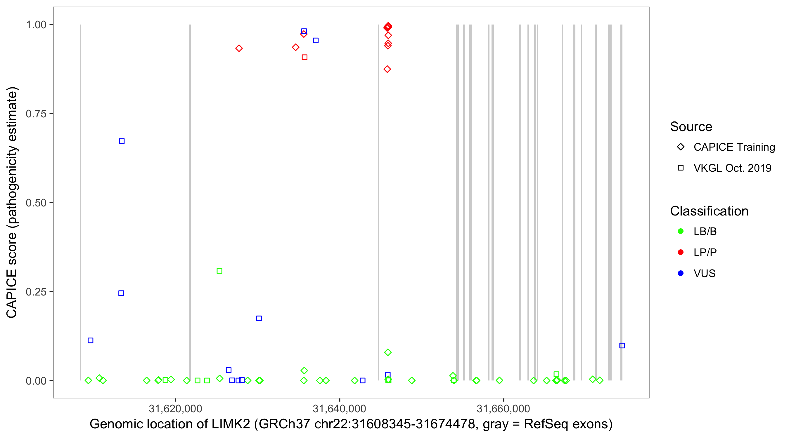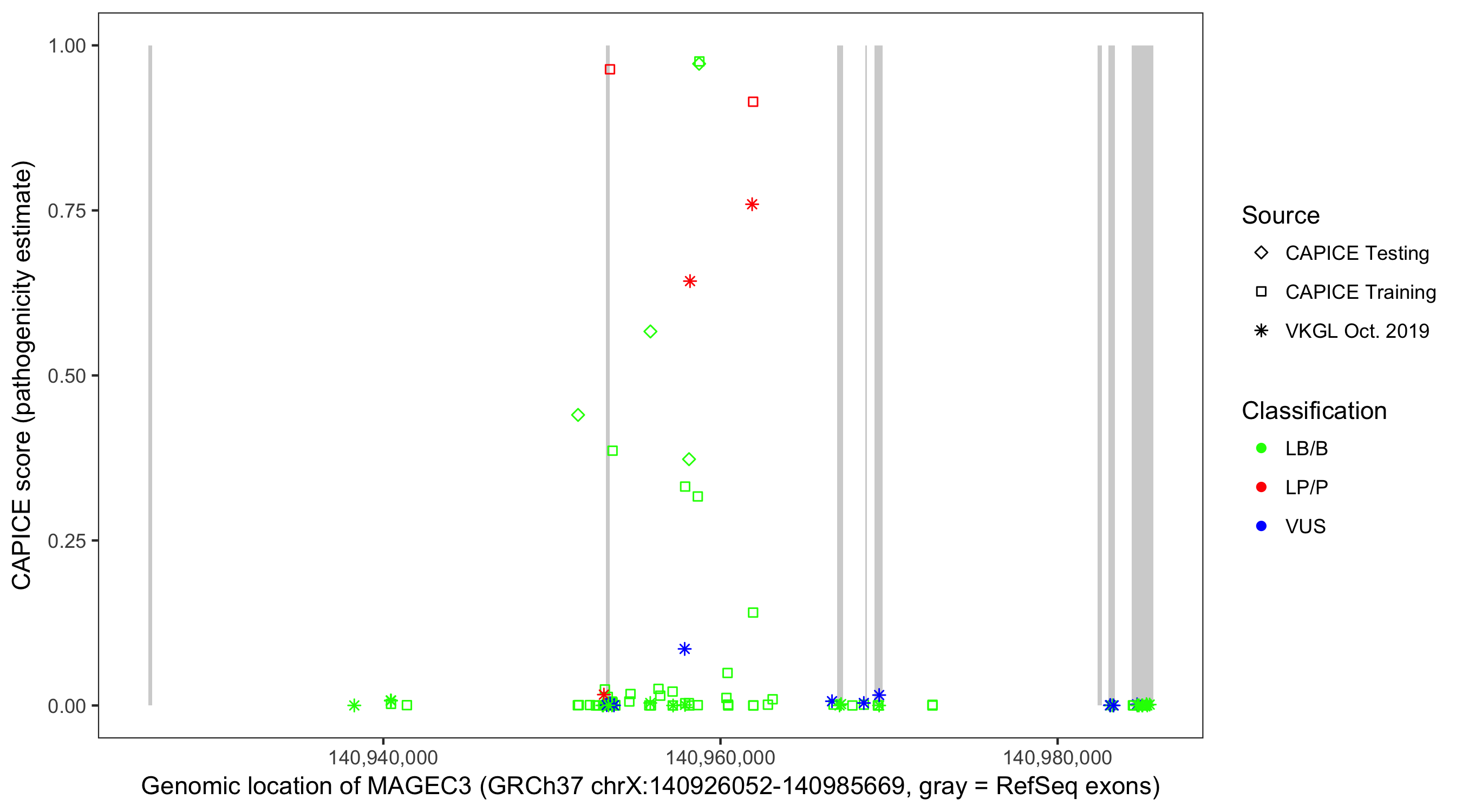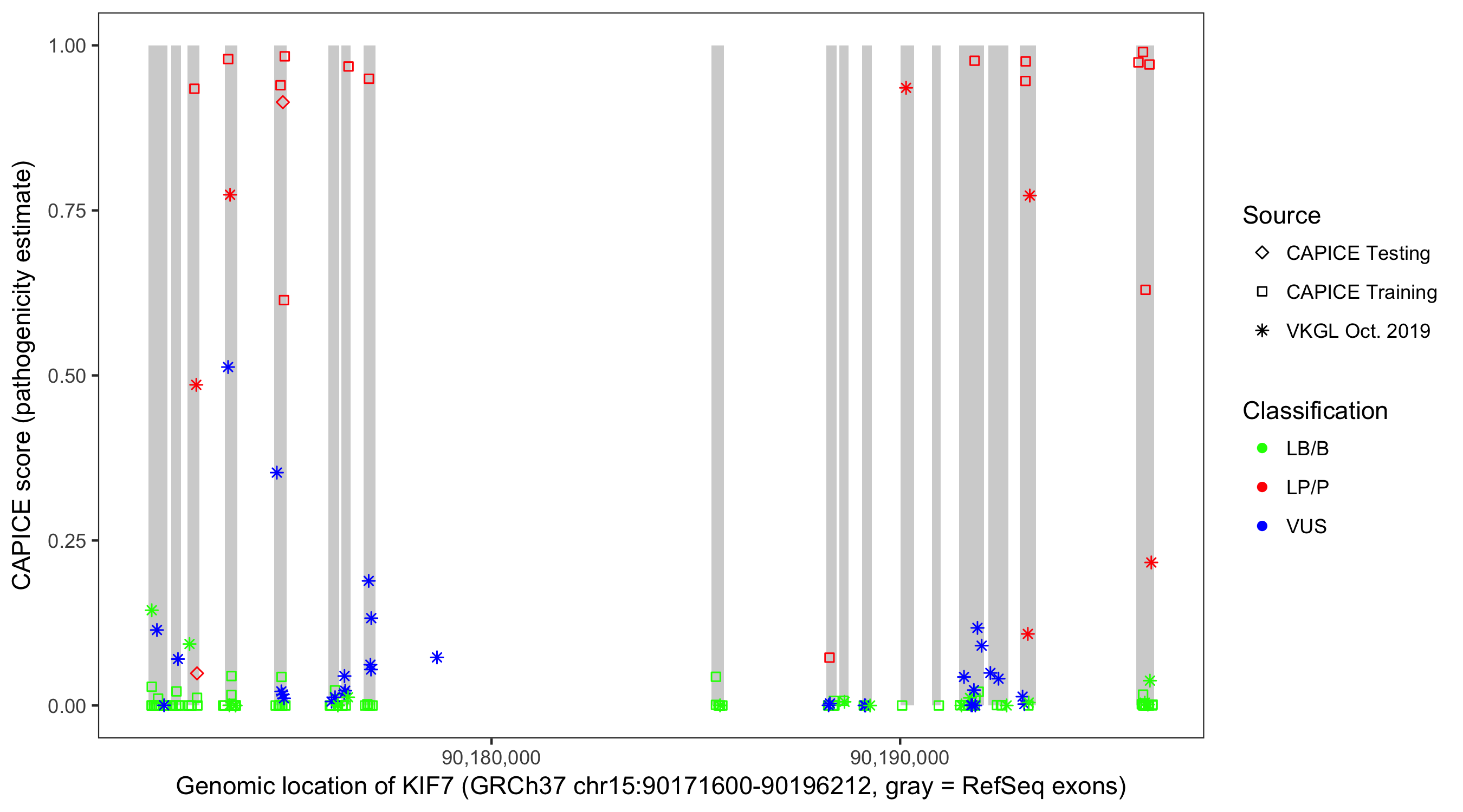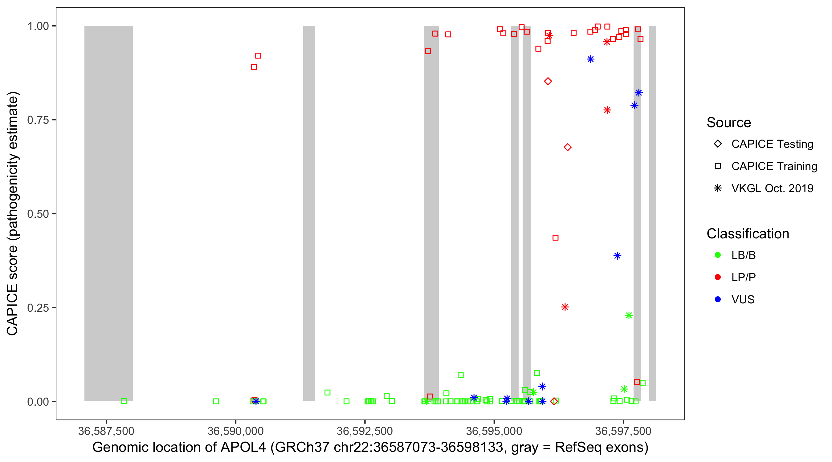 Shown are CAPICE train/test variants plus VKGL Oct 2019.