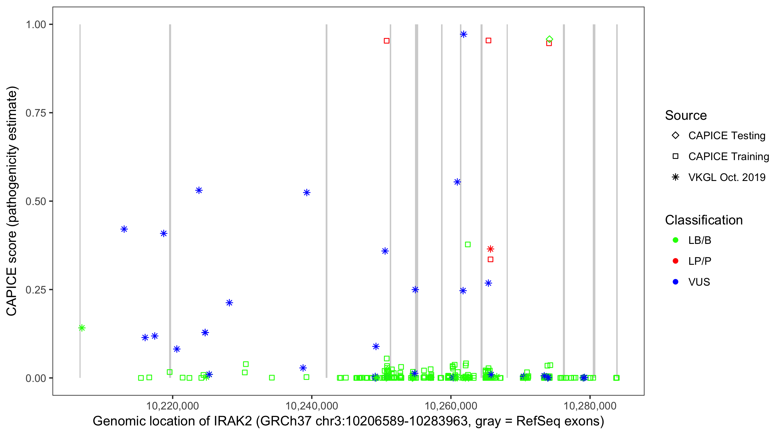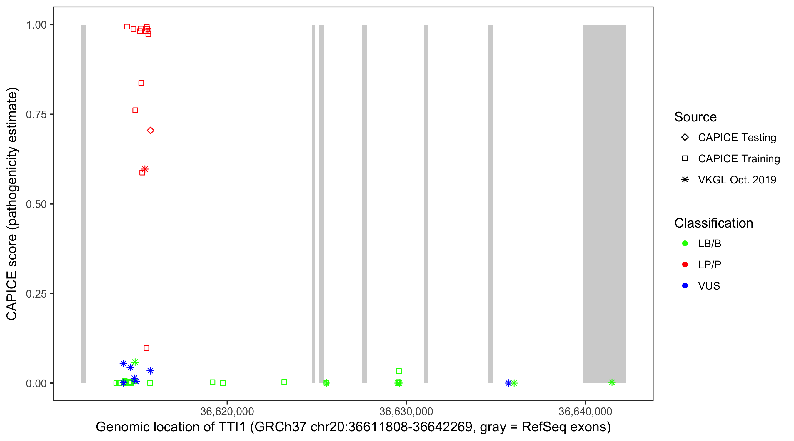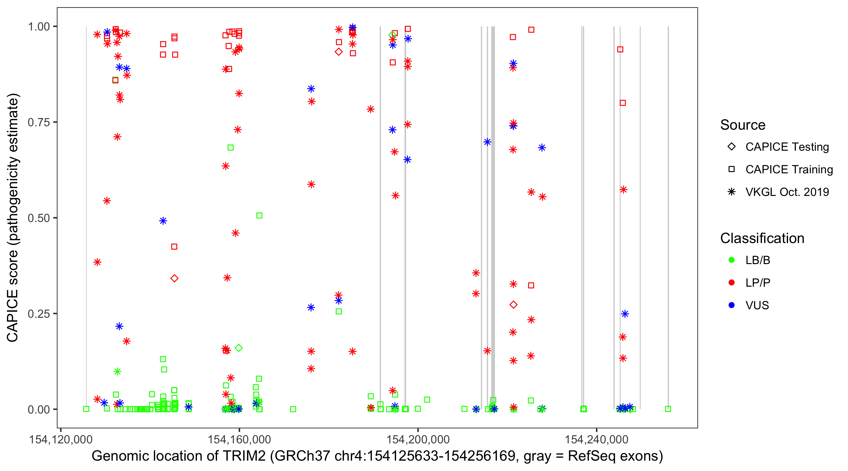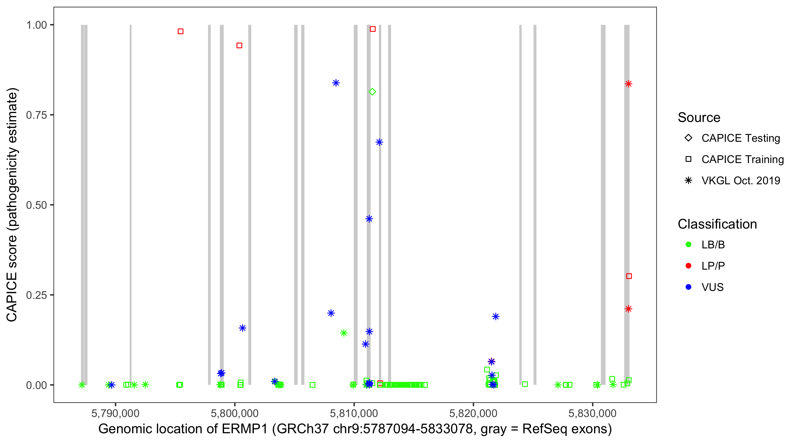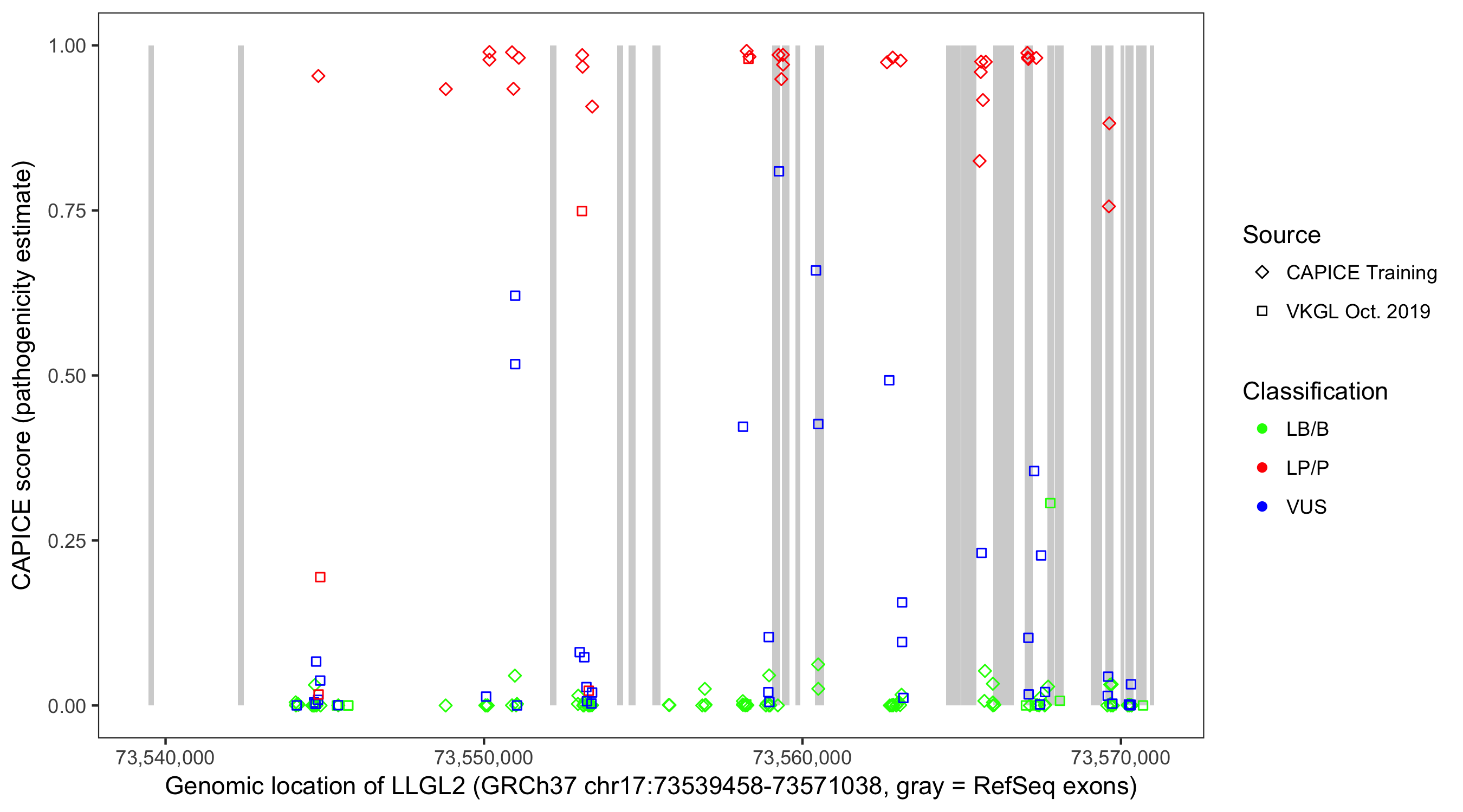 Shown are CAPICE train/test variants plus VKGL Oct 2019.