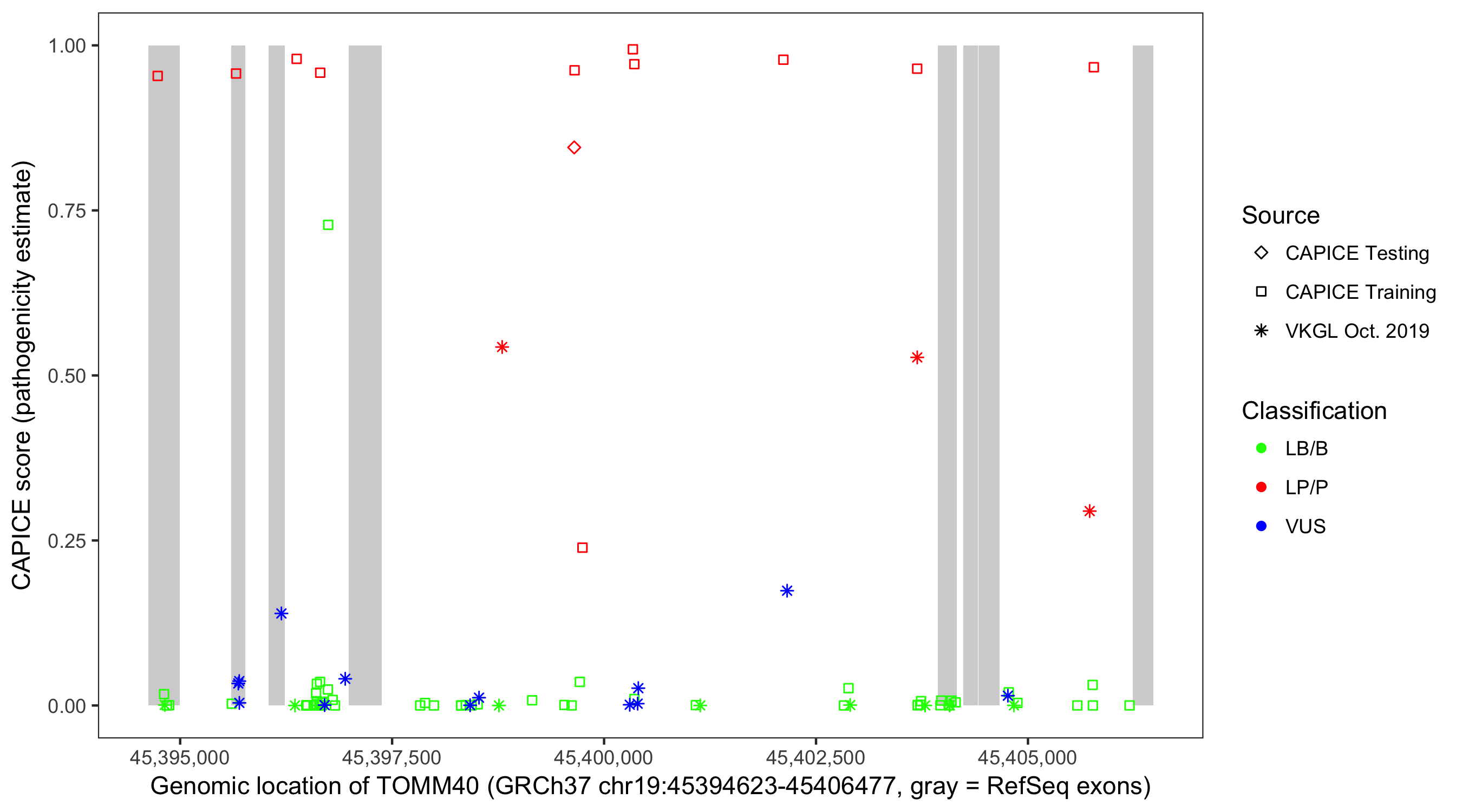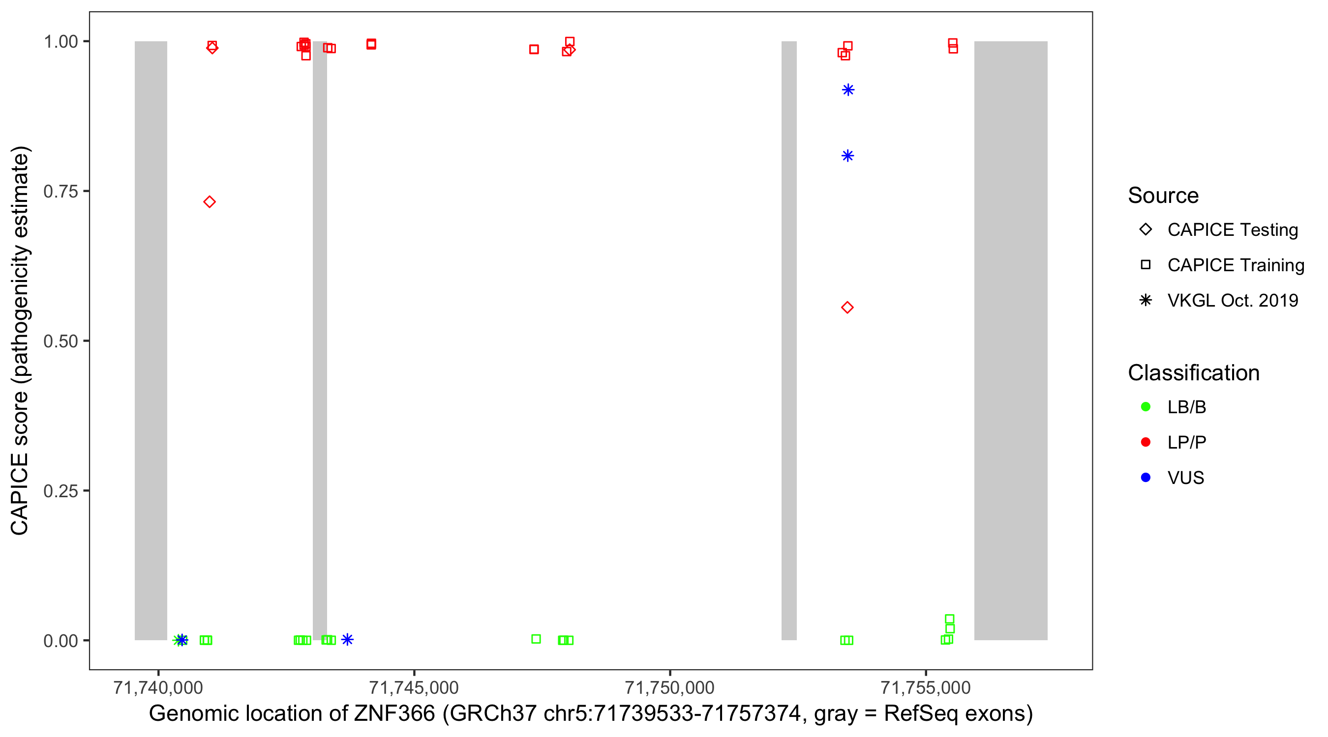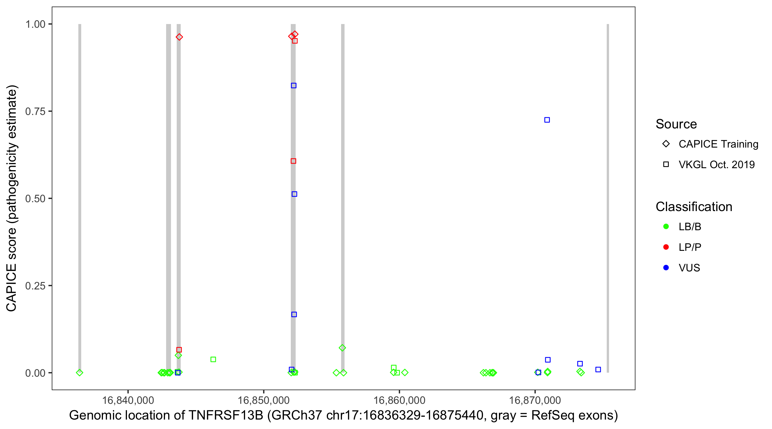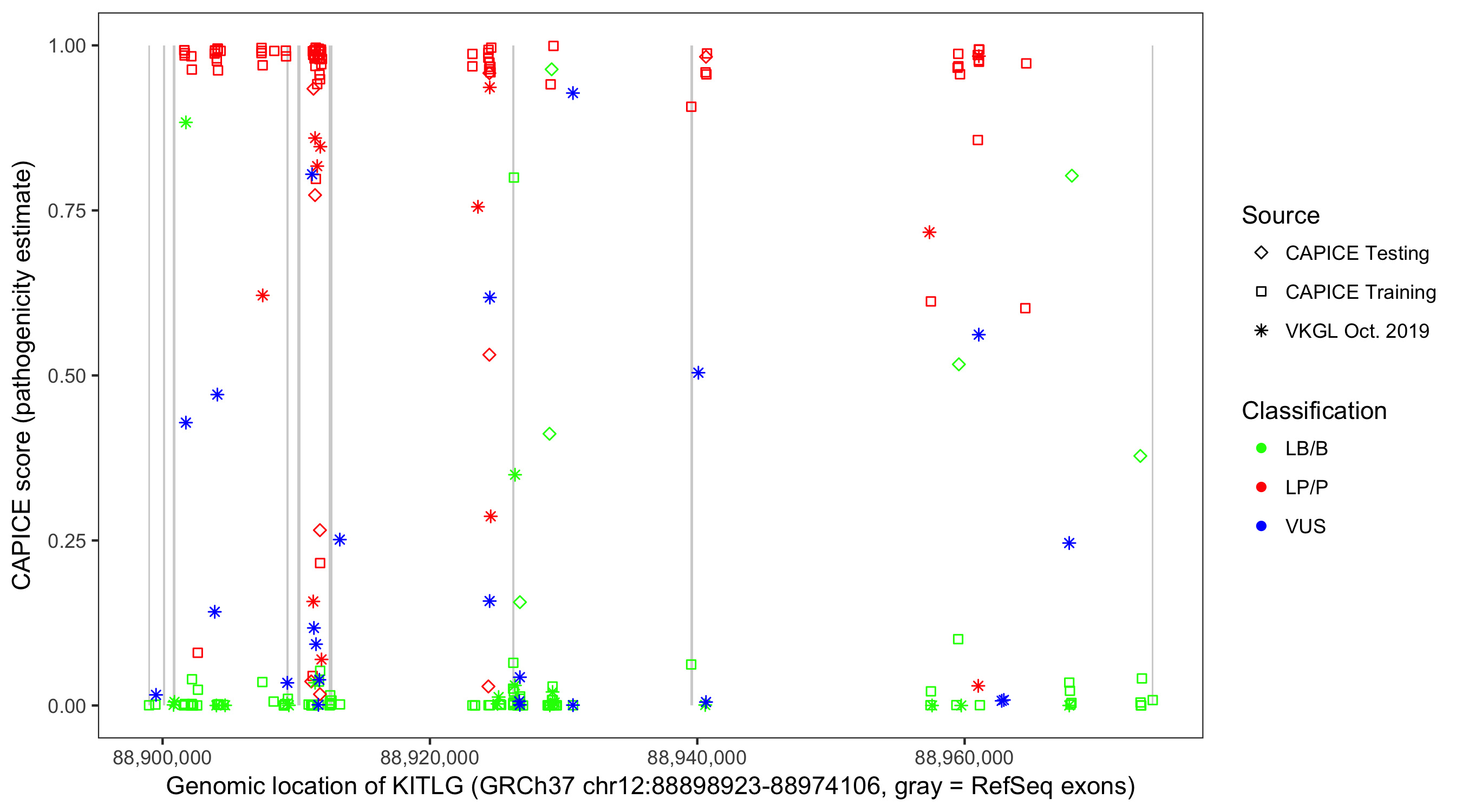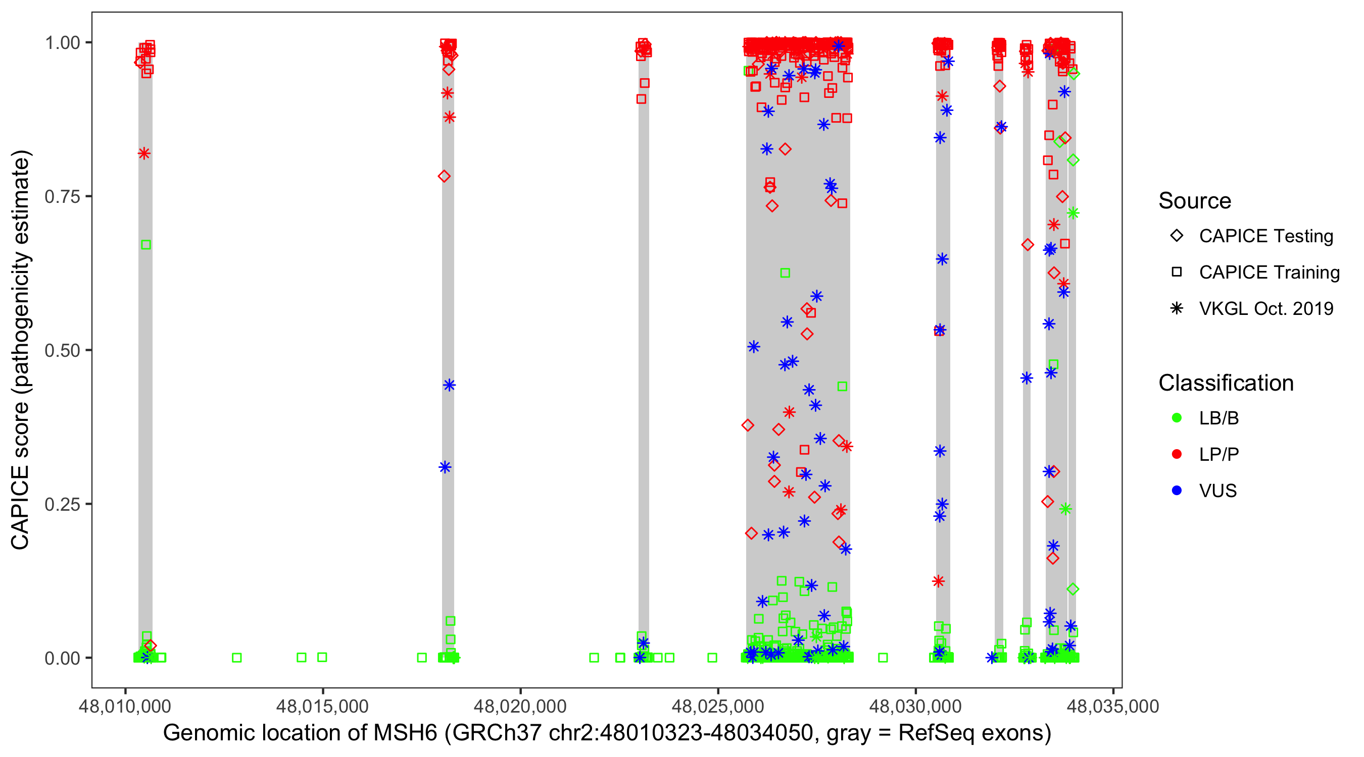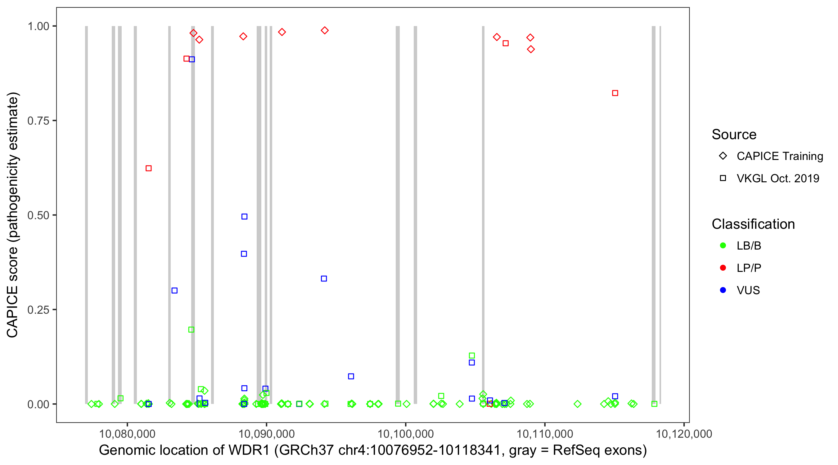 Shown are CAPICE train/test variants plus VKGL Oct 2019.