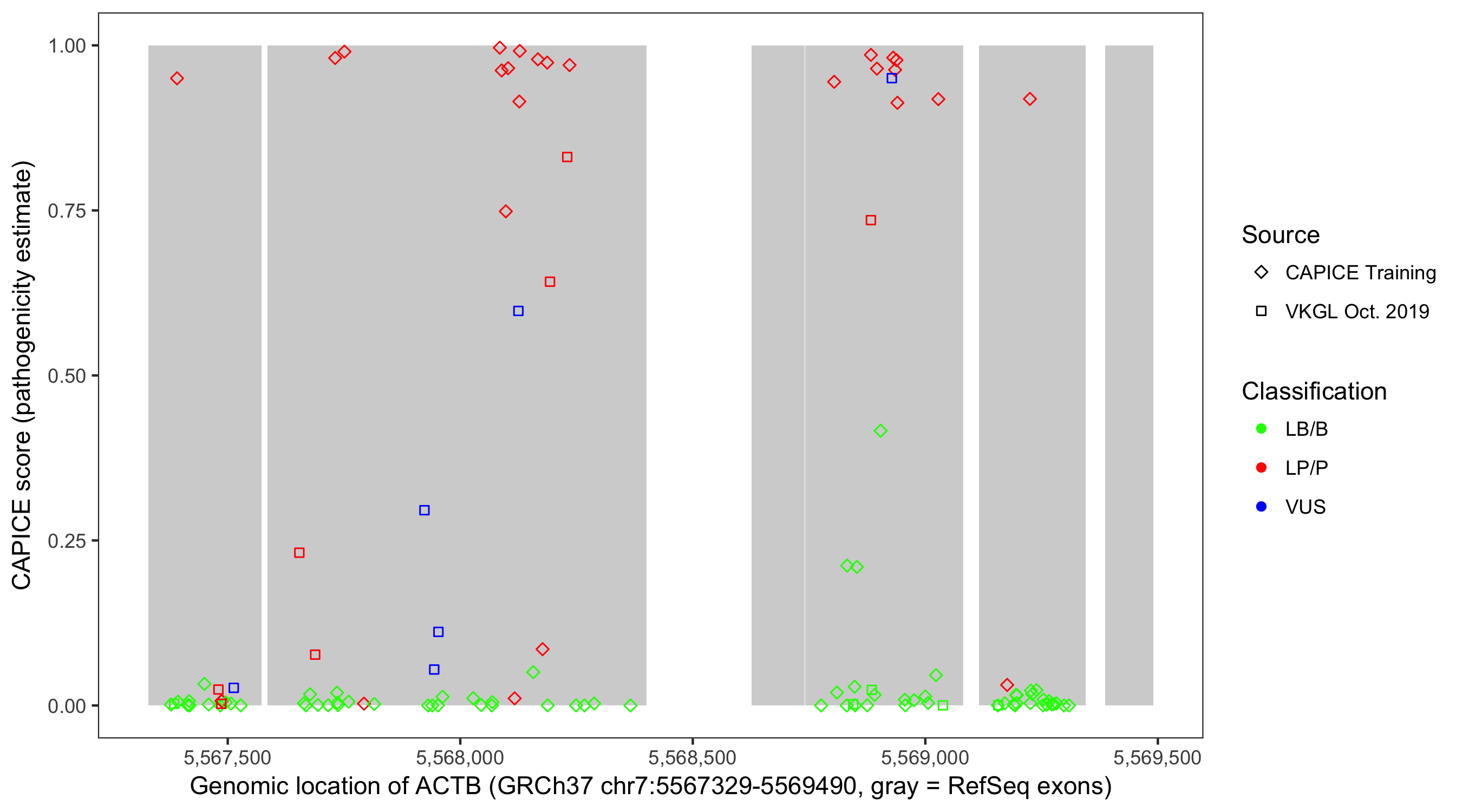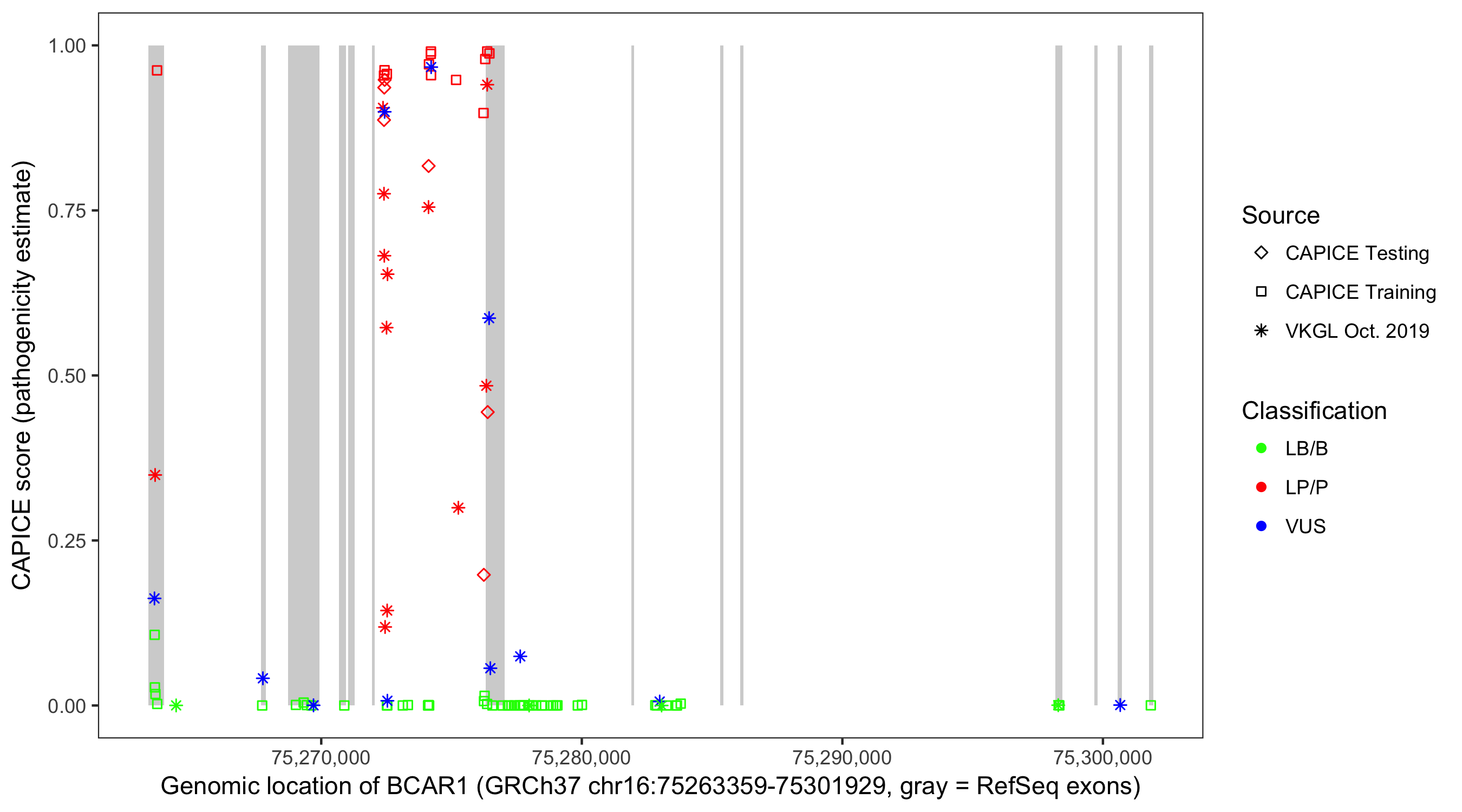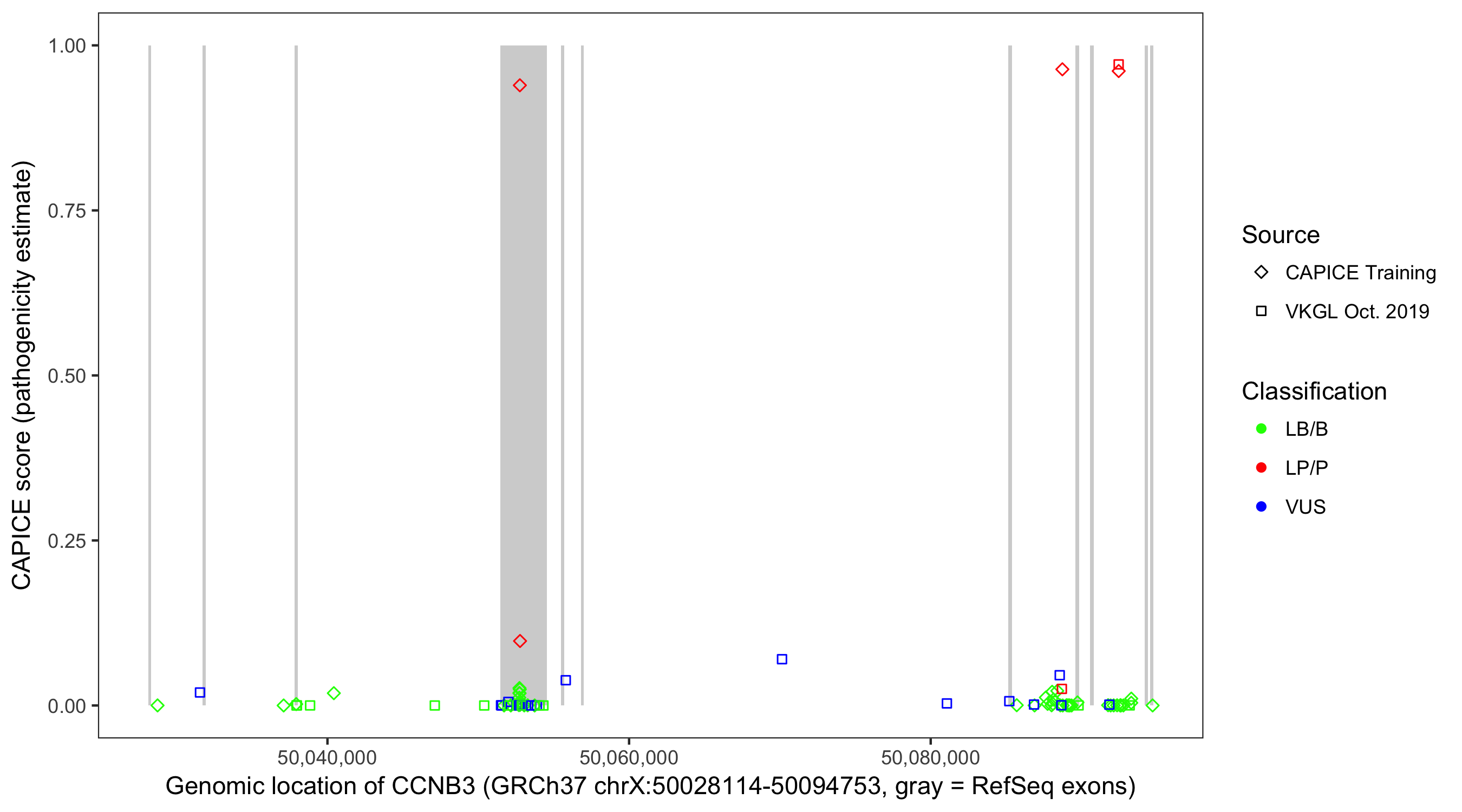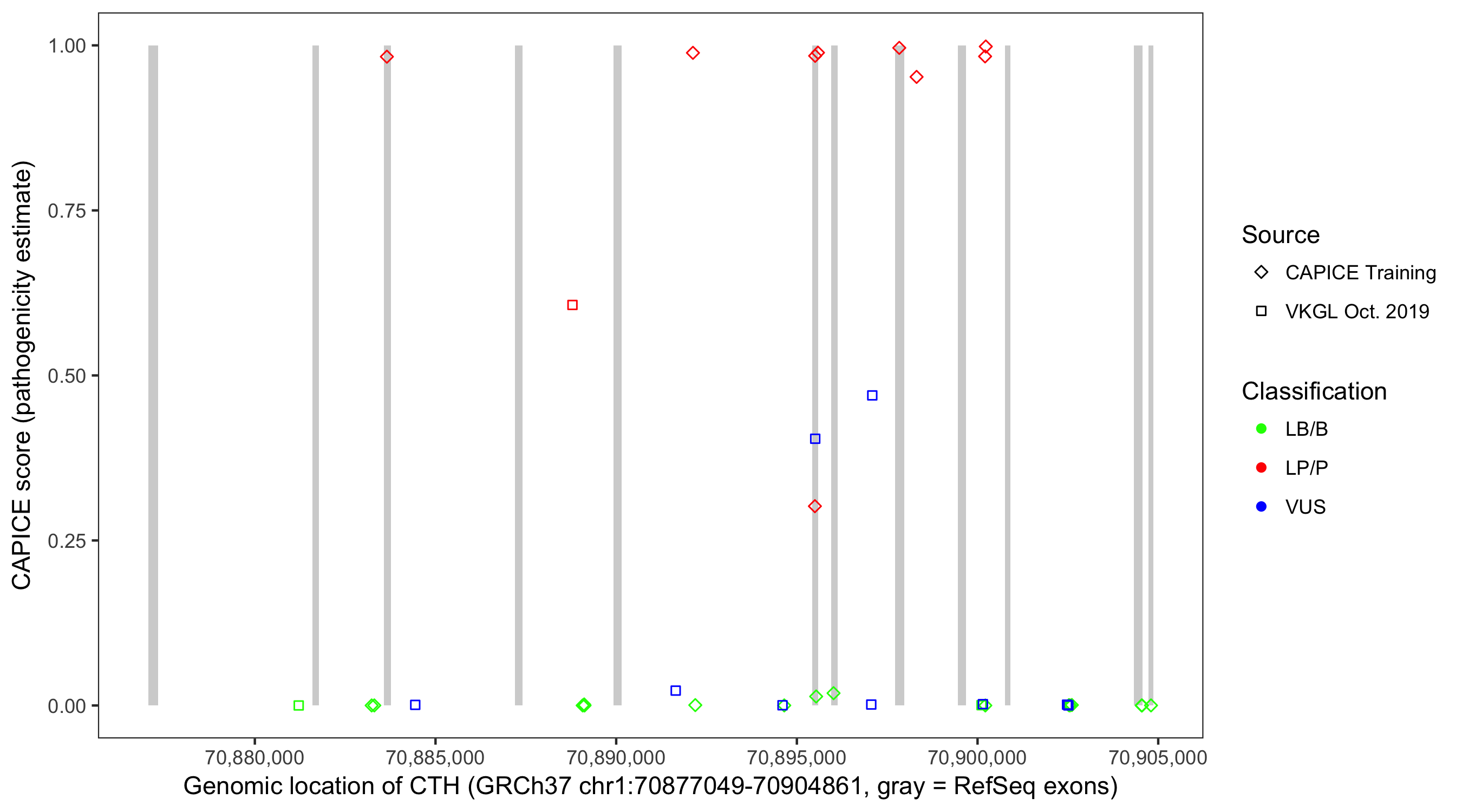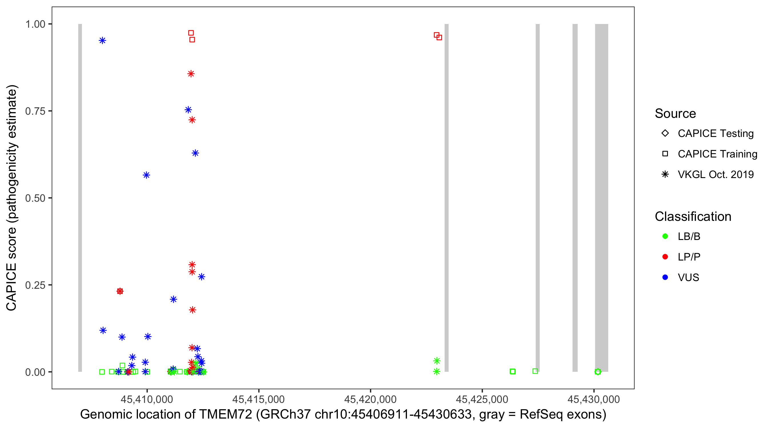 Shown are CAPICE train/test variants plus VKGL Oct 2019.