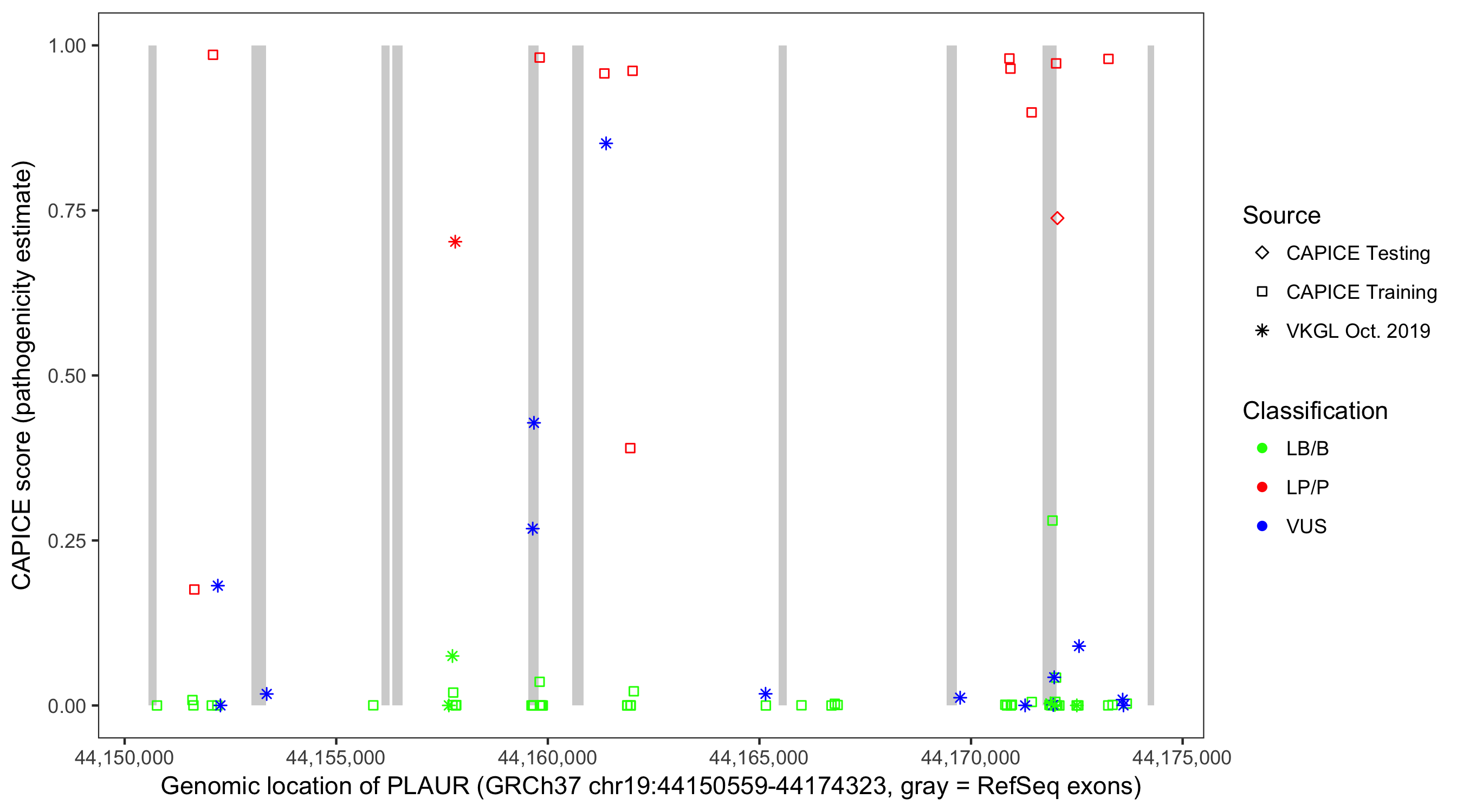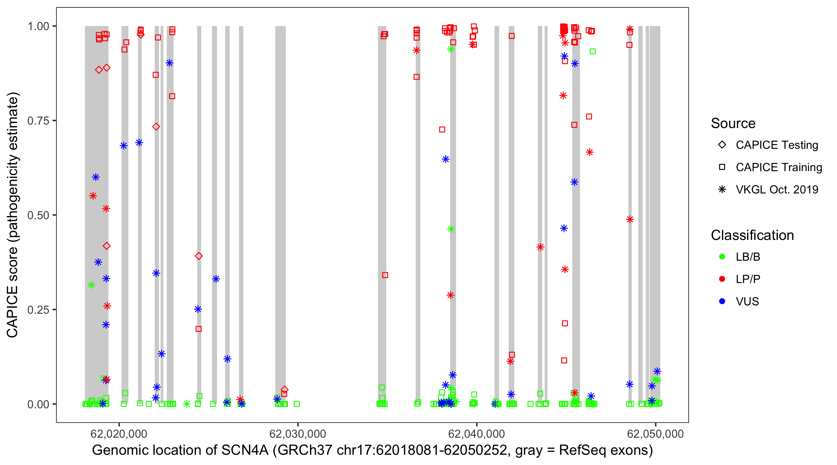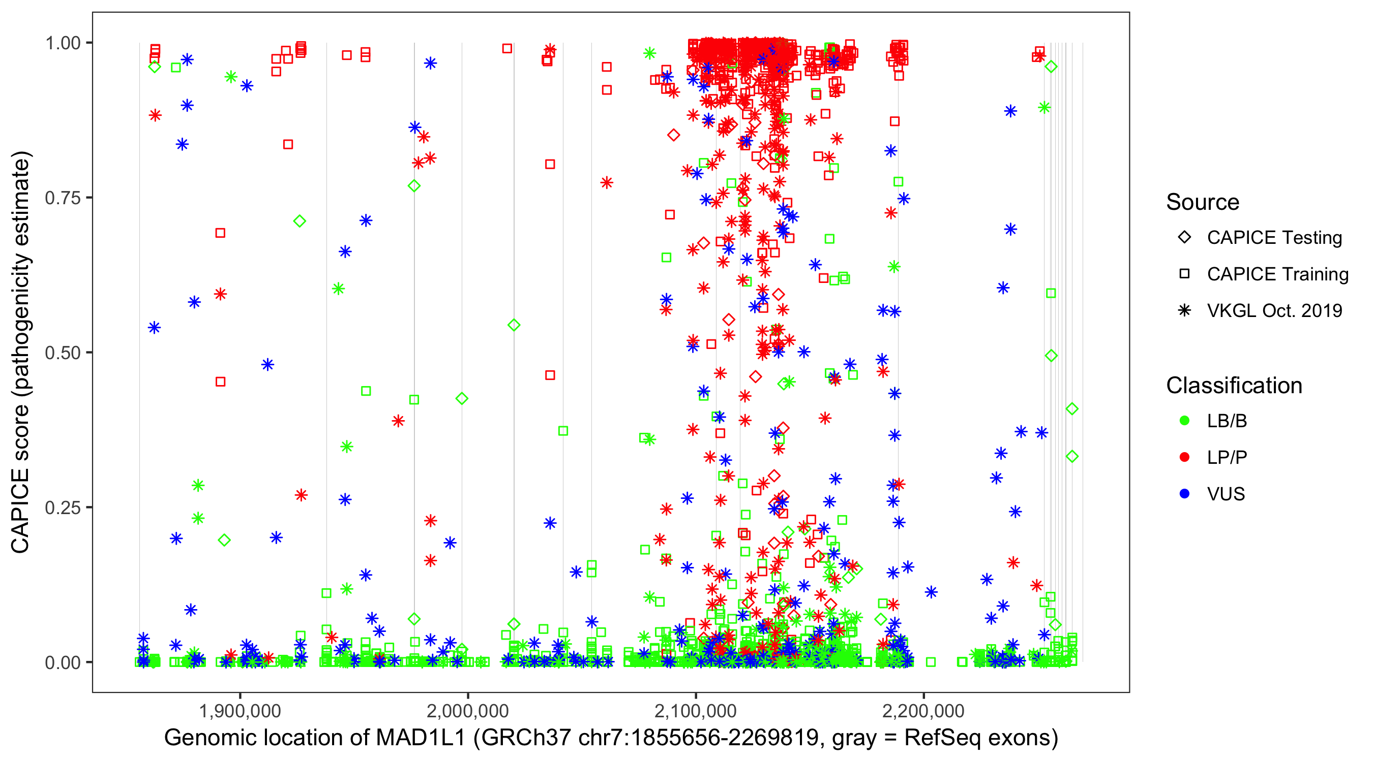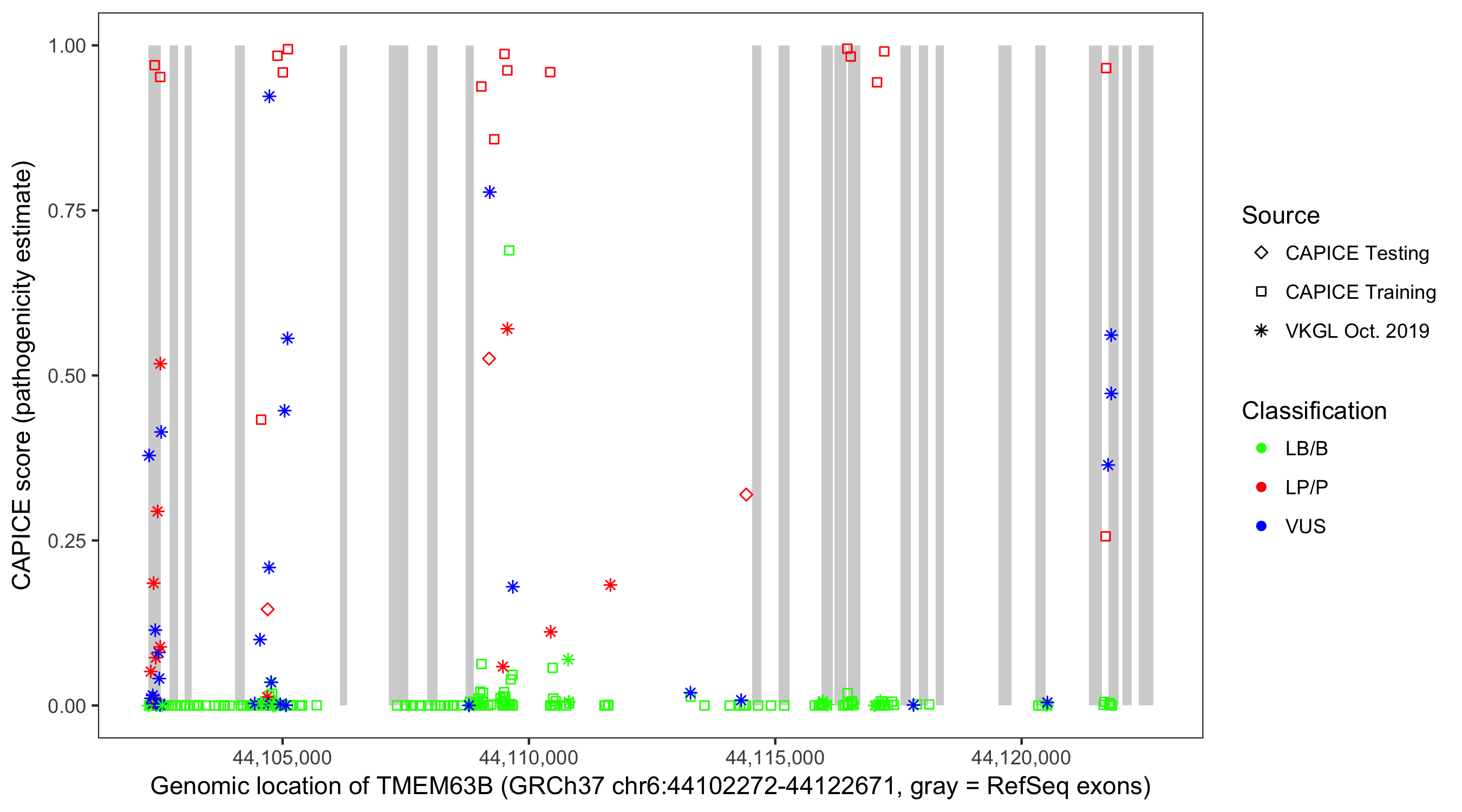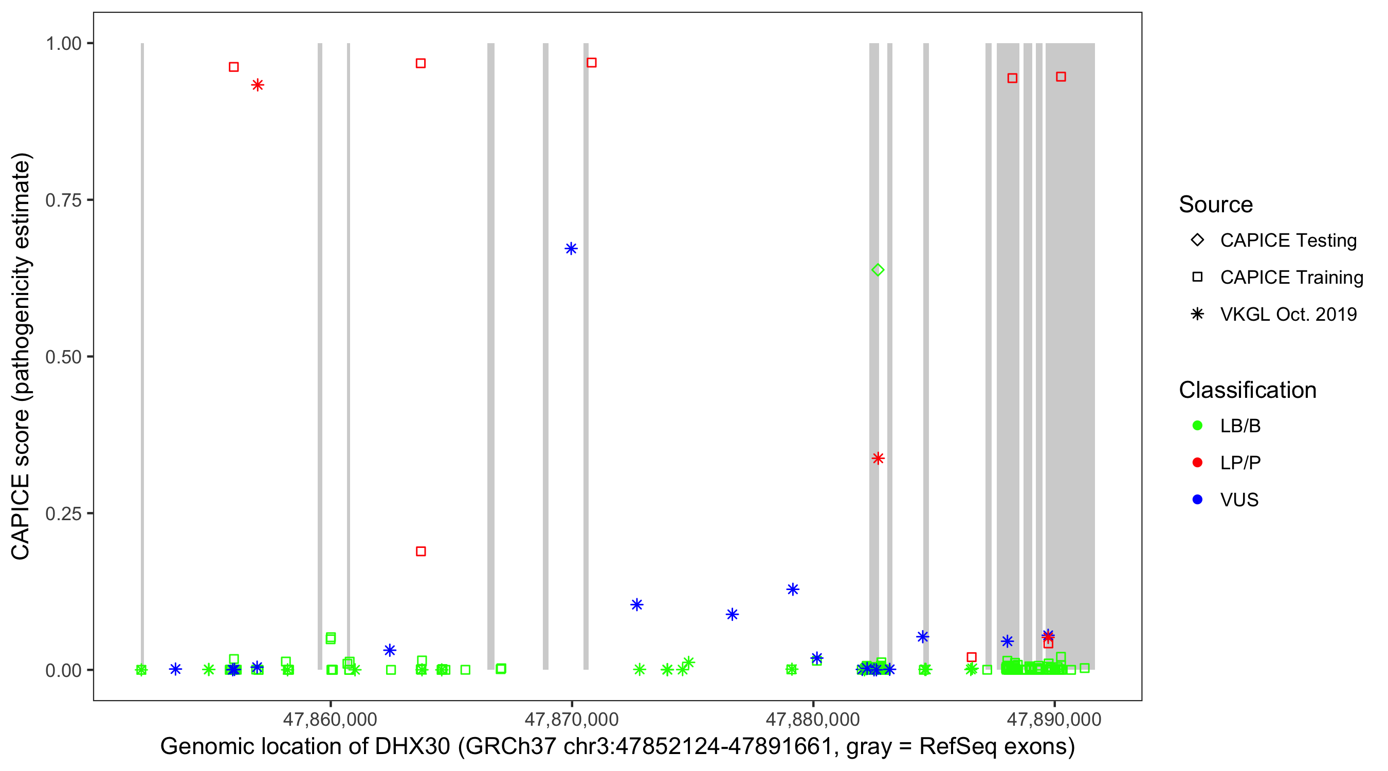 Shown are CAPICE train/test variants plus VKGL Oct 2019.