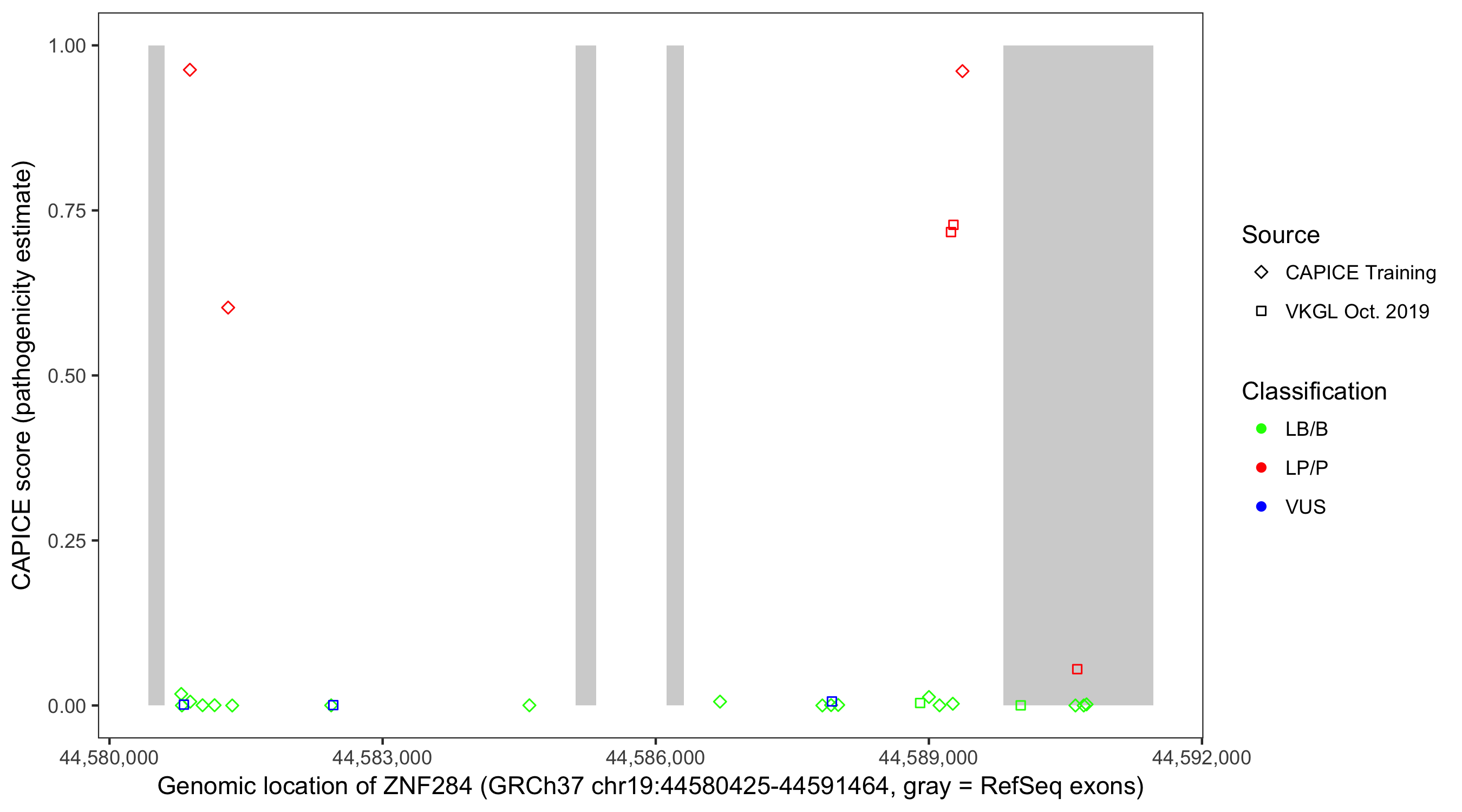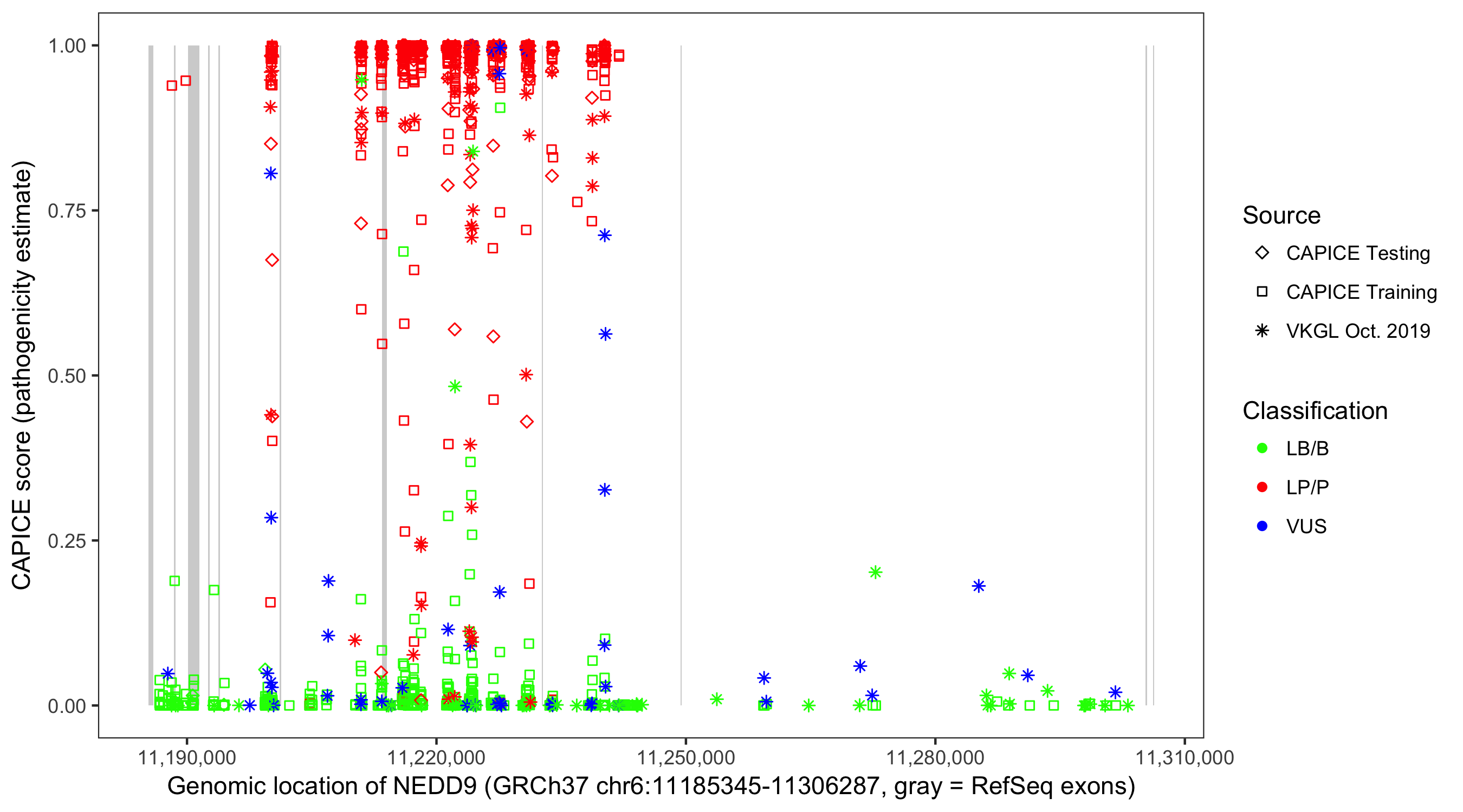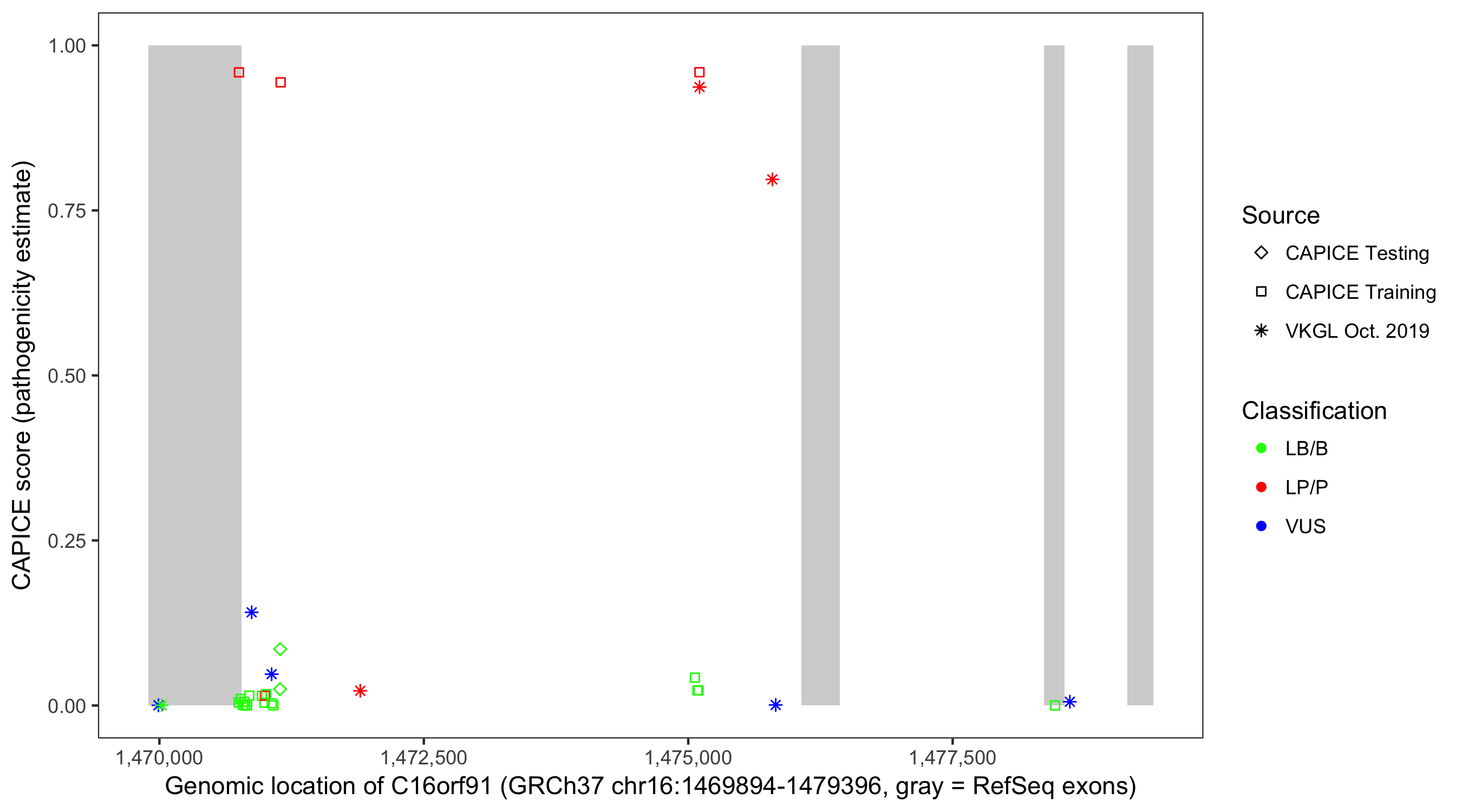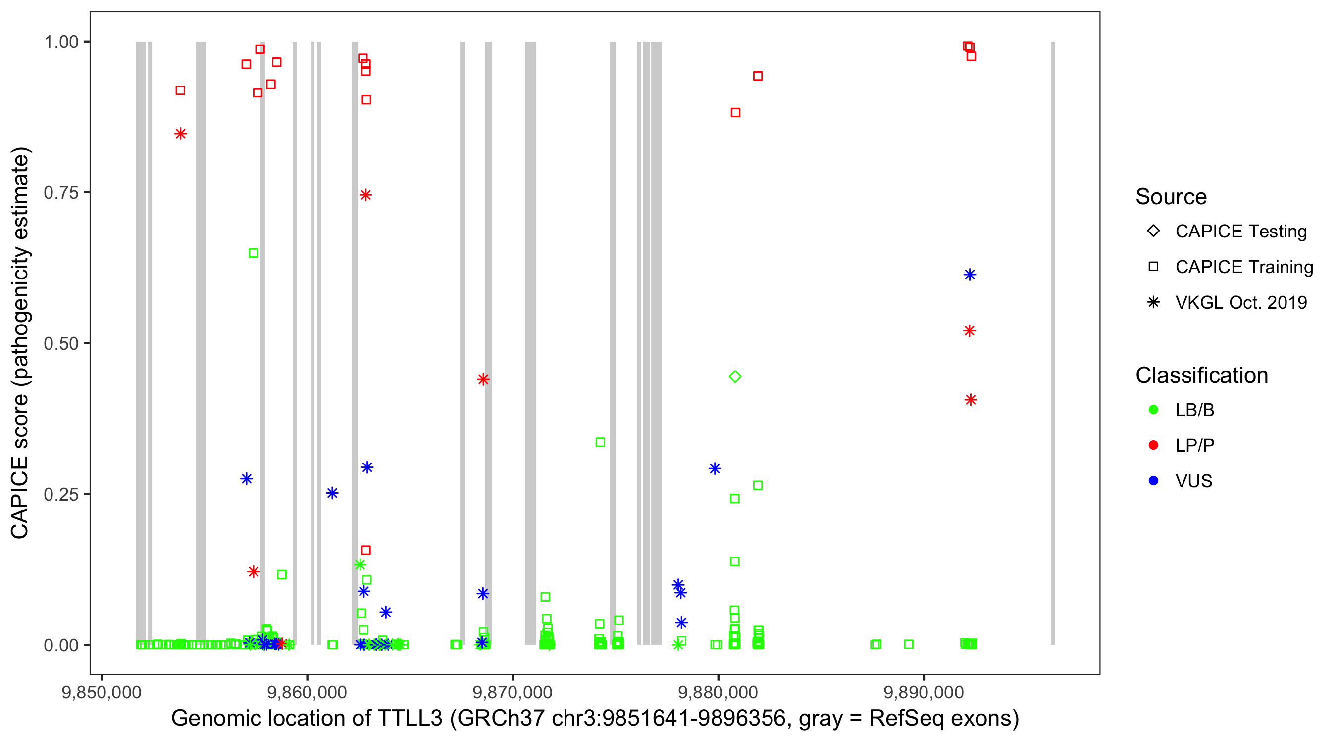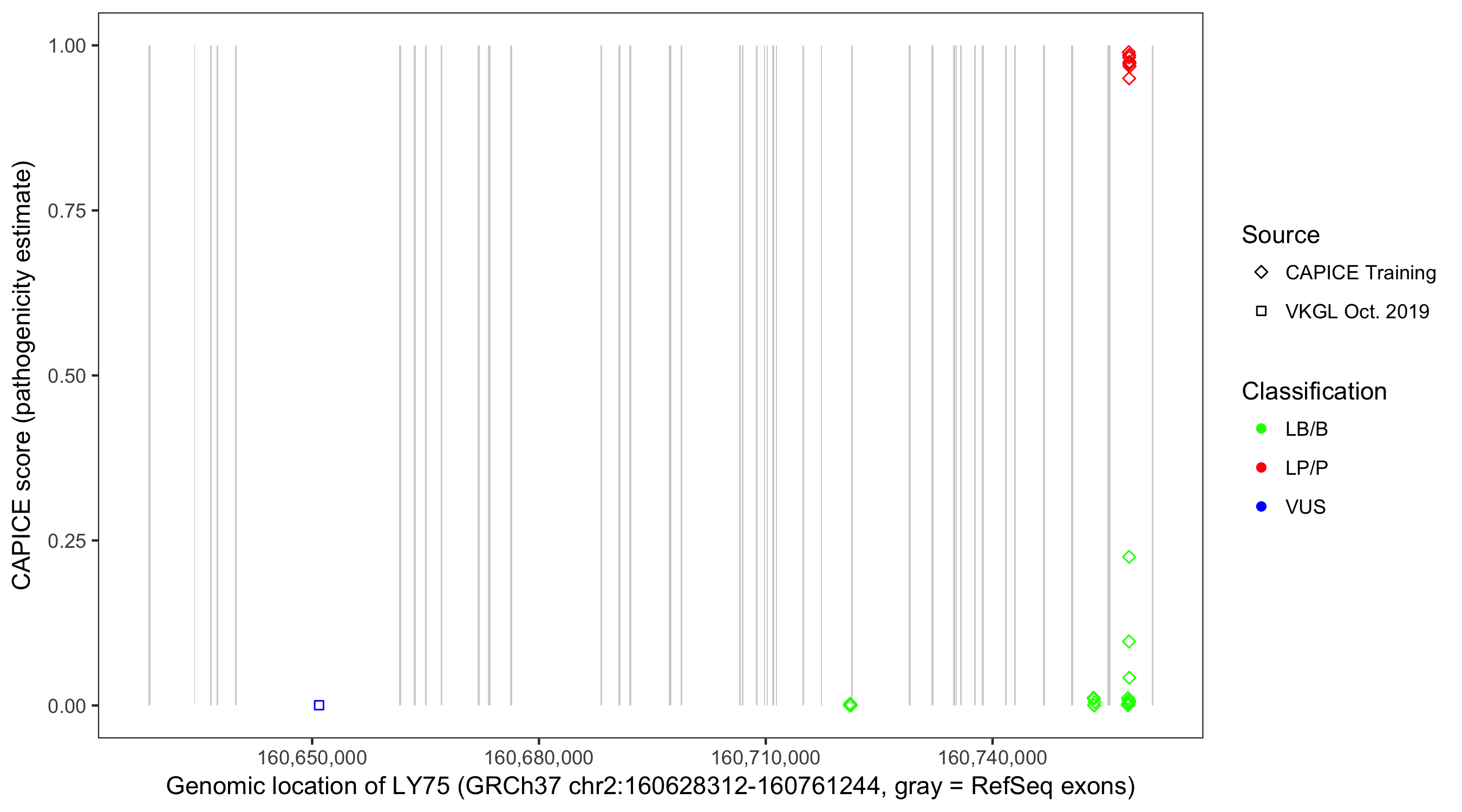 Shown are CAPICE train/test variants plus VKGL Oct 2019.
