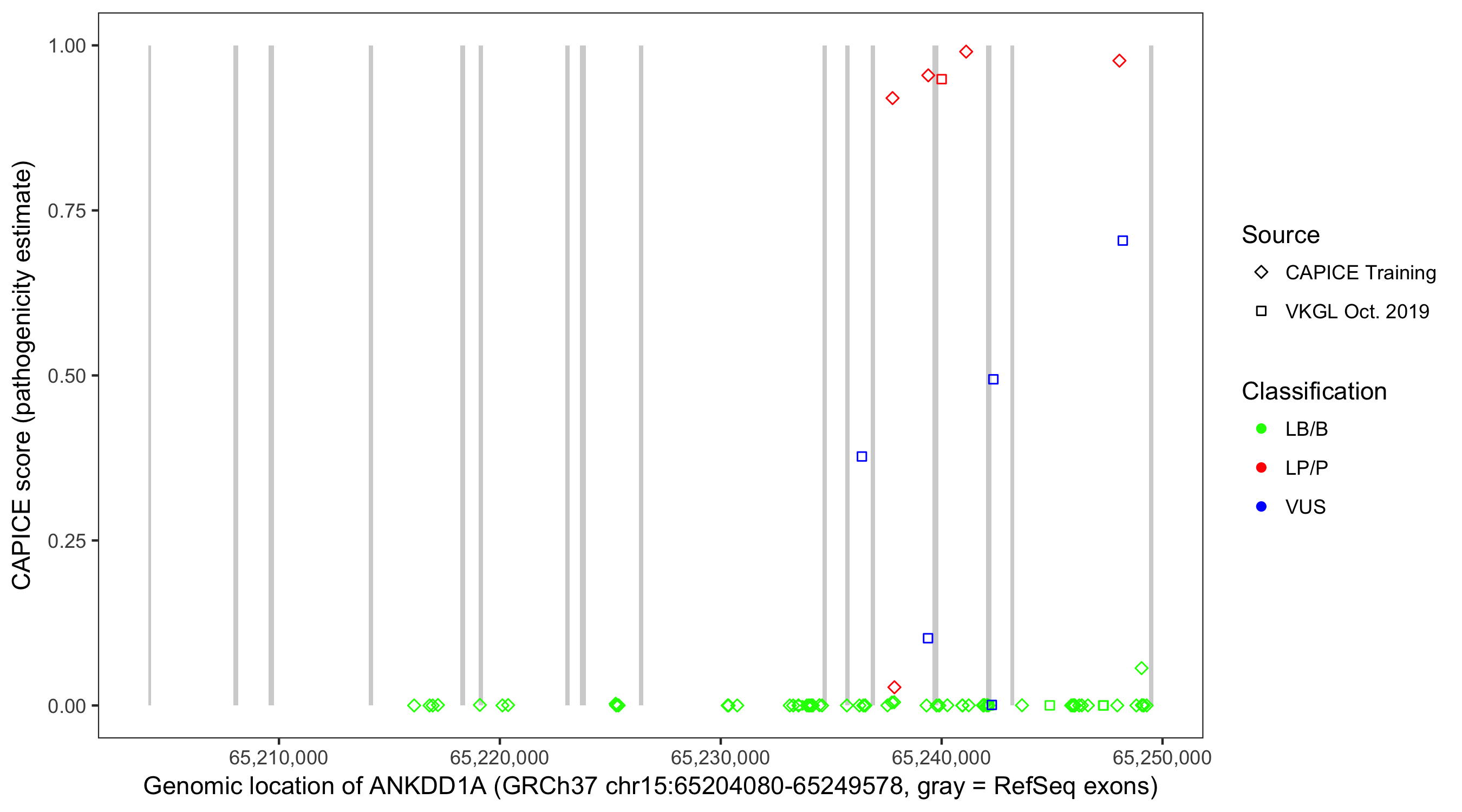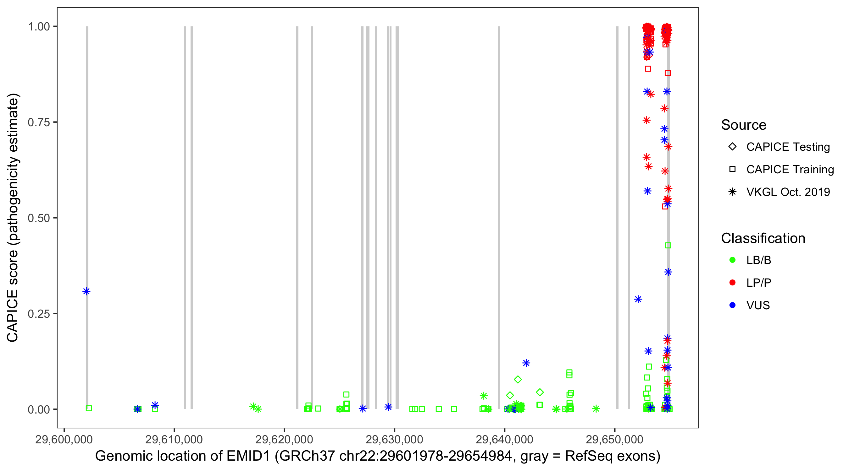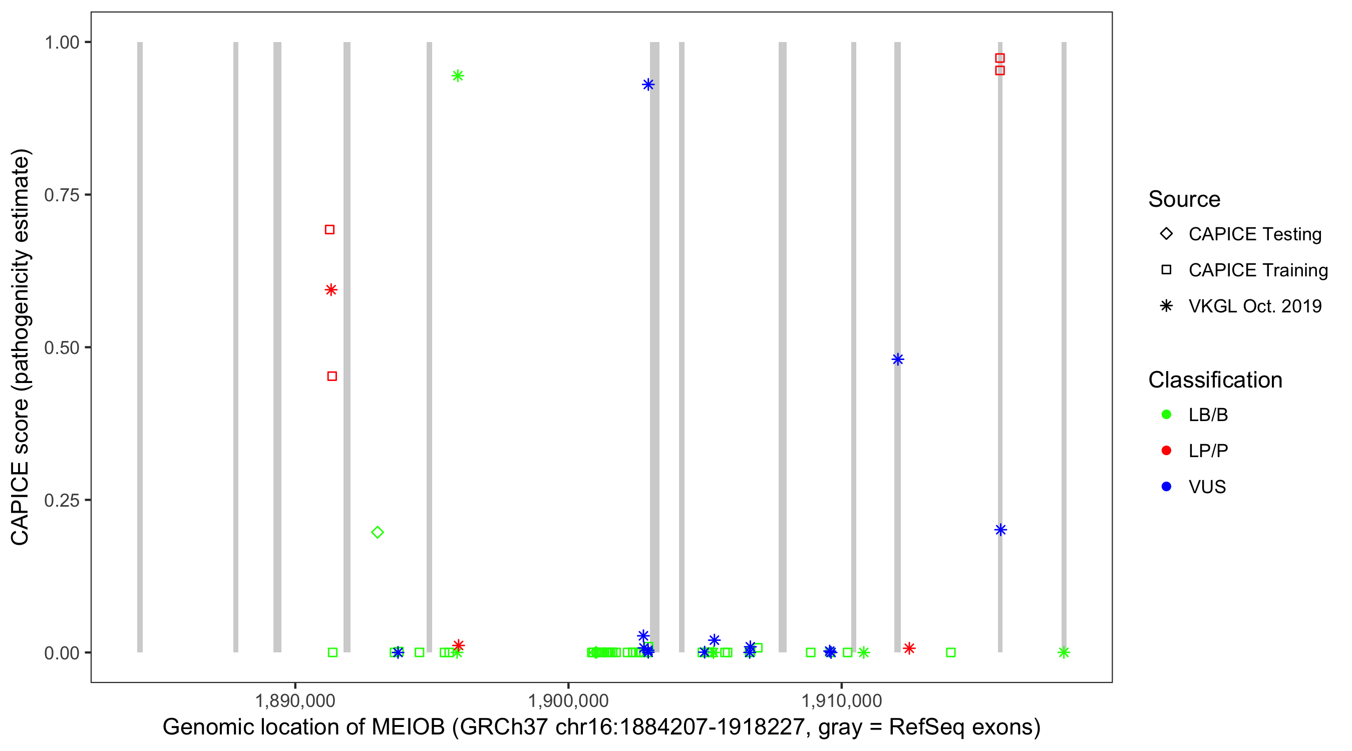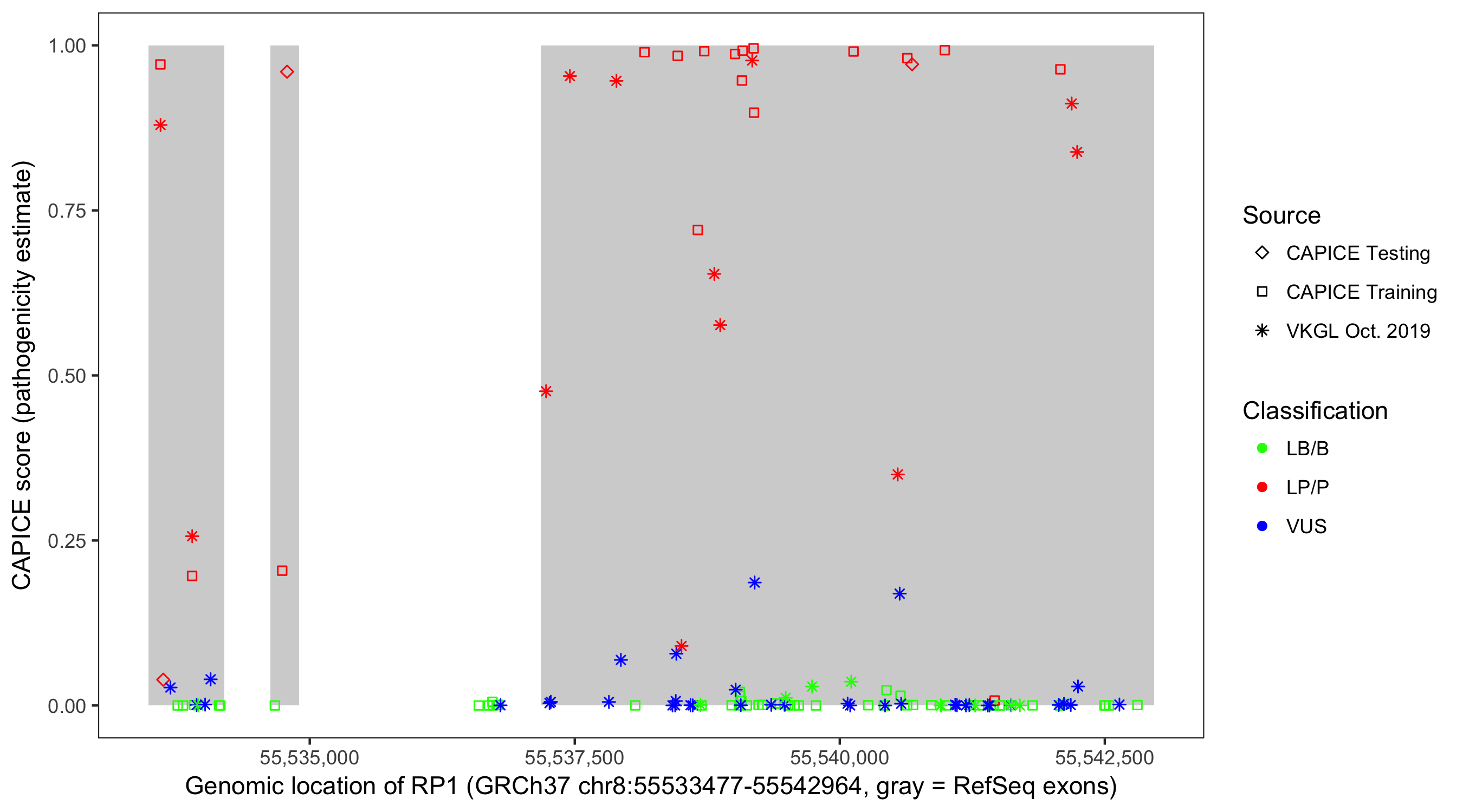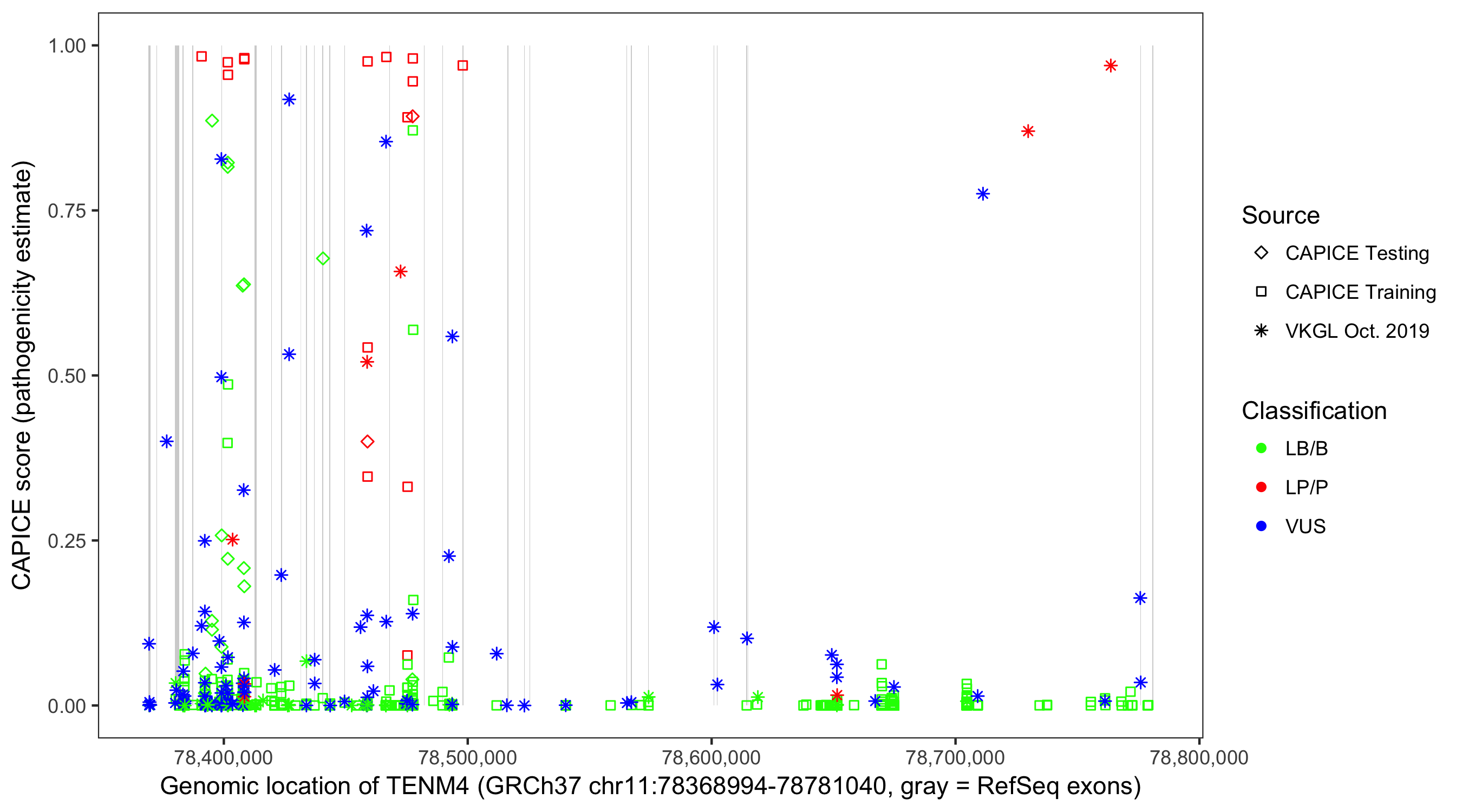 Shown are CAPICE train/test variants plus VKGL Oct 2019.