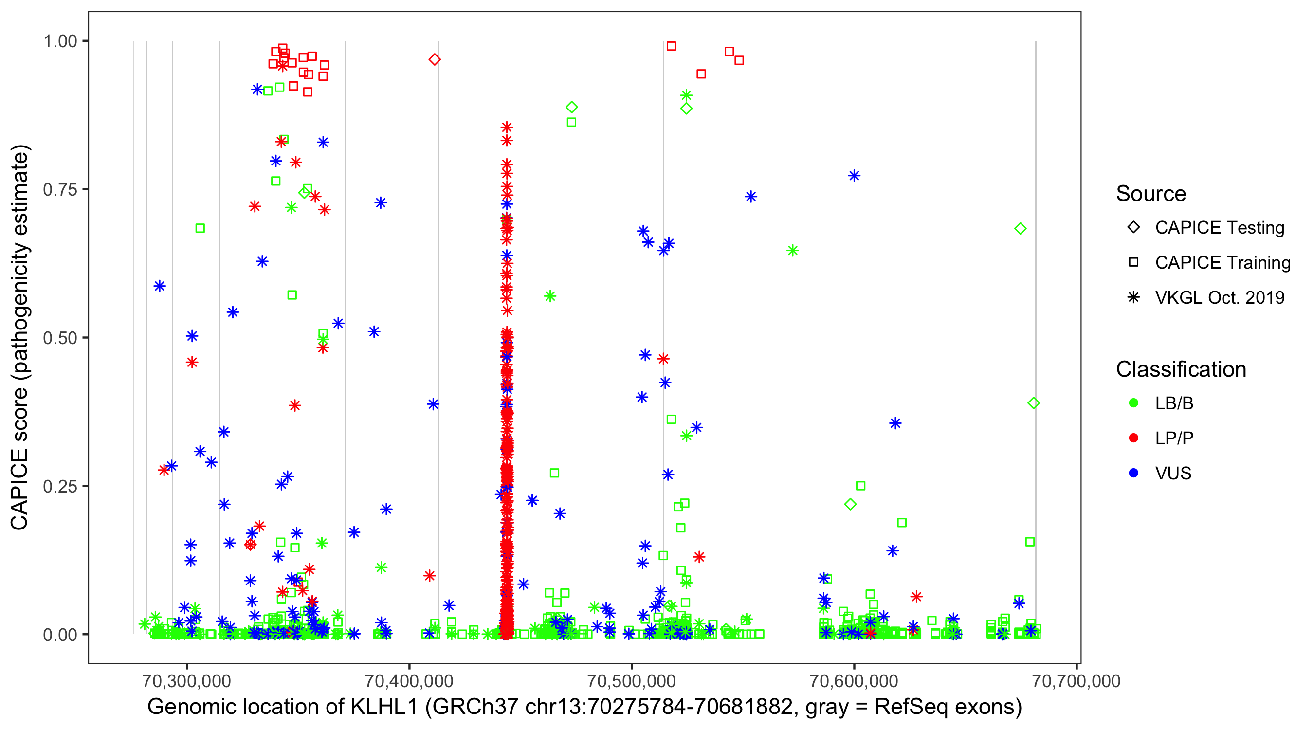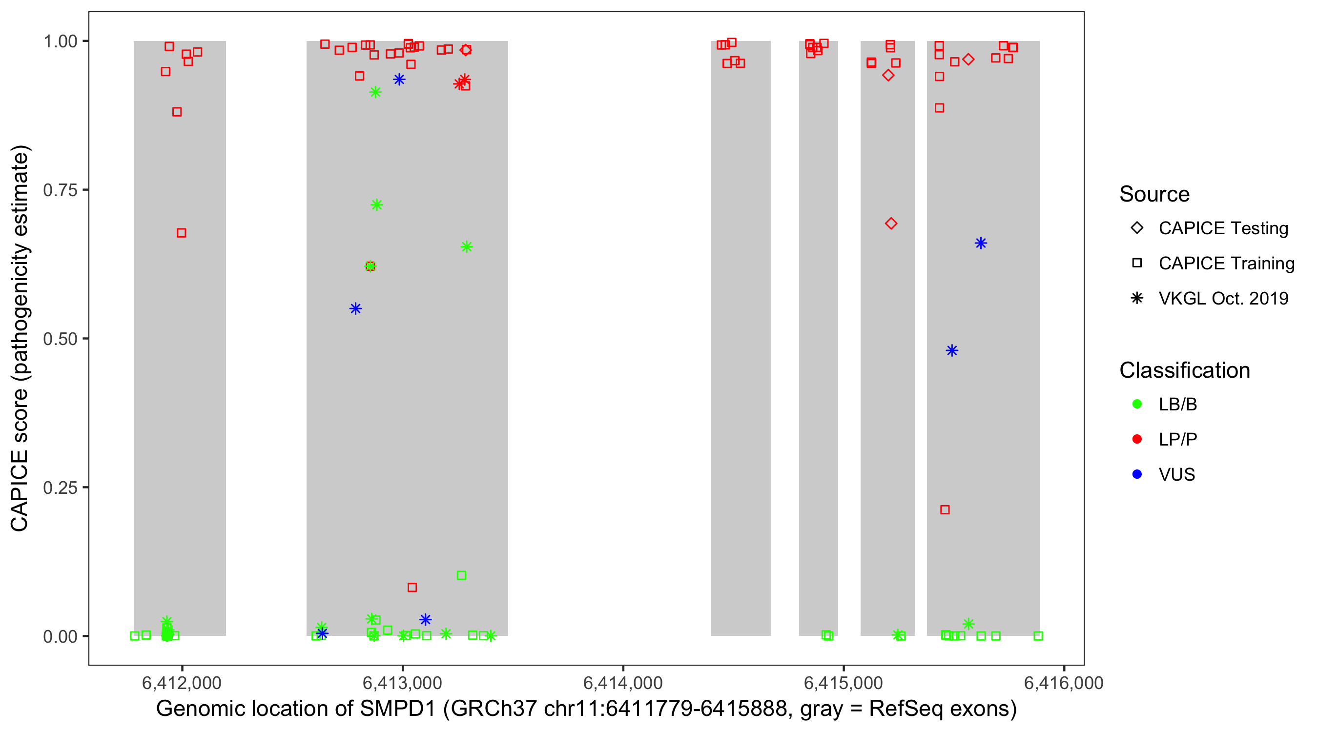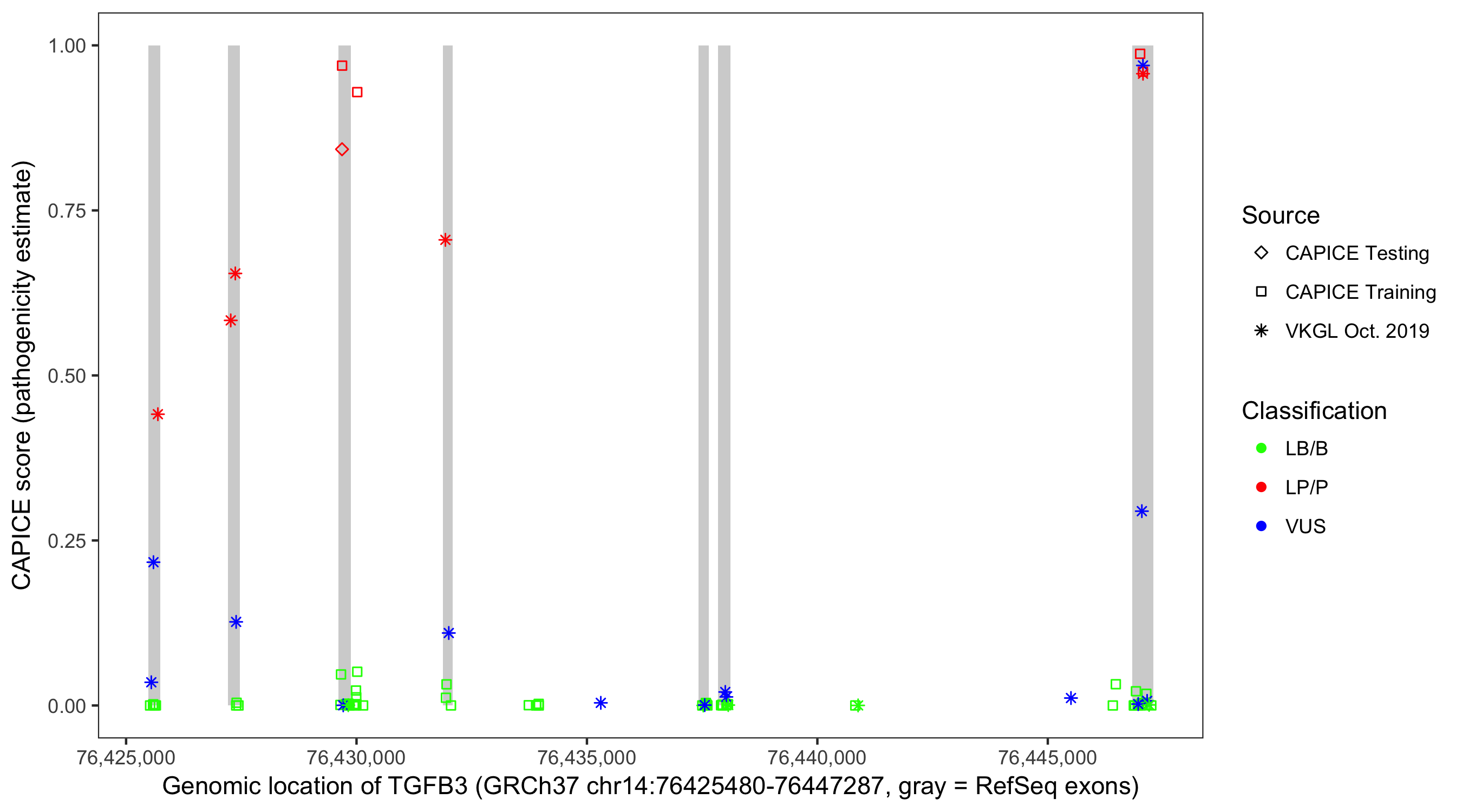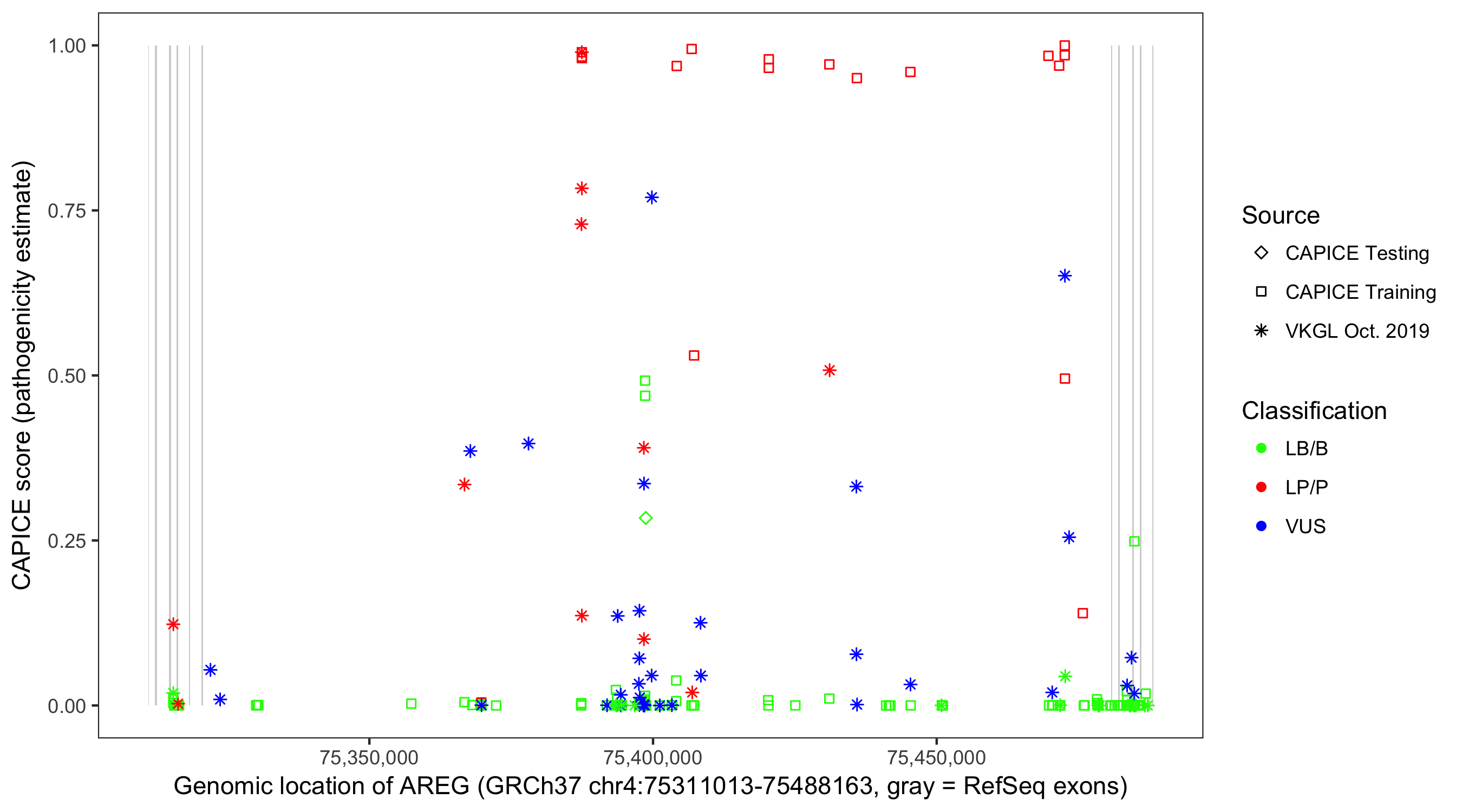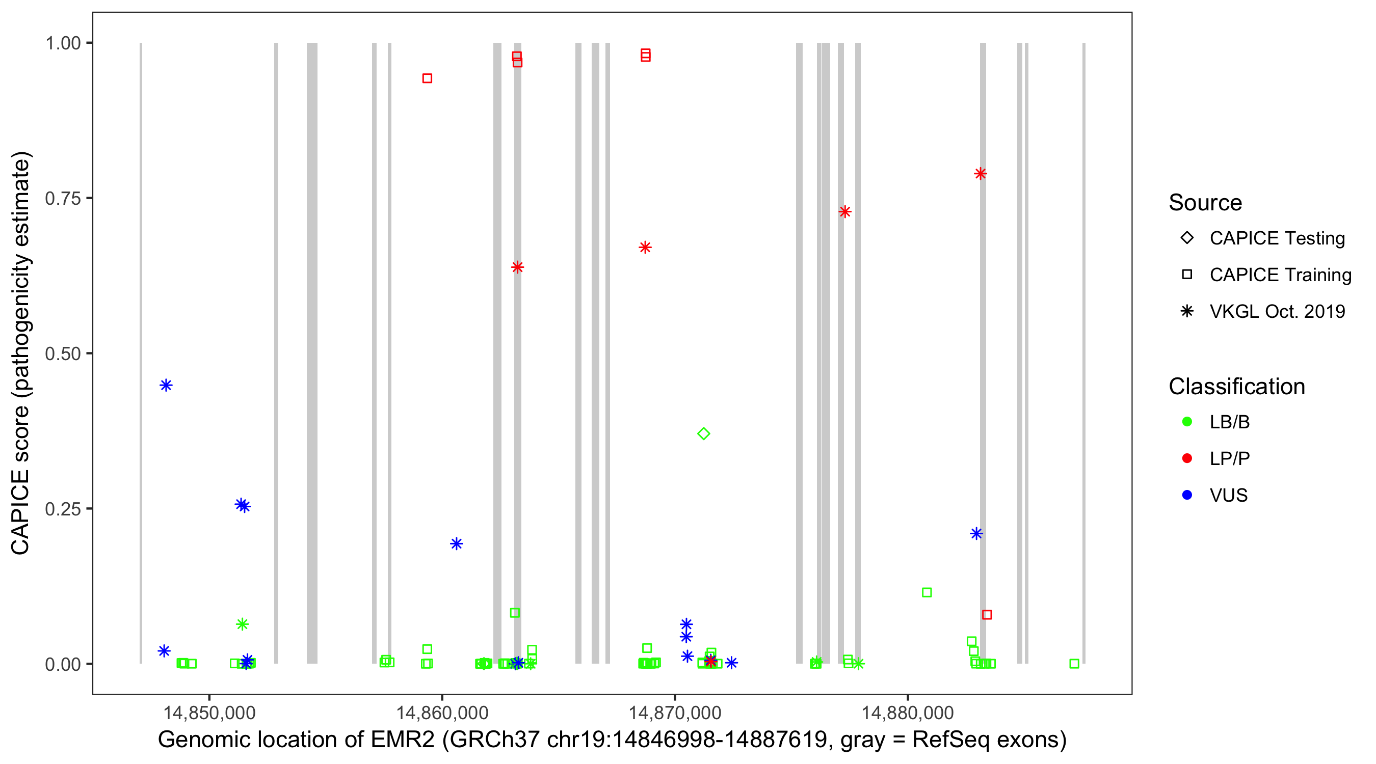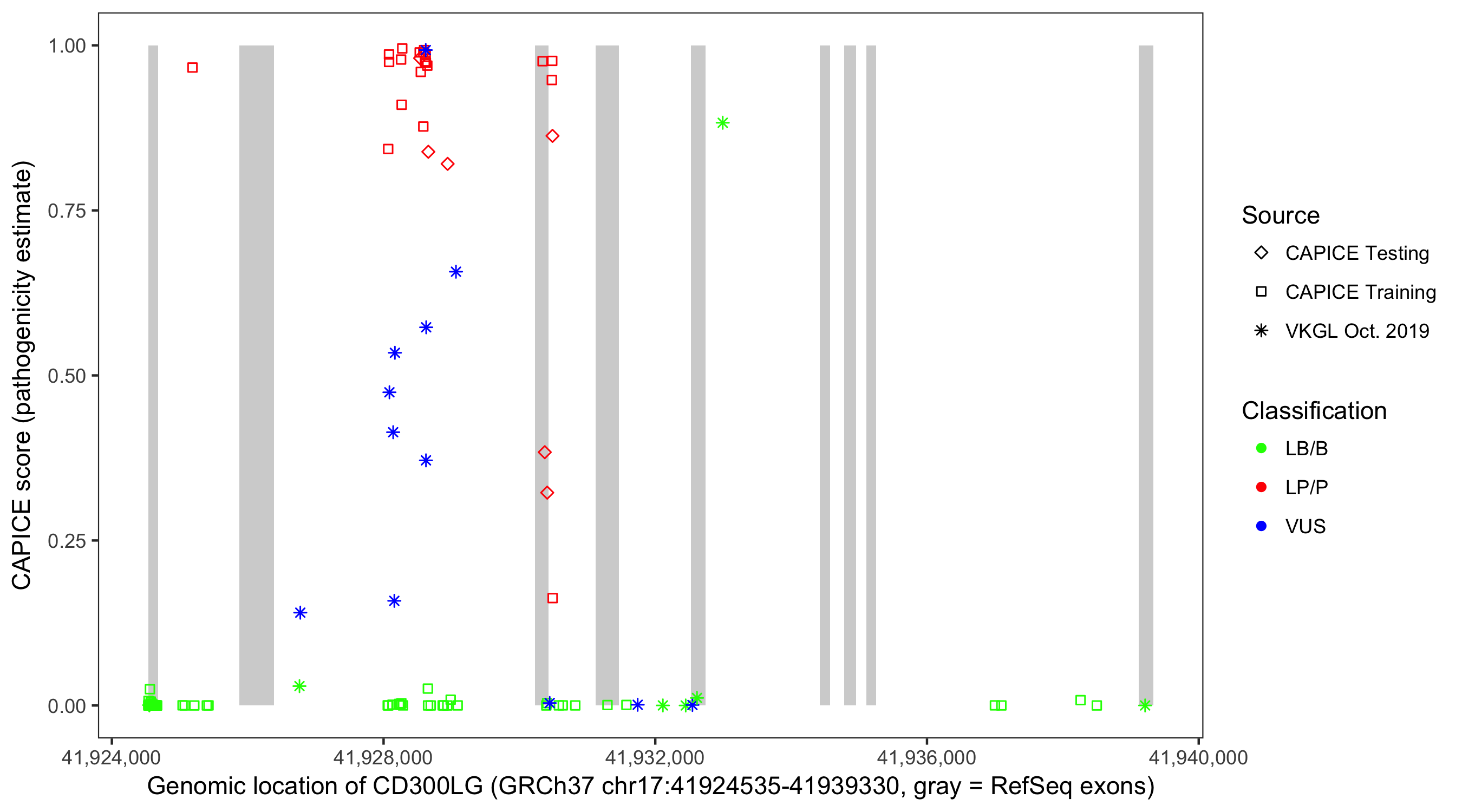 Shown are CAPICE train/test variants plus VKGL Oct 2019.