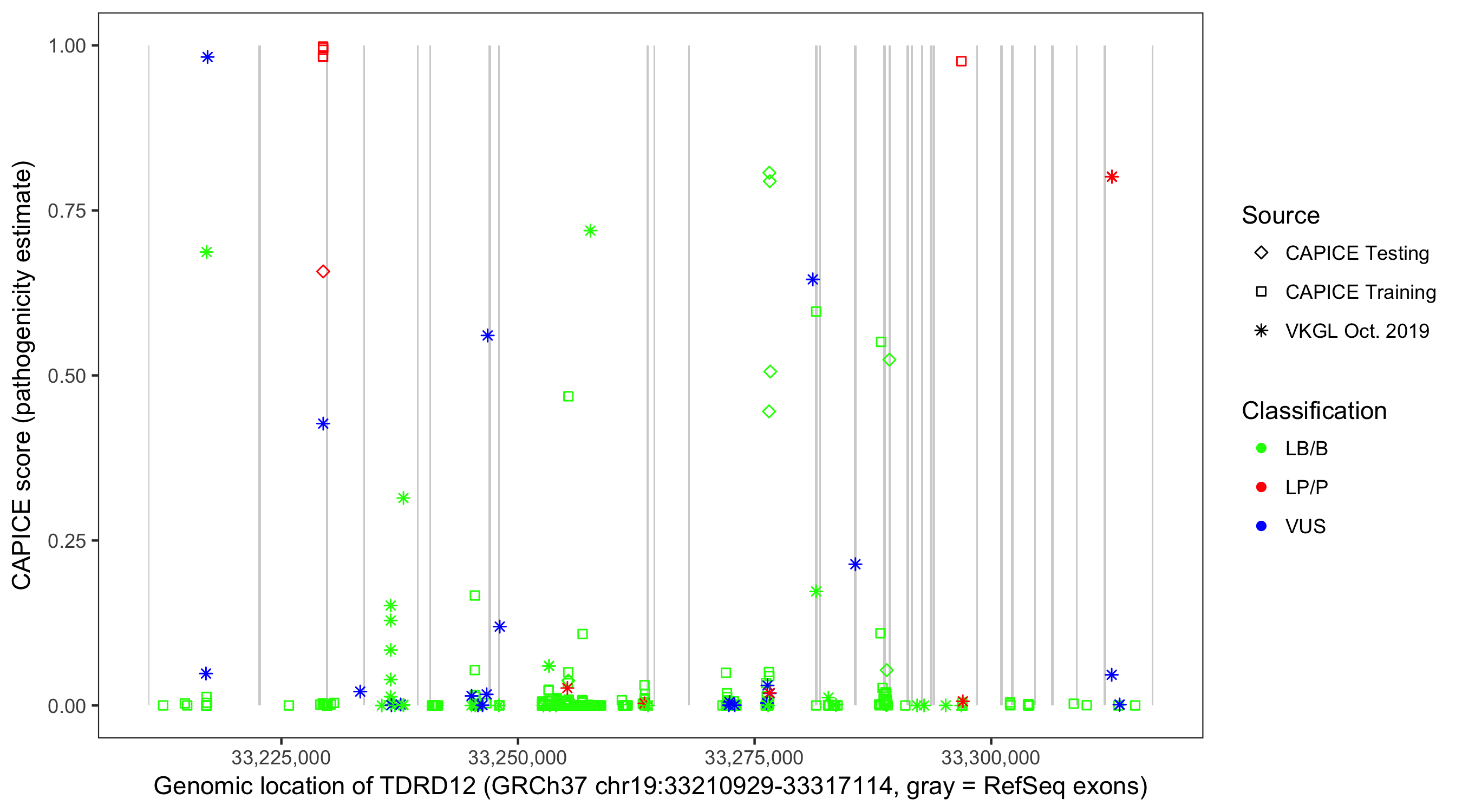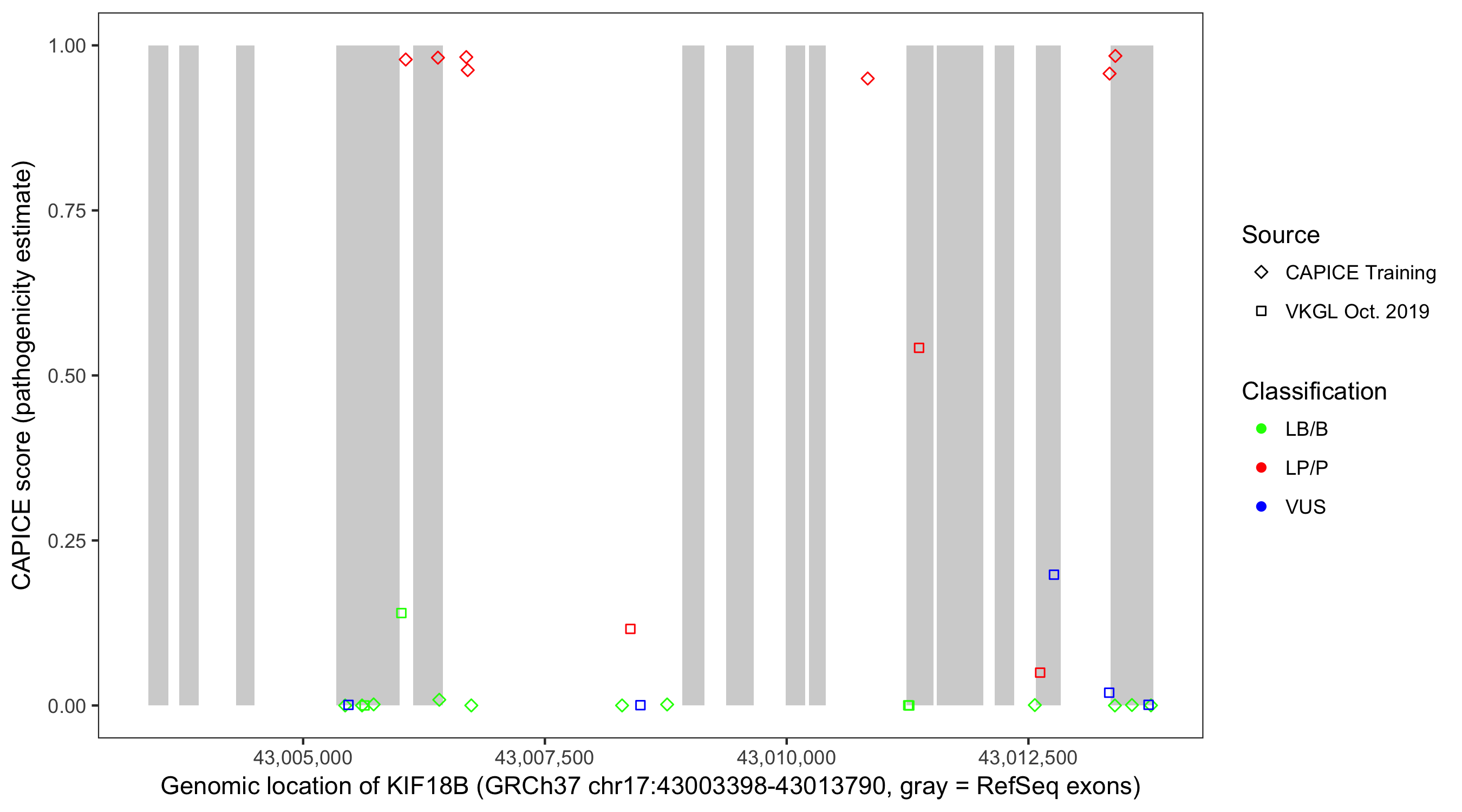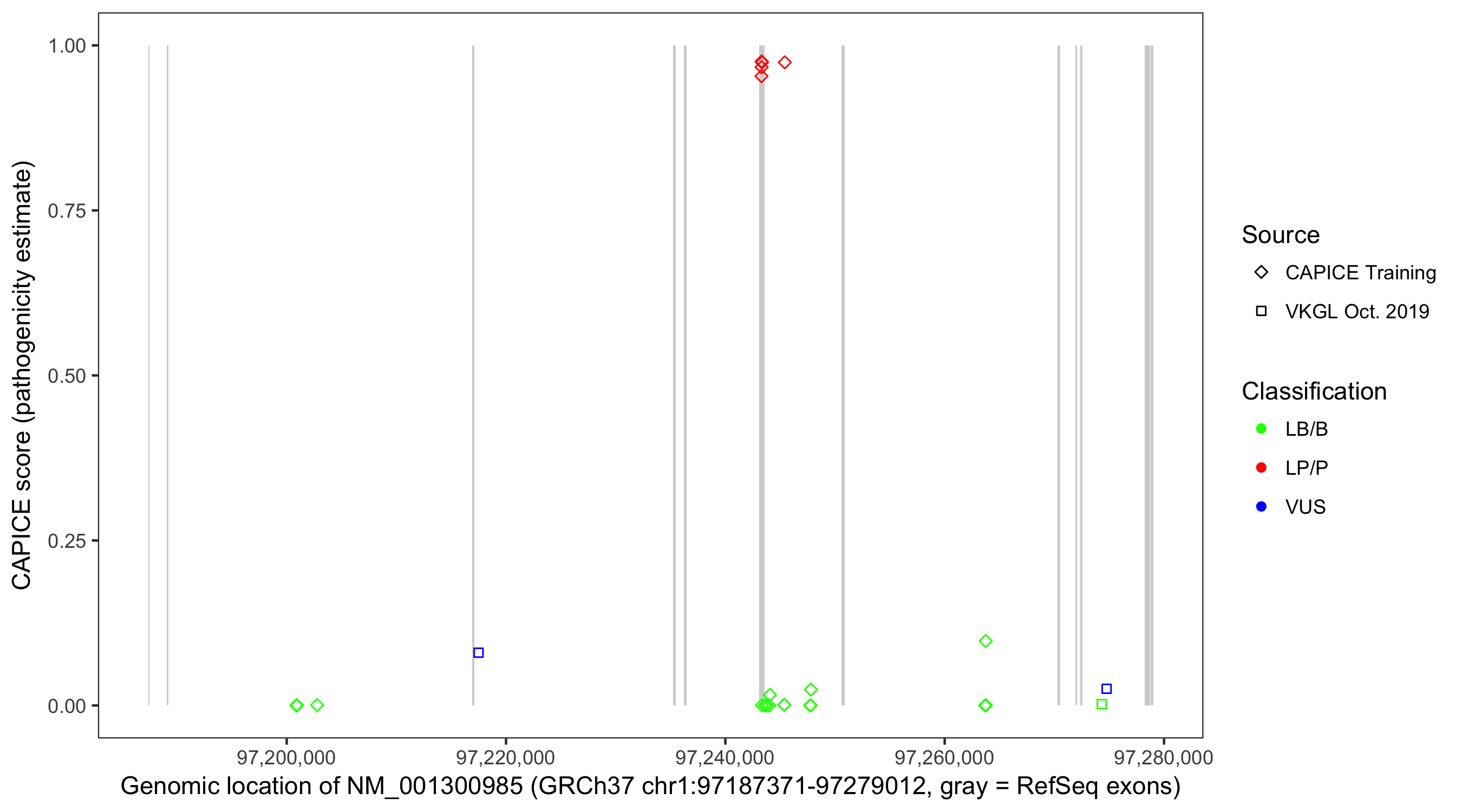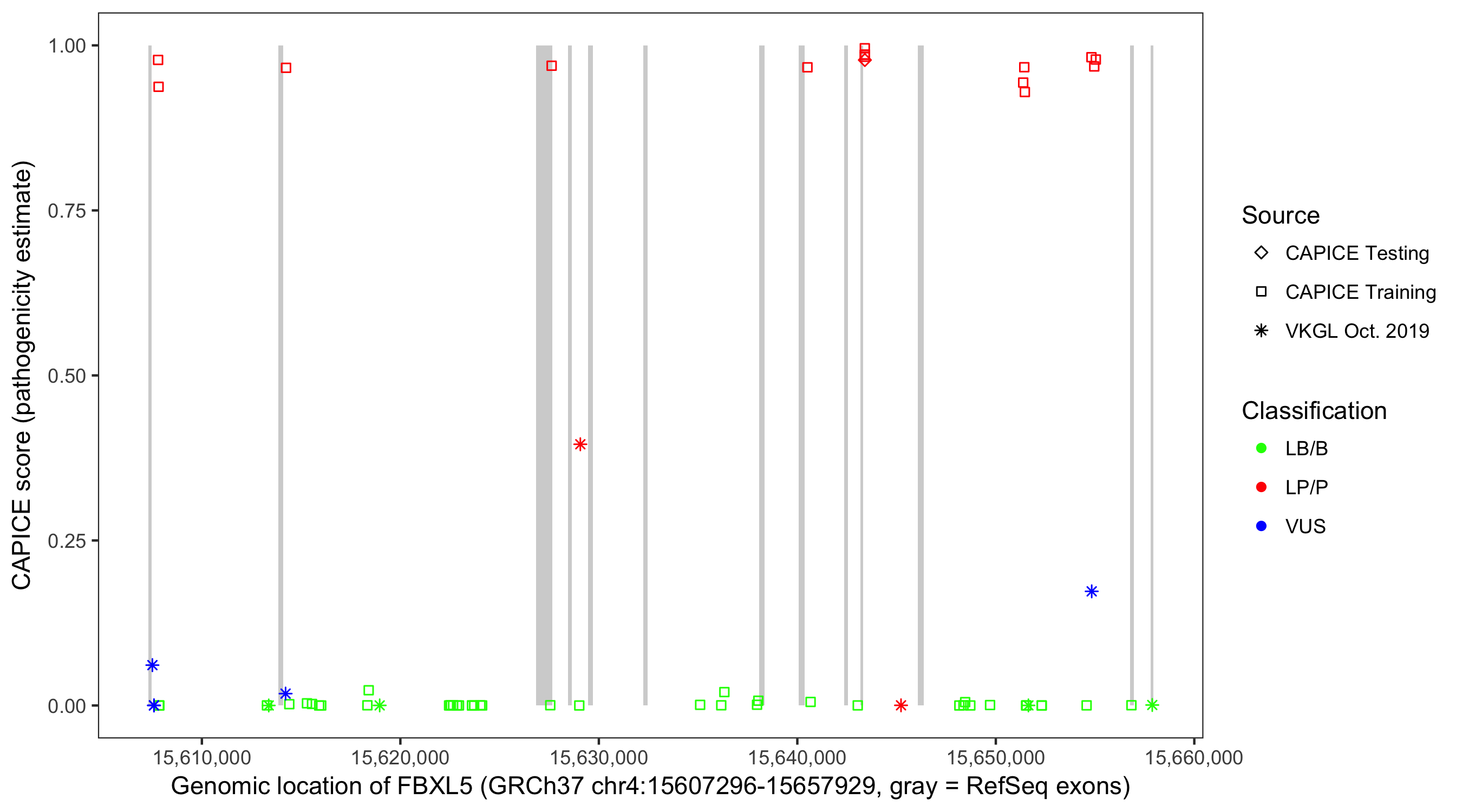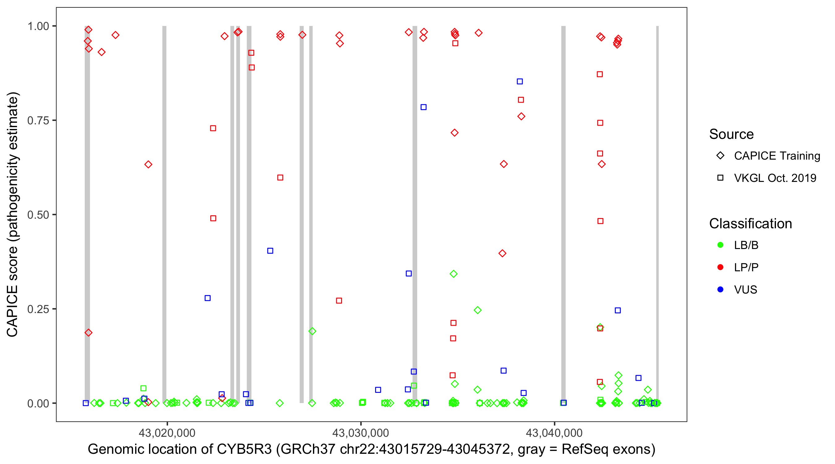 Shown are CAPICE train/test variants plus VKGL Oct 2019.