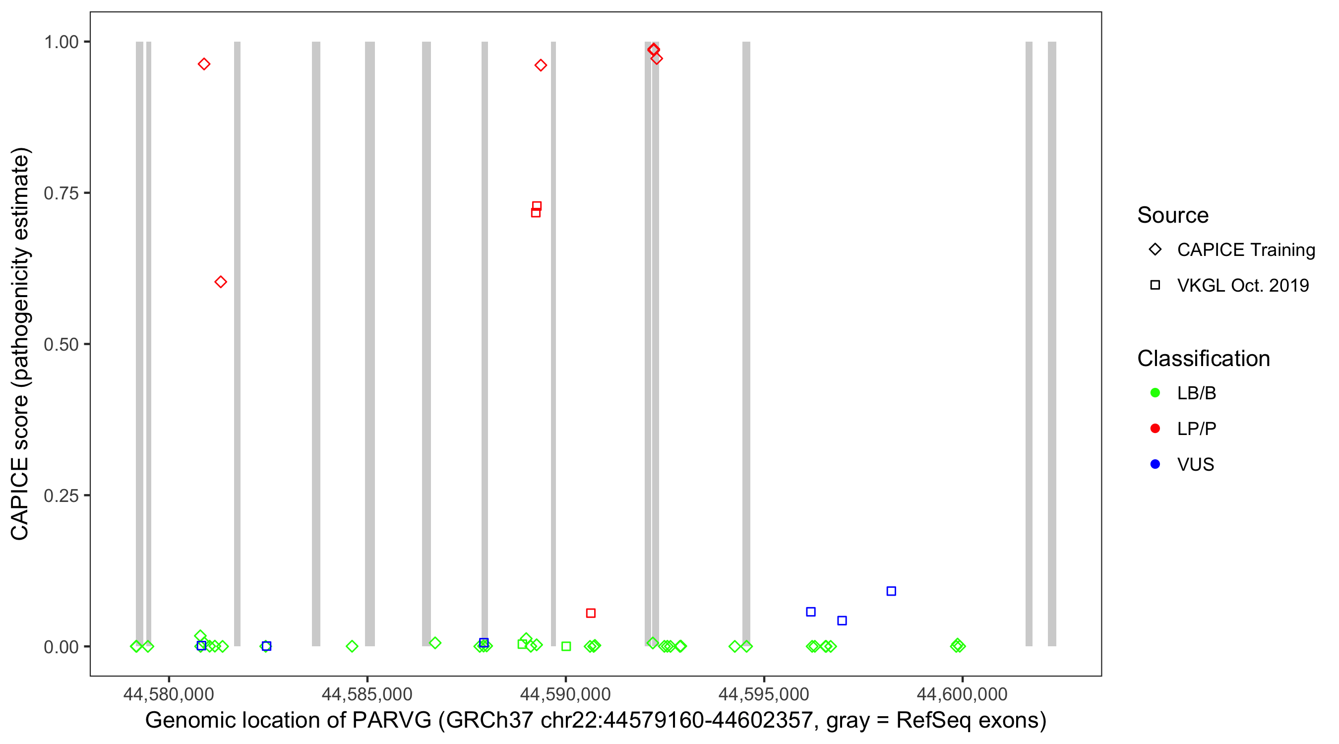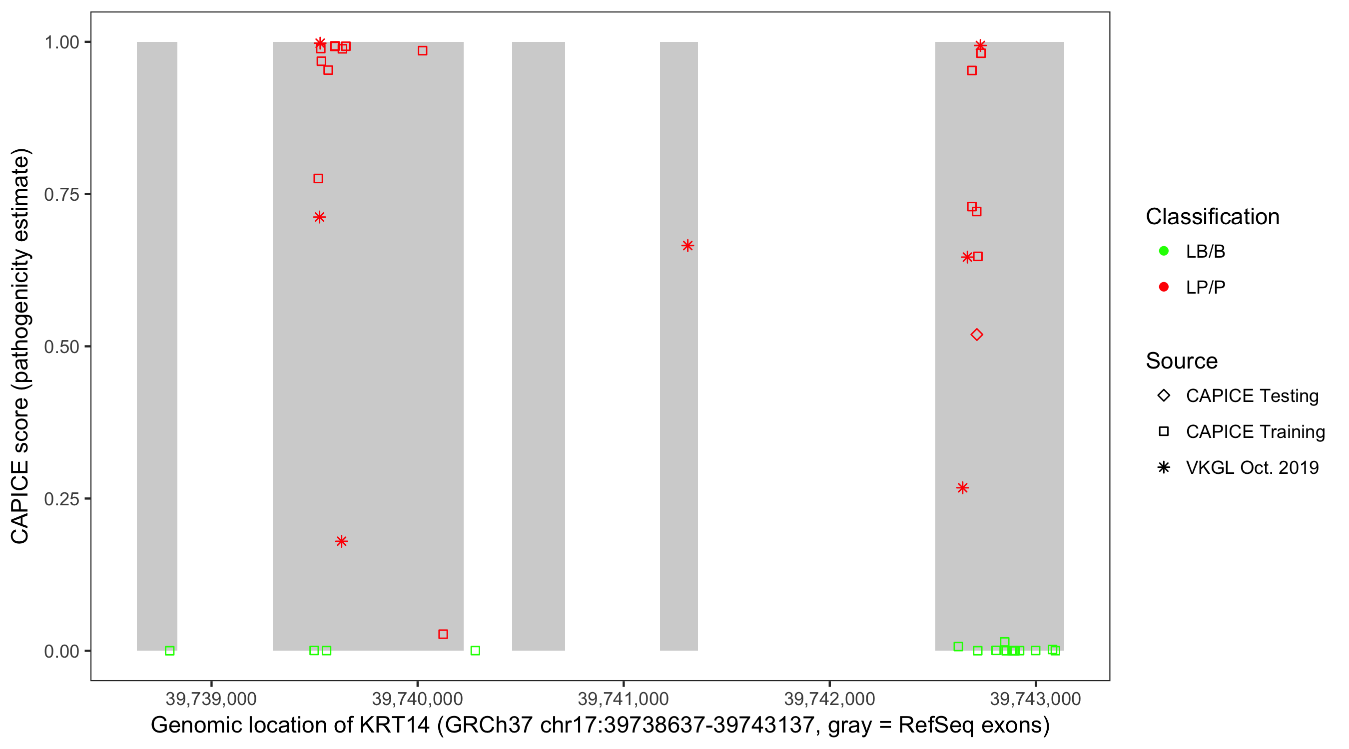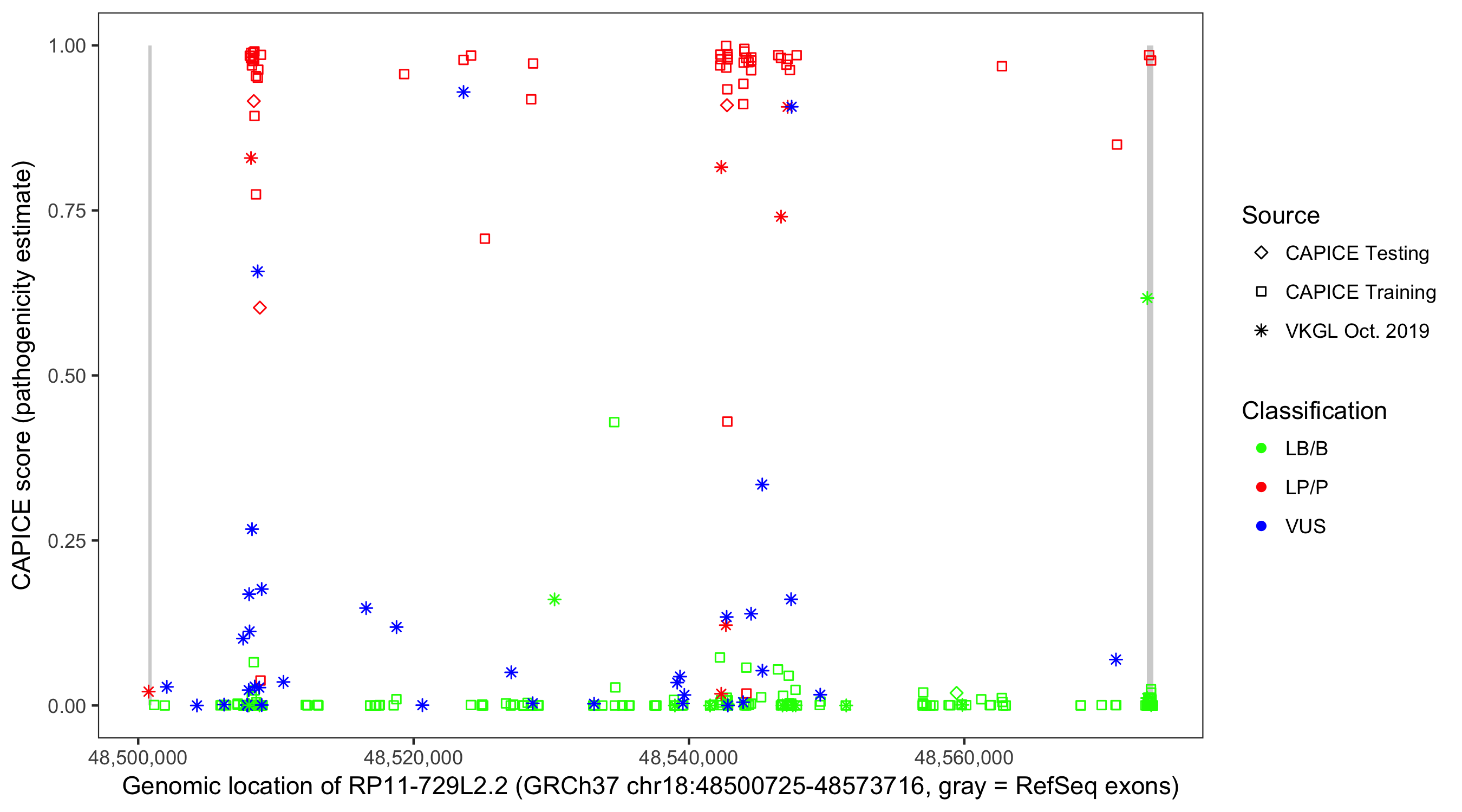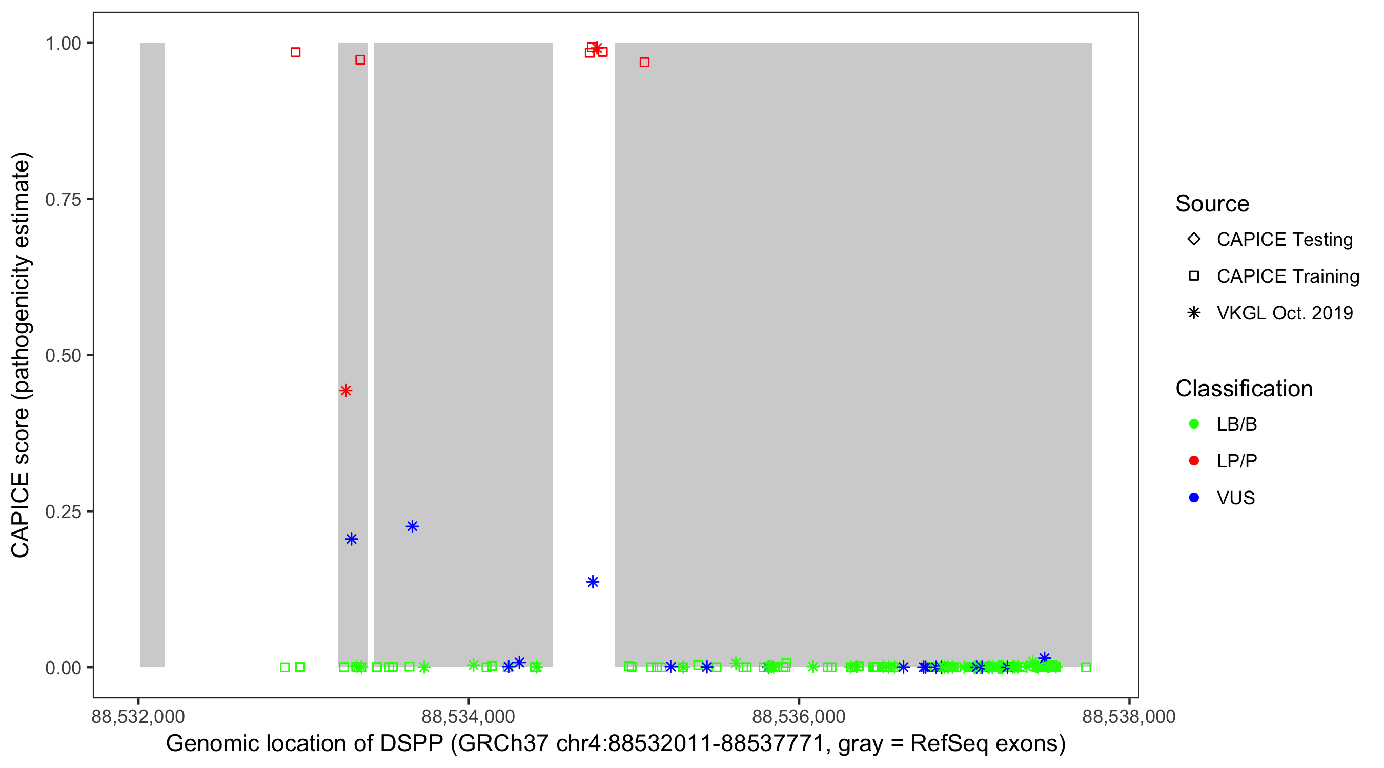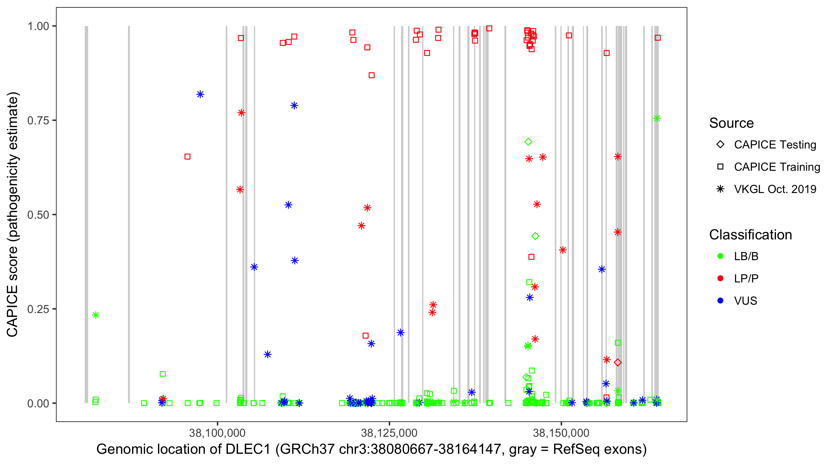 Shown are CAPICE train/test variants plus VKGL Oct 2019.