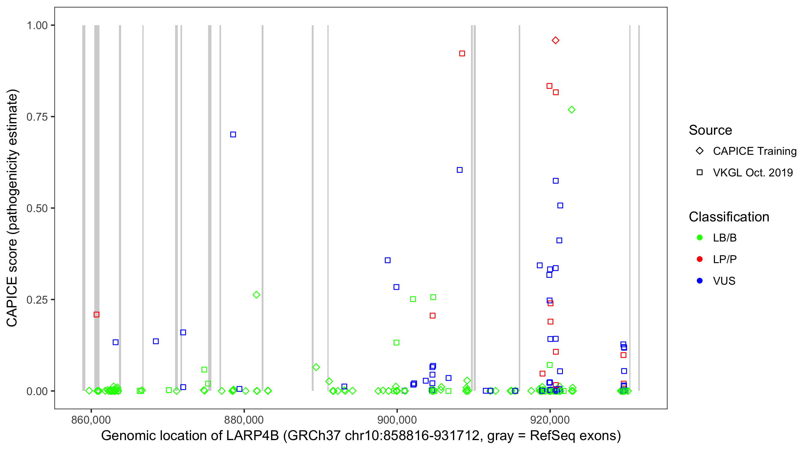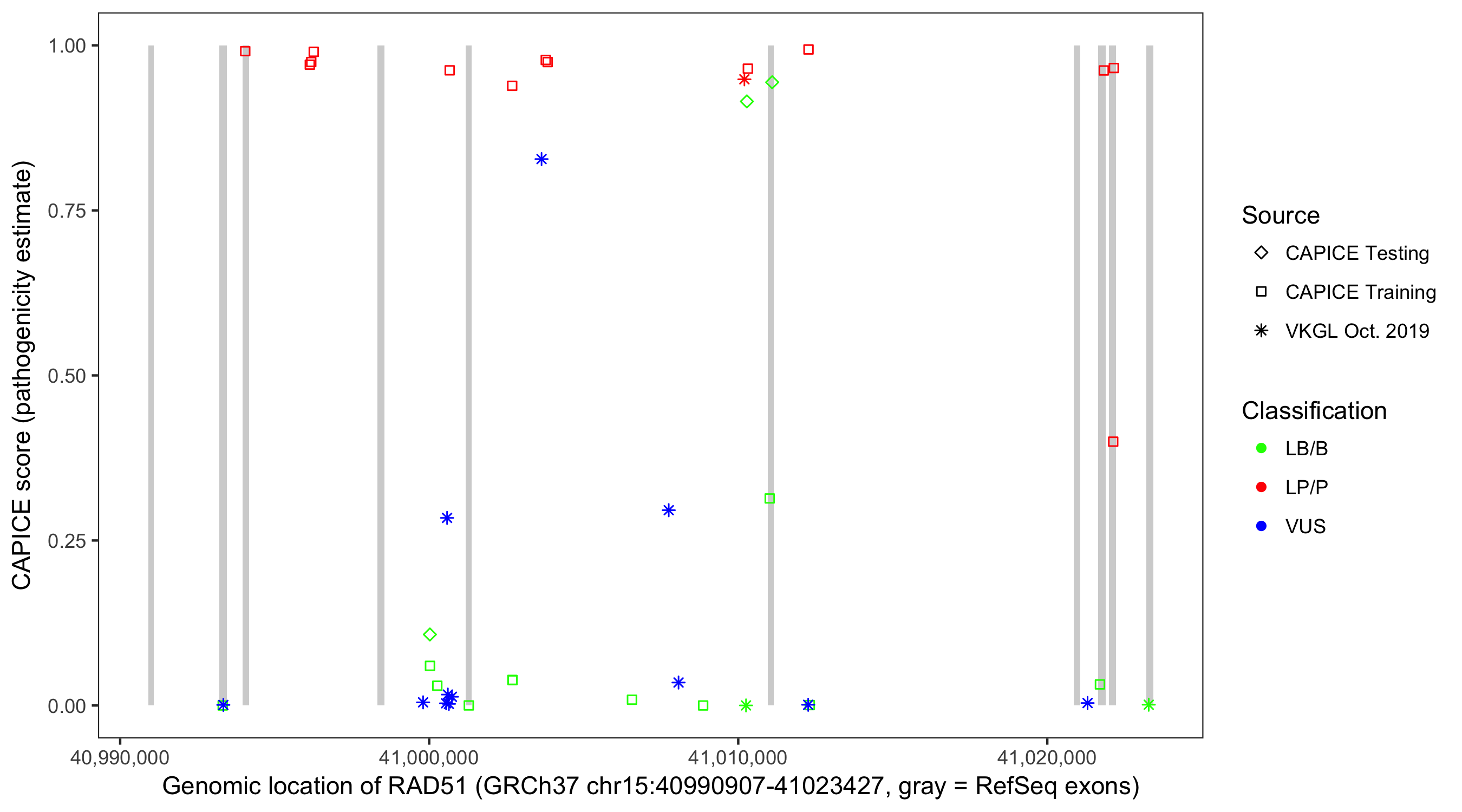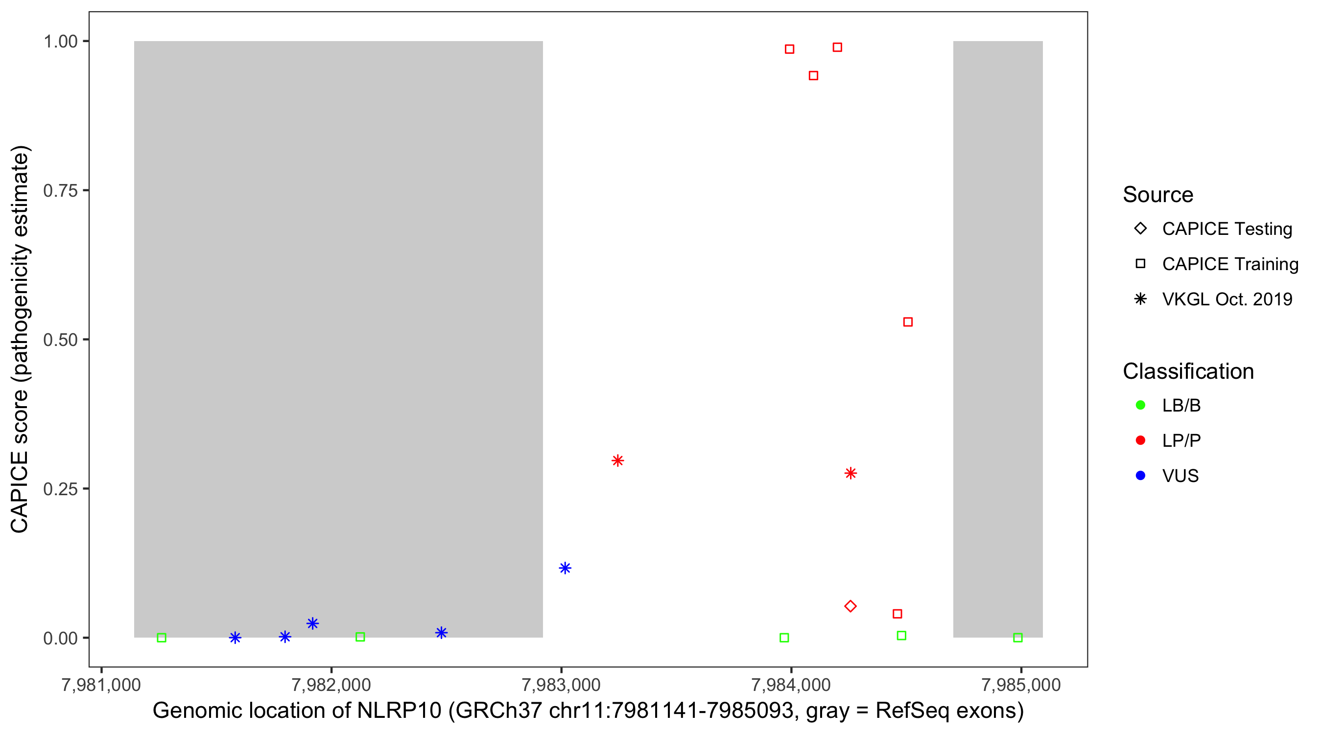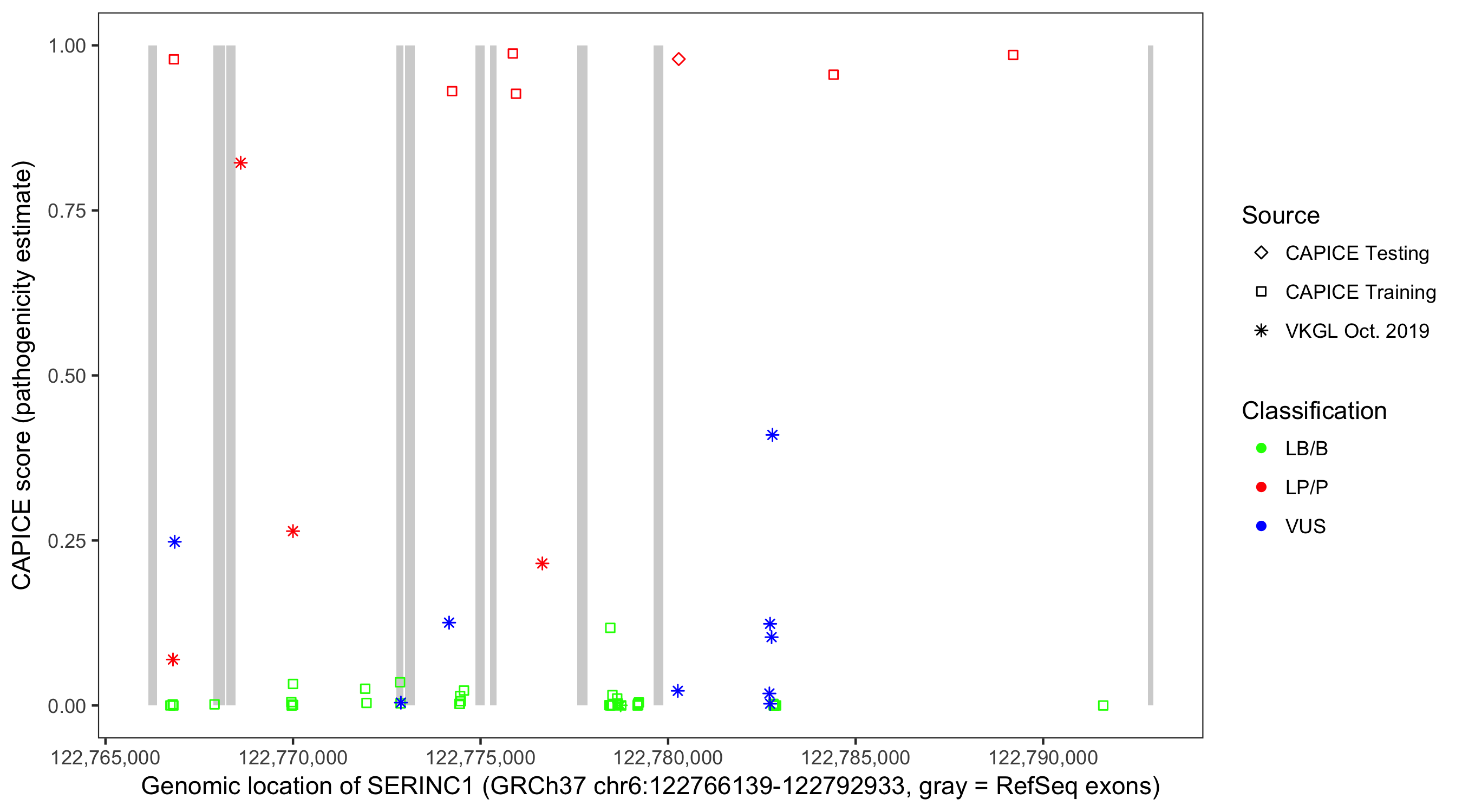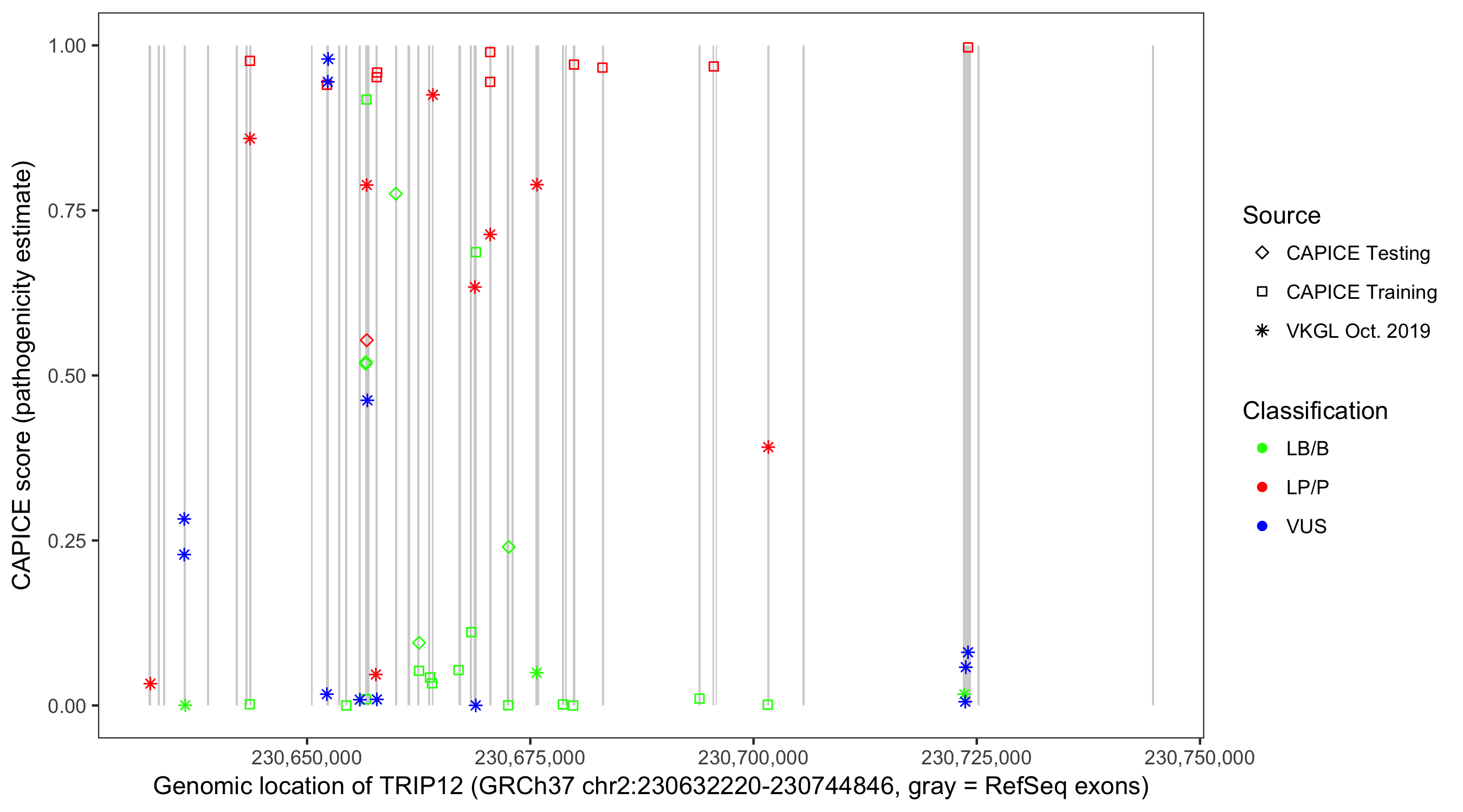 Shown are CAPICE train/test variants plus VKGL Oct 2019.