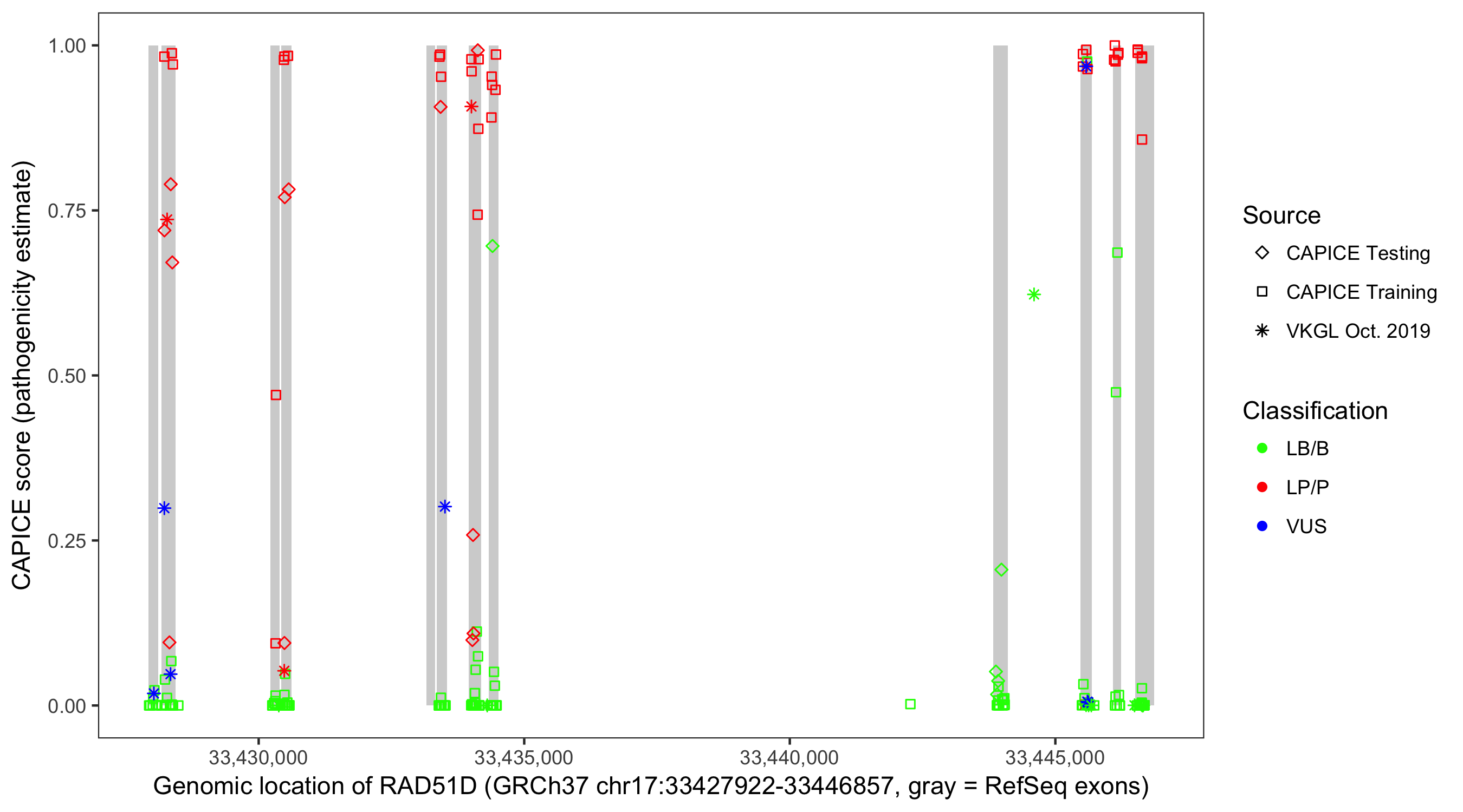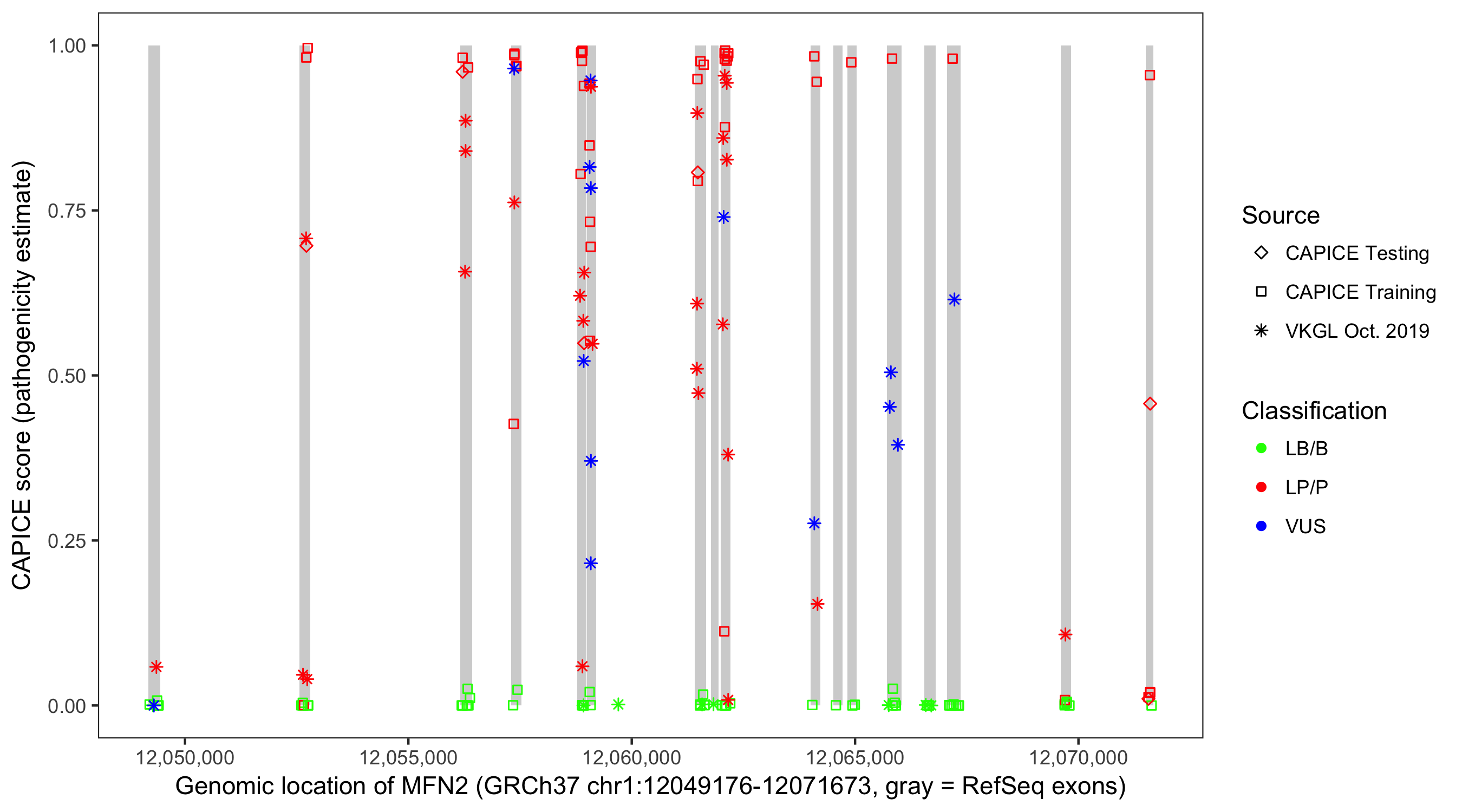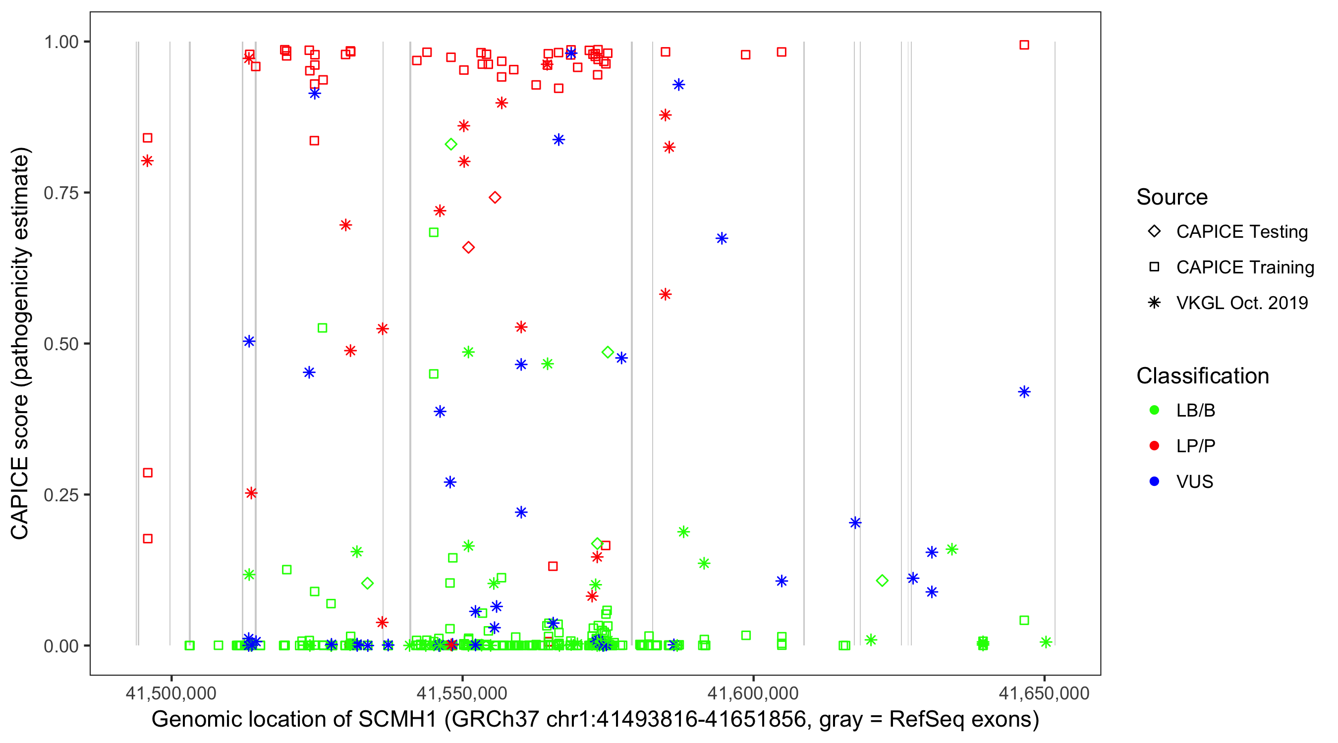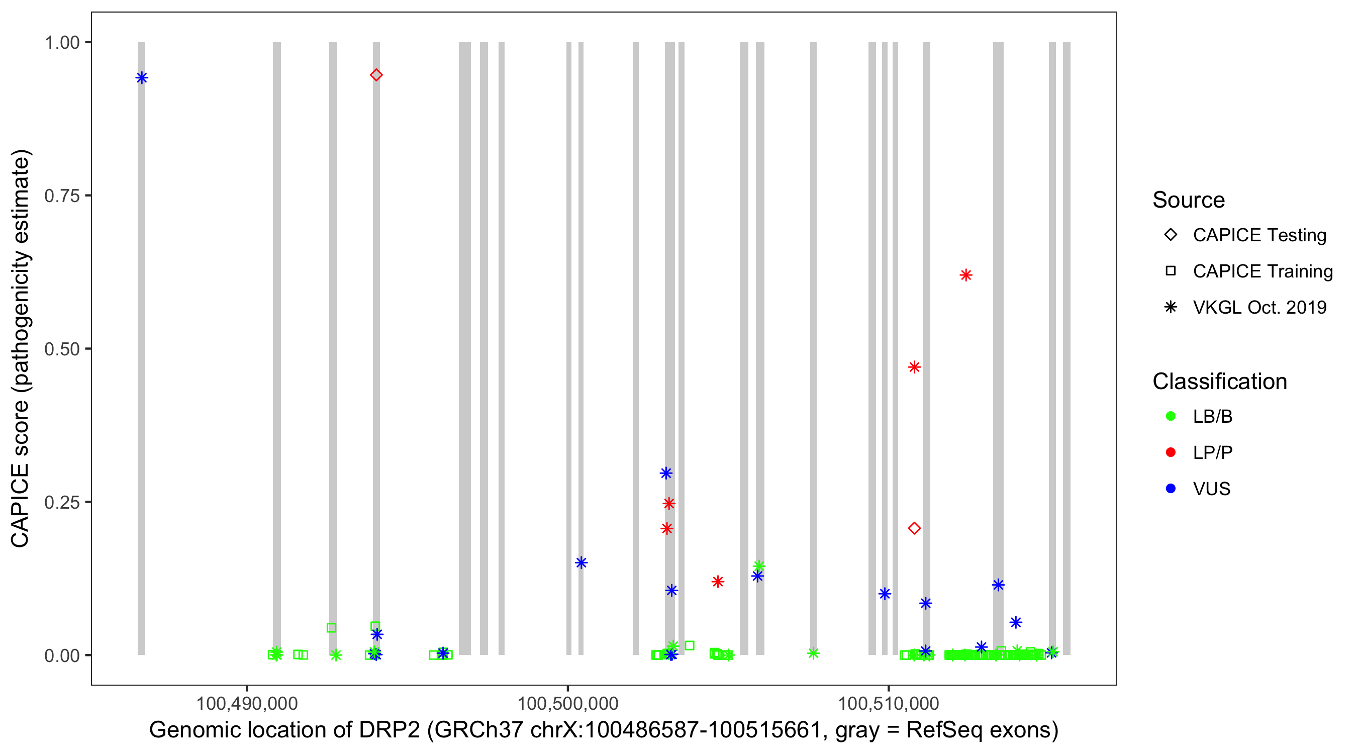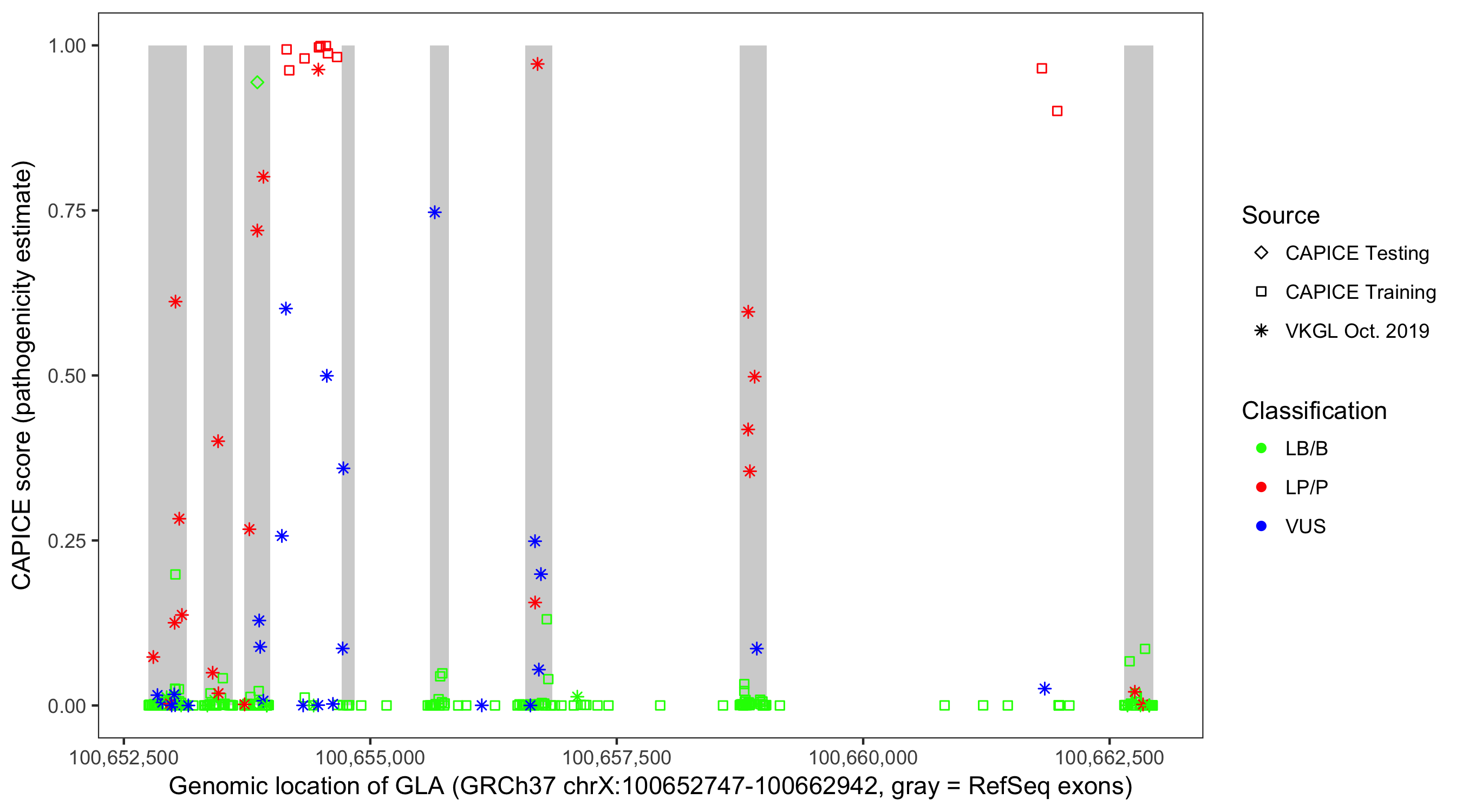 Shown are CAPICE train/test variants plus VKGL Oct 2019.