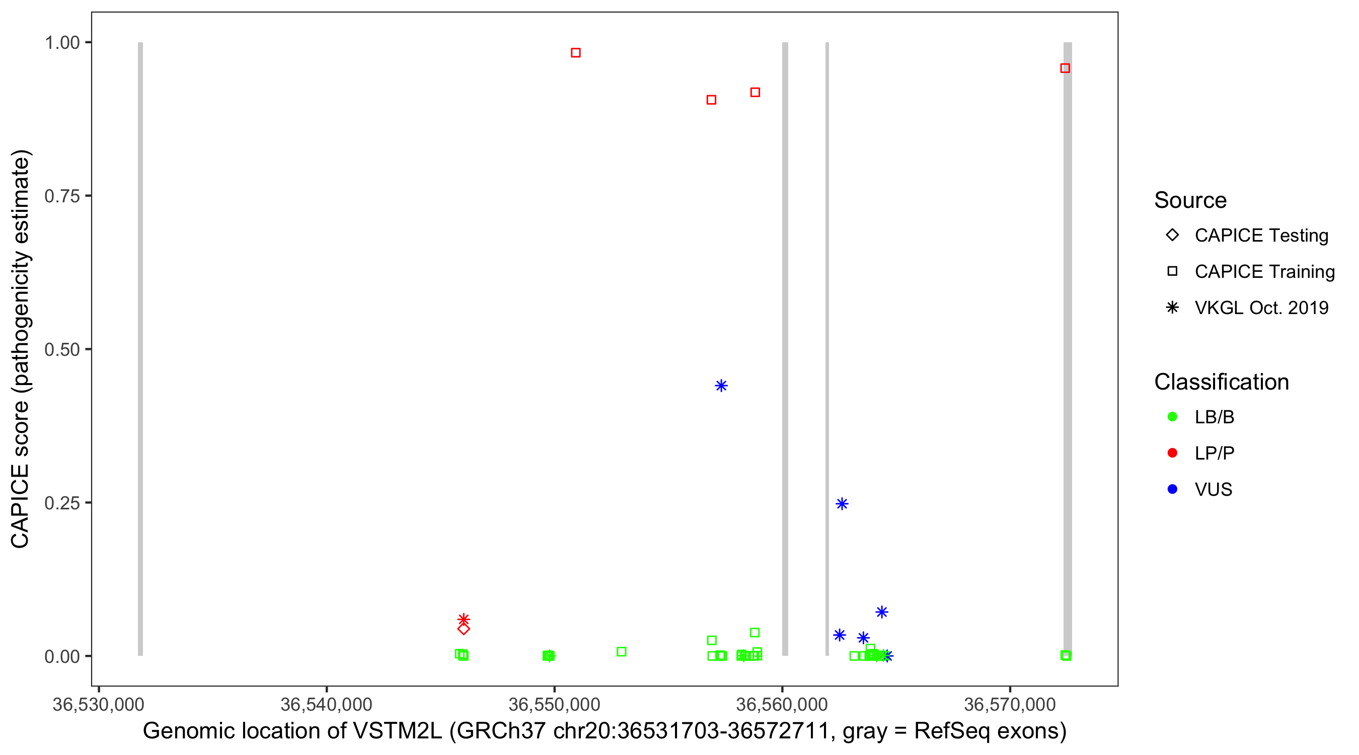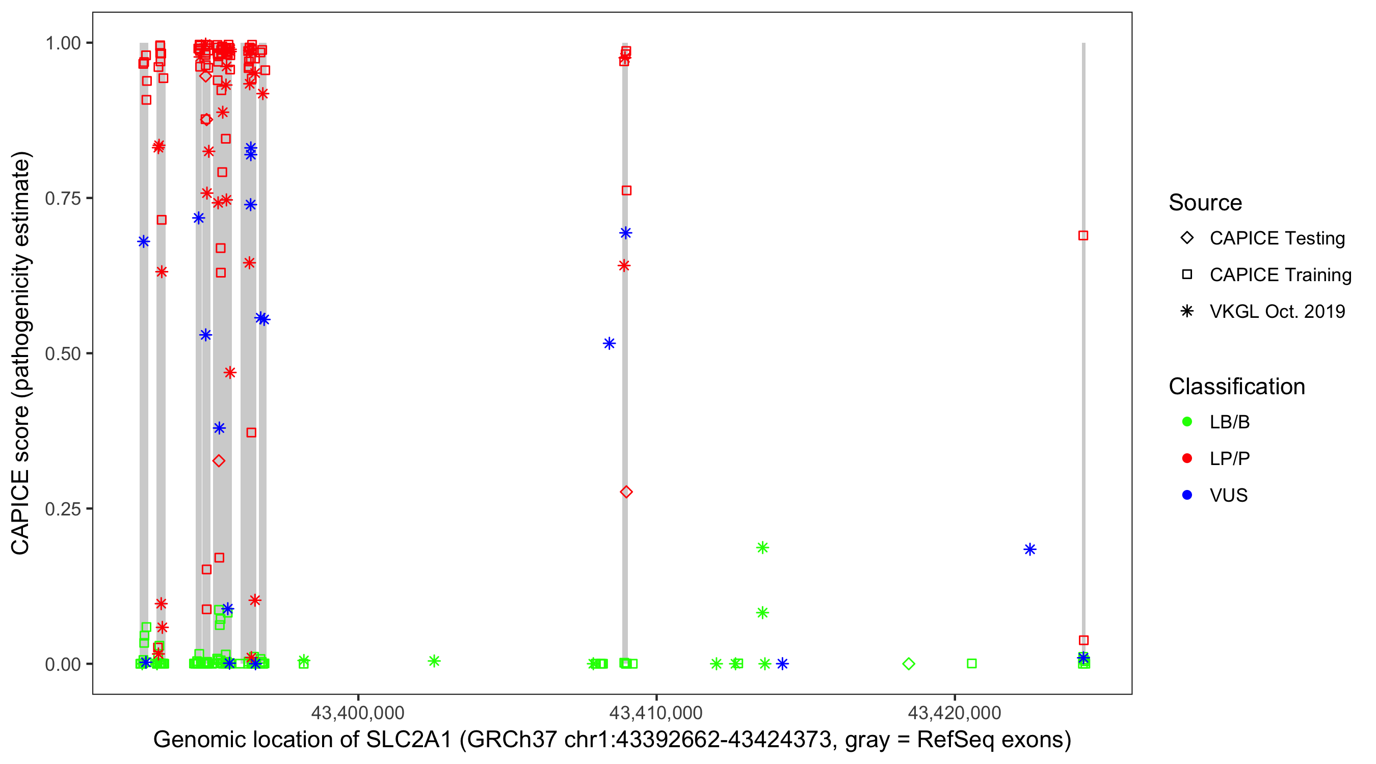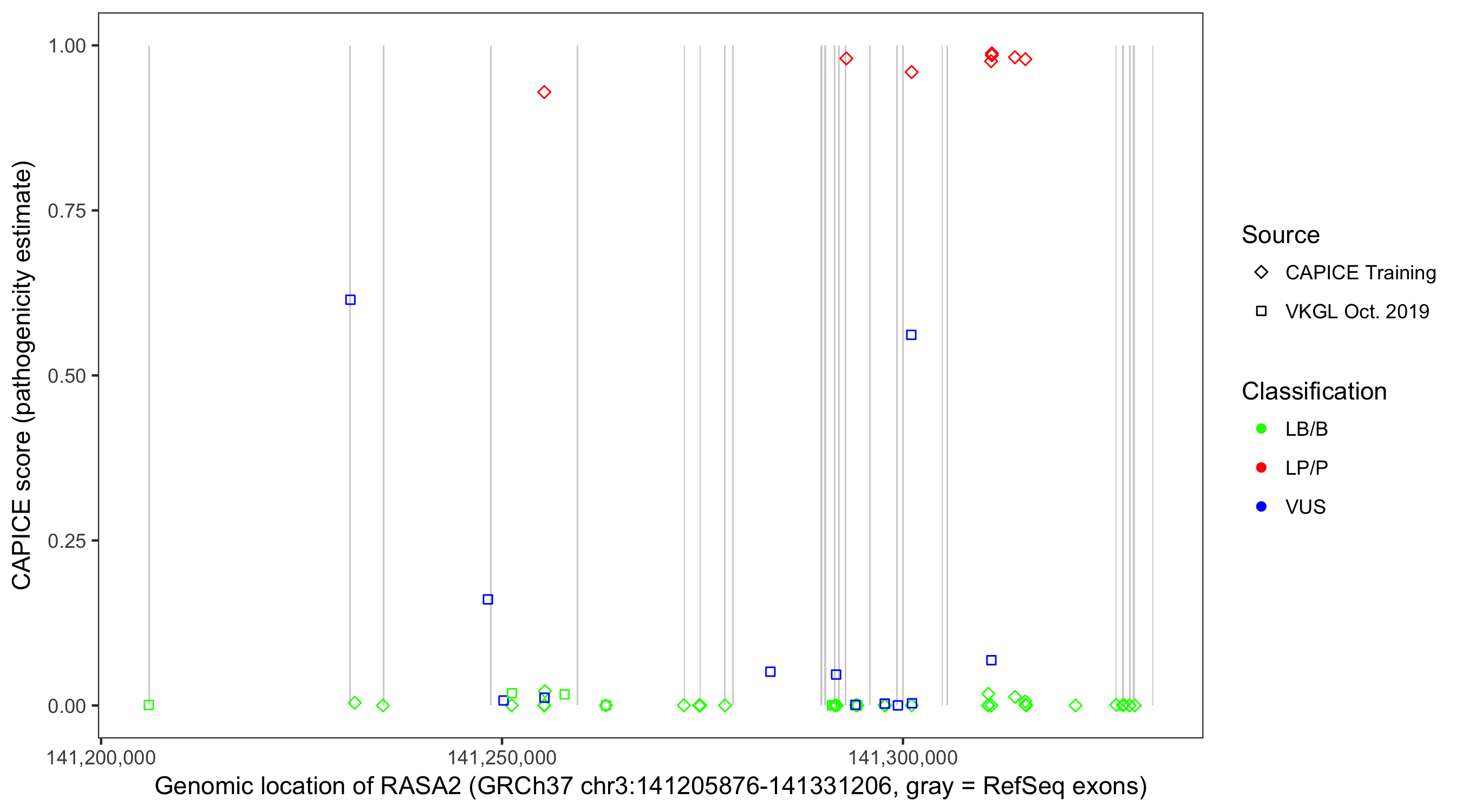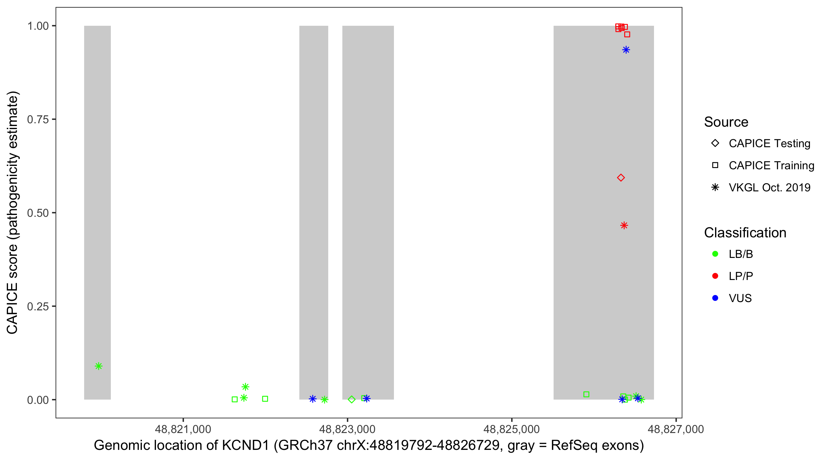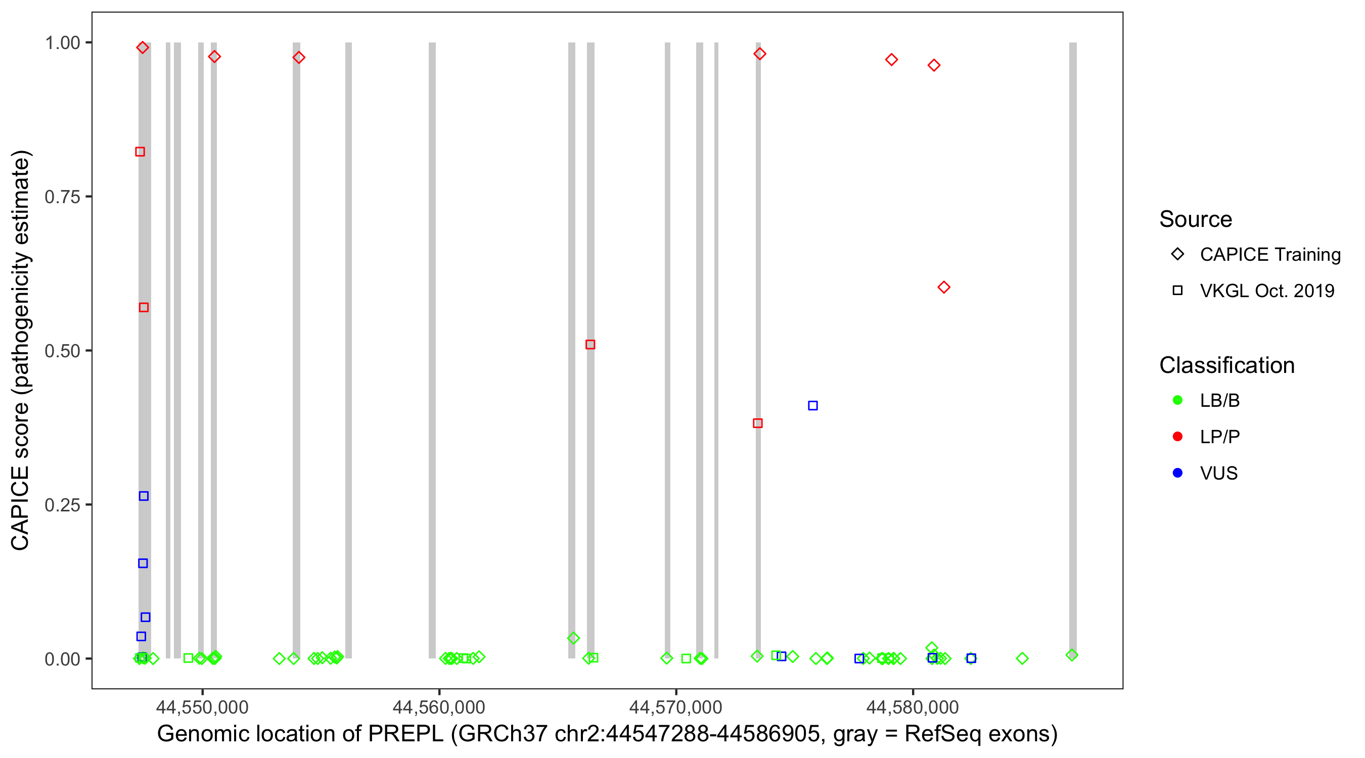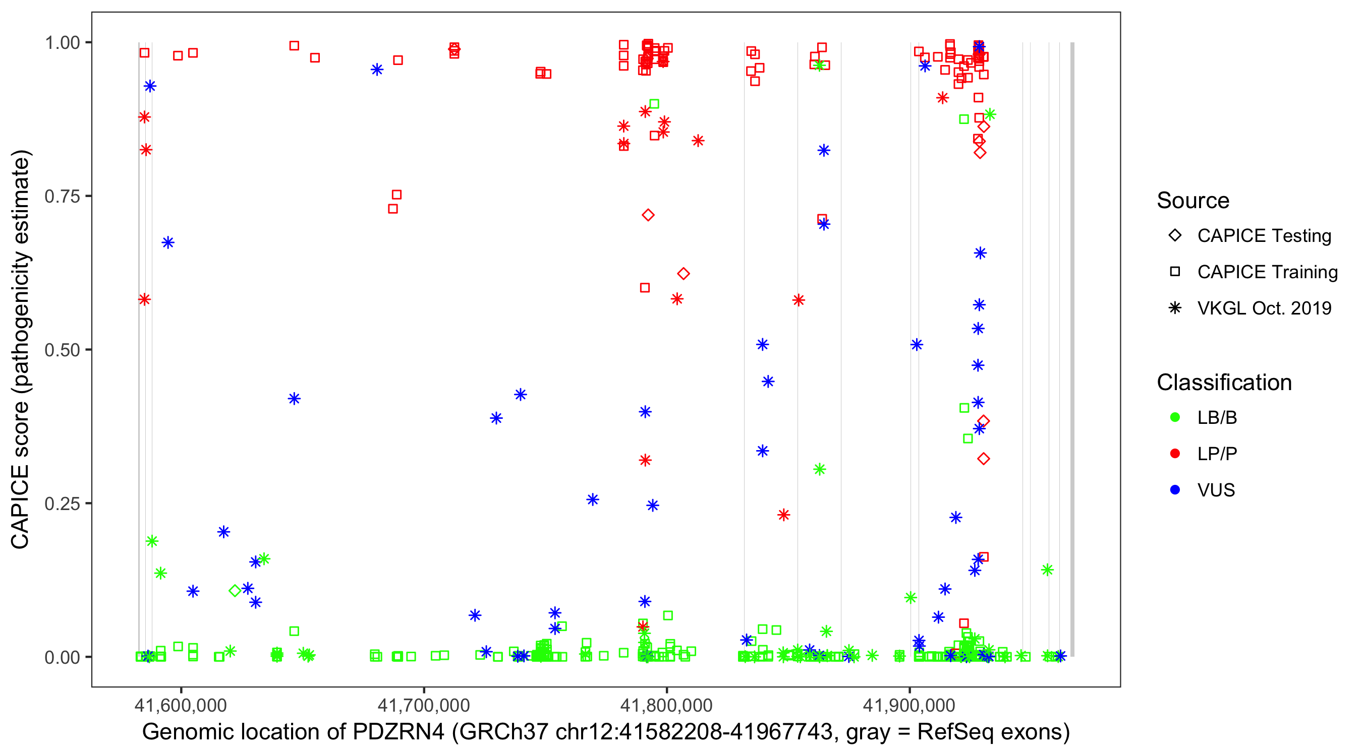 Shown are CAPICE train/test variants plus VKGL Oct 2019.