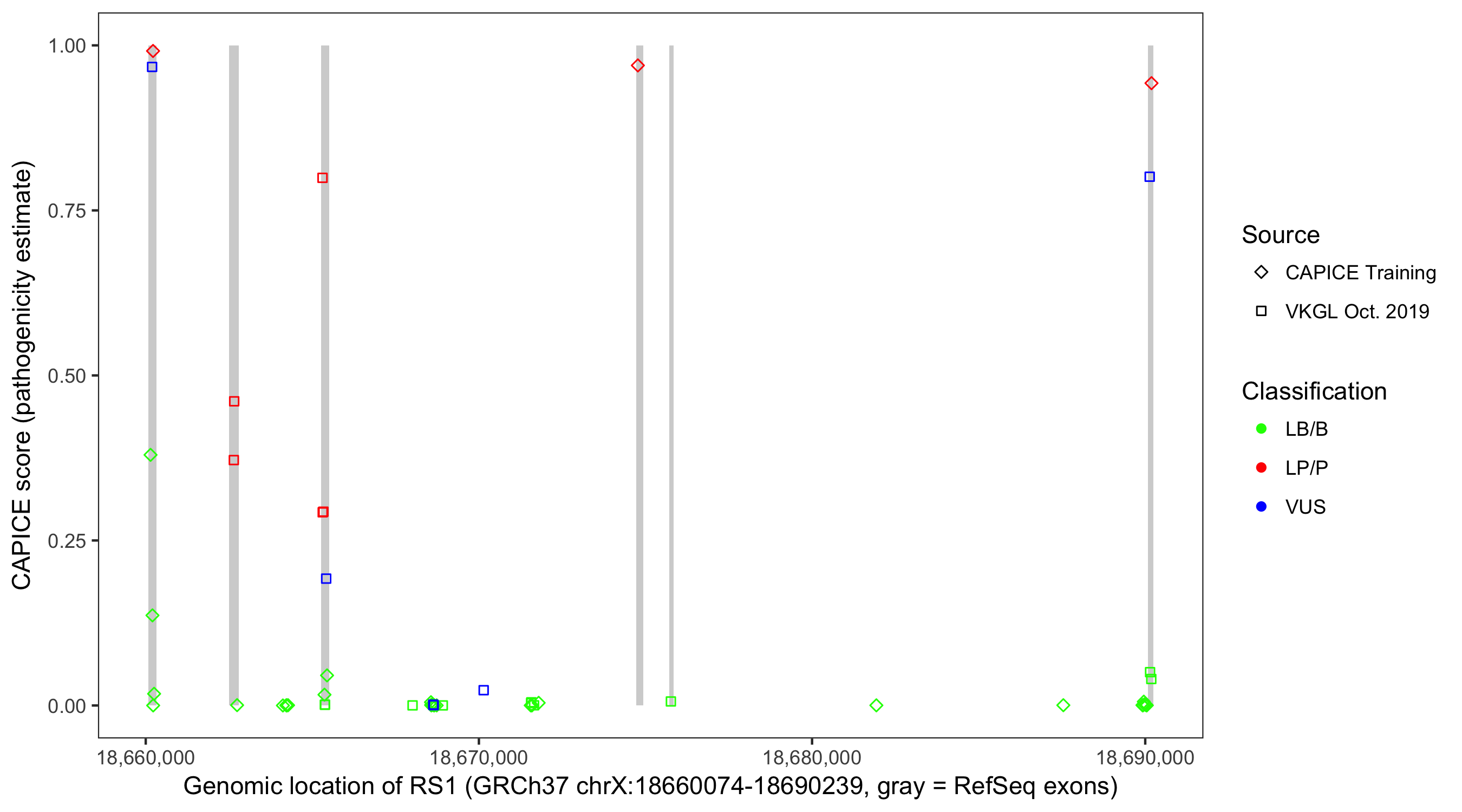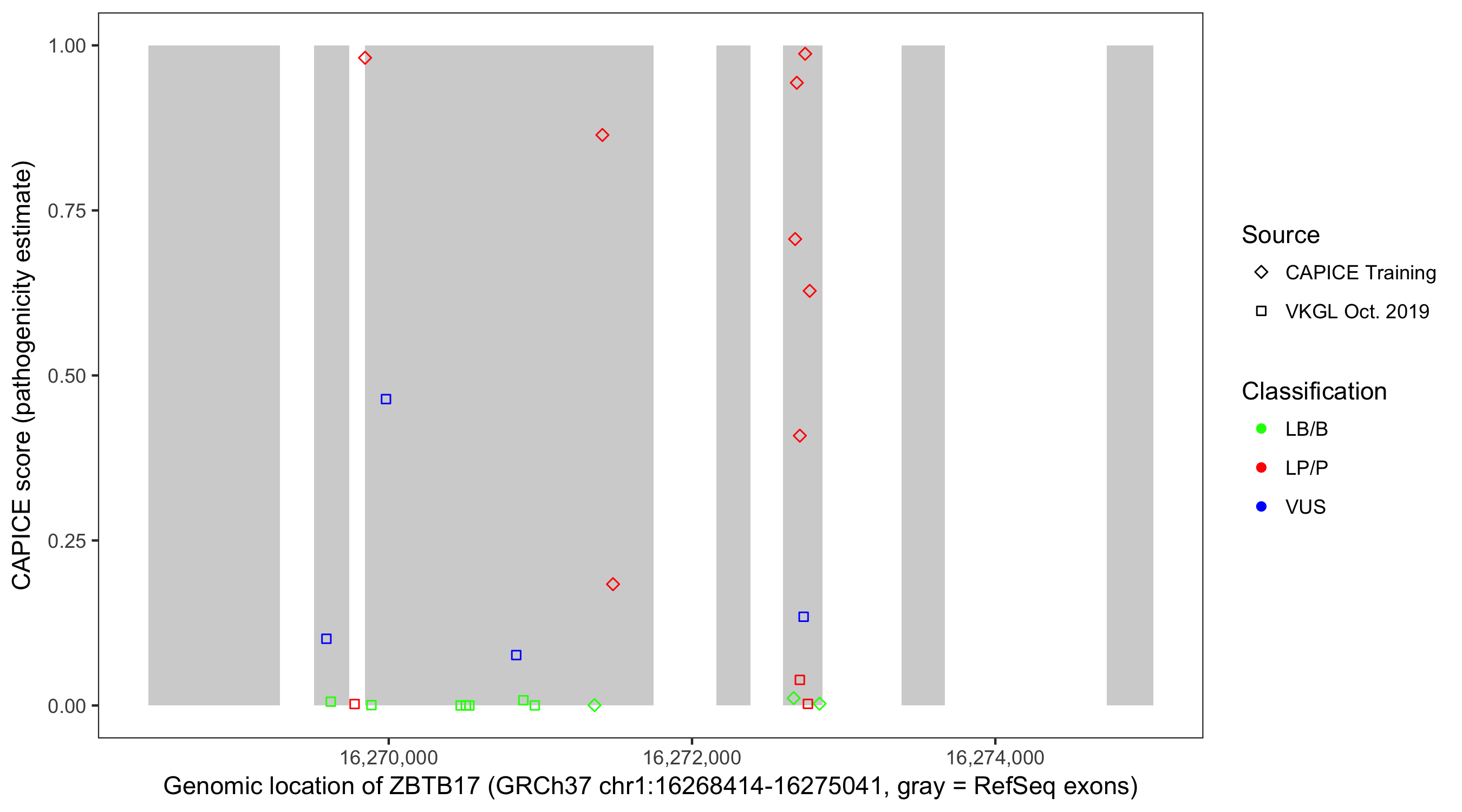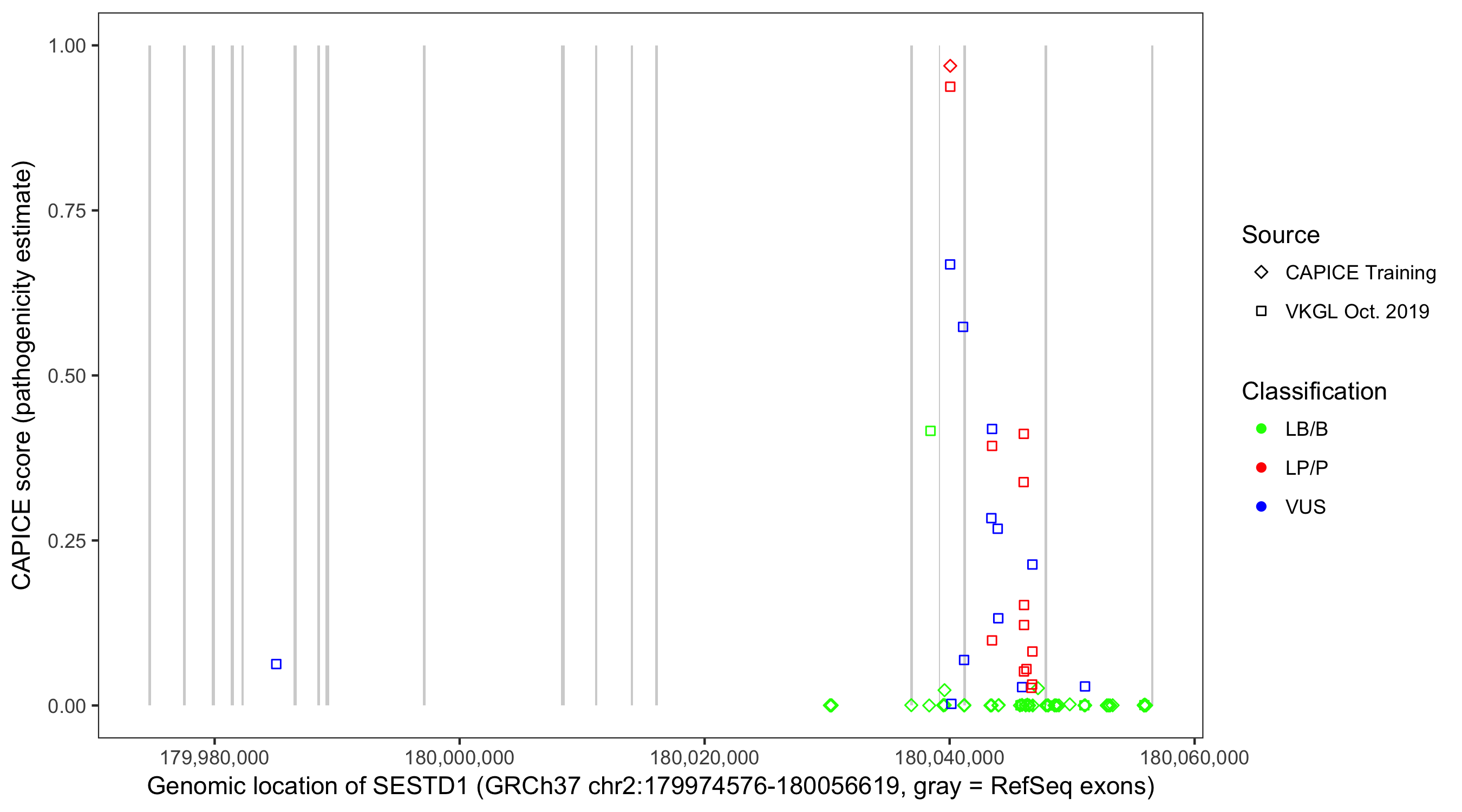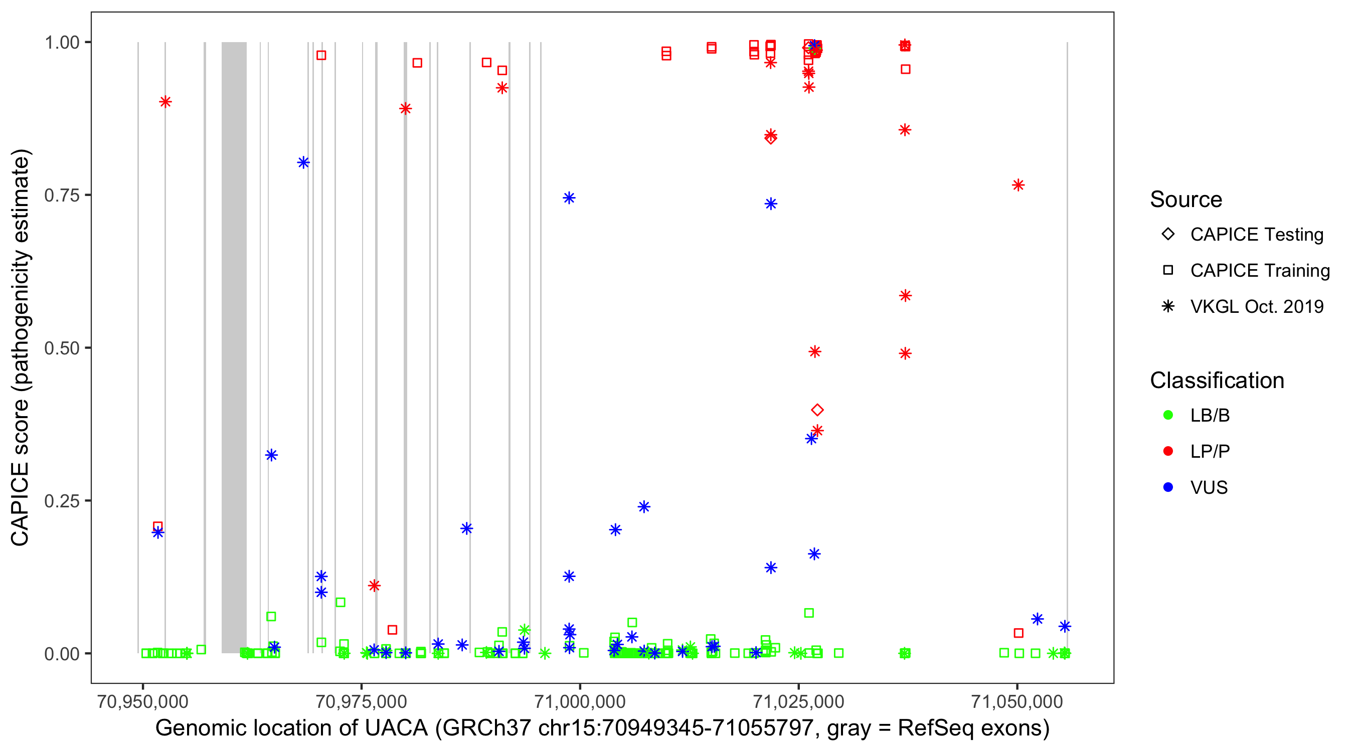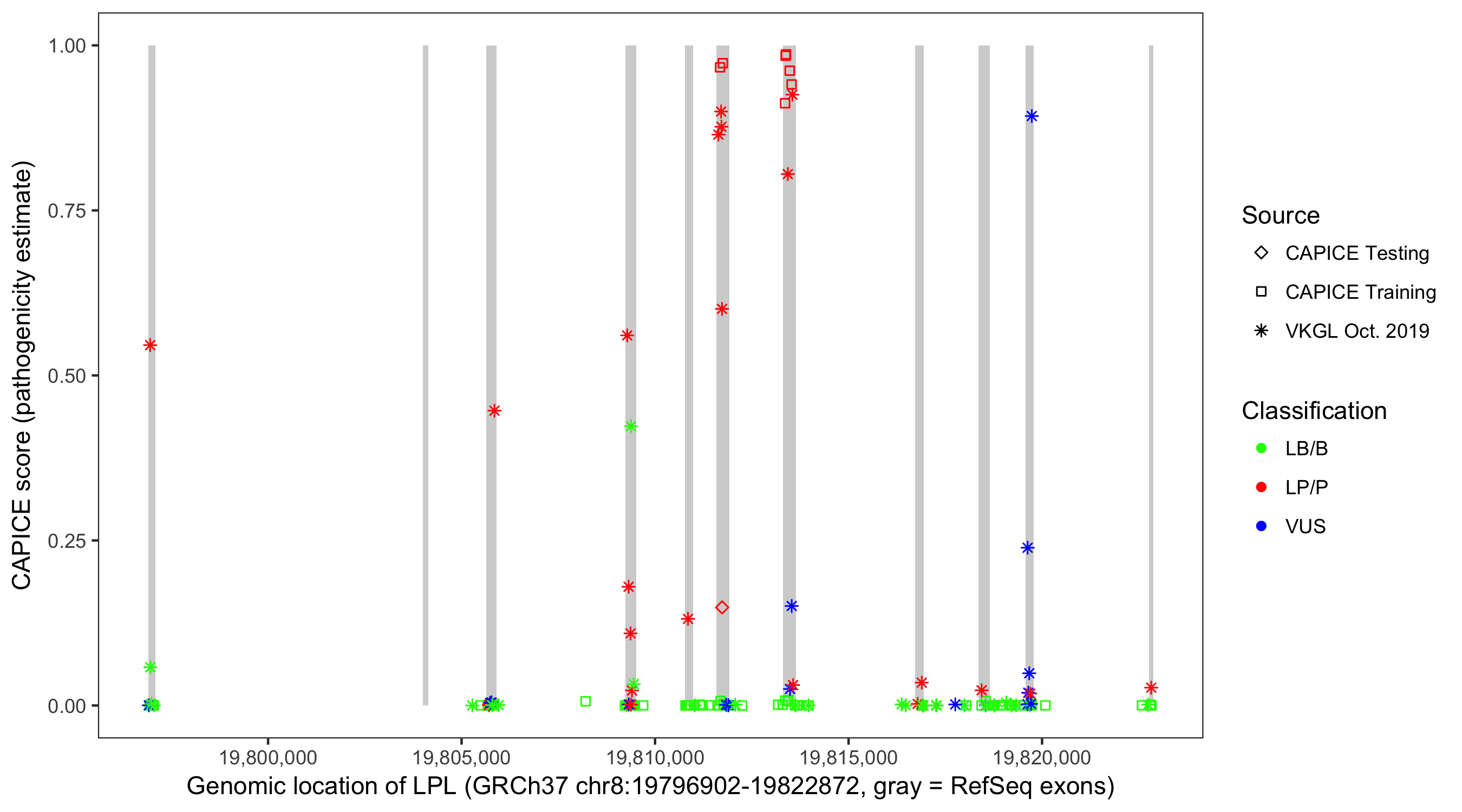 Shown are CAPICE train/test variants plus VKGL Oct 2019.