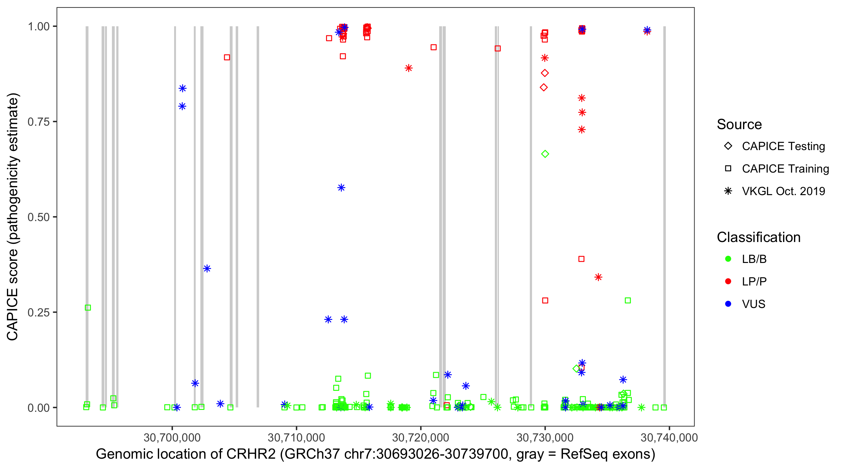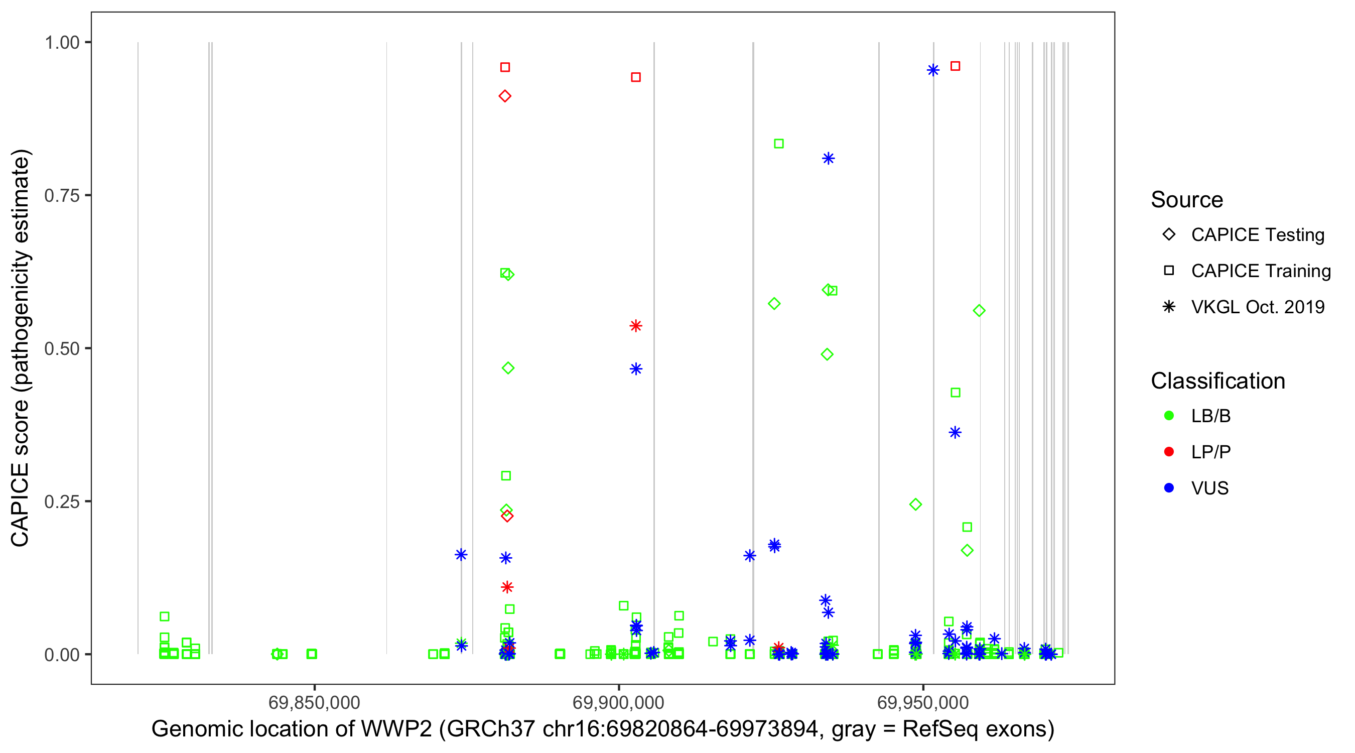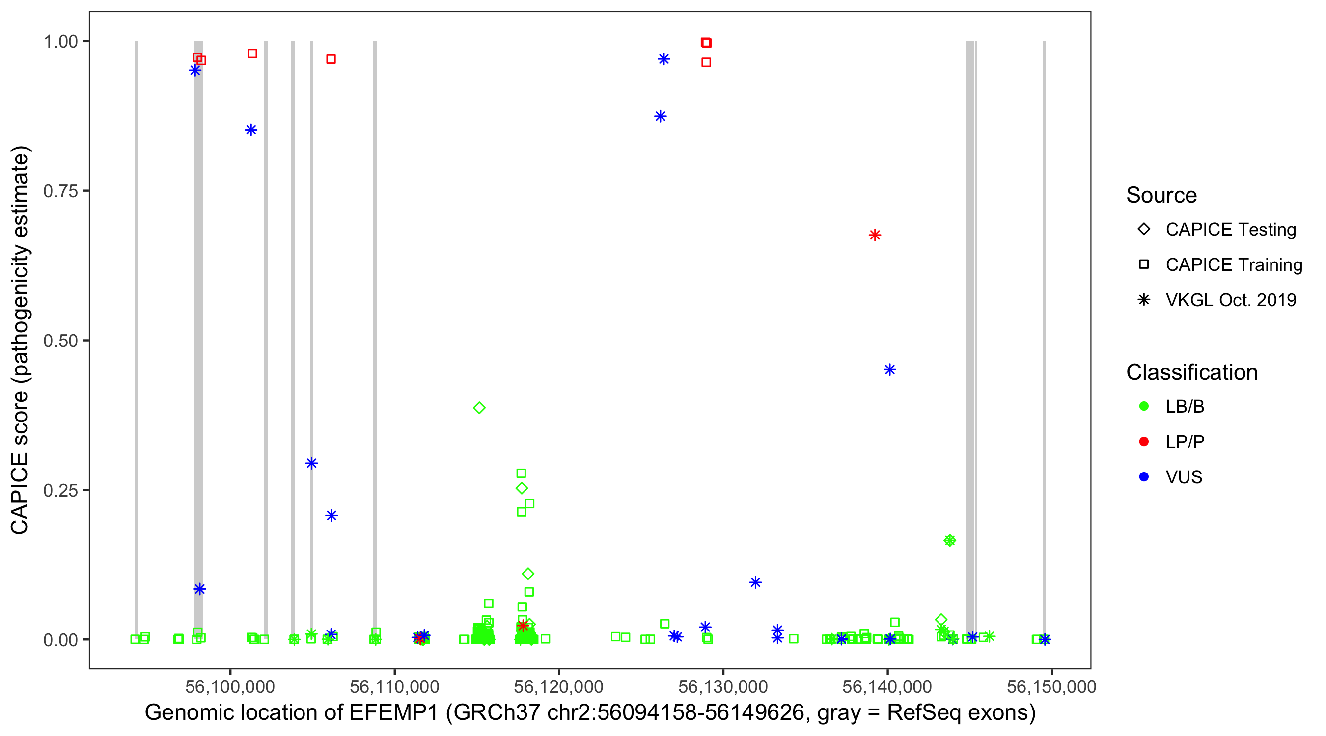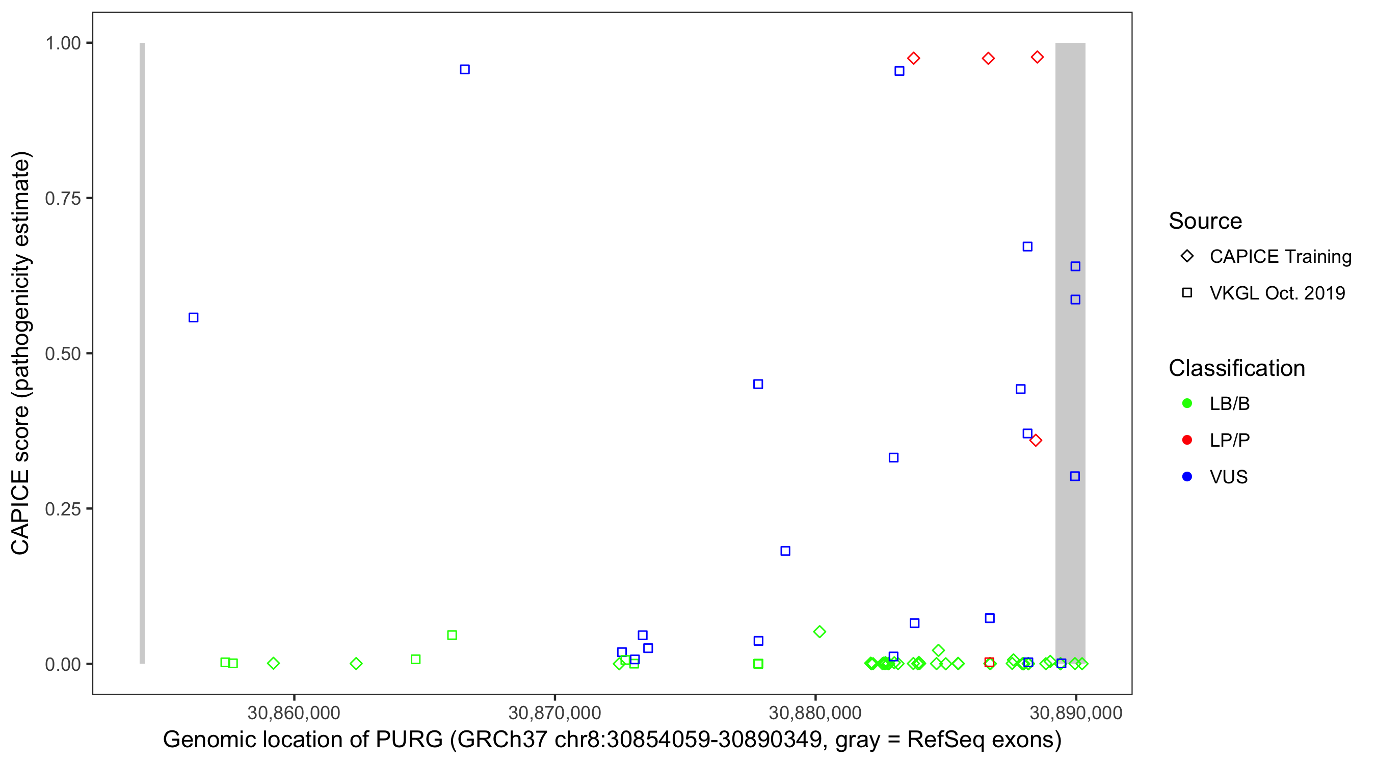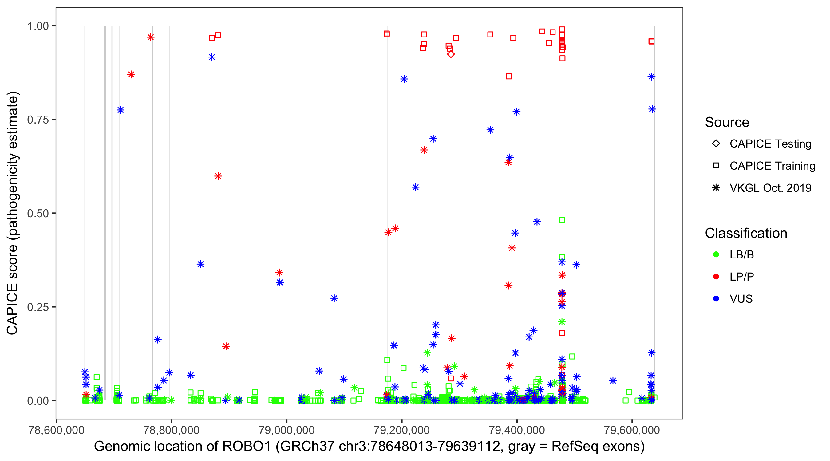 Shown are CAPICE train/test variants plus VKGL Oct 2019.