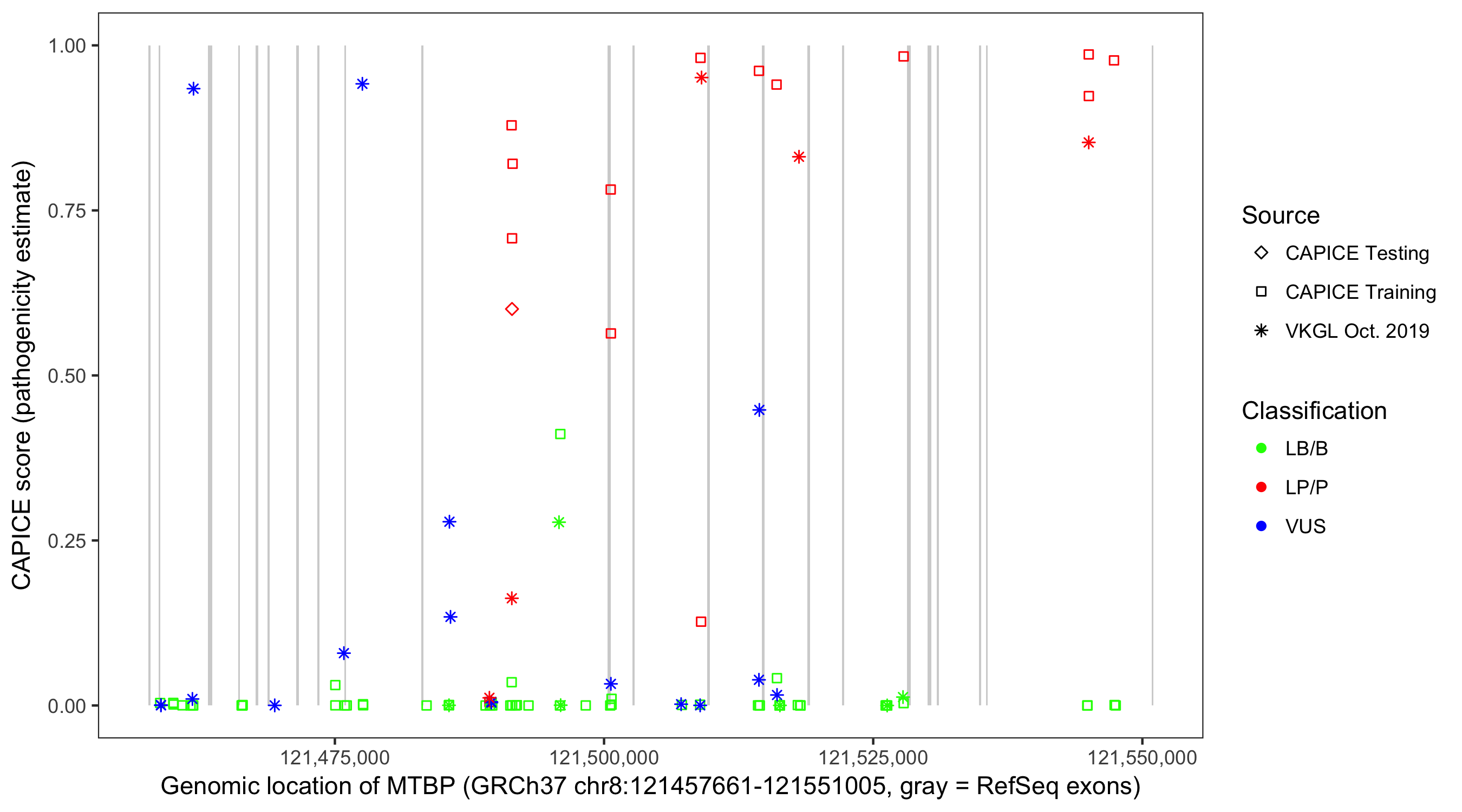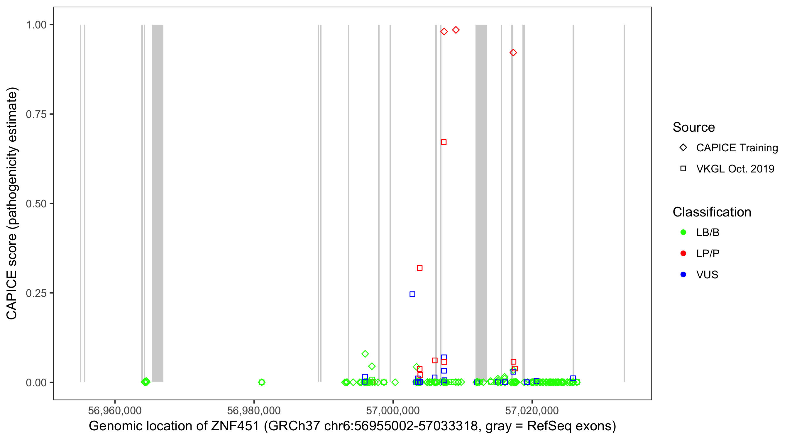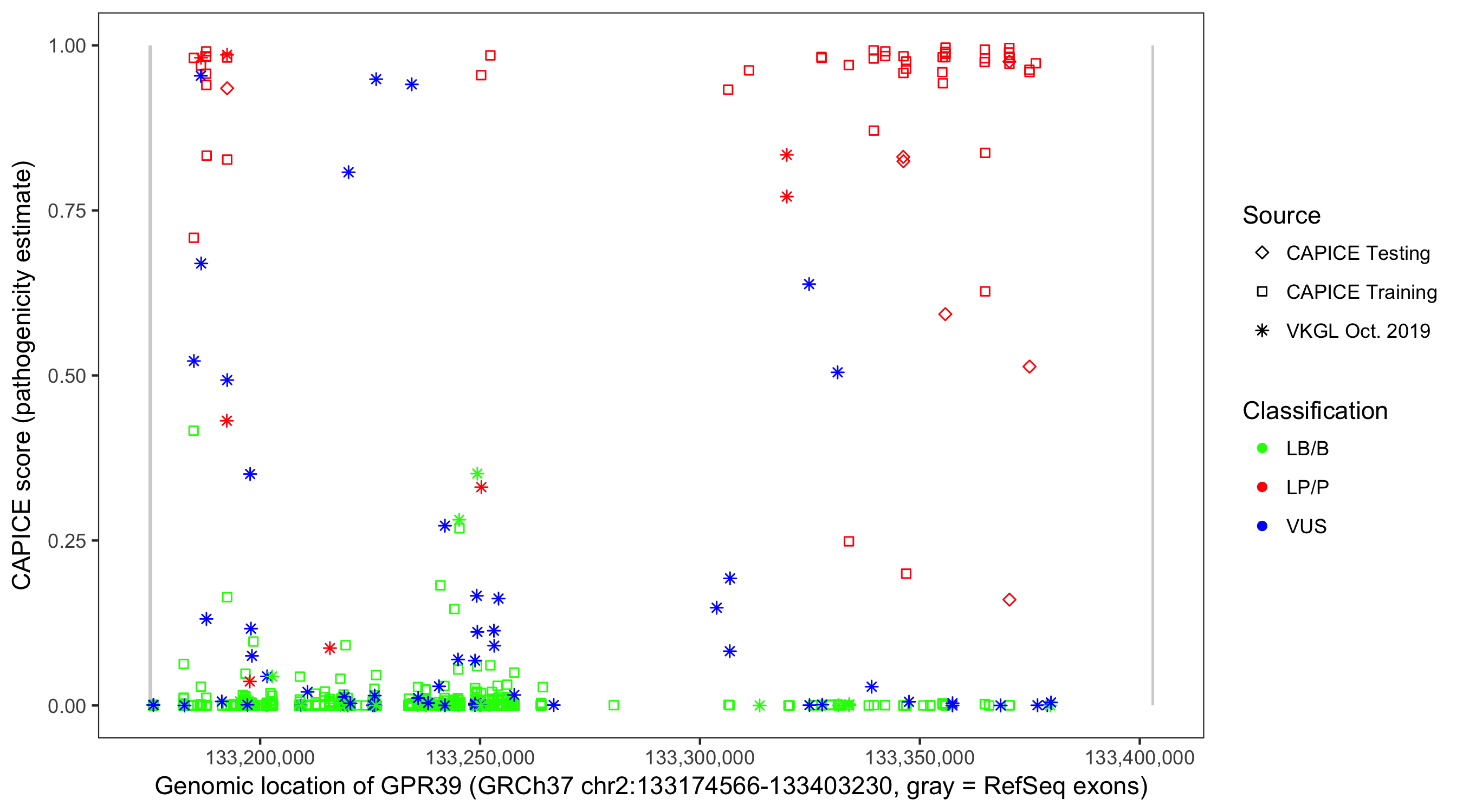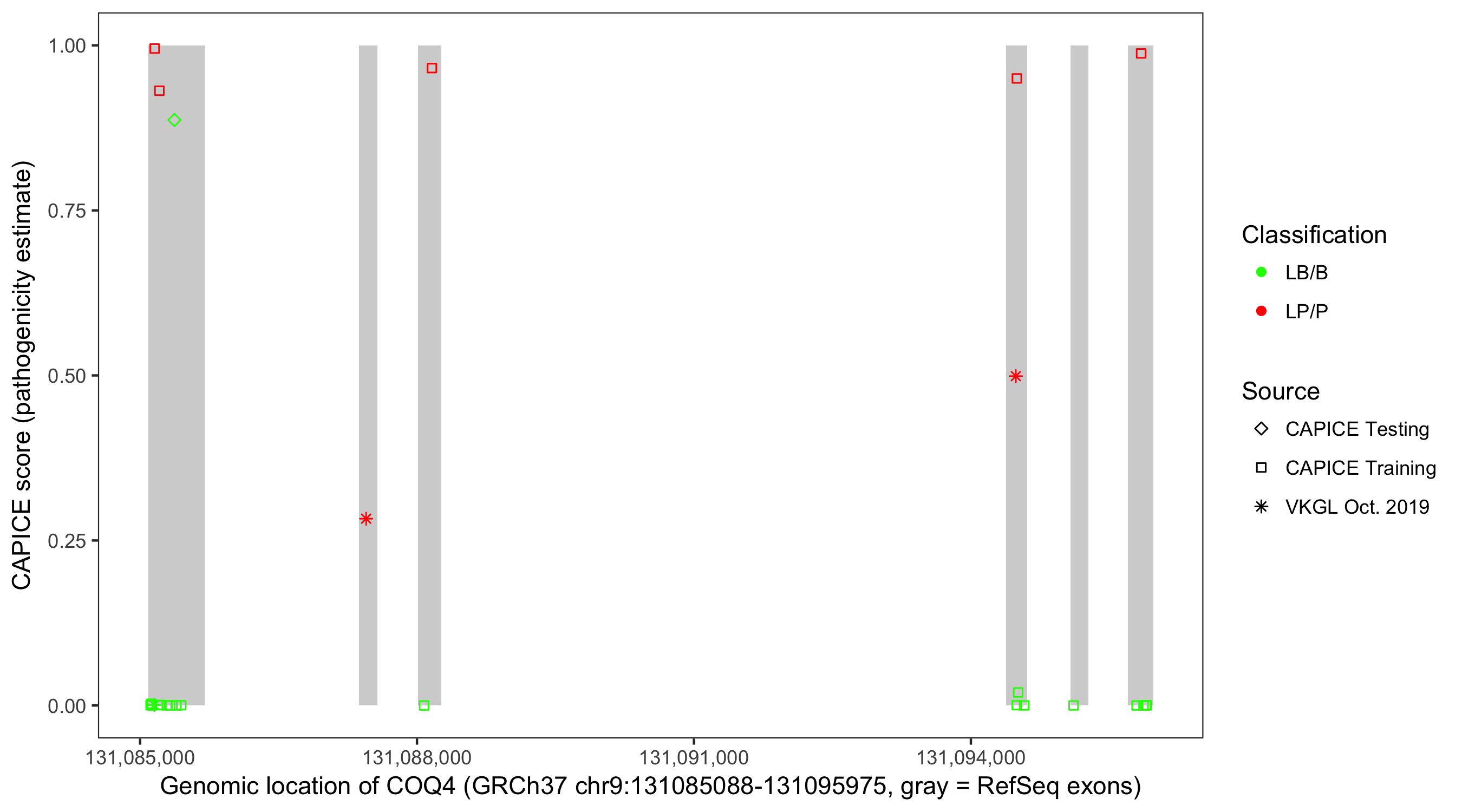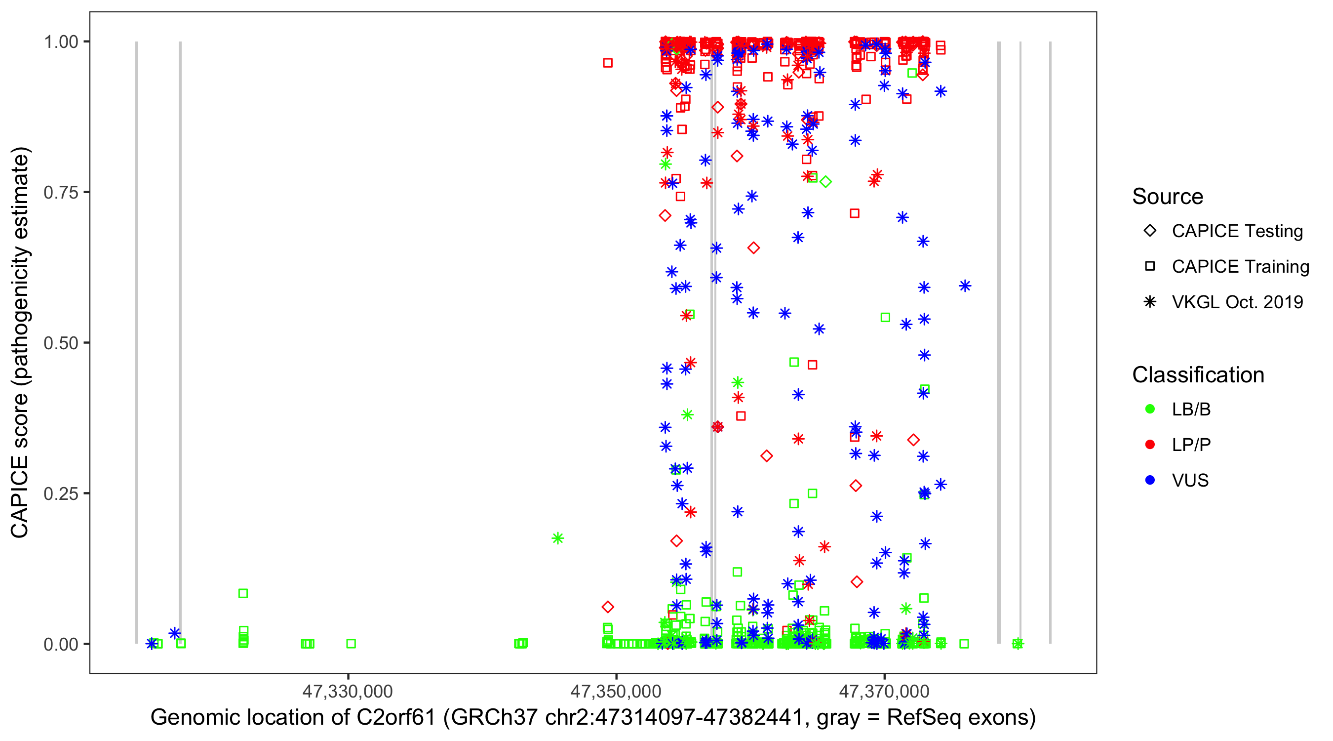 Shown are CAPICE train/test variants plus VKGL Oct 2019.