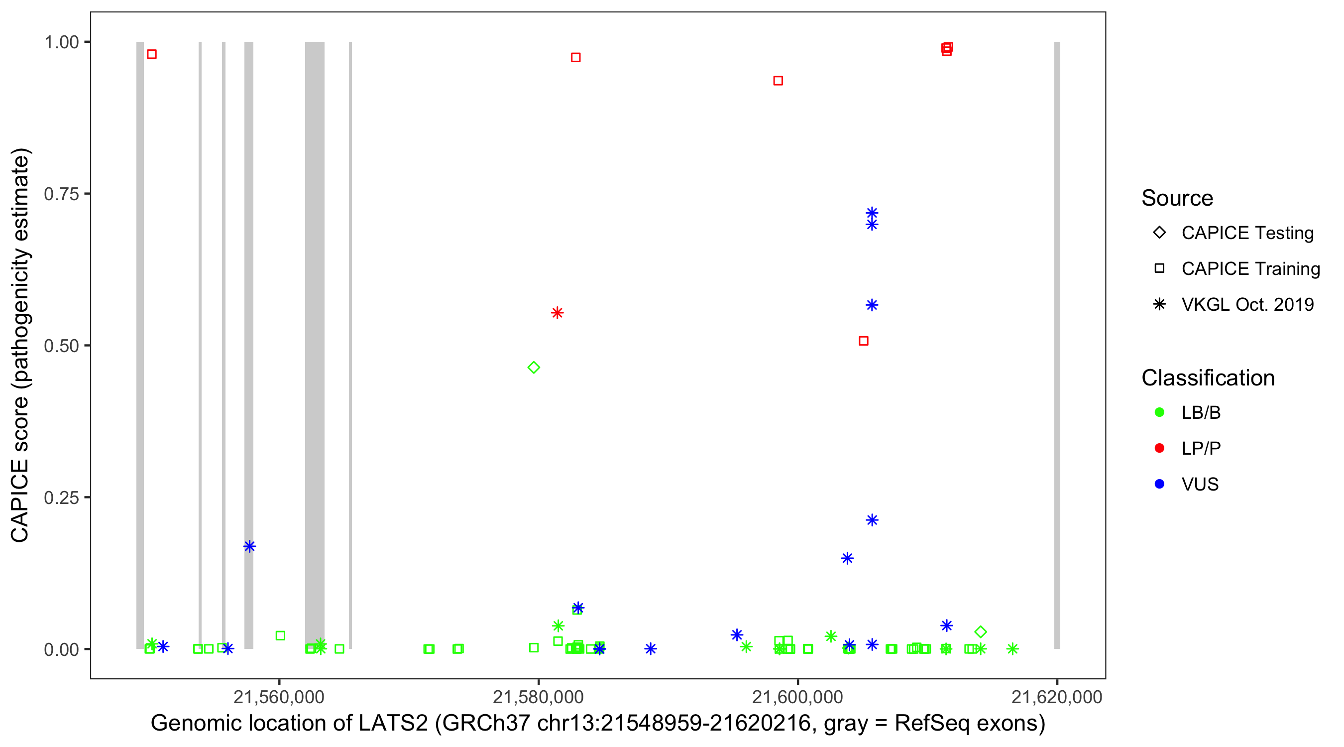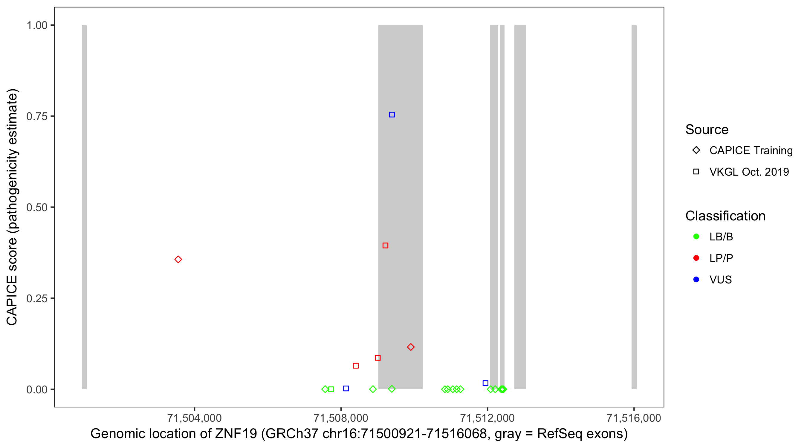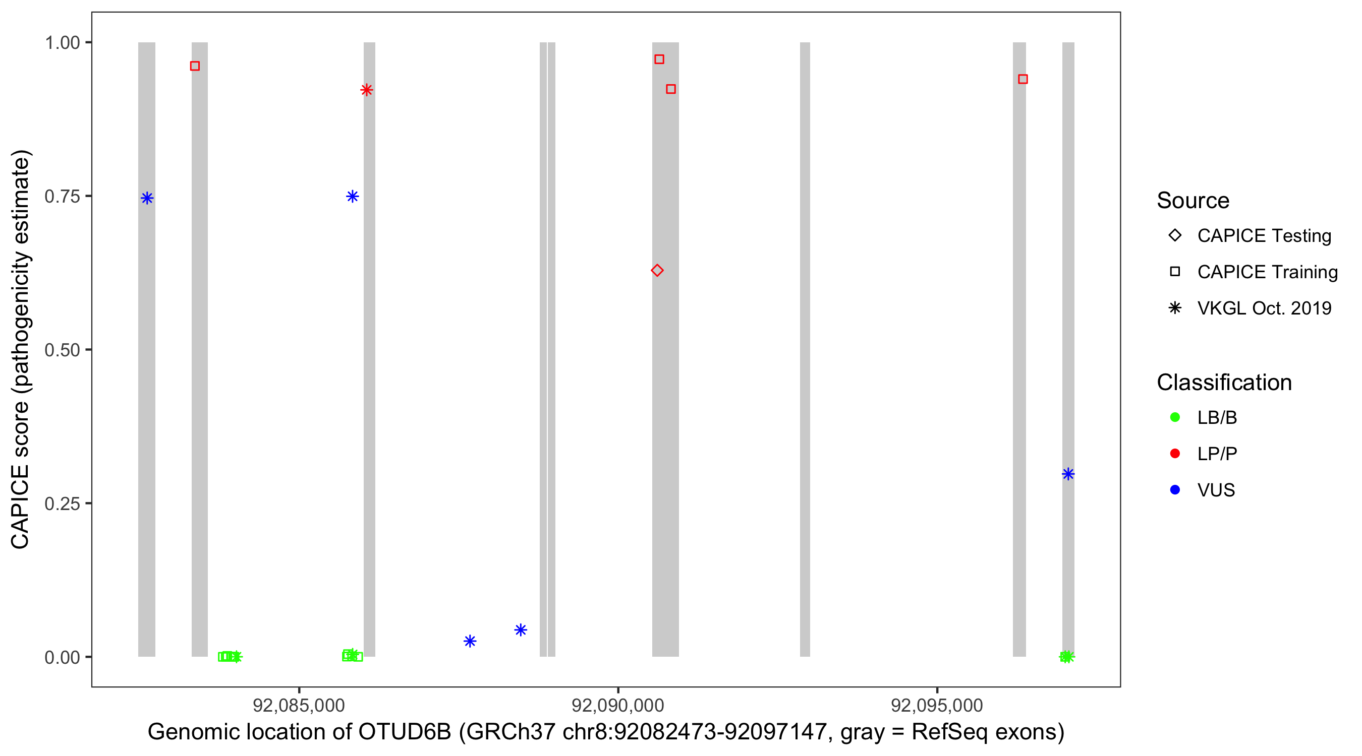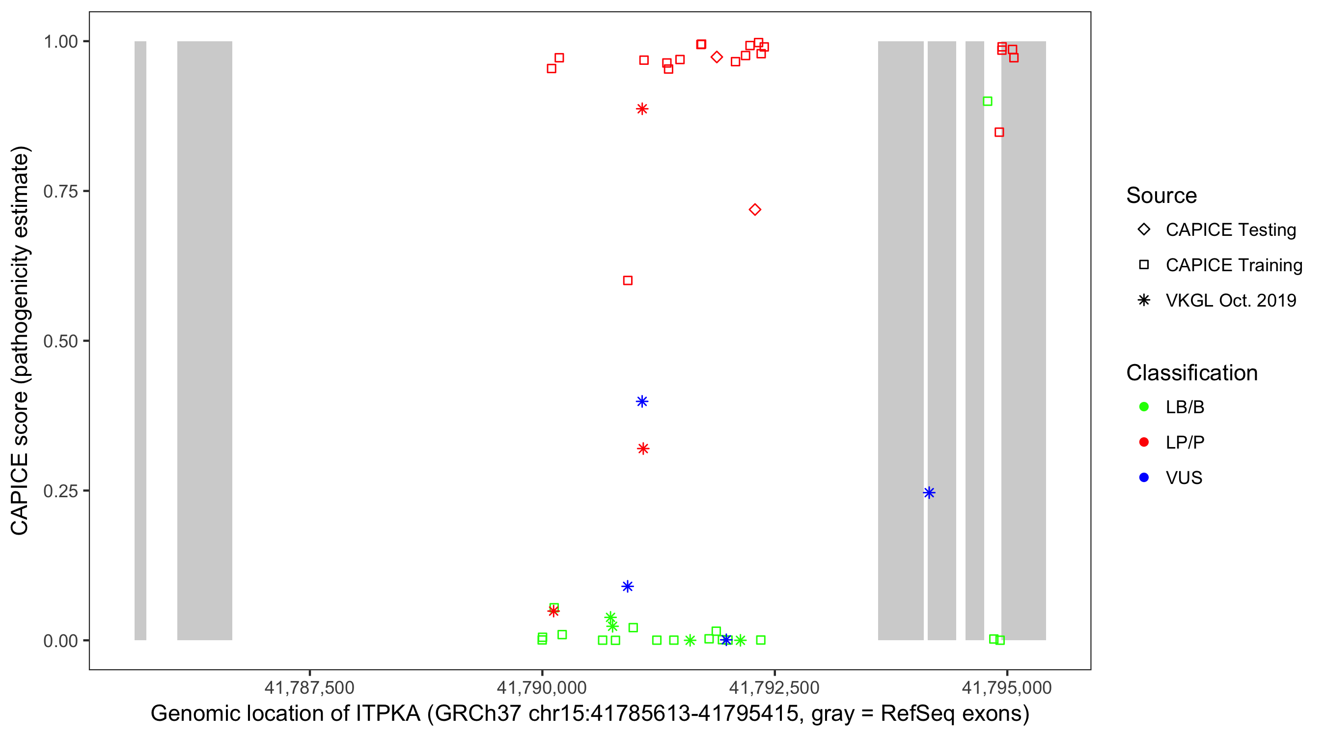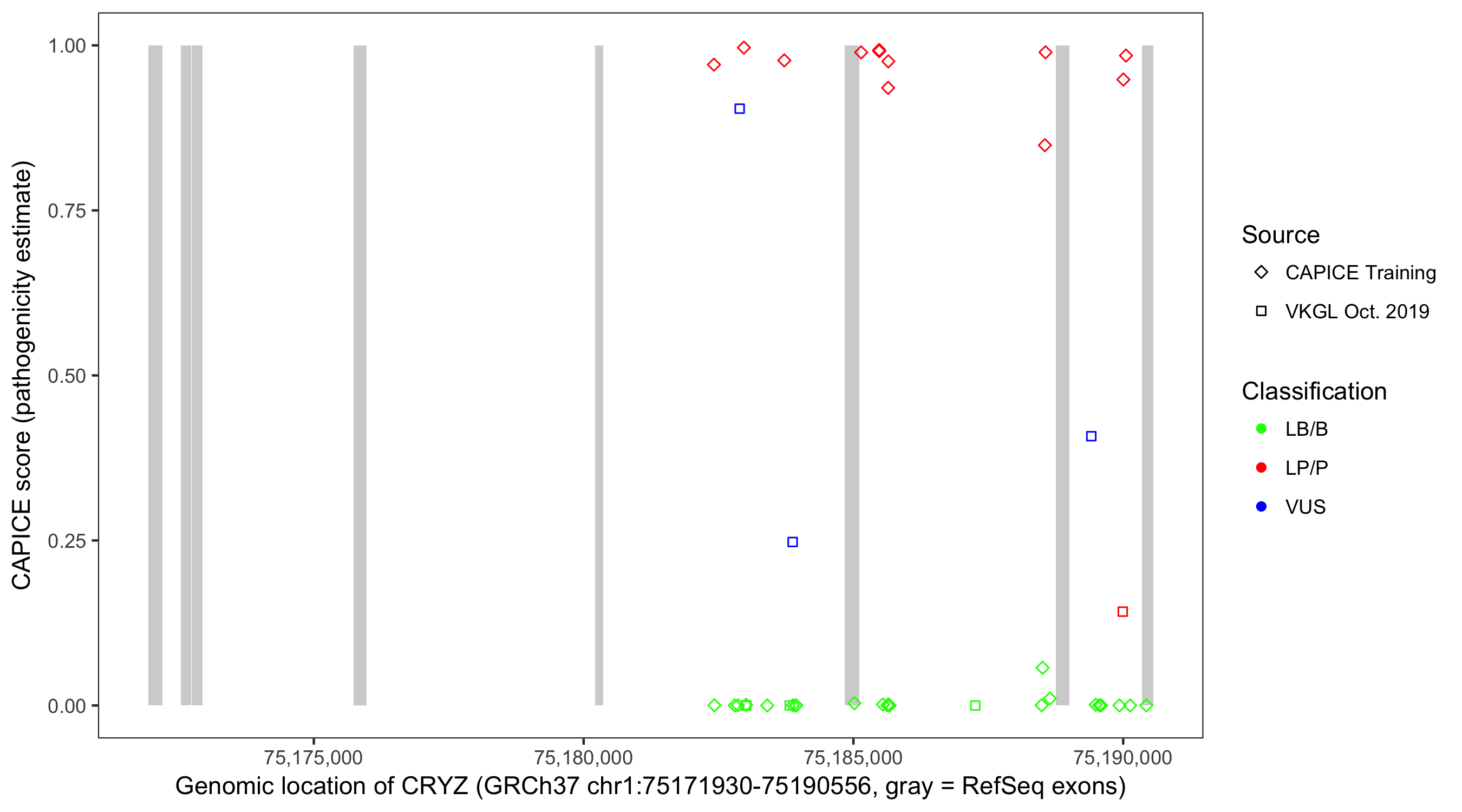 Shown are CAPICE train/test variants plus VKGL Oct 2019.