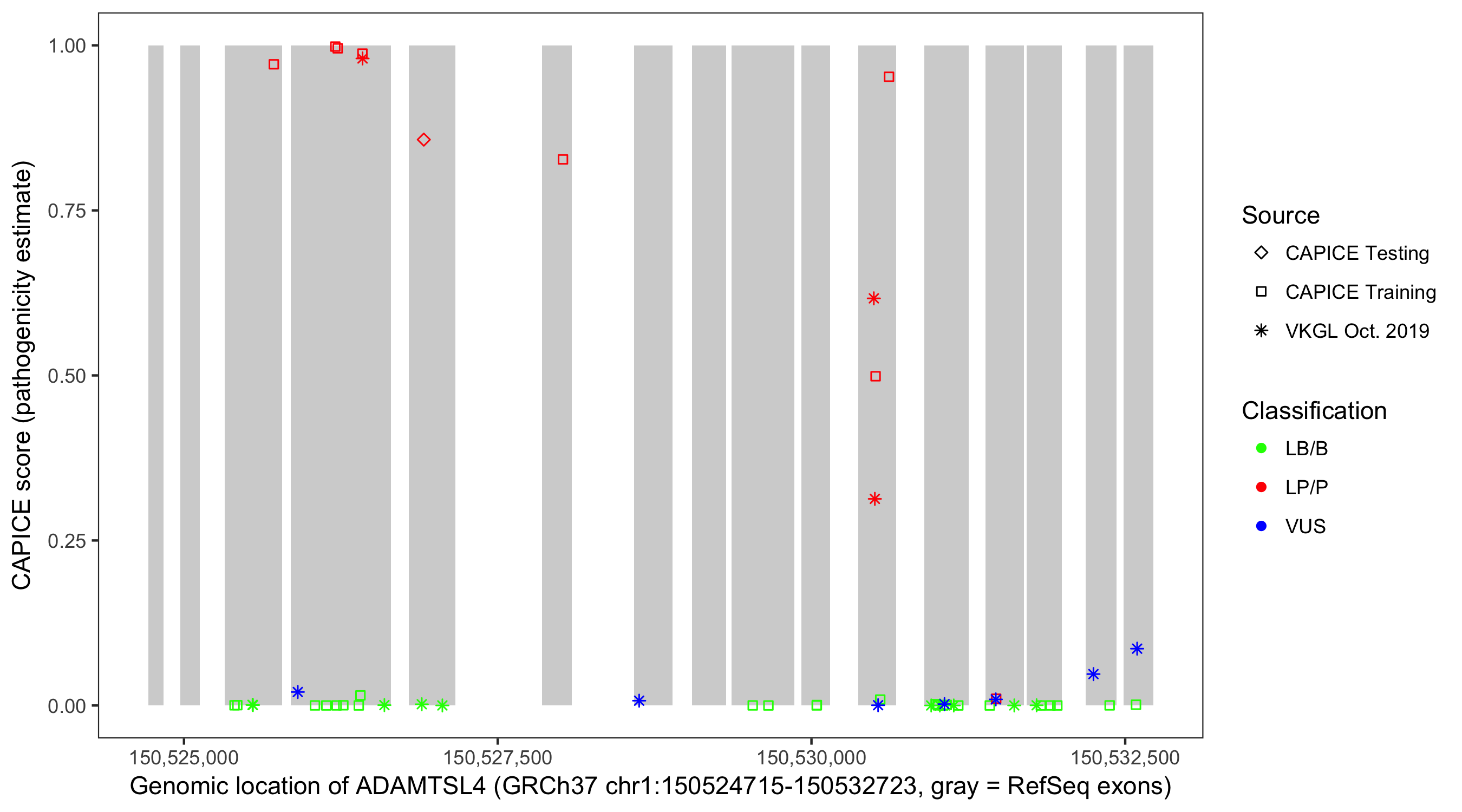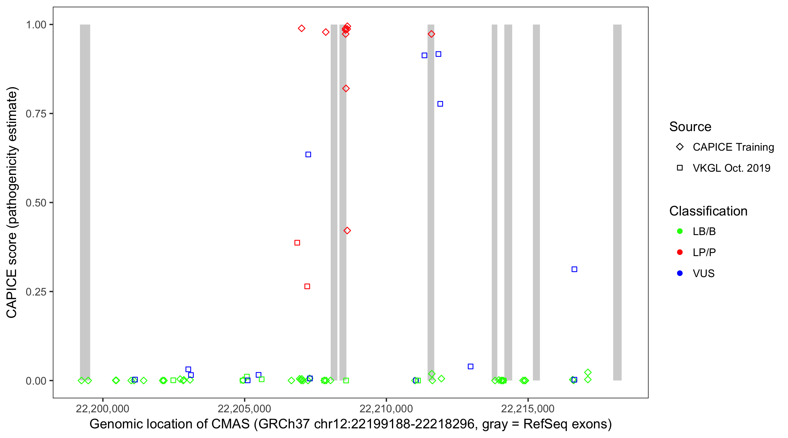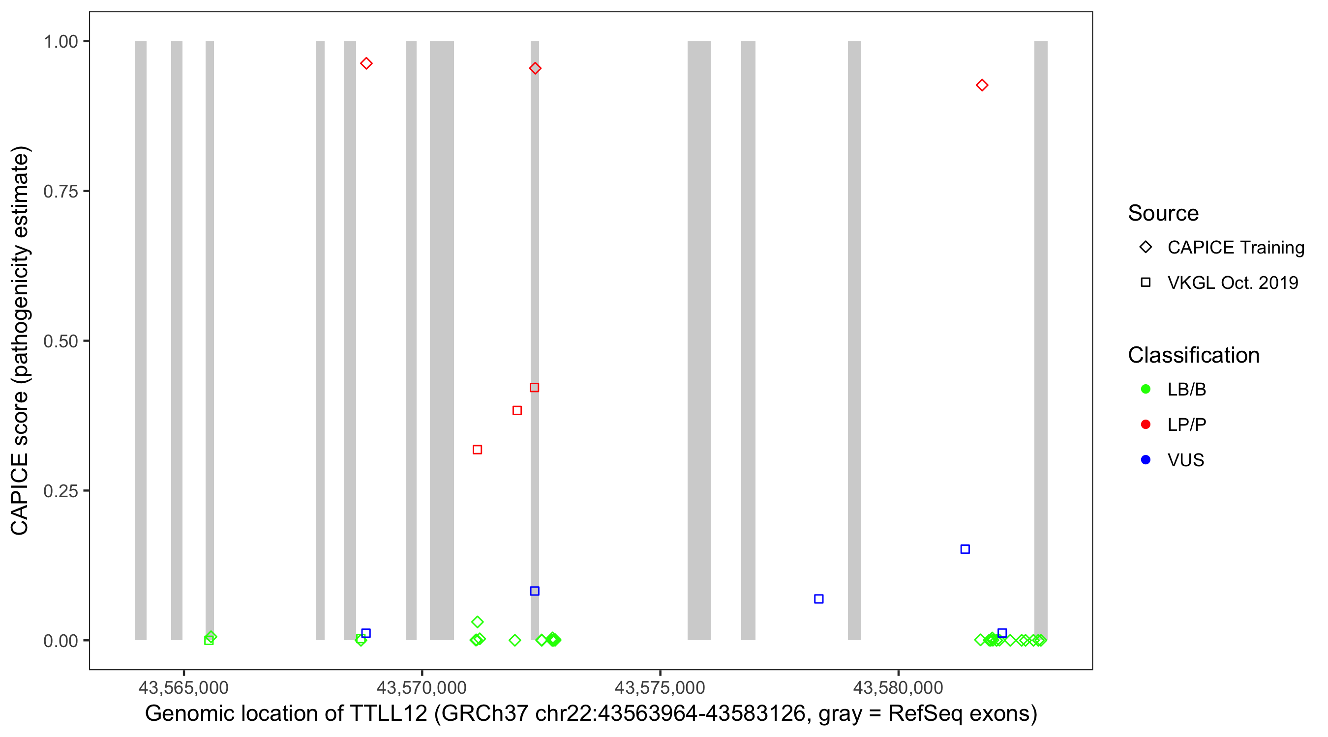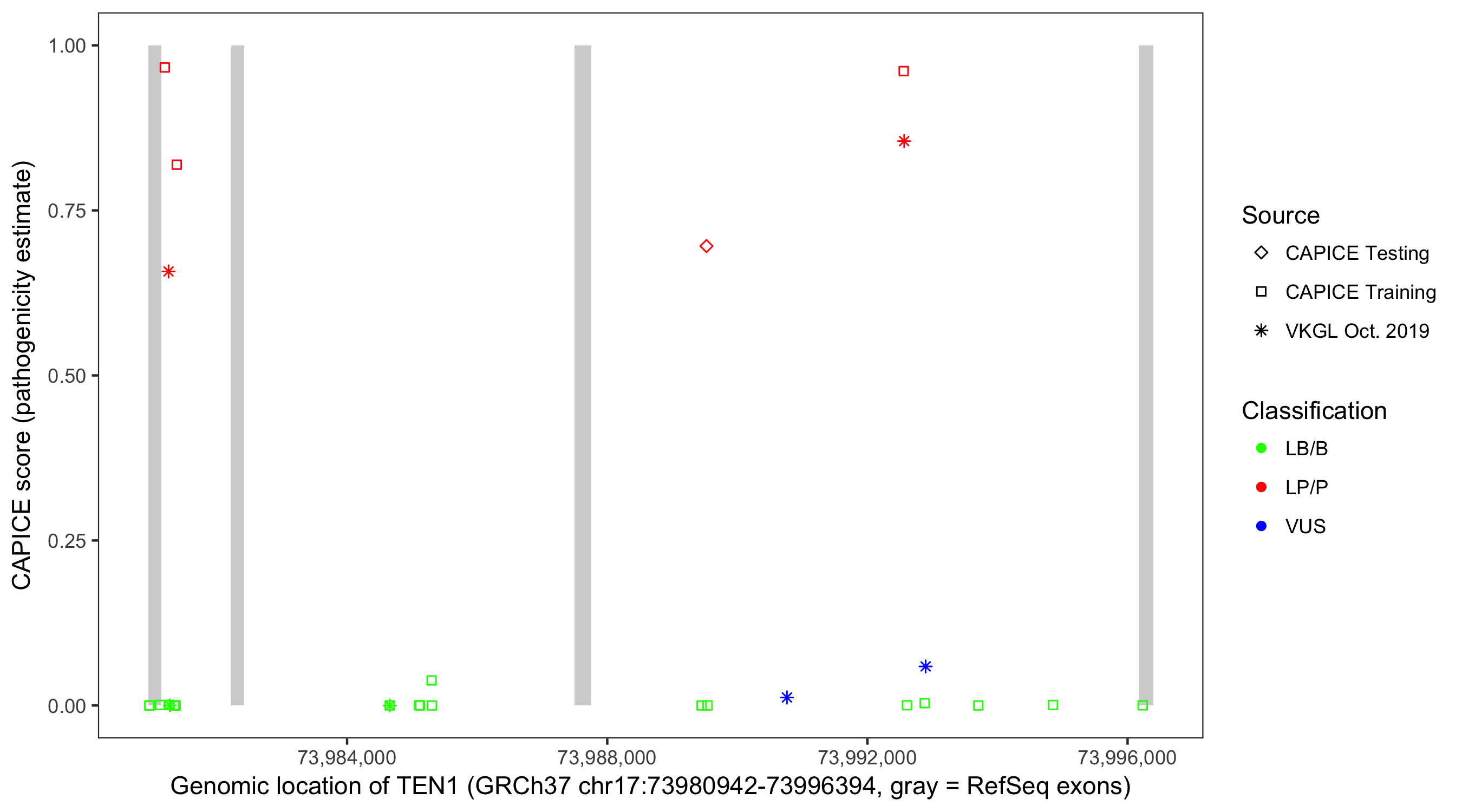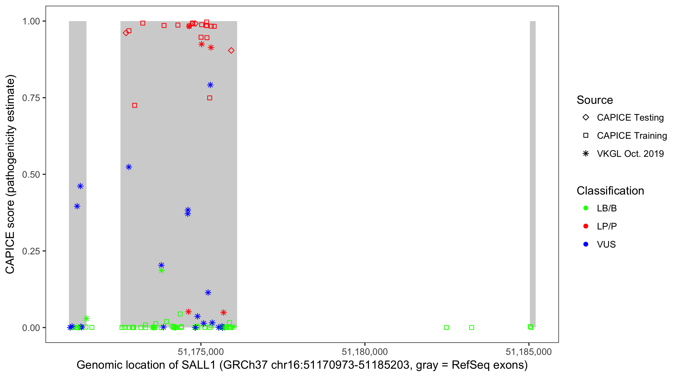 Shown are CAPICE train/test variants plus VKGL Oct 2019.