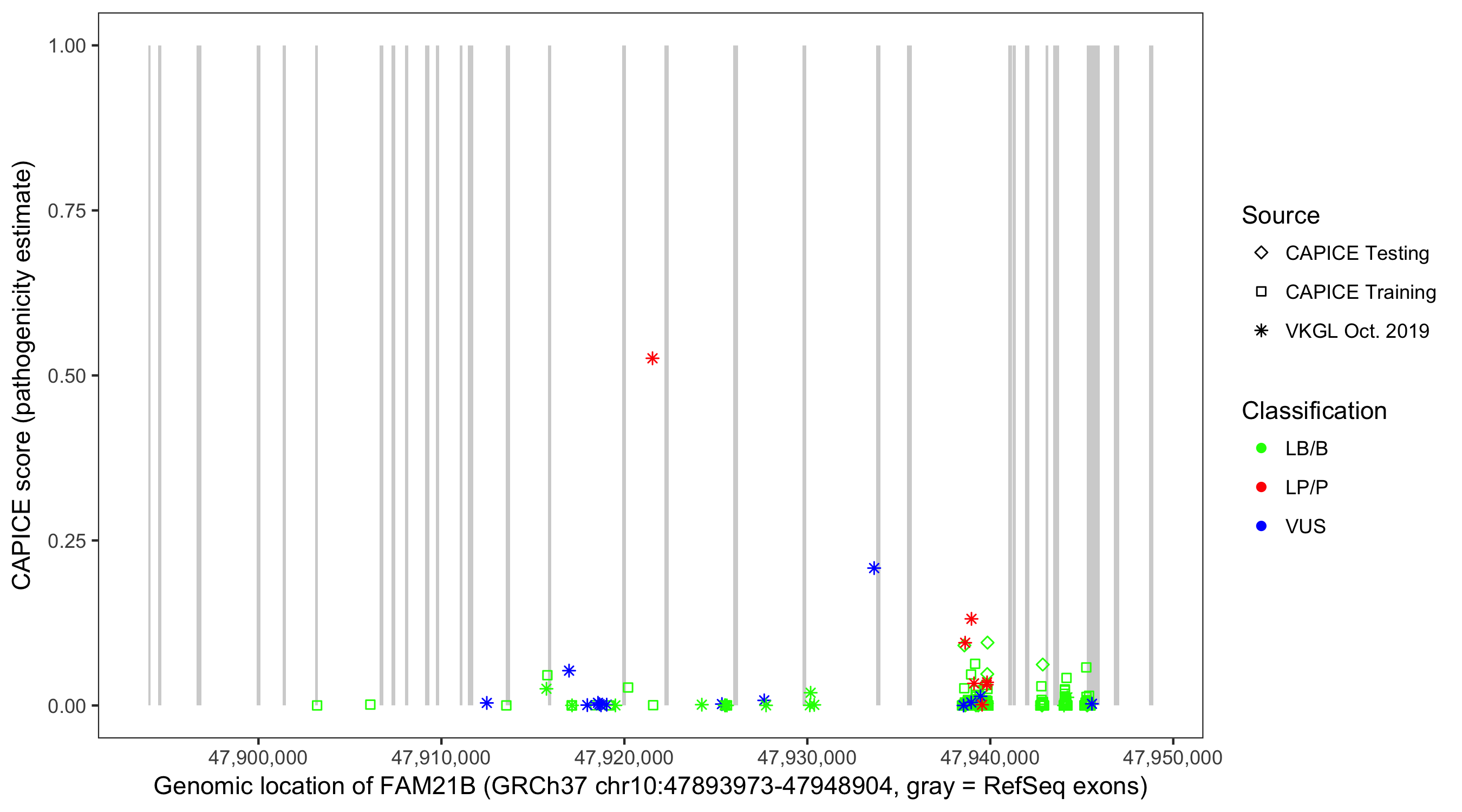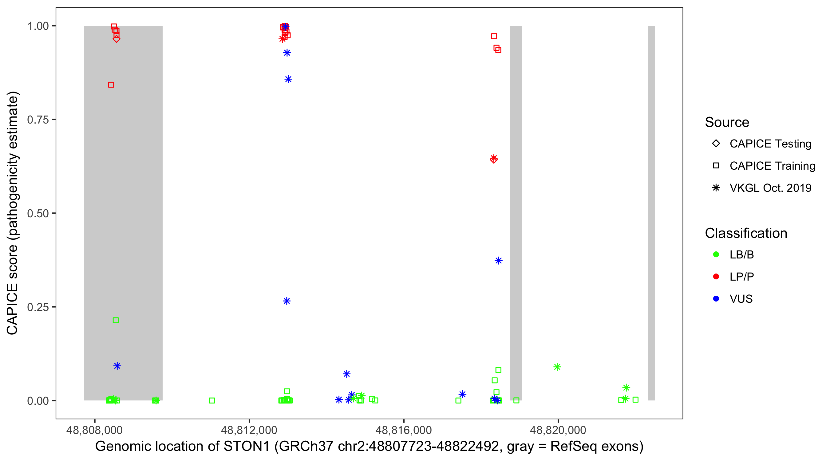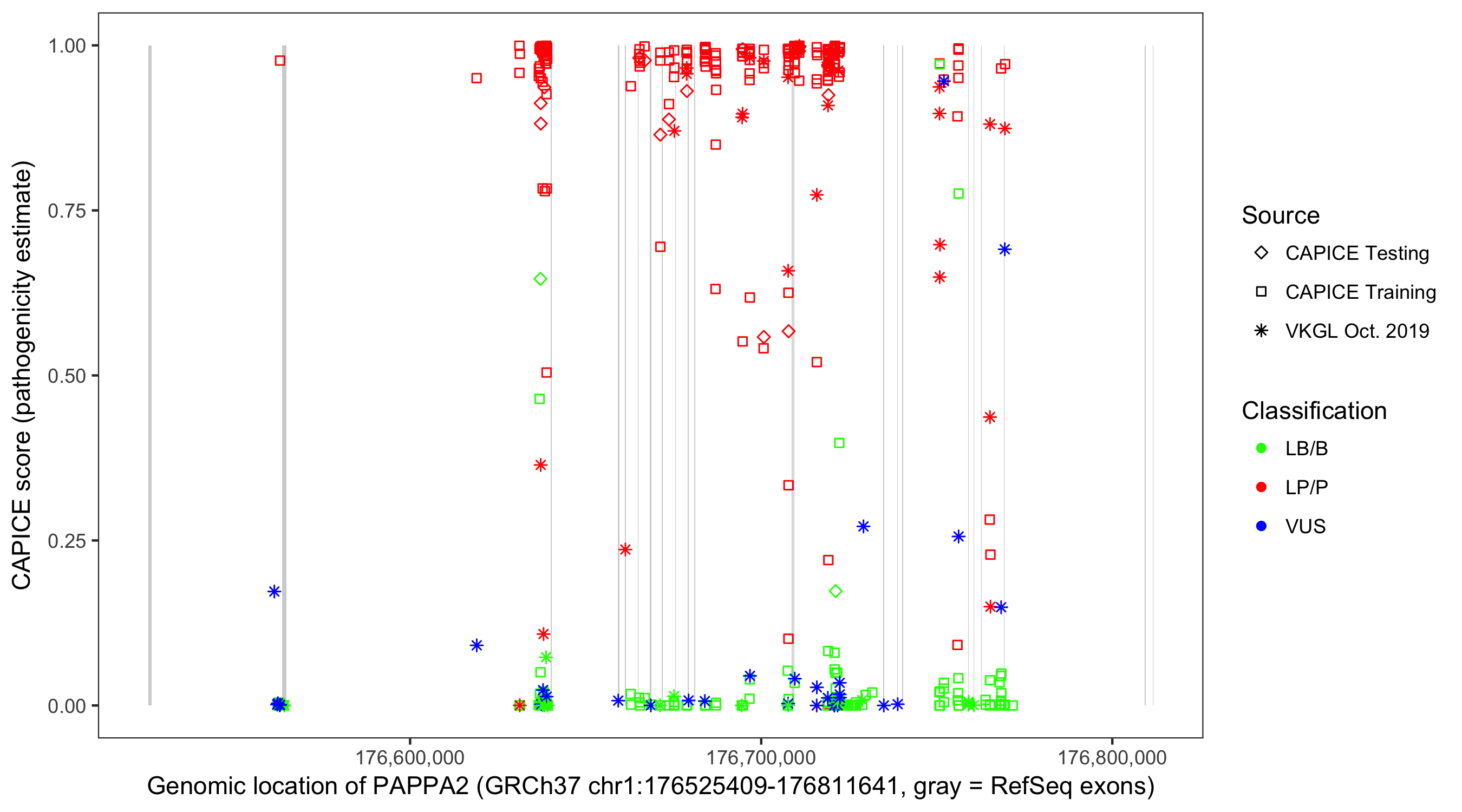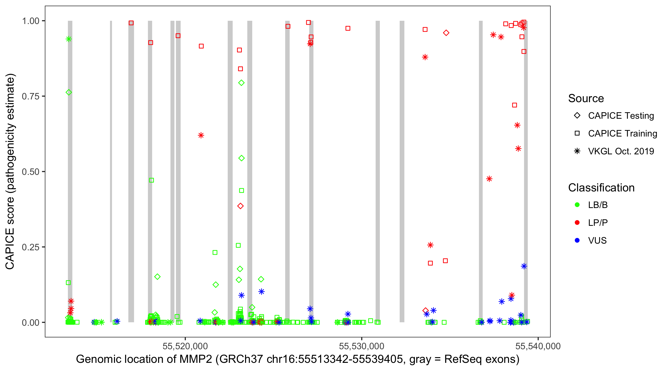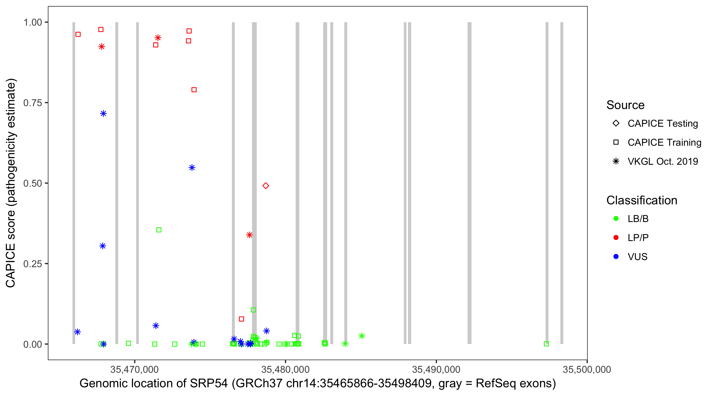 Shown are CAPICE train/test variants plus VKGL Oct 2019.