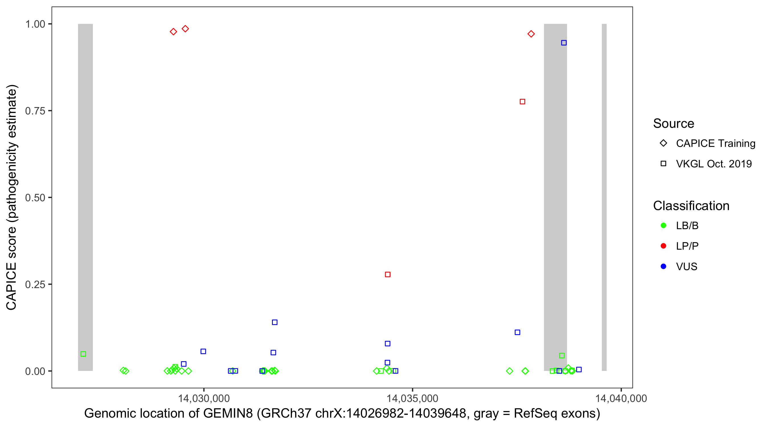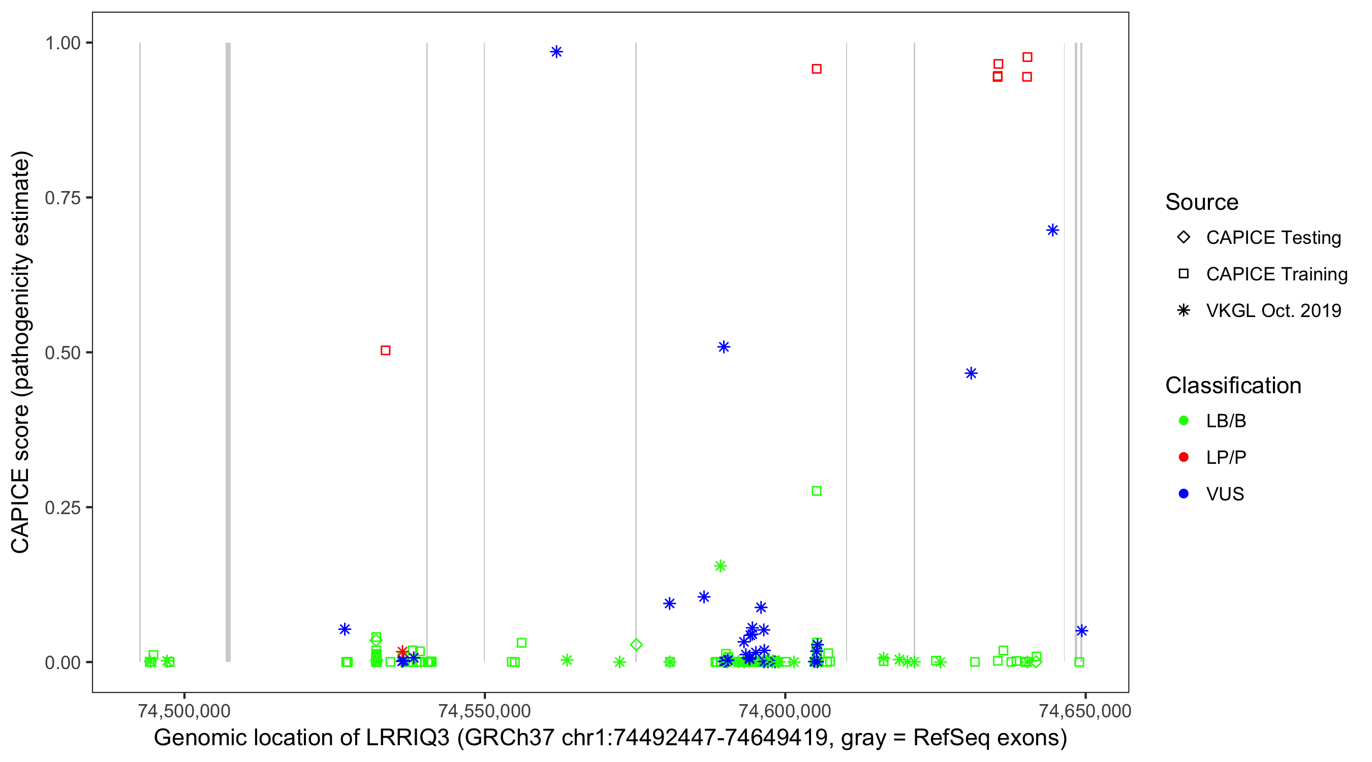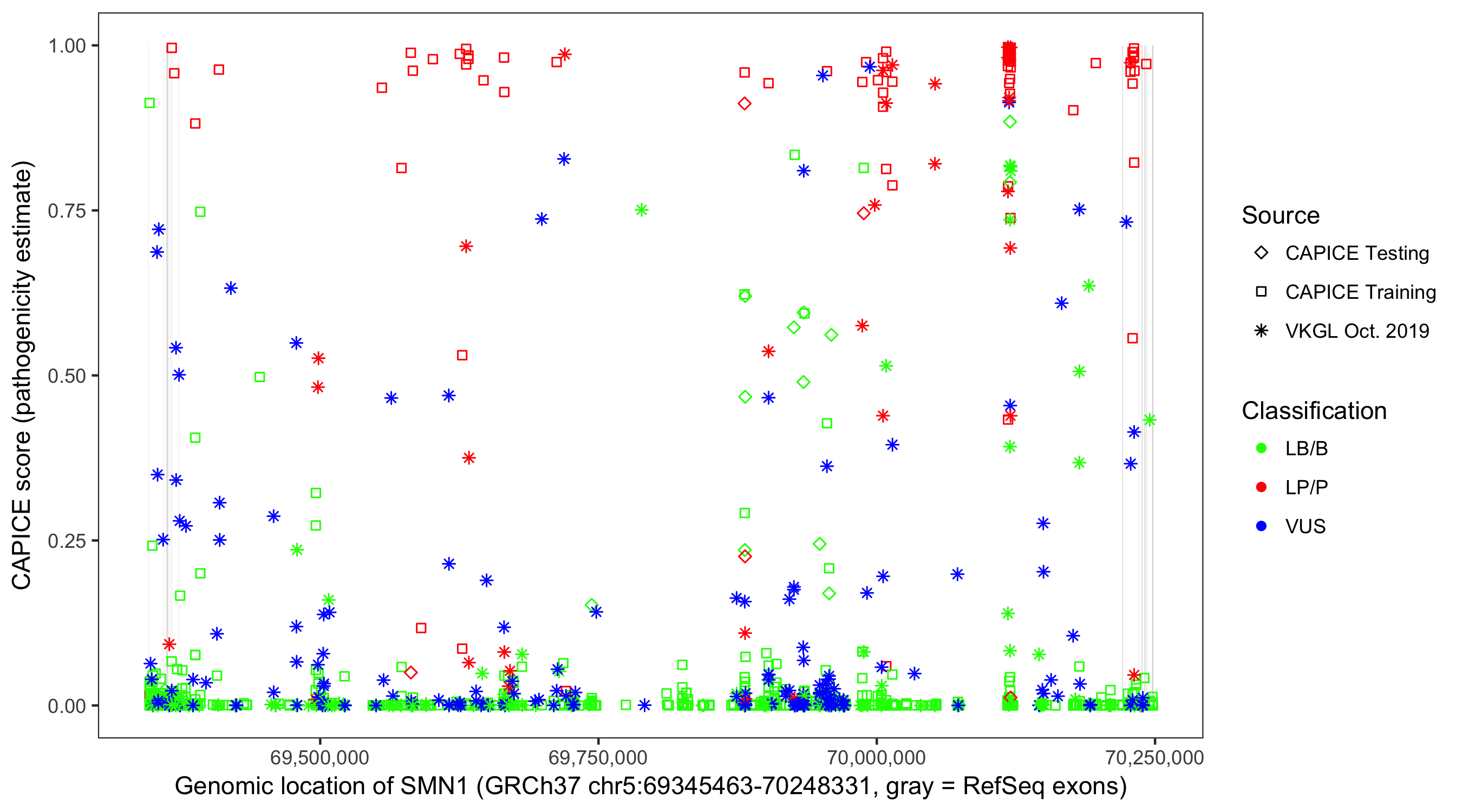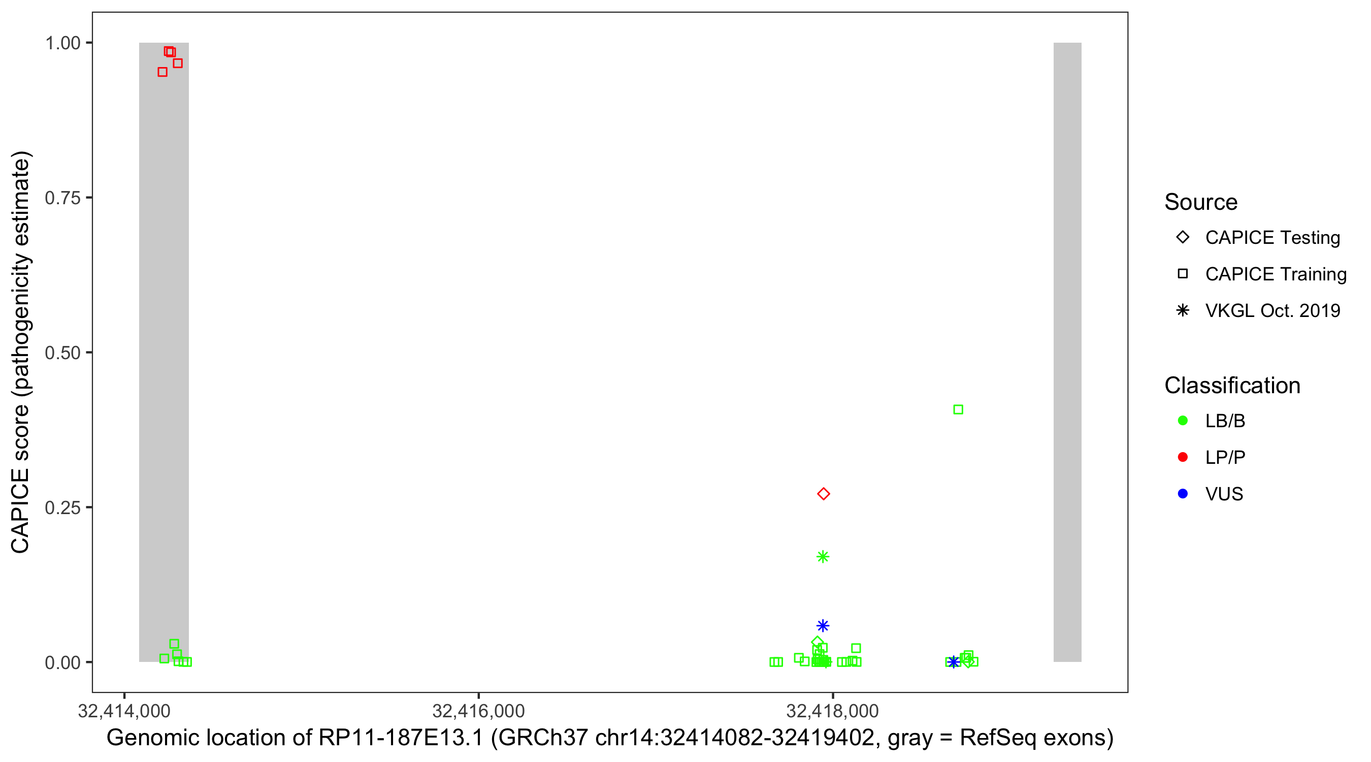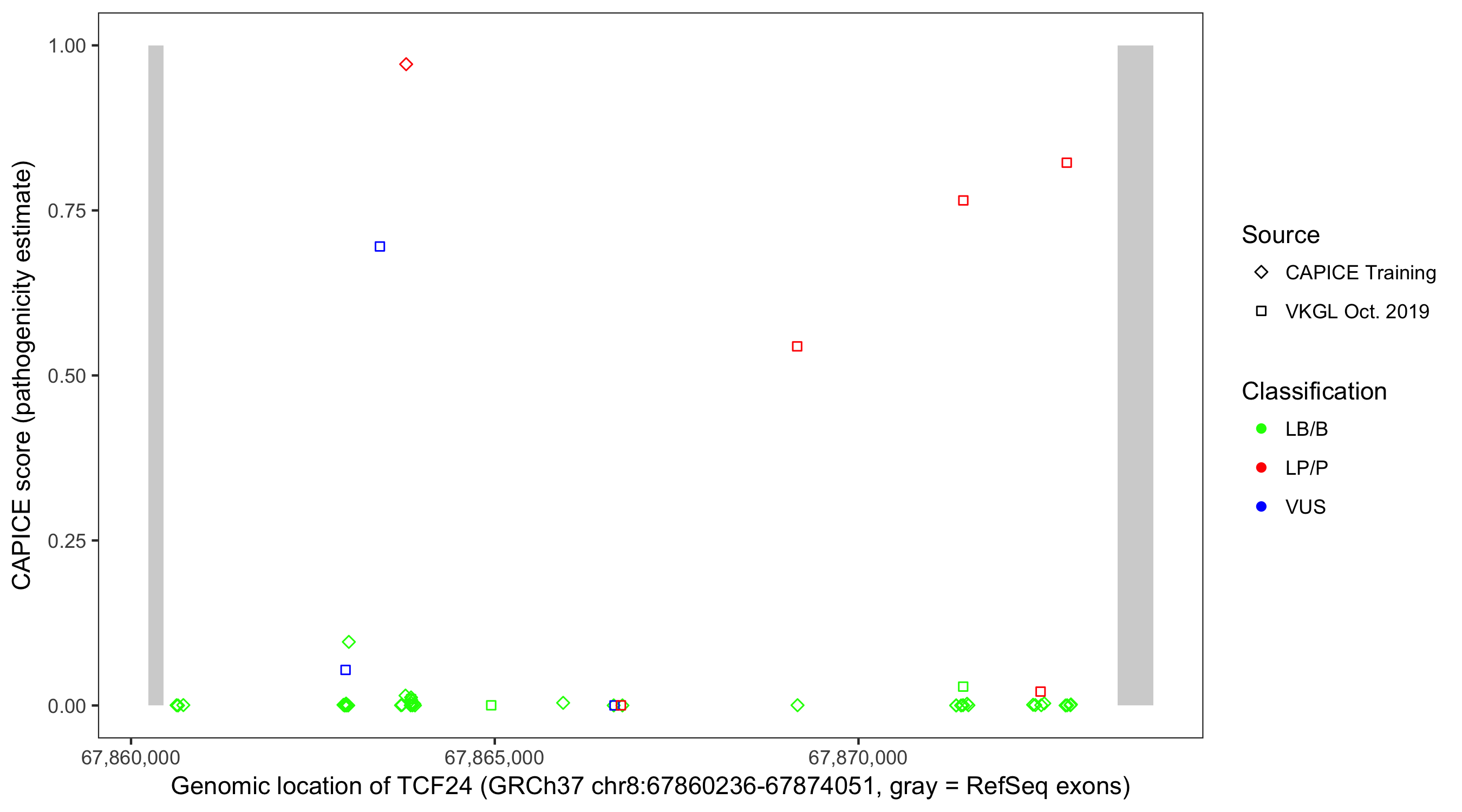 Shown are CAPICE train/test variants plus VKGL Oct 2019.