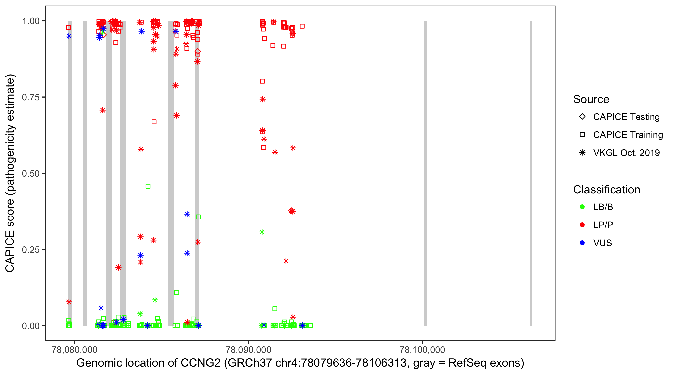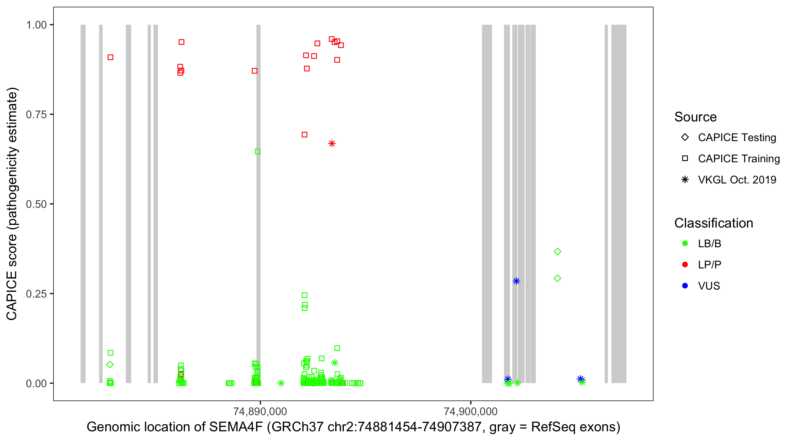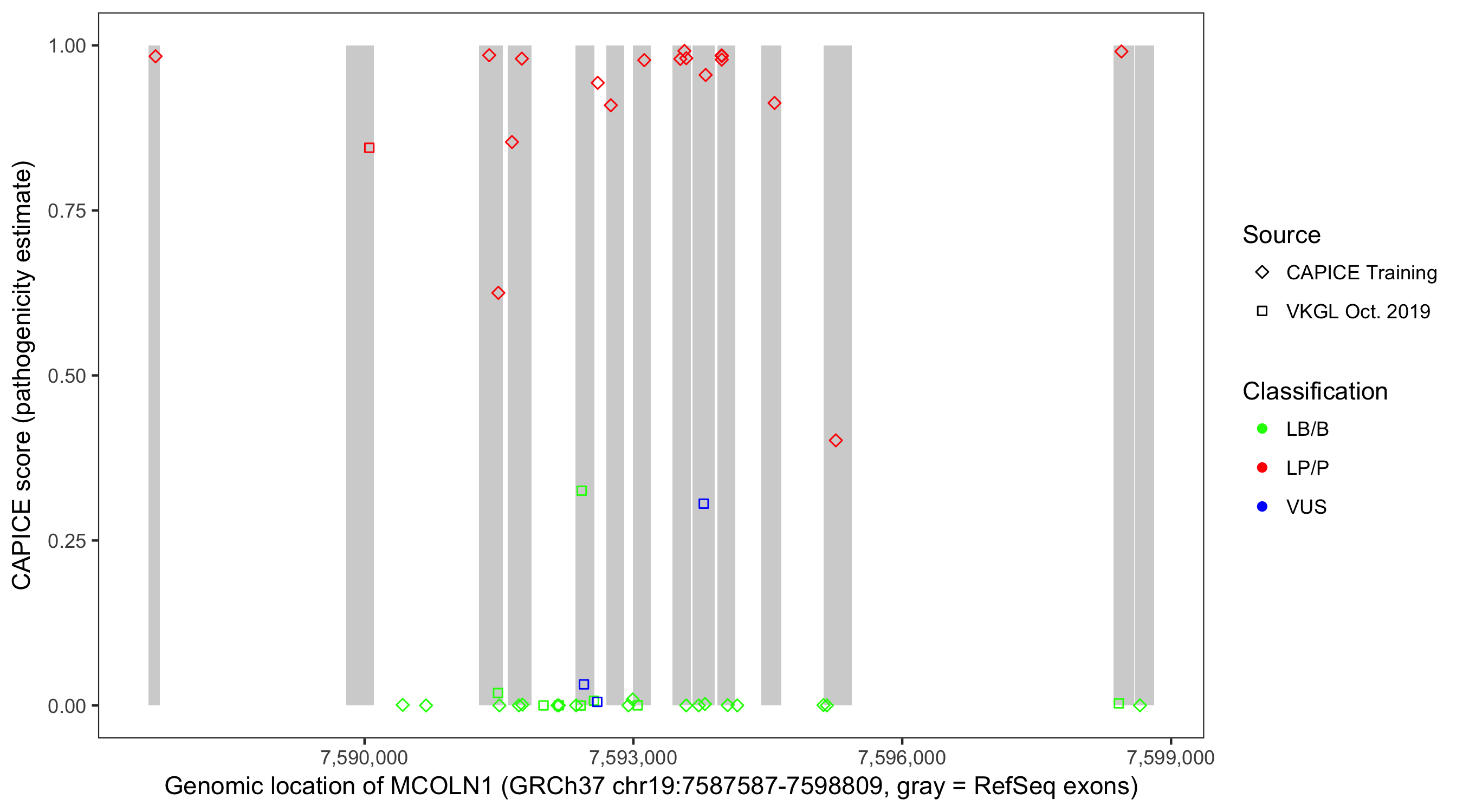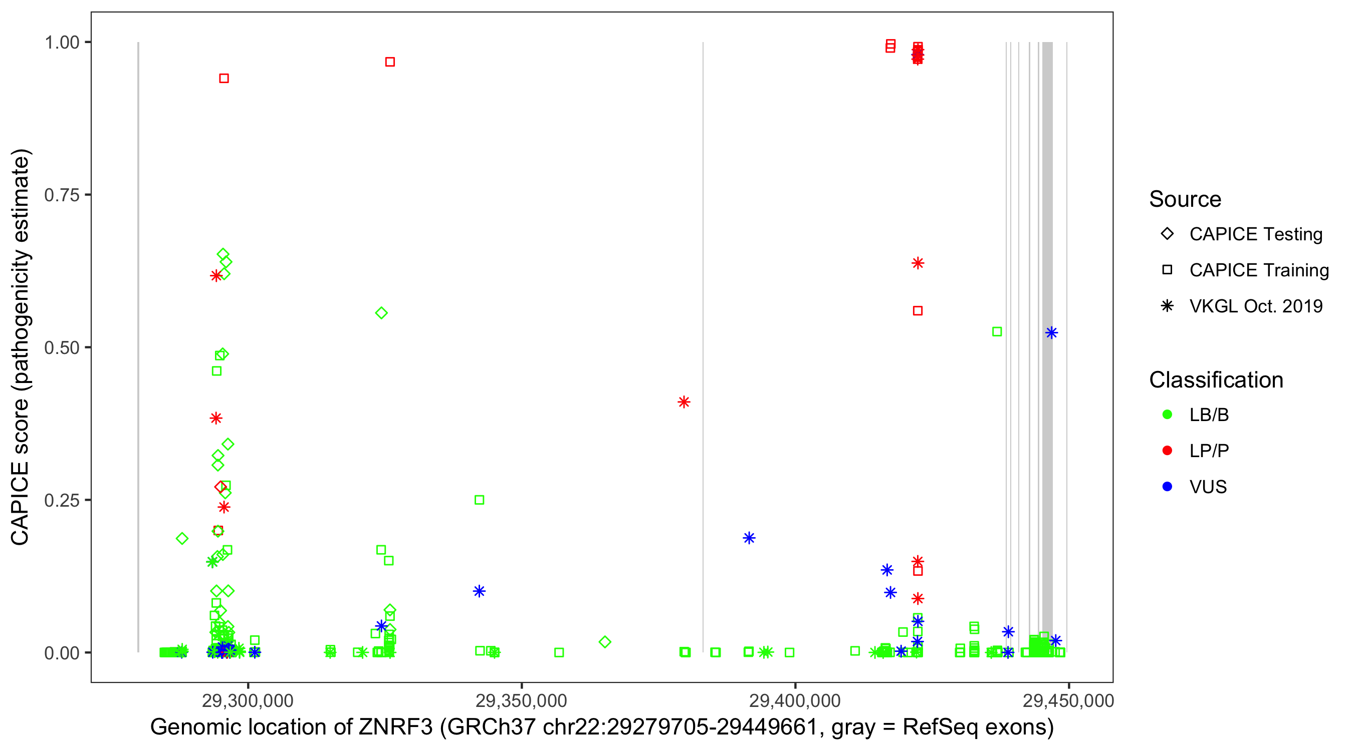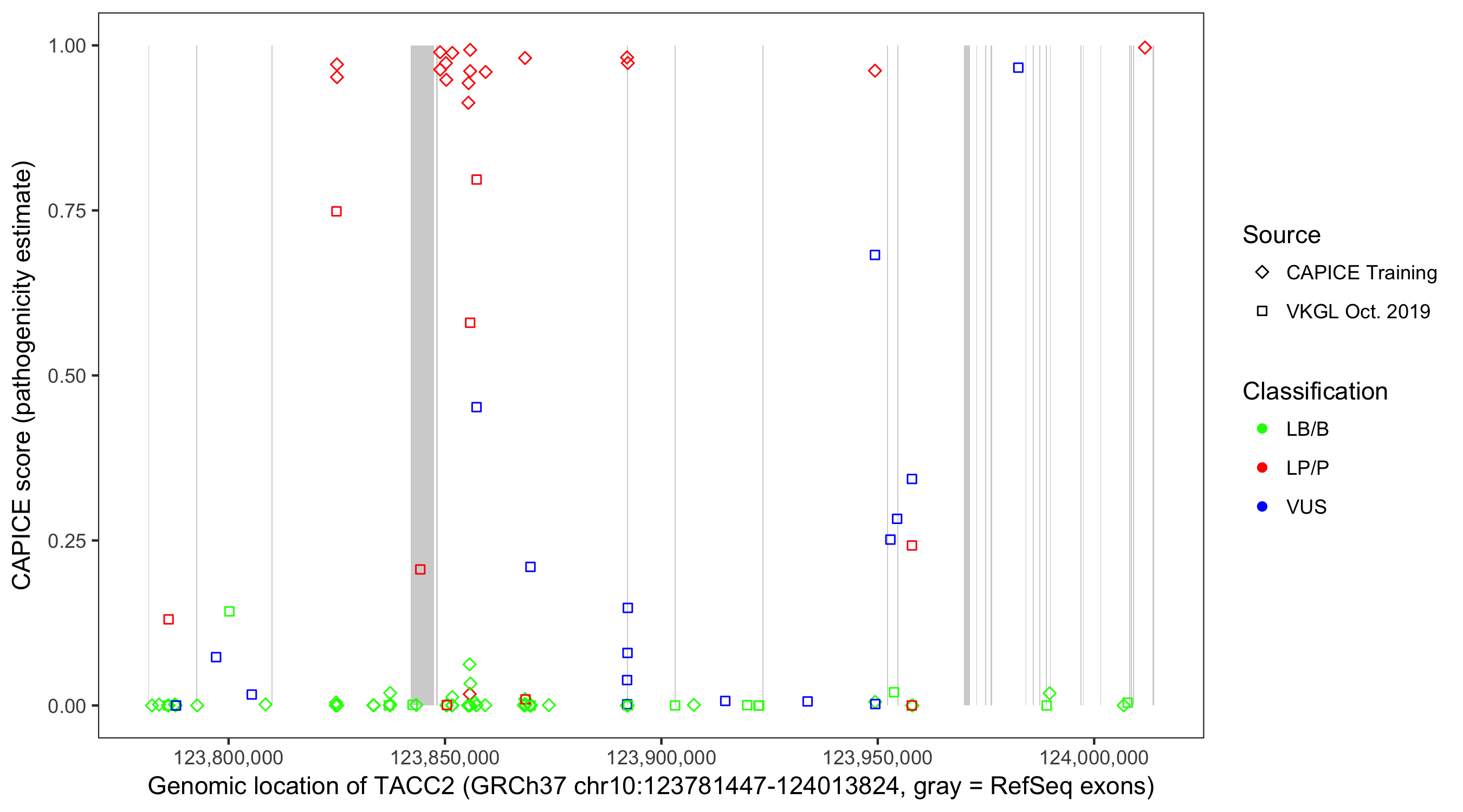 Shown are CAPICE train/test variants plus VKGL Oct 2019.