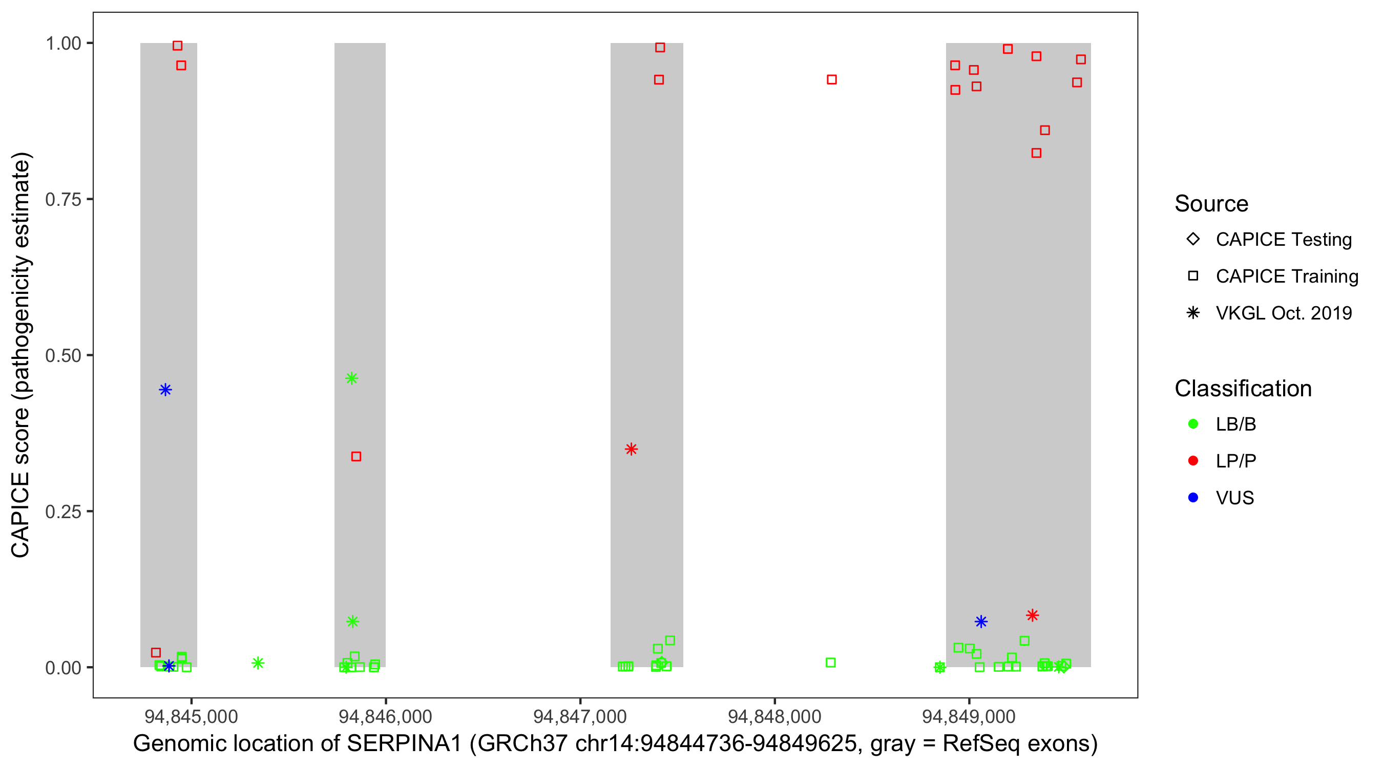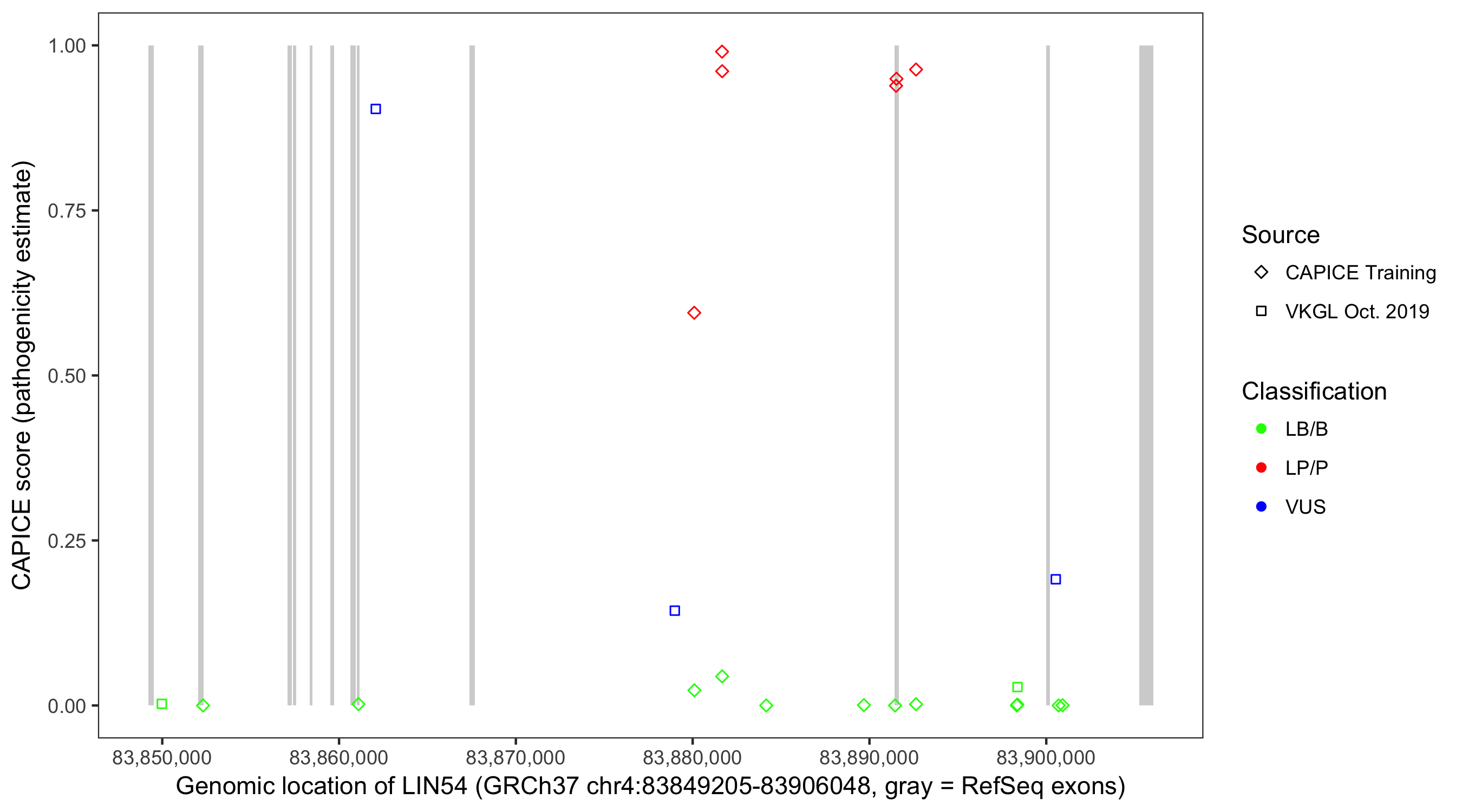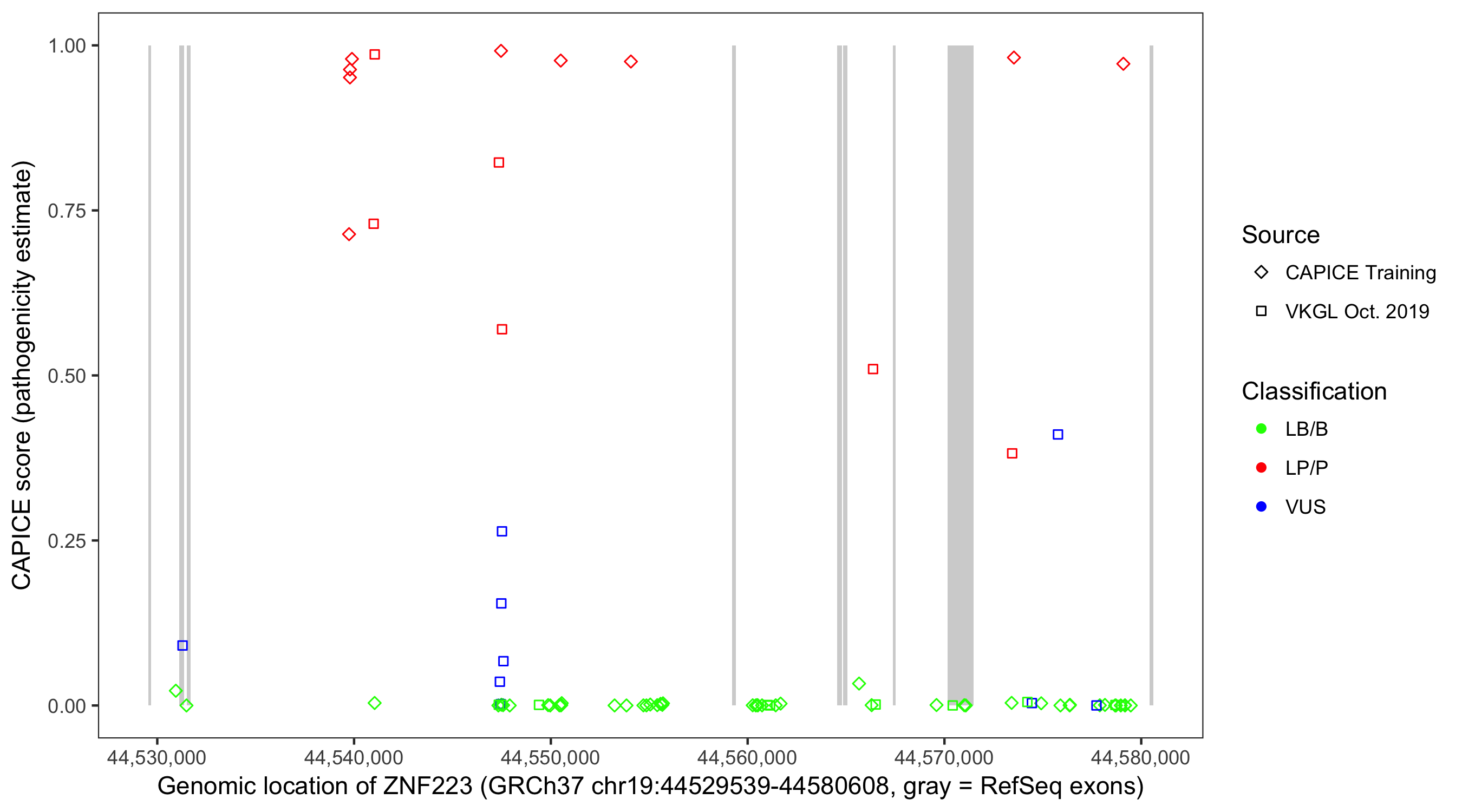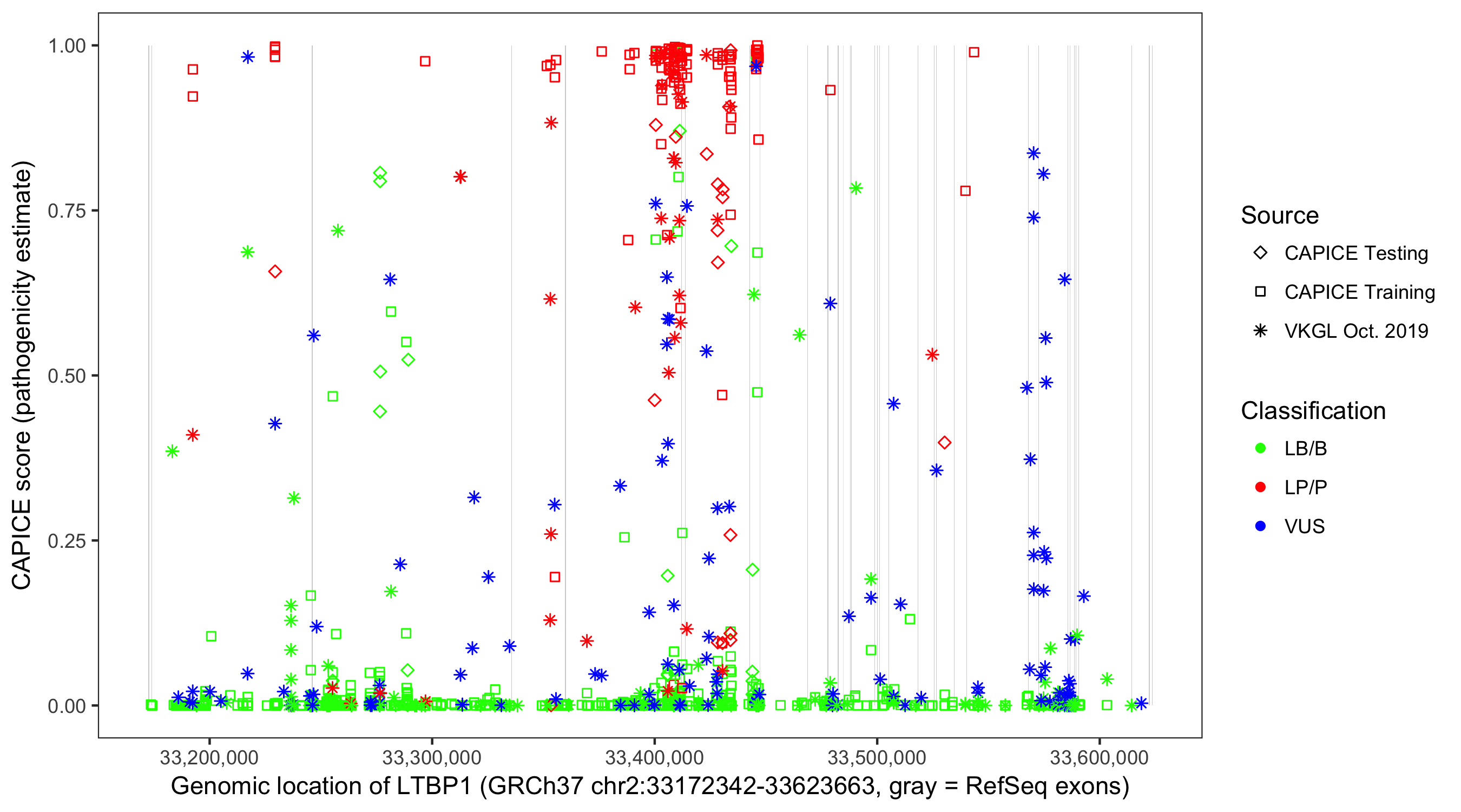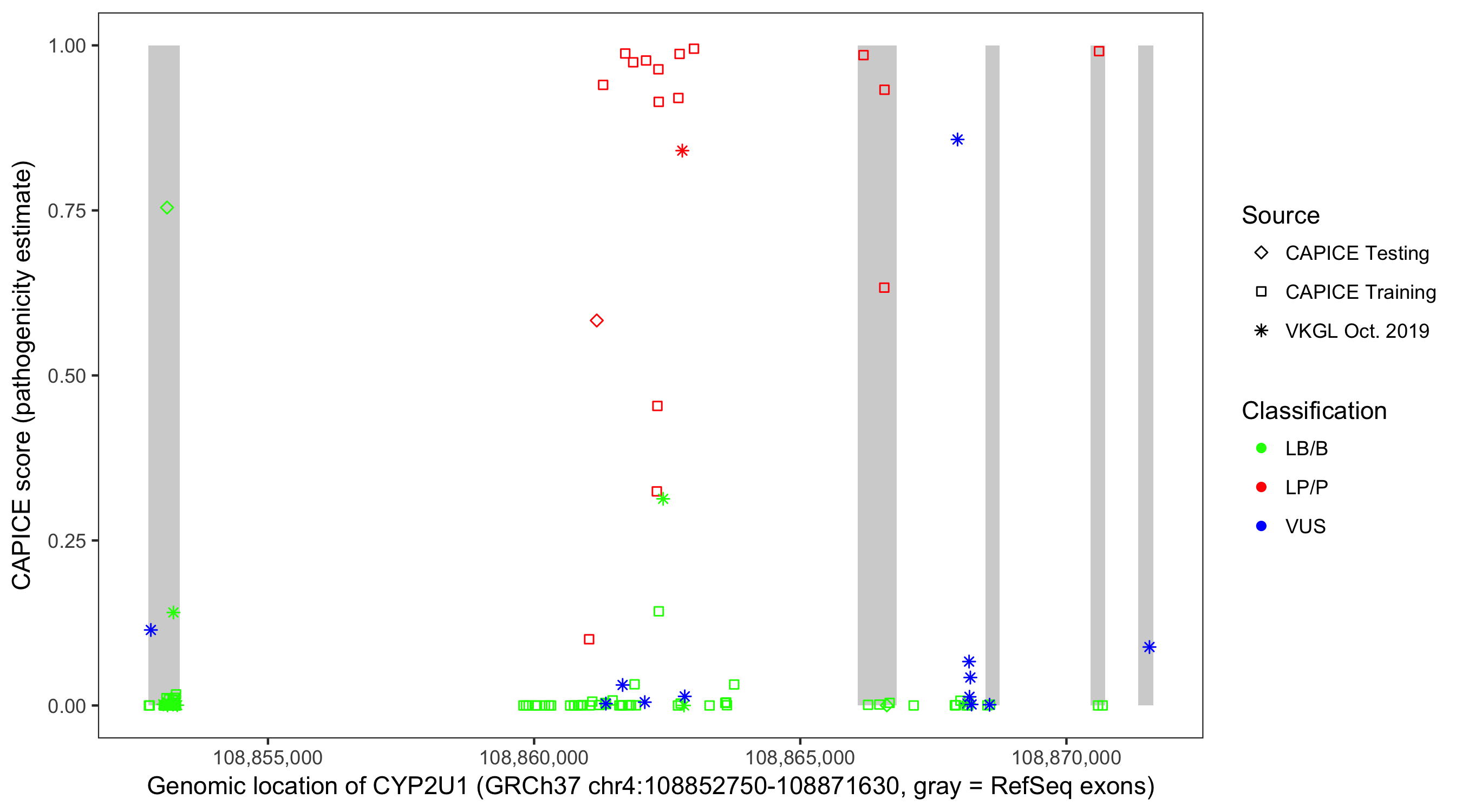 Shown are CAPICE train/test variants plus VKGL Oct 2019.