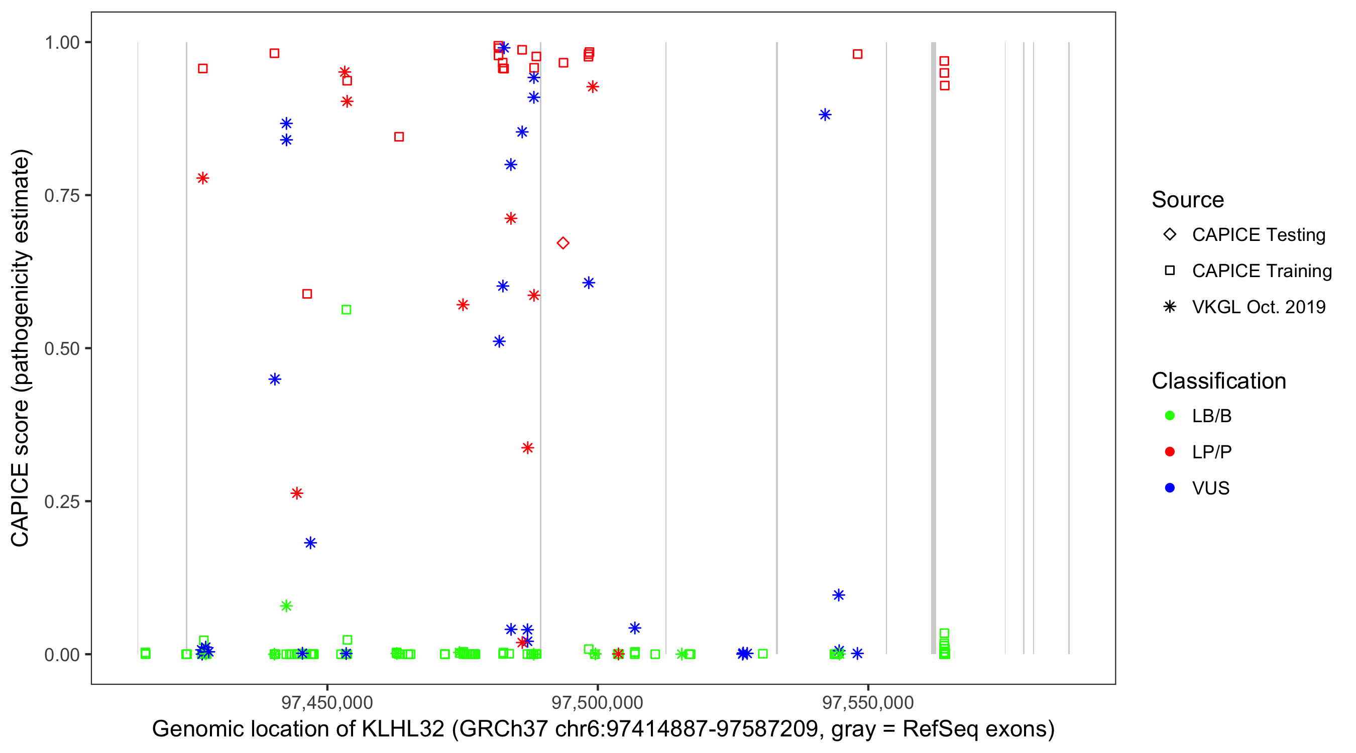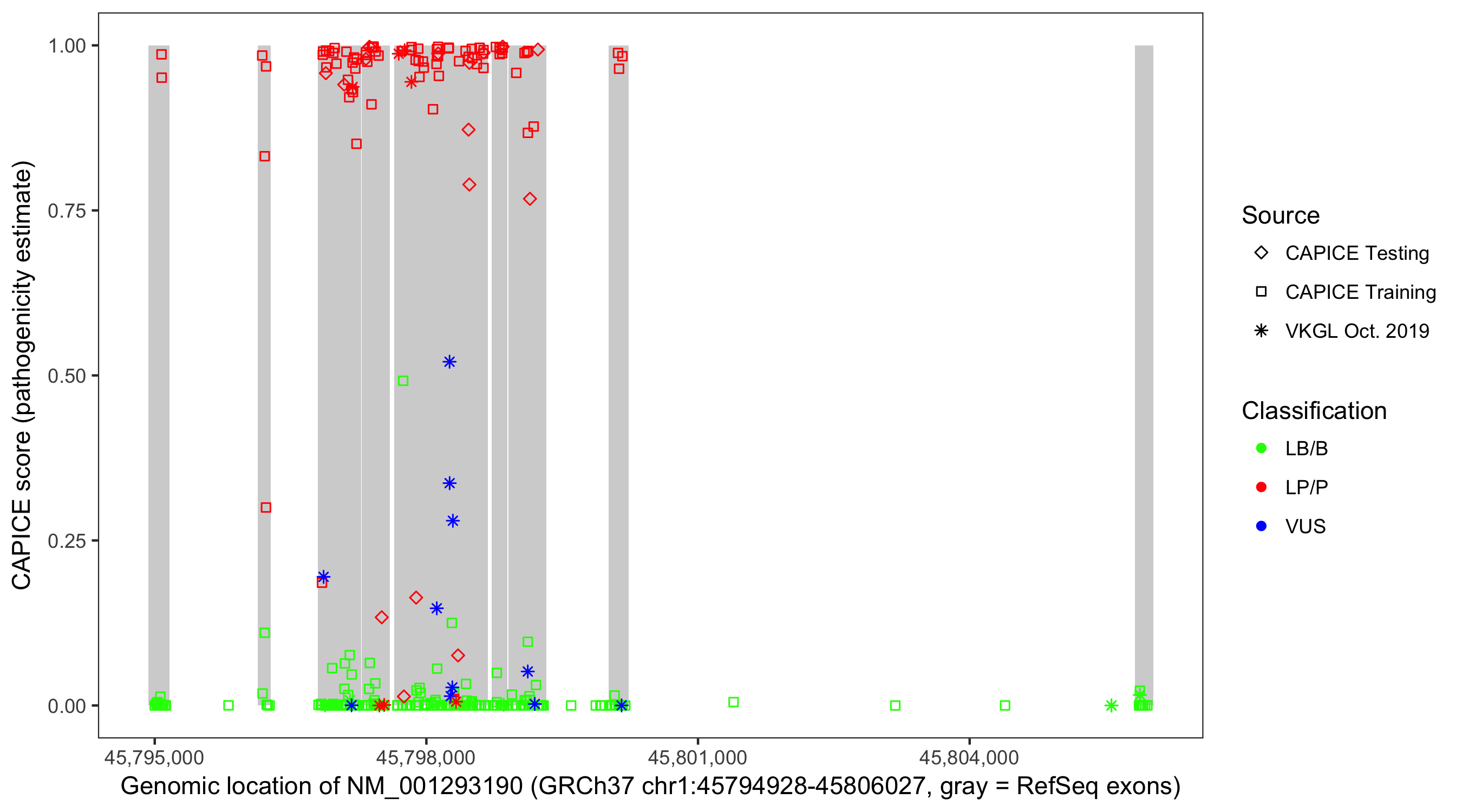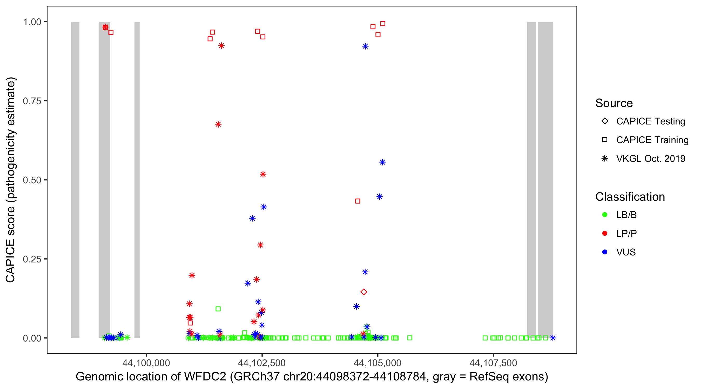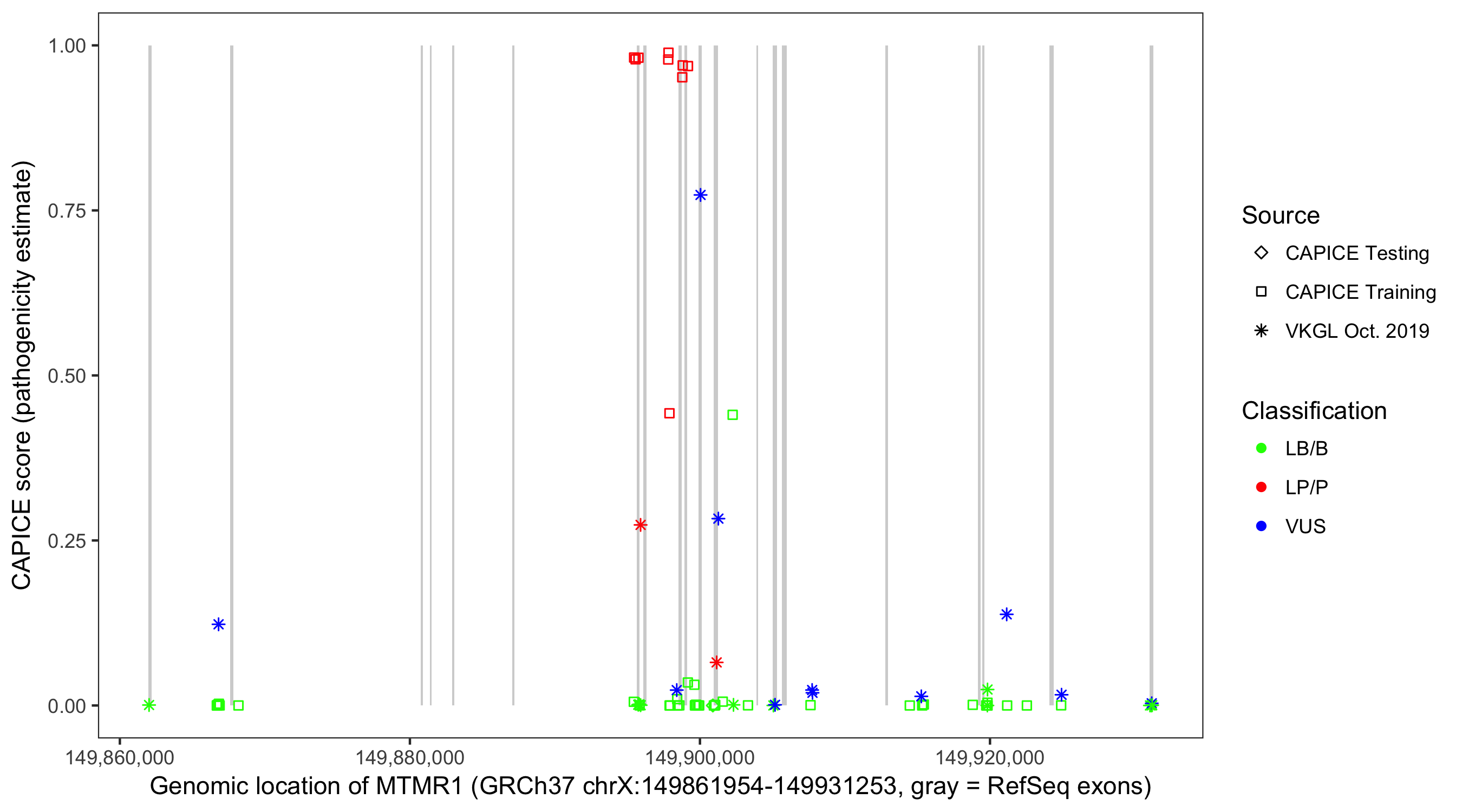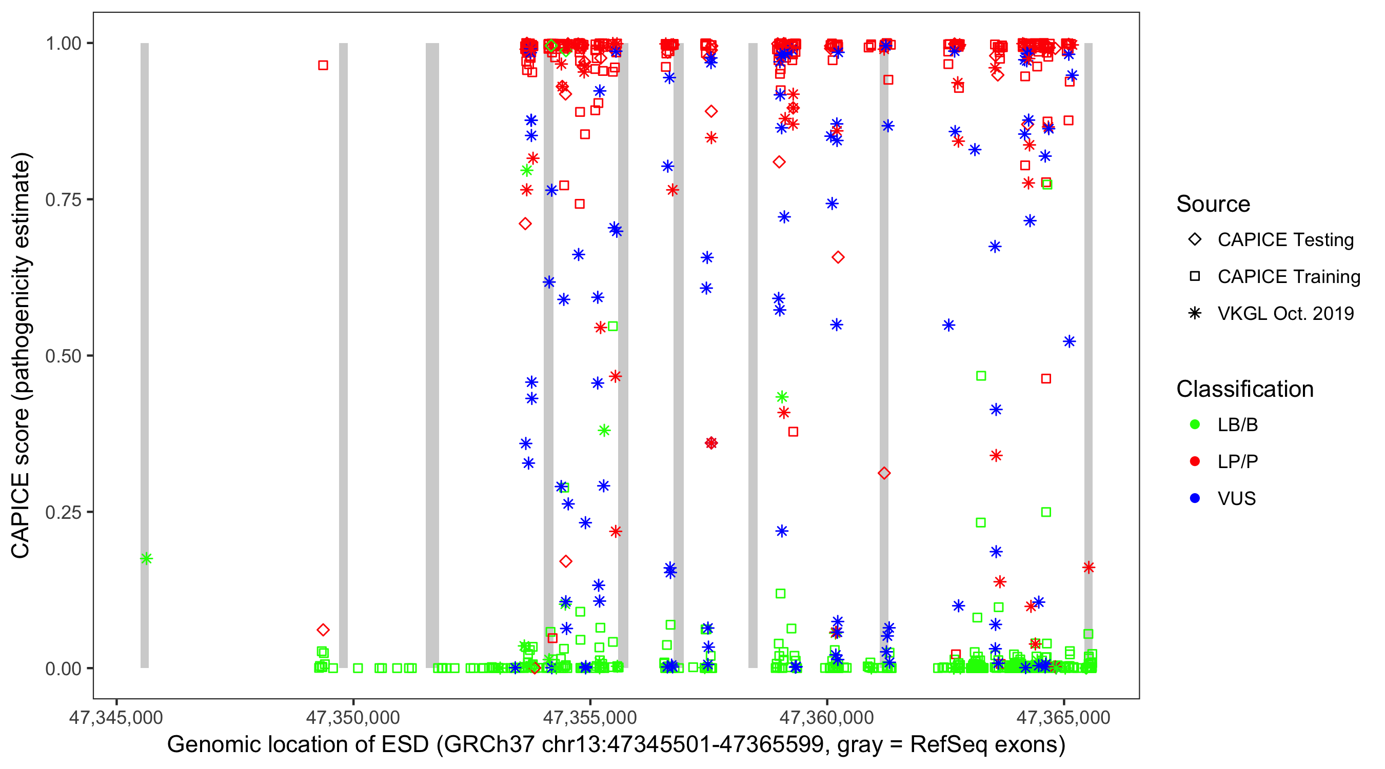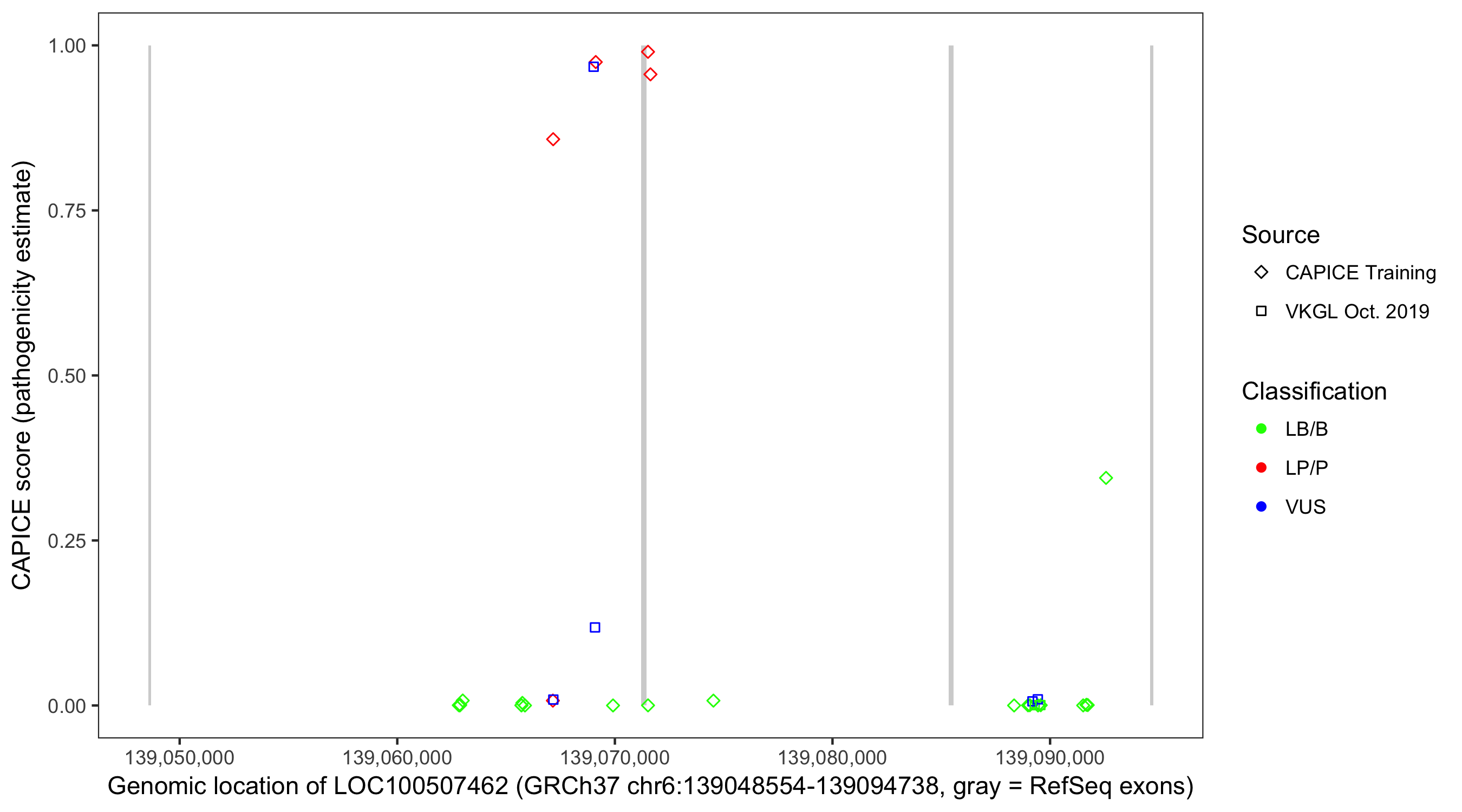 Shown are CAPICE train/test variants plus VKGL Oct 2019.