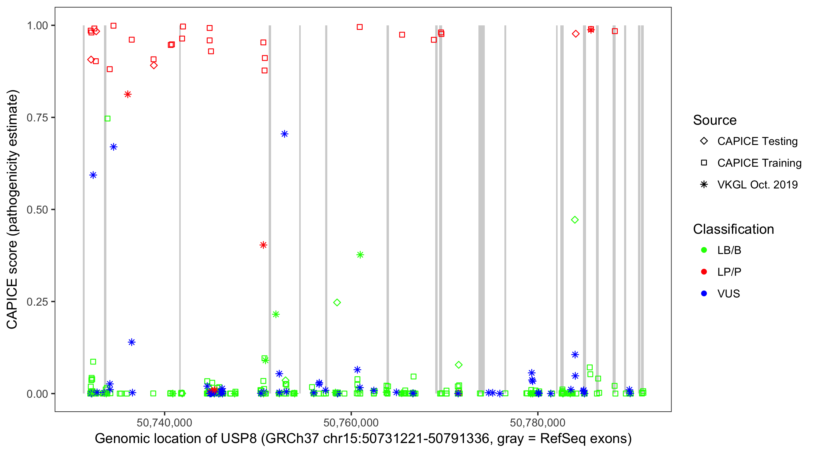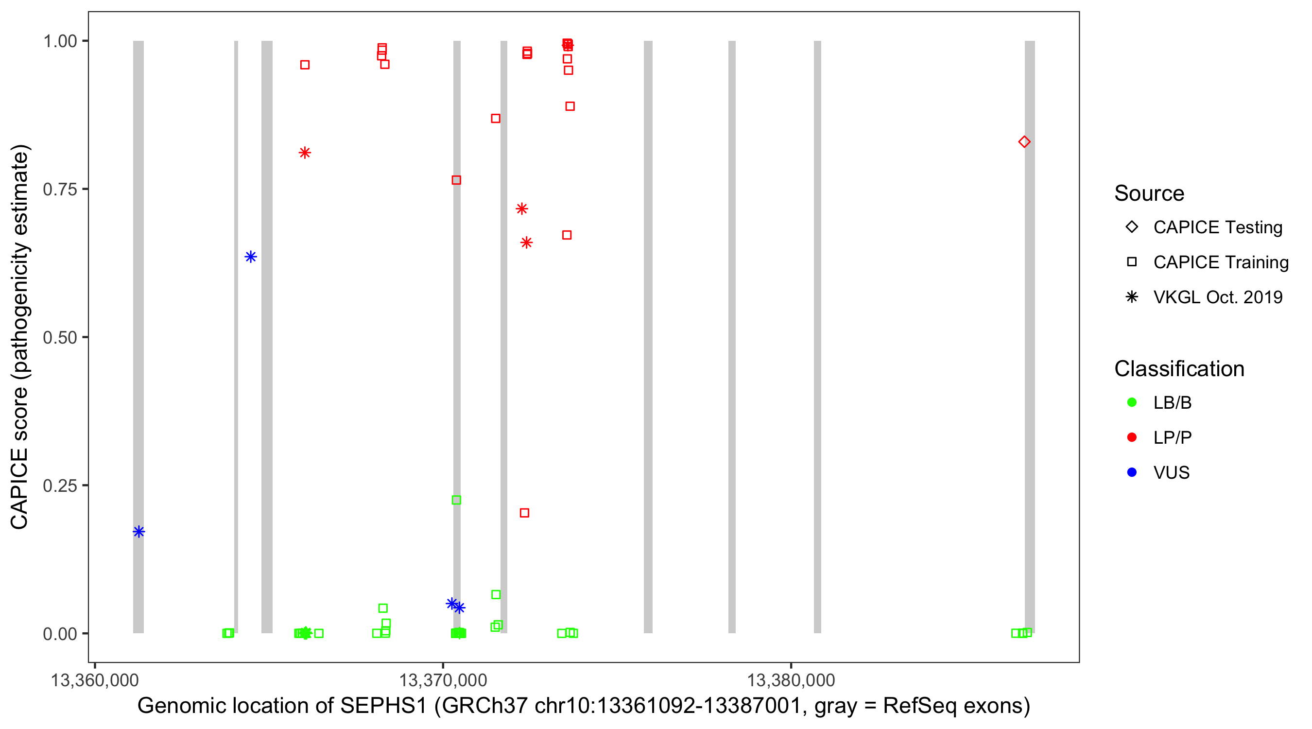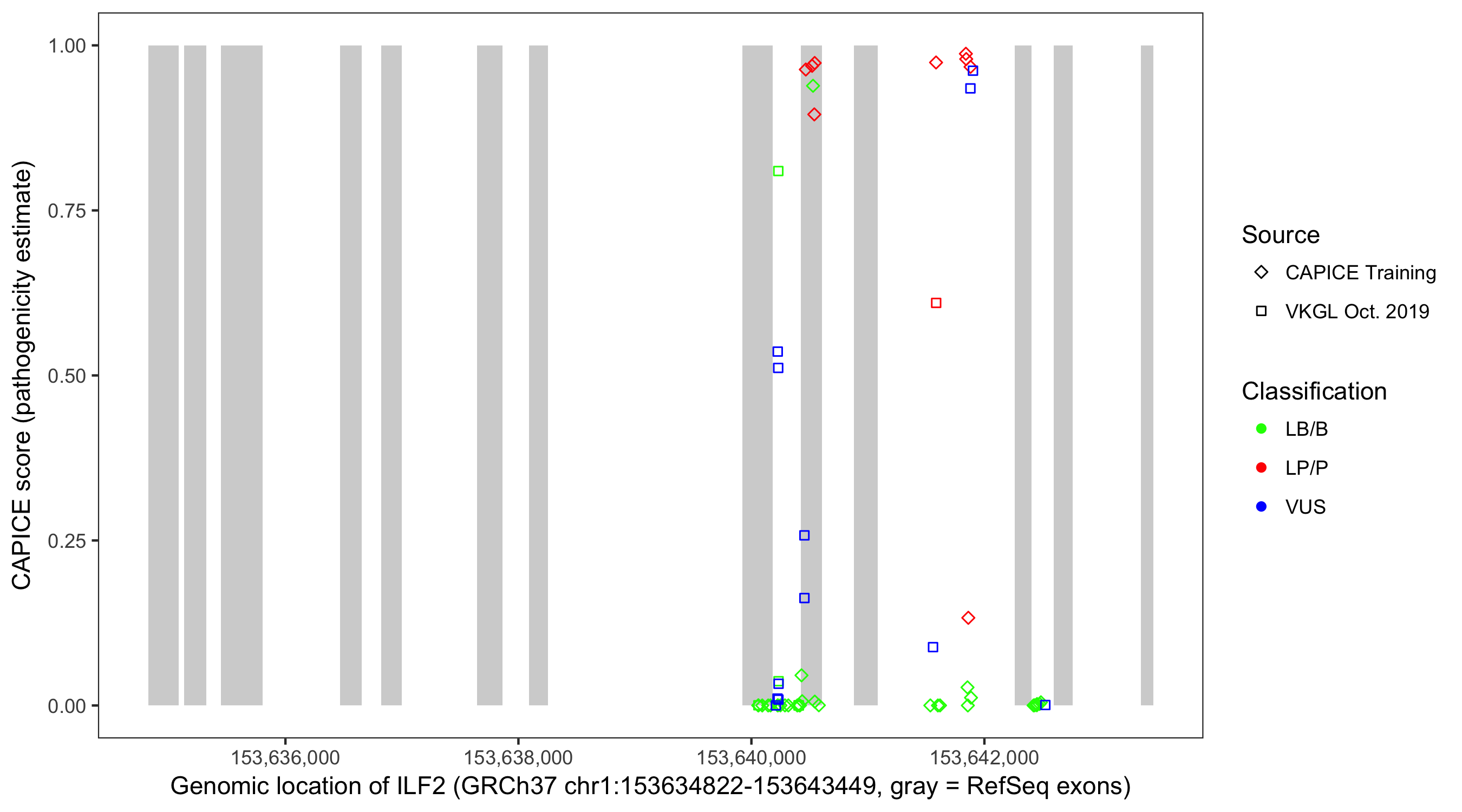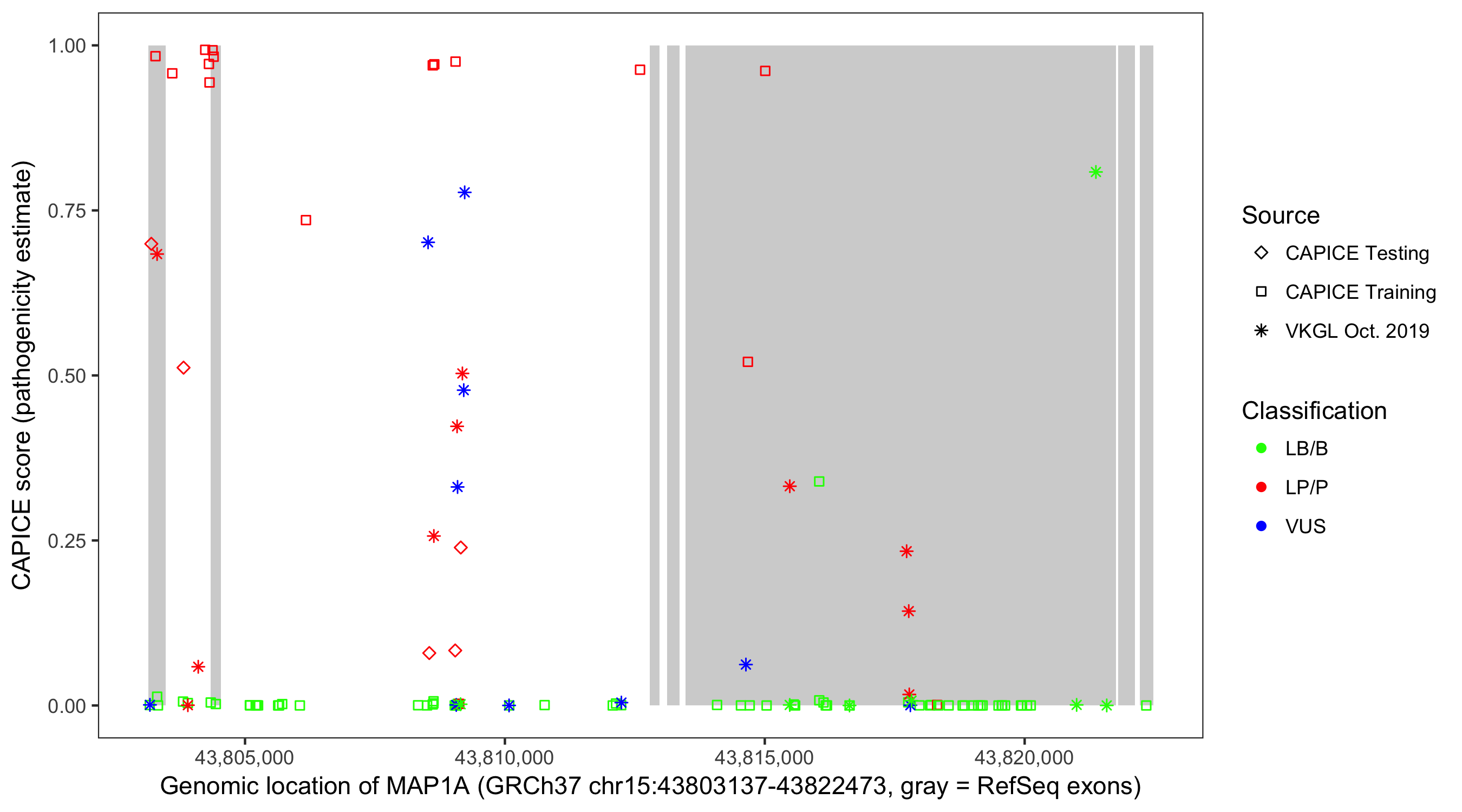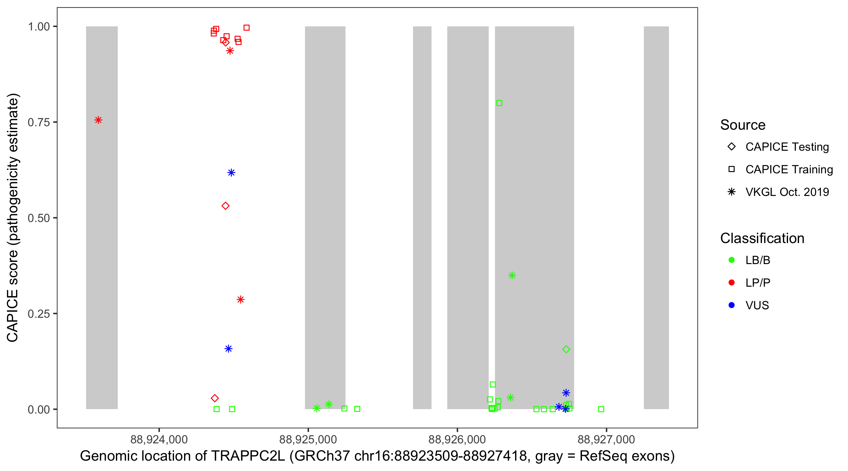 Shown are CAPICE train/test variants plus VKGL Oct 2019.