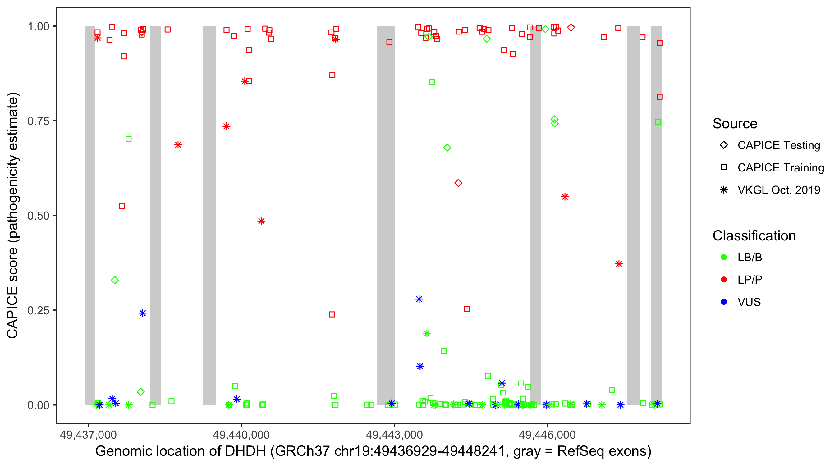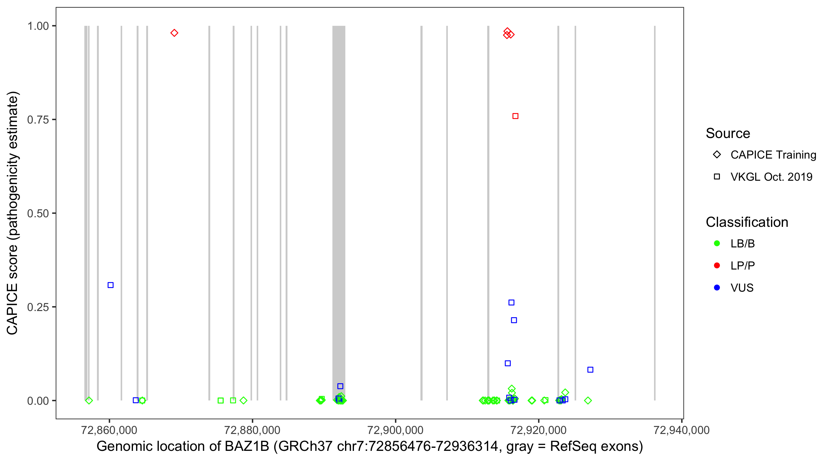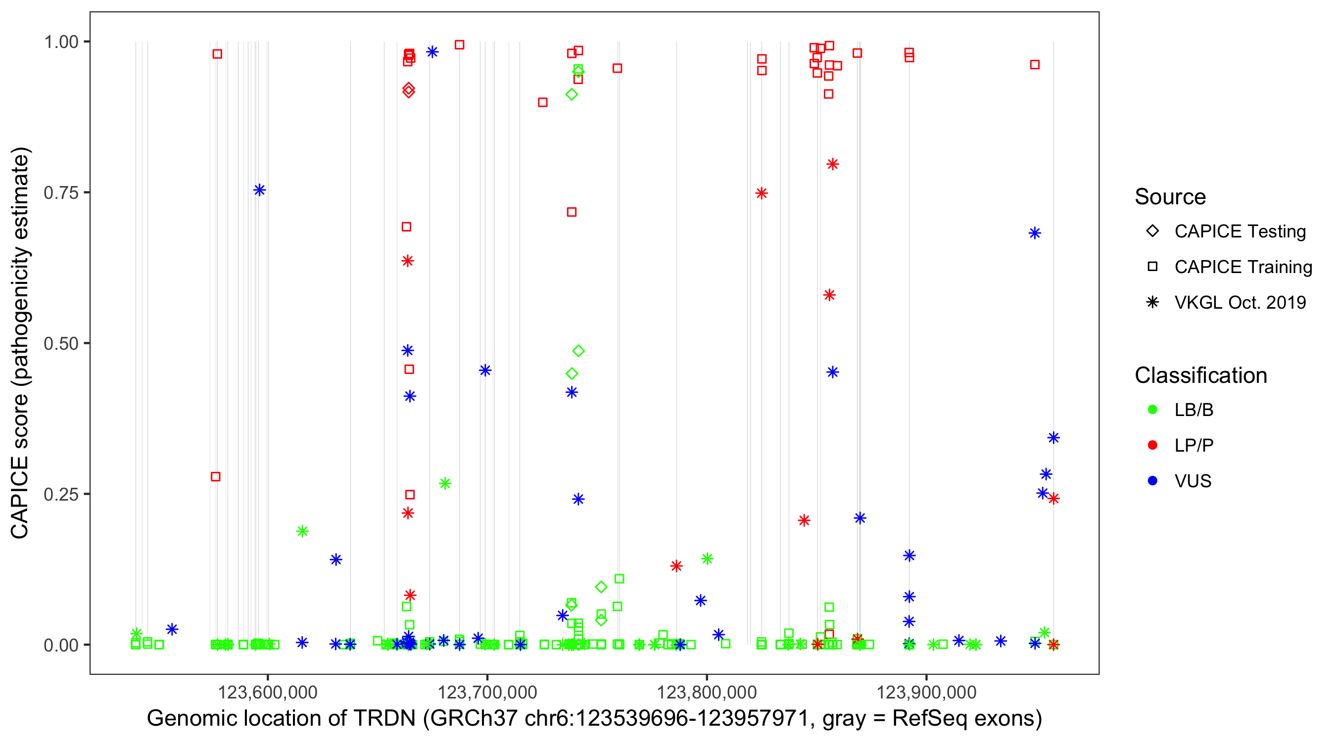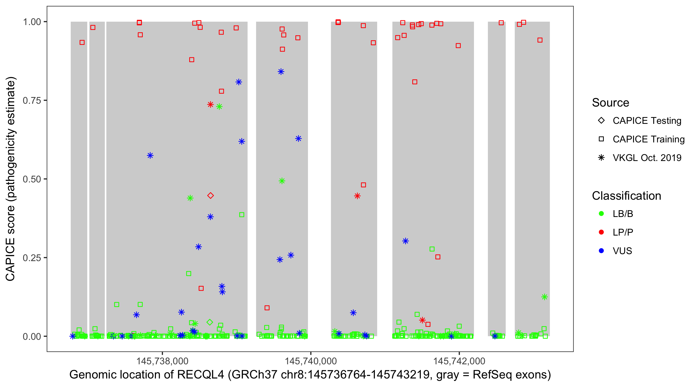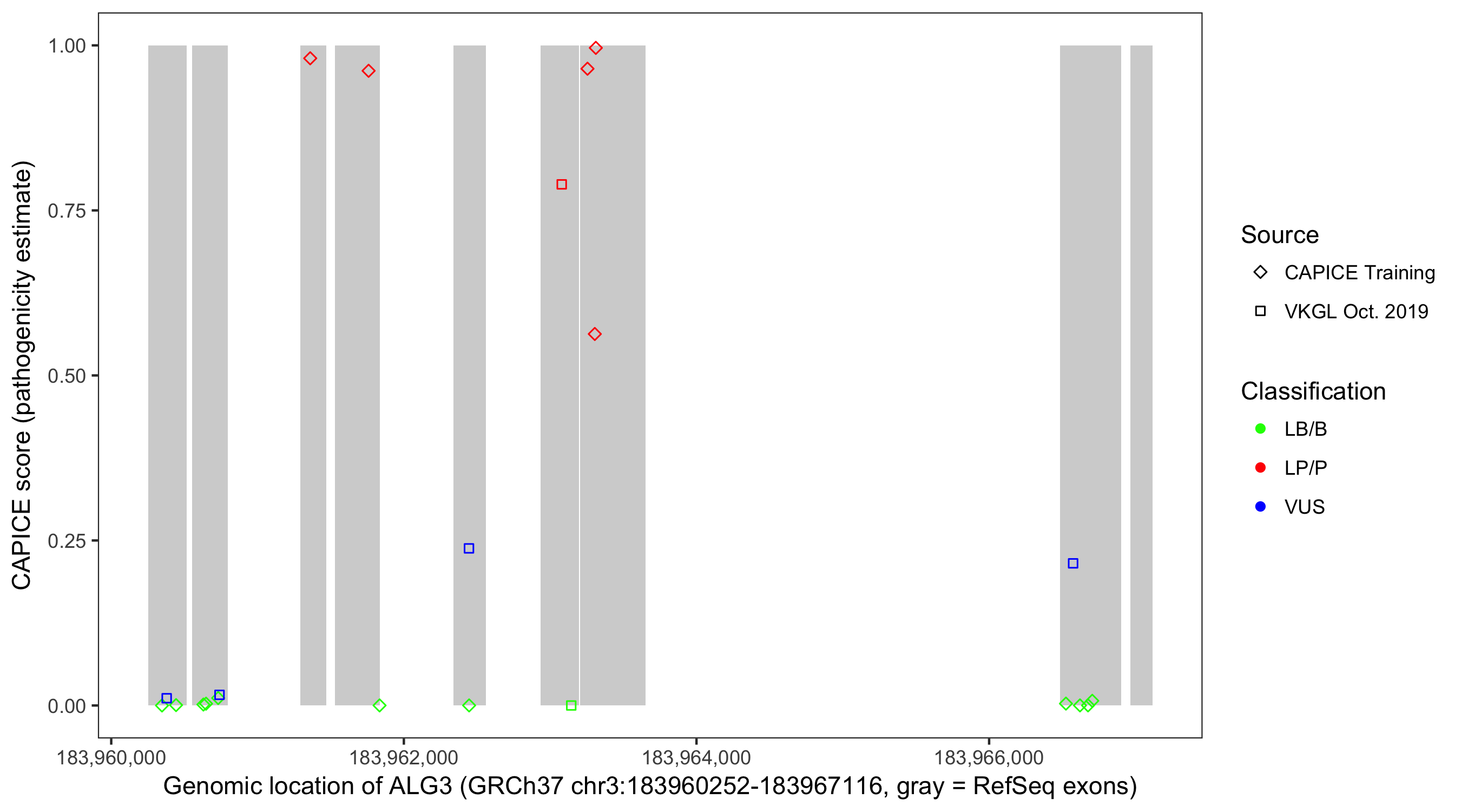 Shown are CAPICE train/test variants plus VKGL Oct 2019.