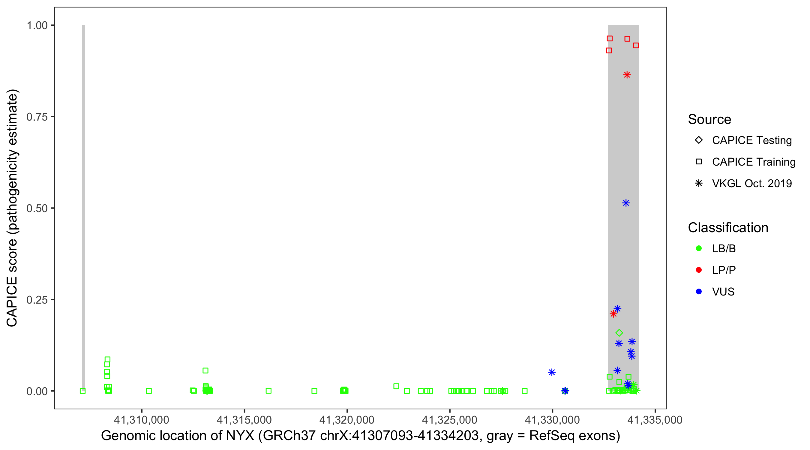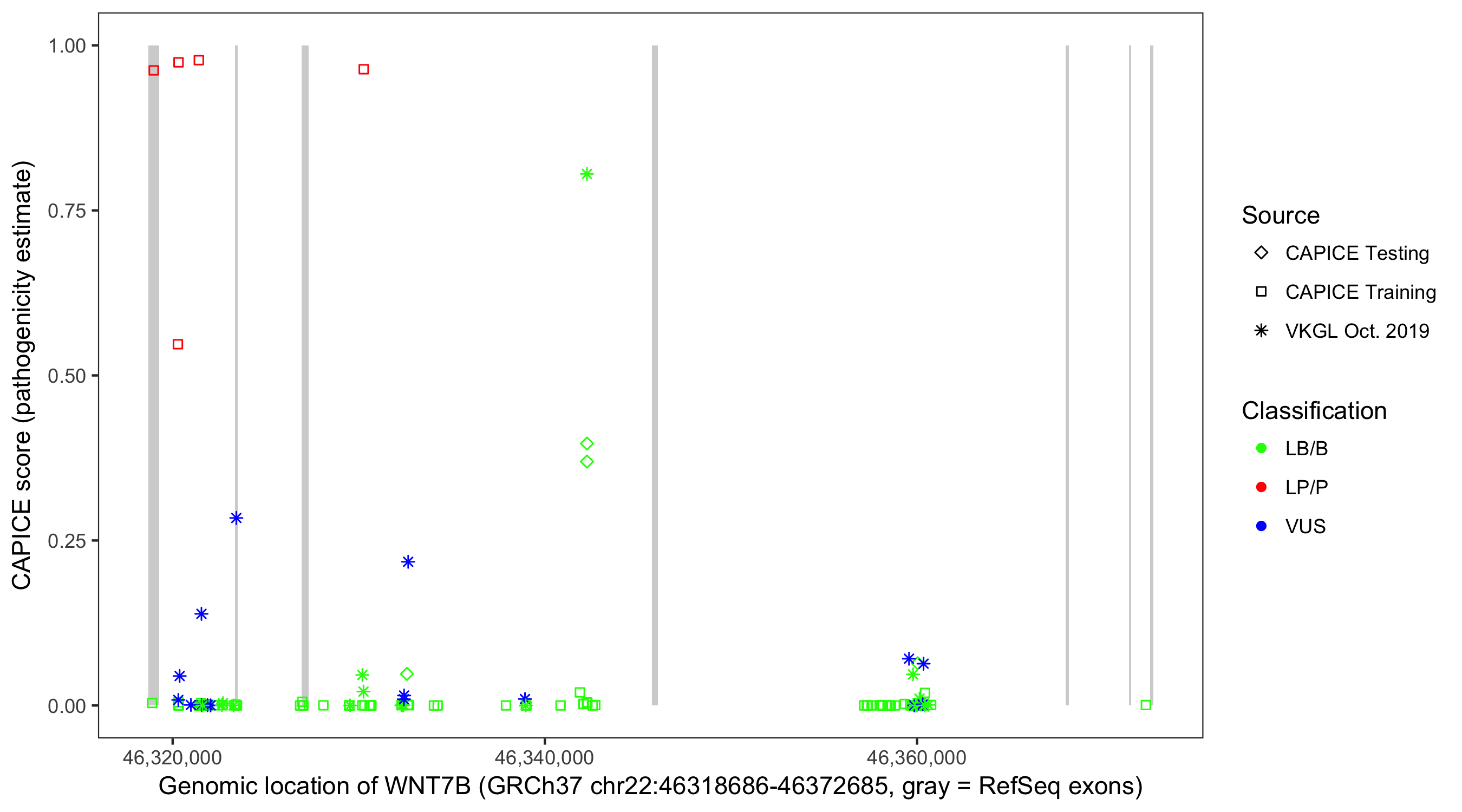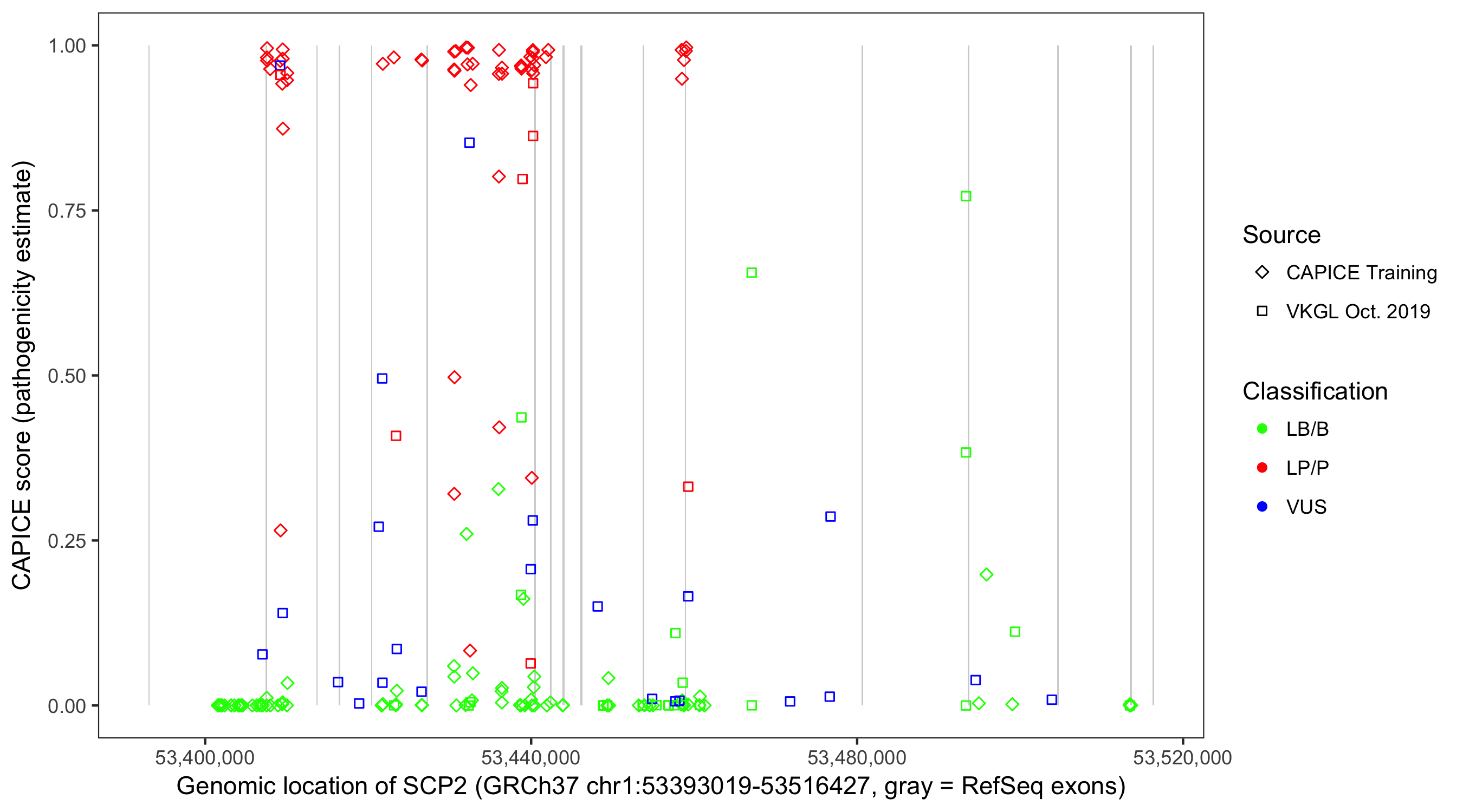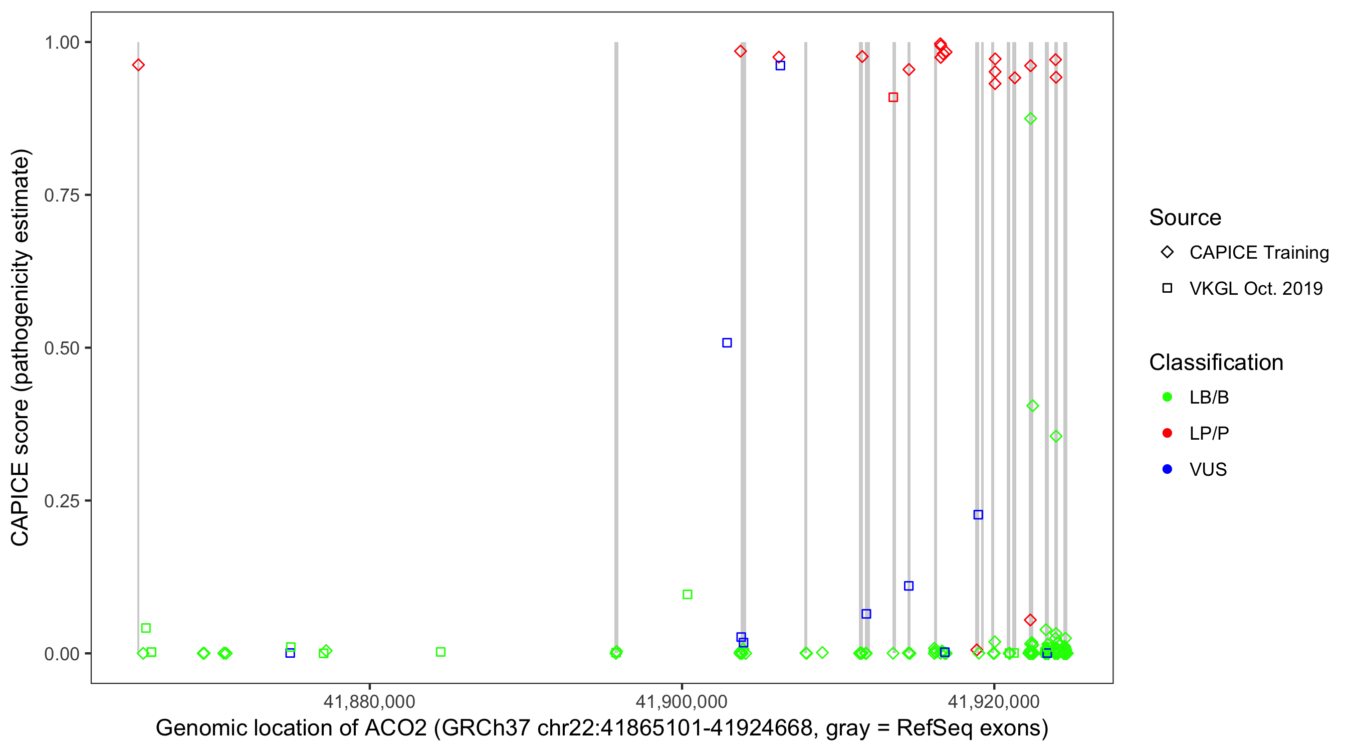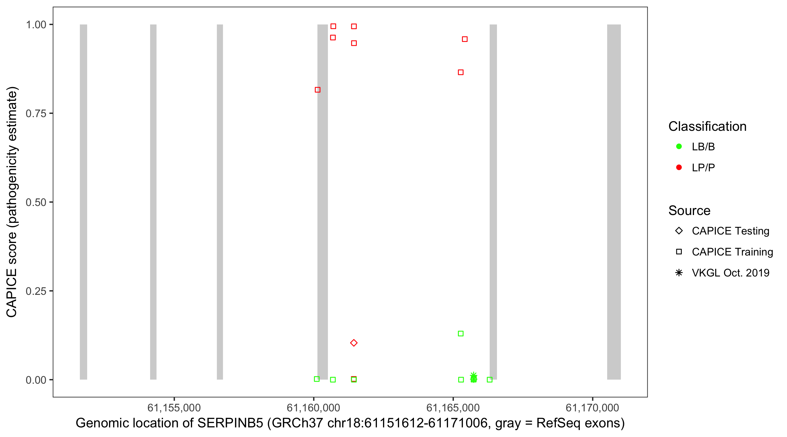 Shown are CAPICE train/test variants plus VKGL Oct 2019.