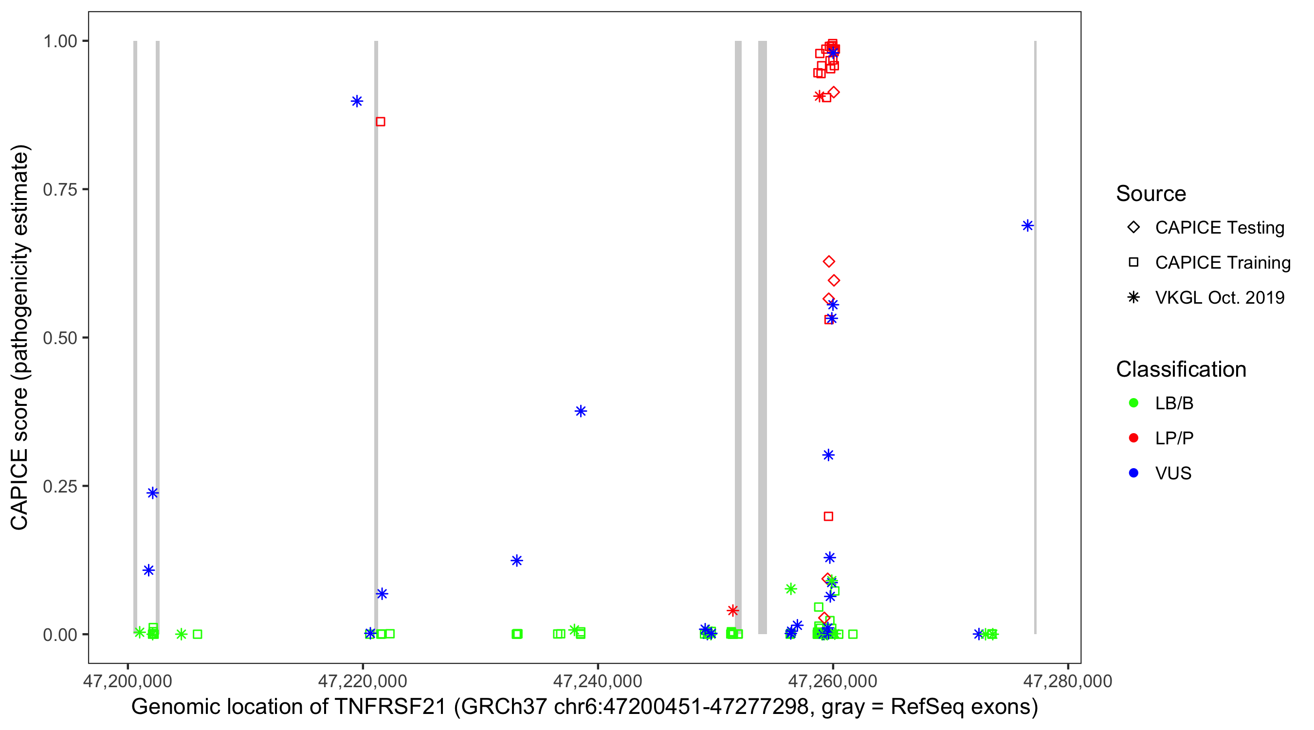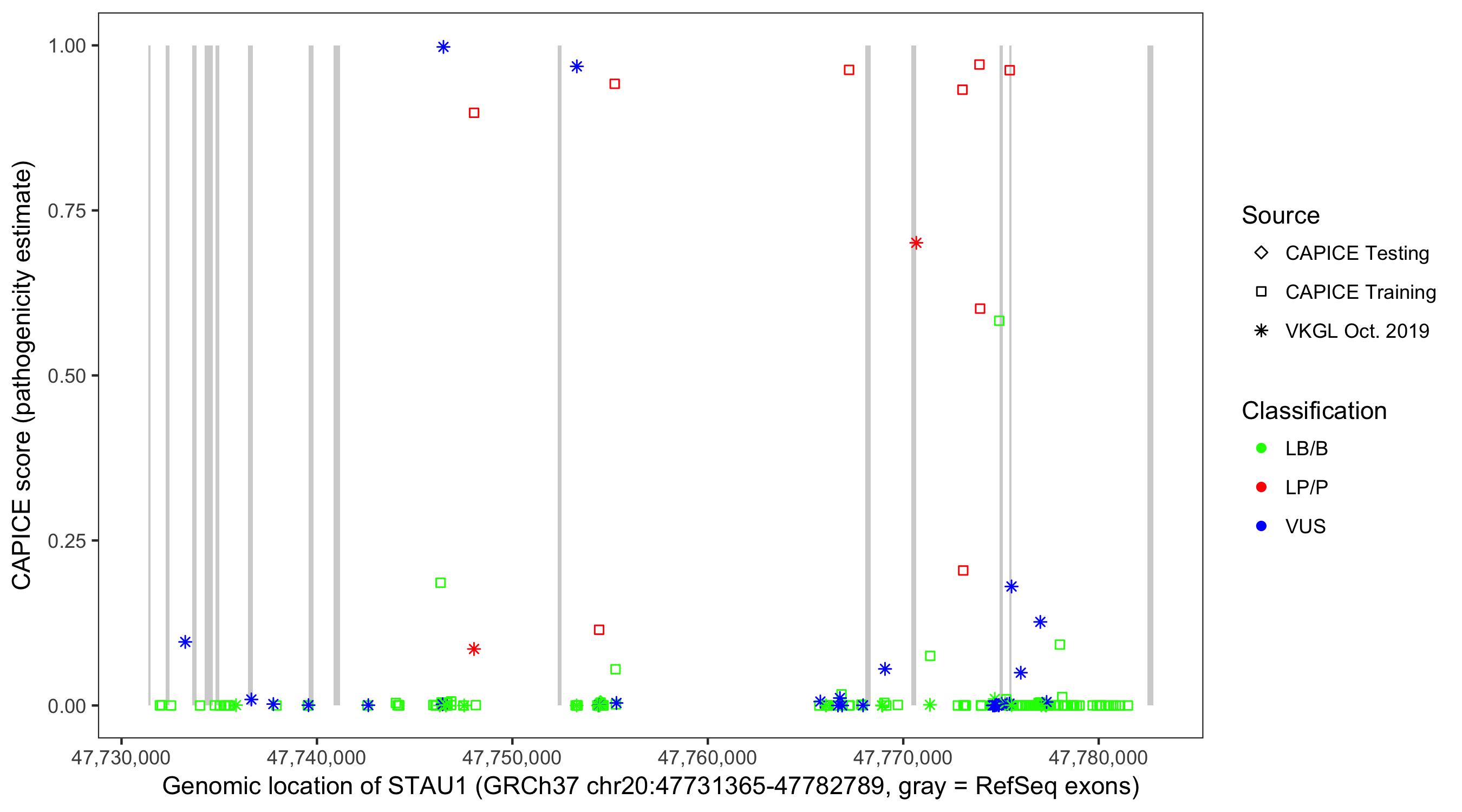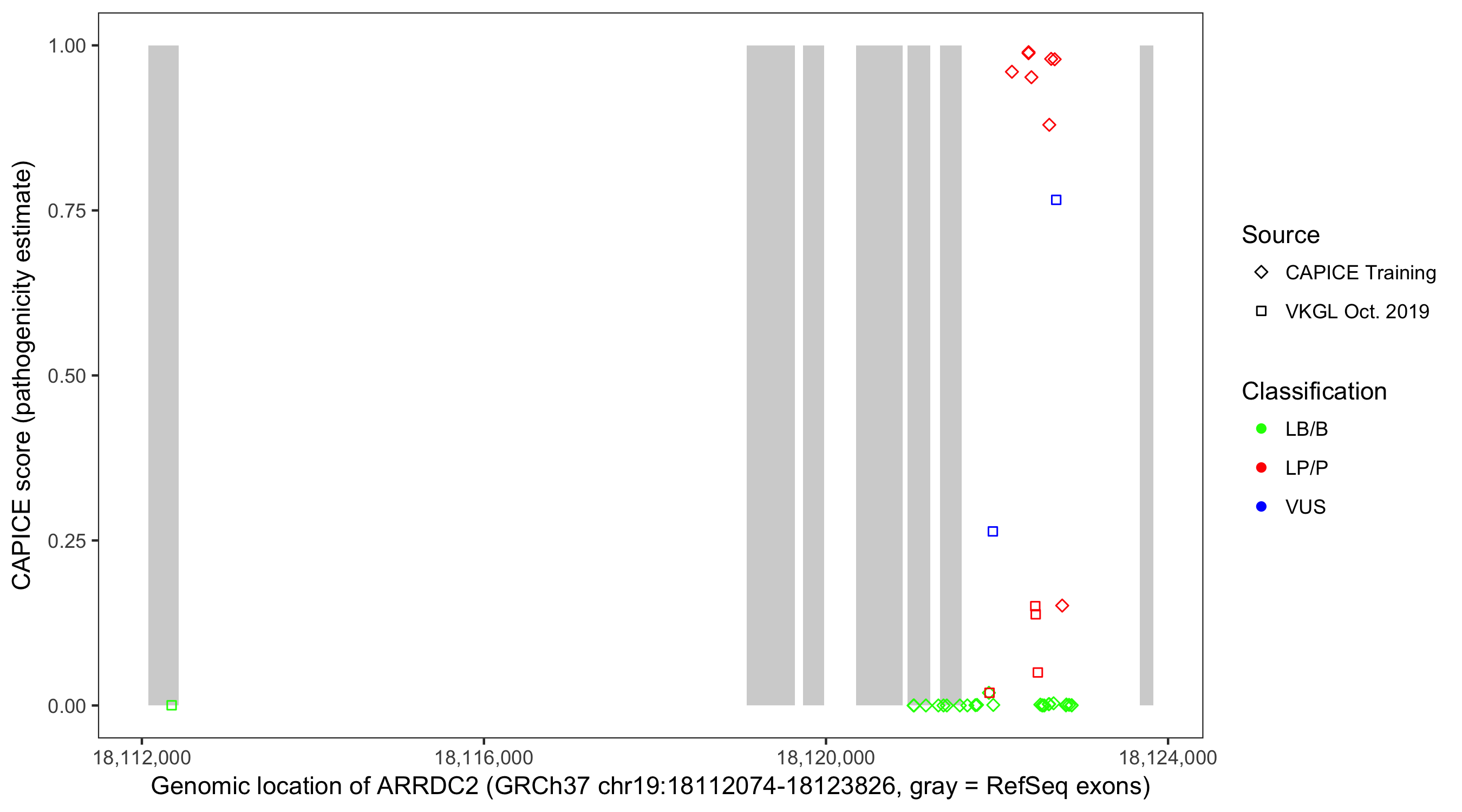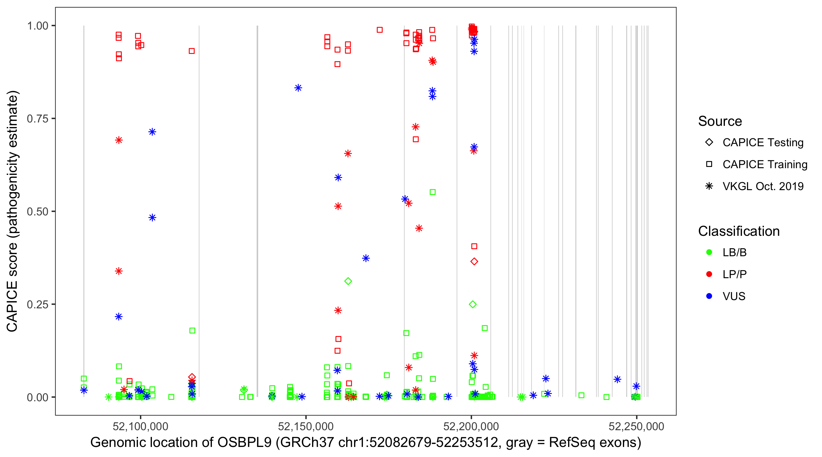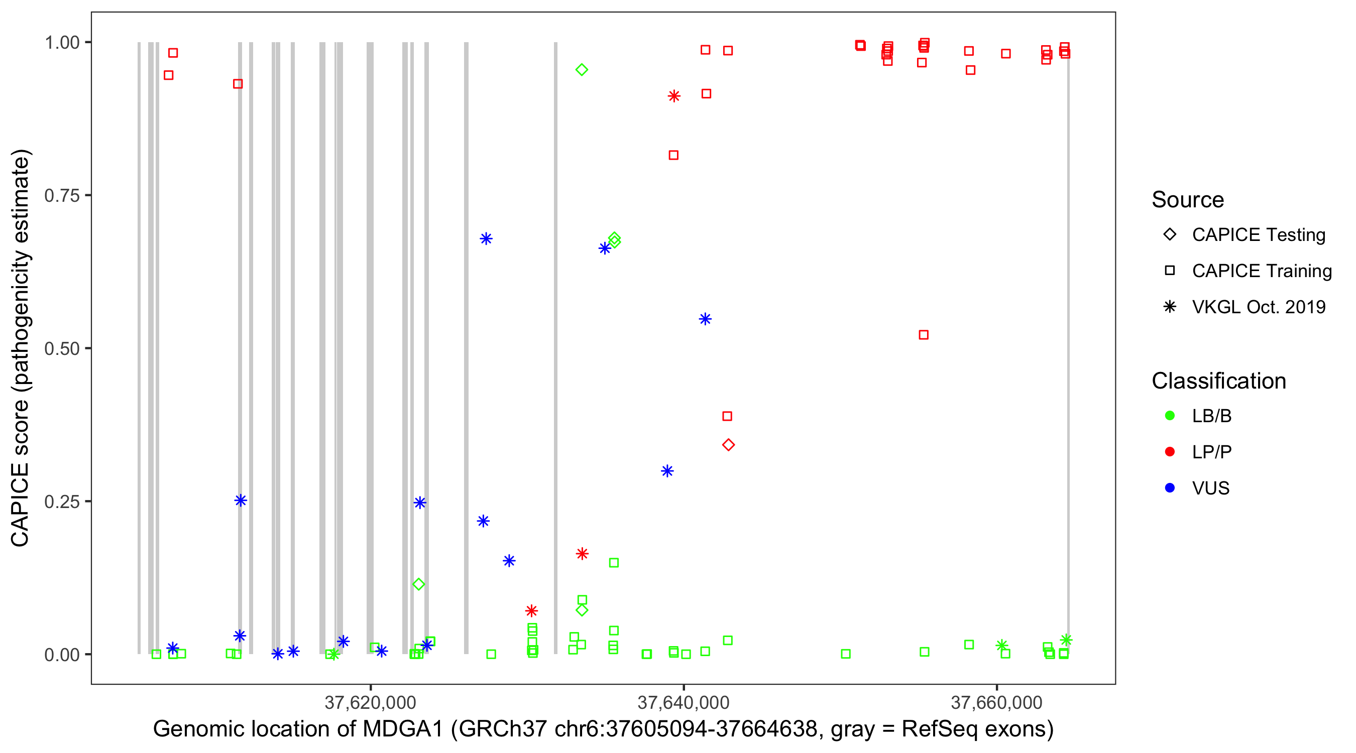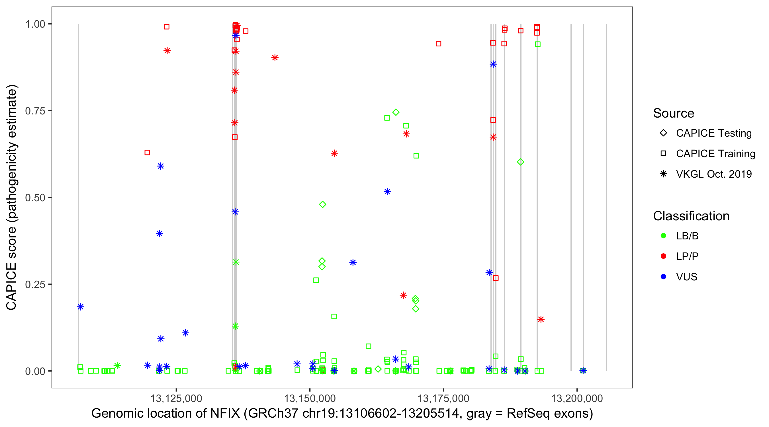Shown are CAPICE train/test variants plus VKGL Oct 2019.