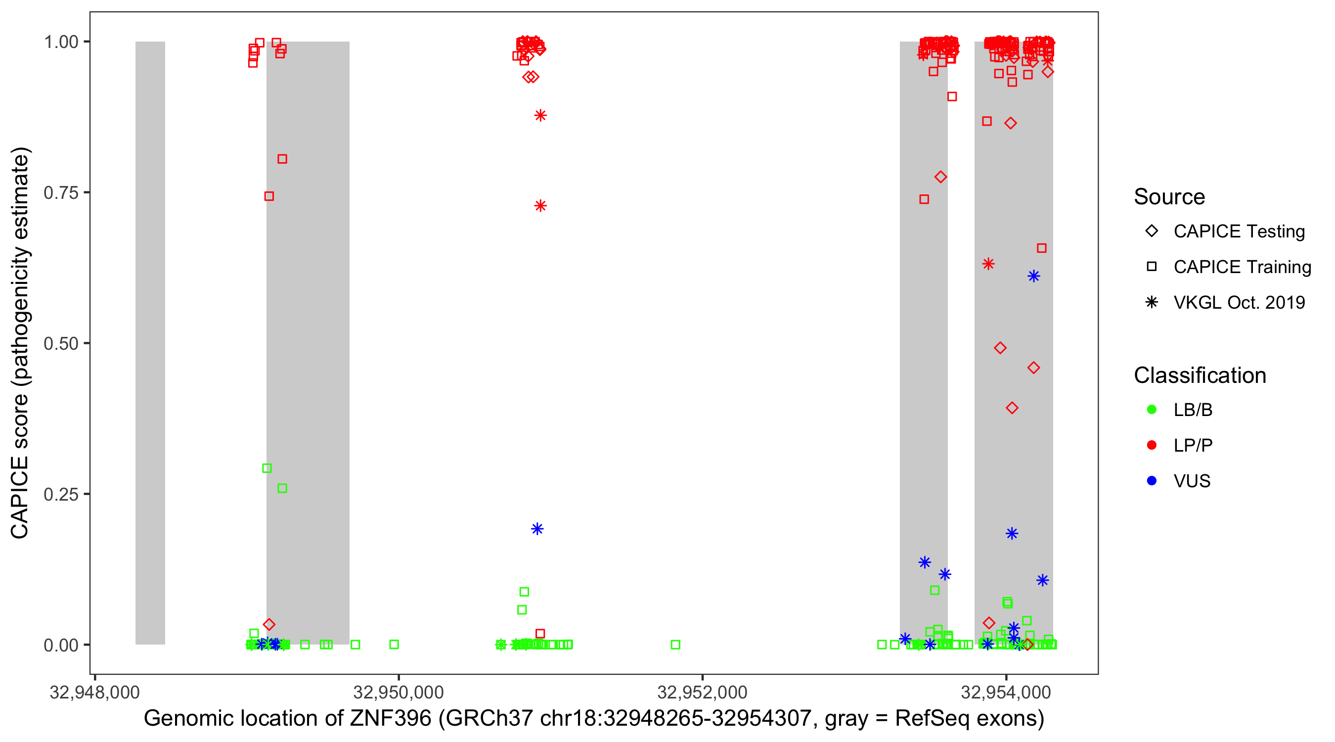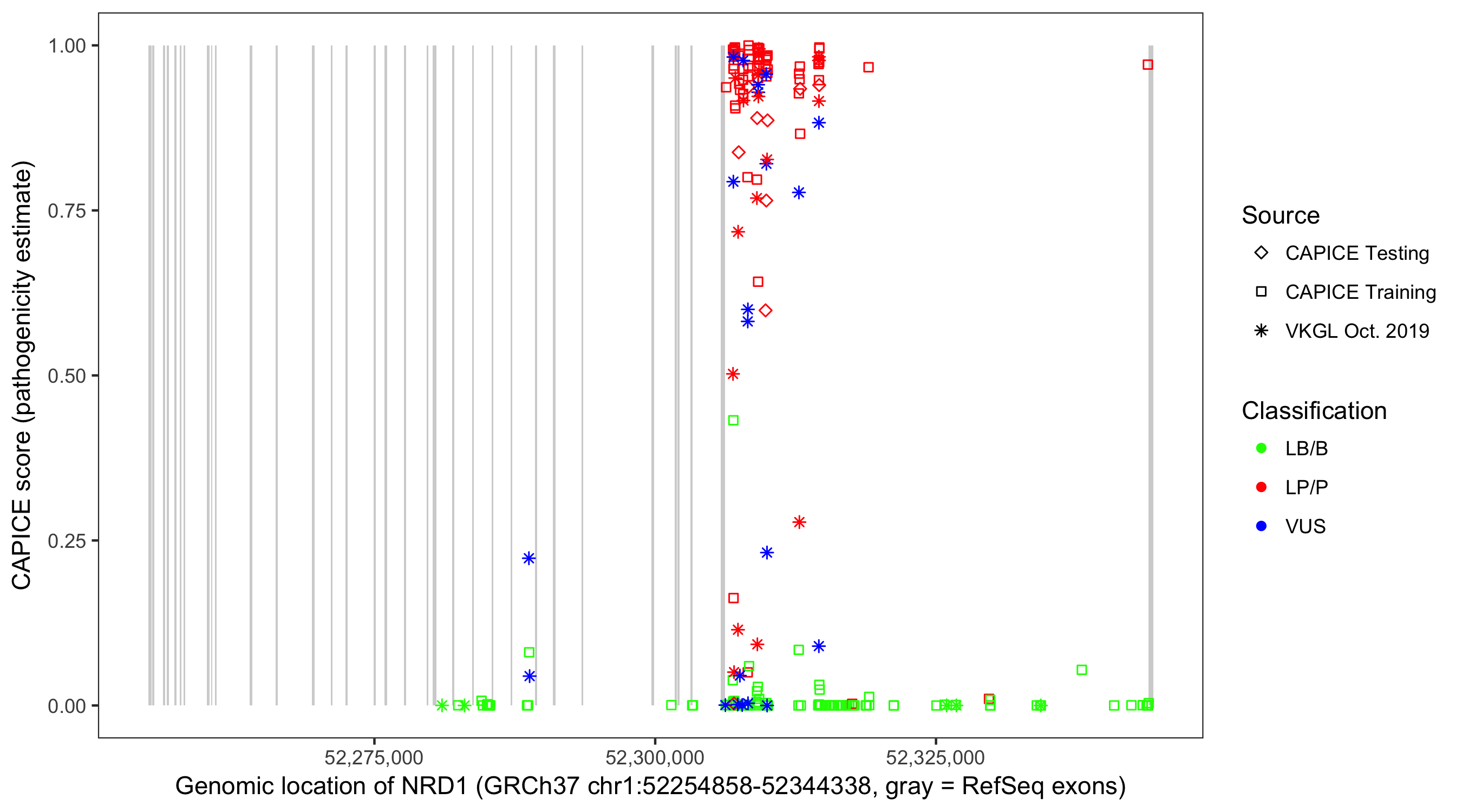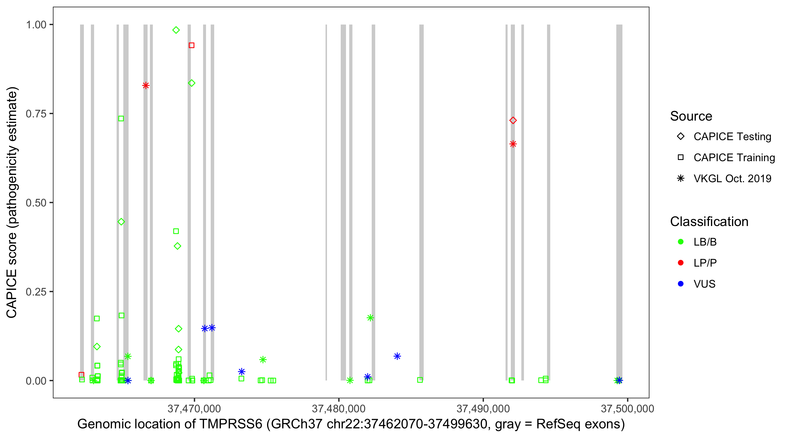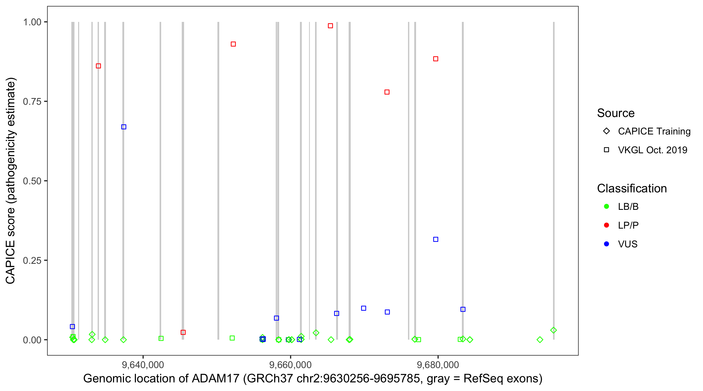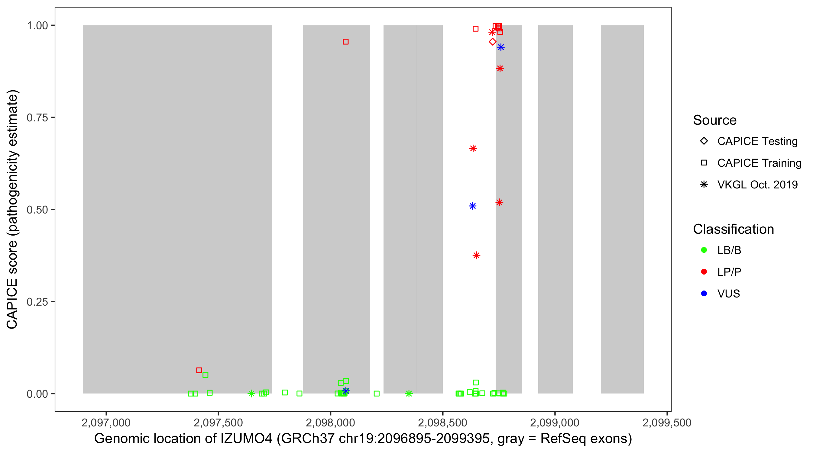 Shown are CAPICE train/test variants plus VKGL Oct 2019.