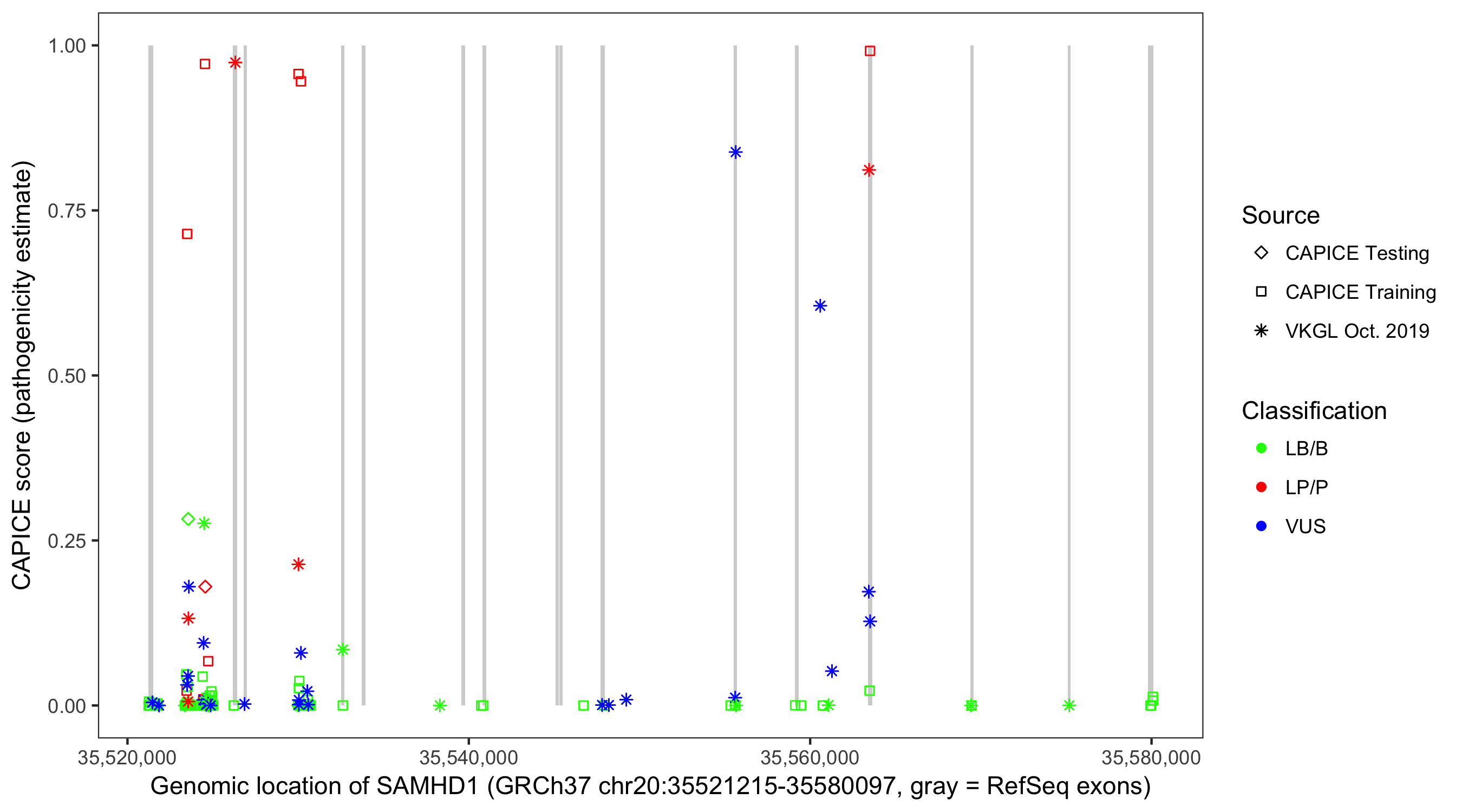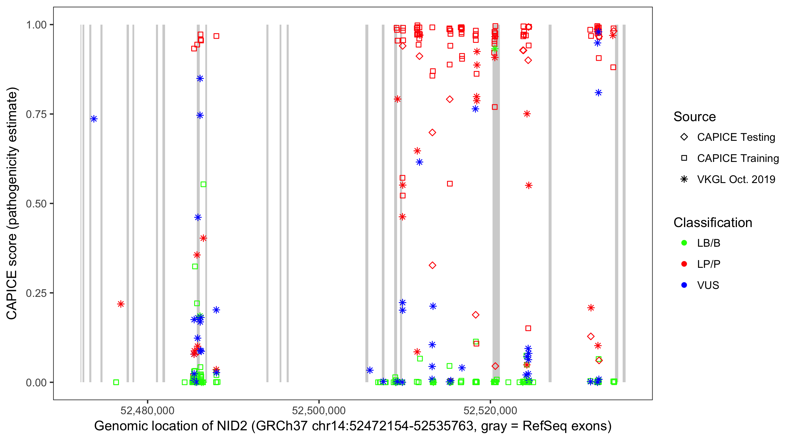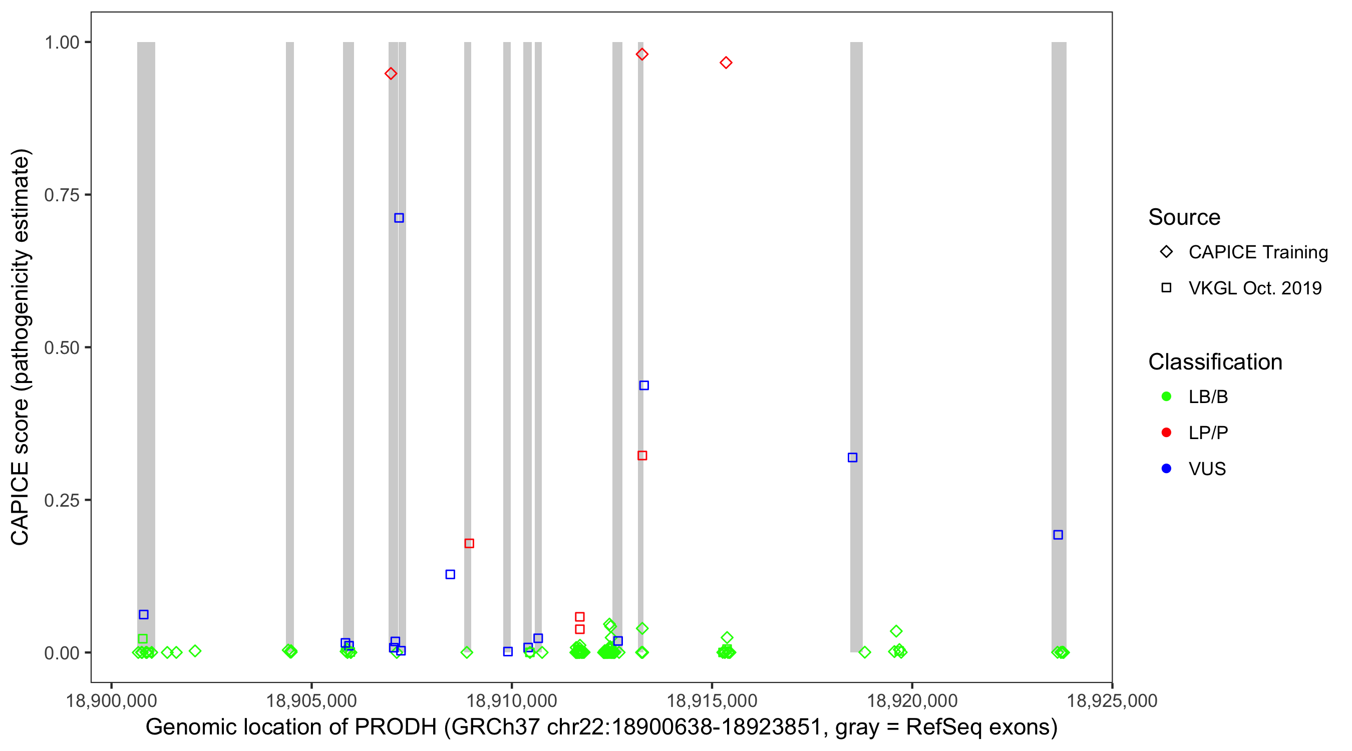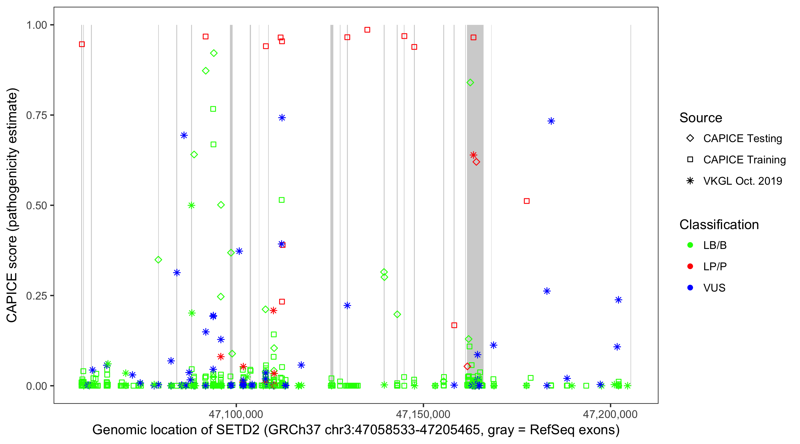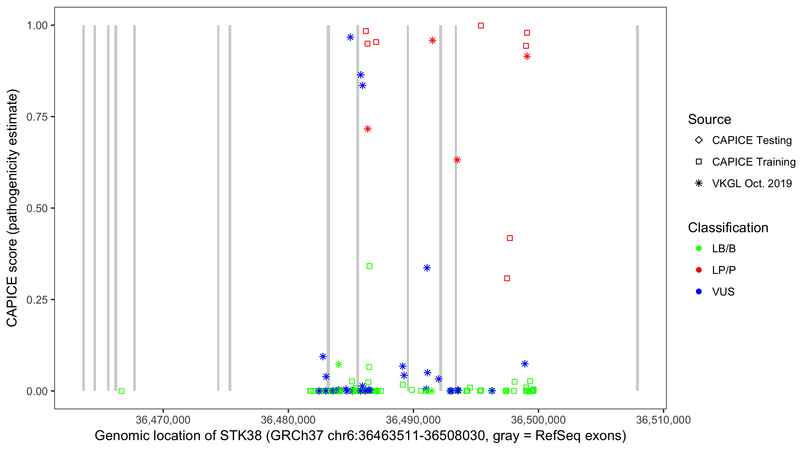 Shown are CAPICE train/test variants plus VKGL Oct 2019.