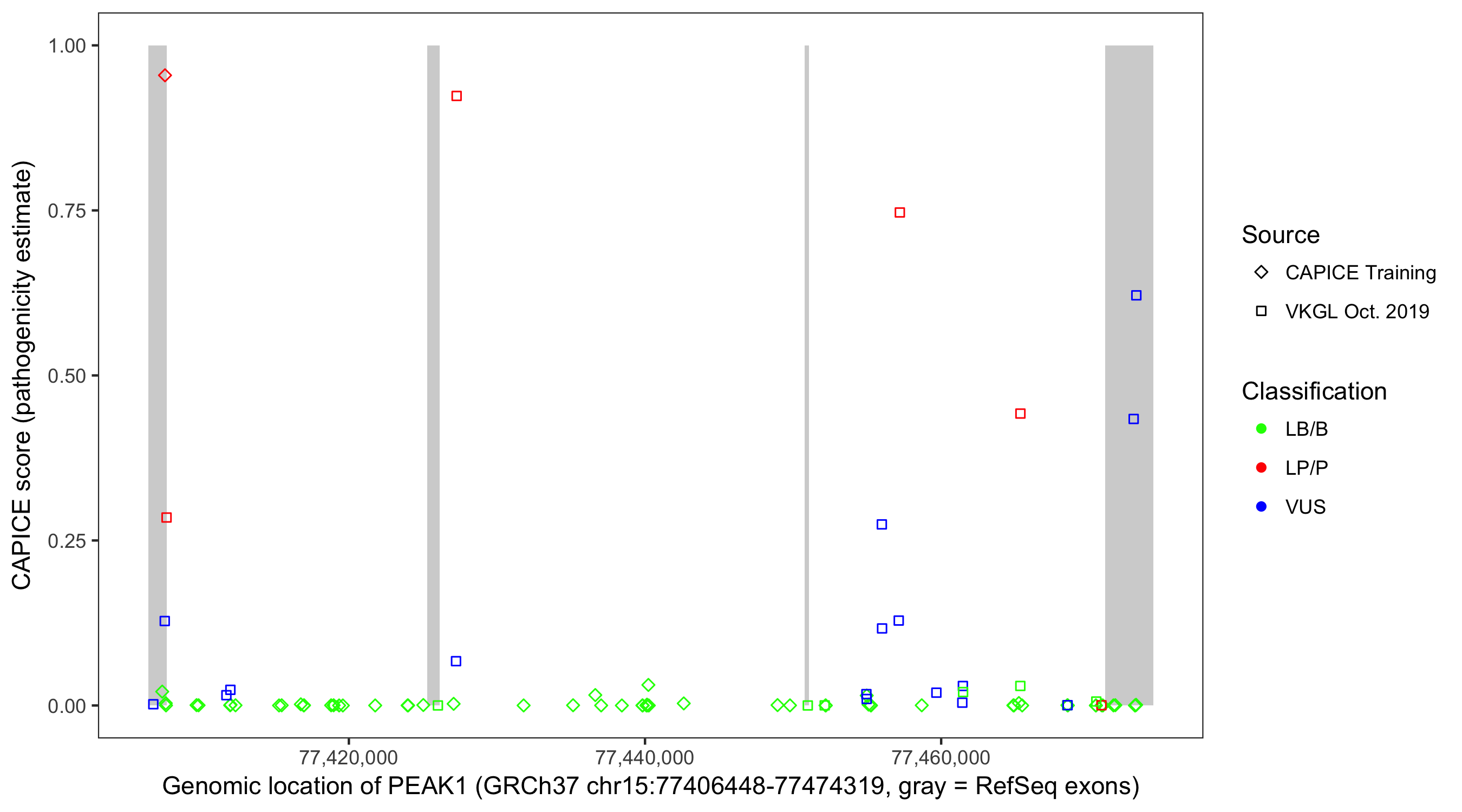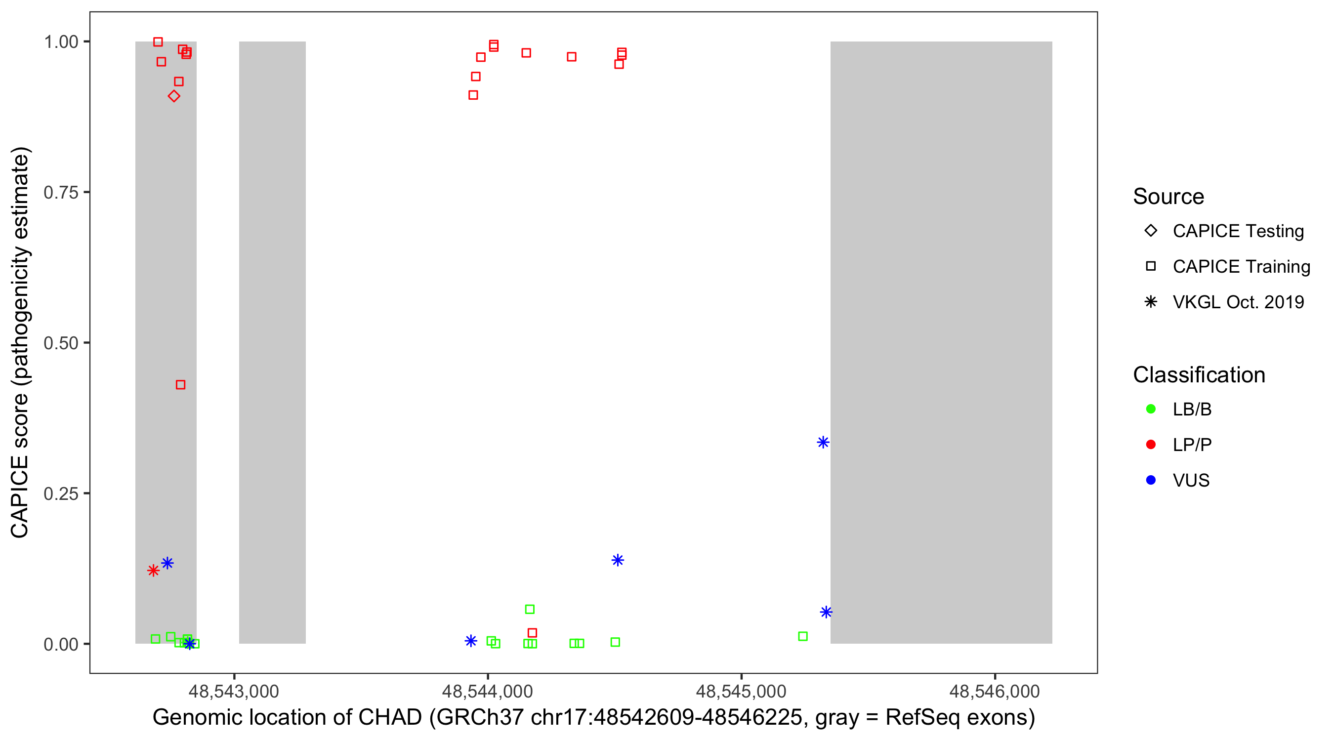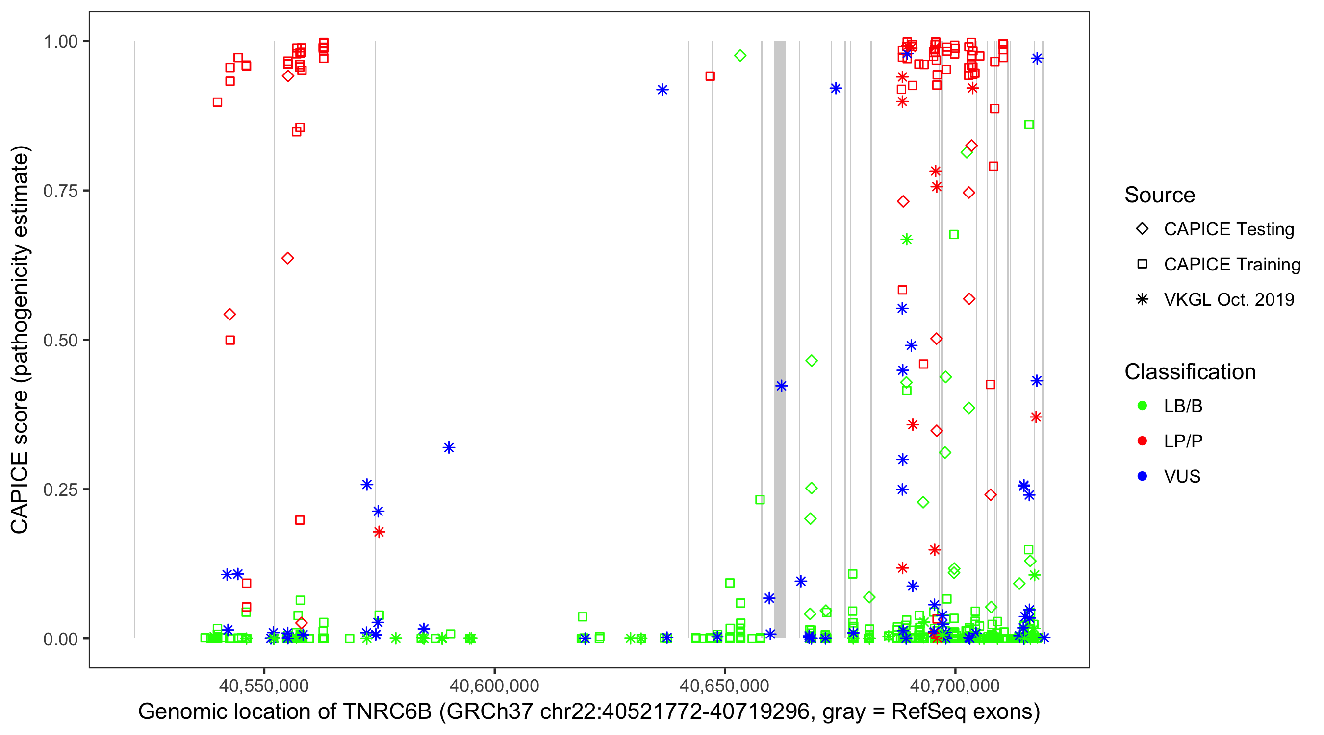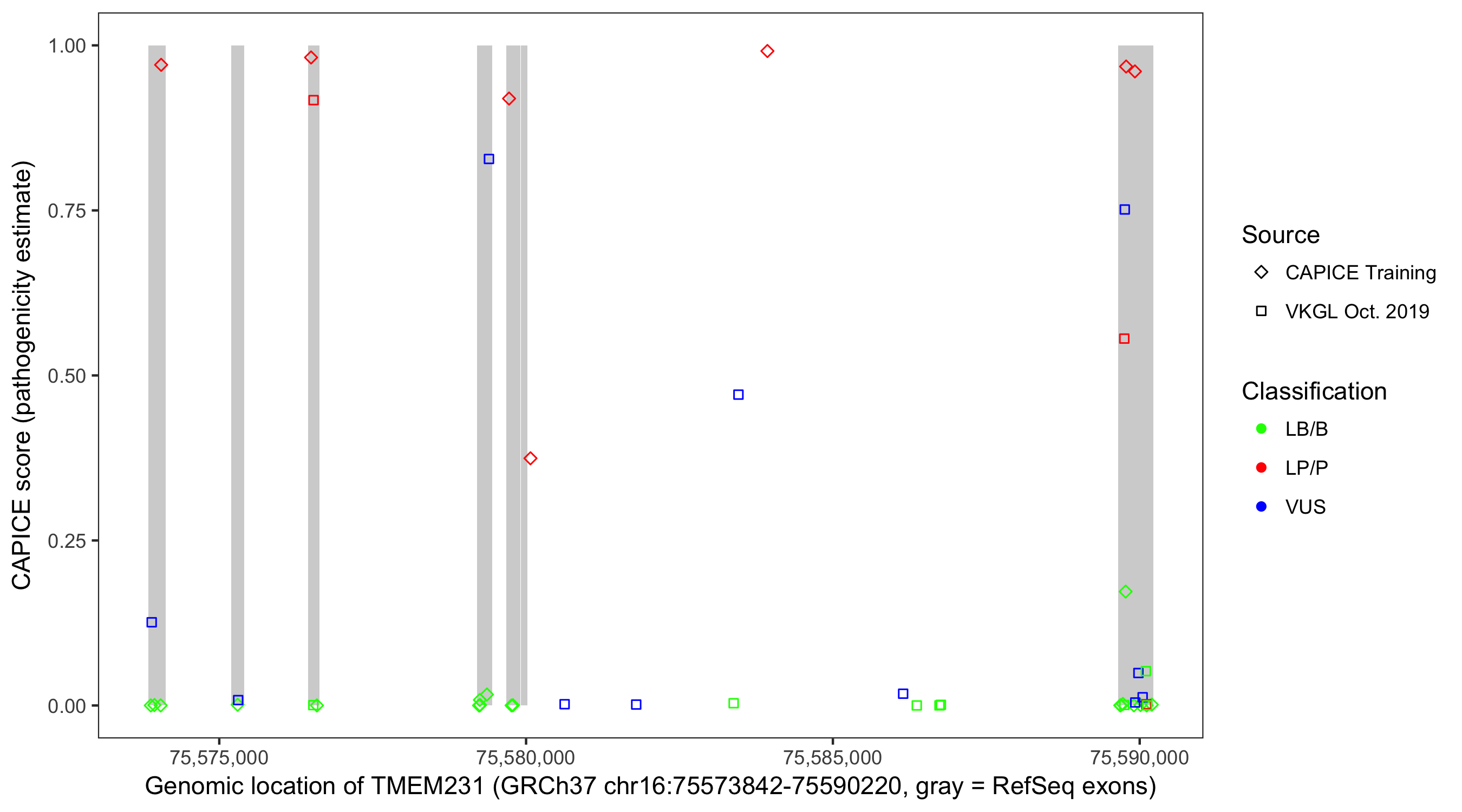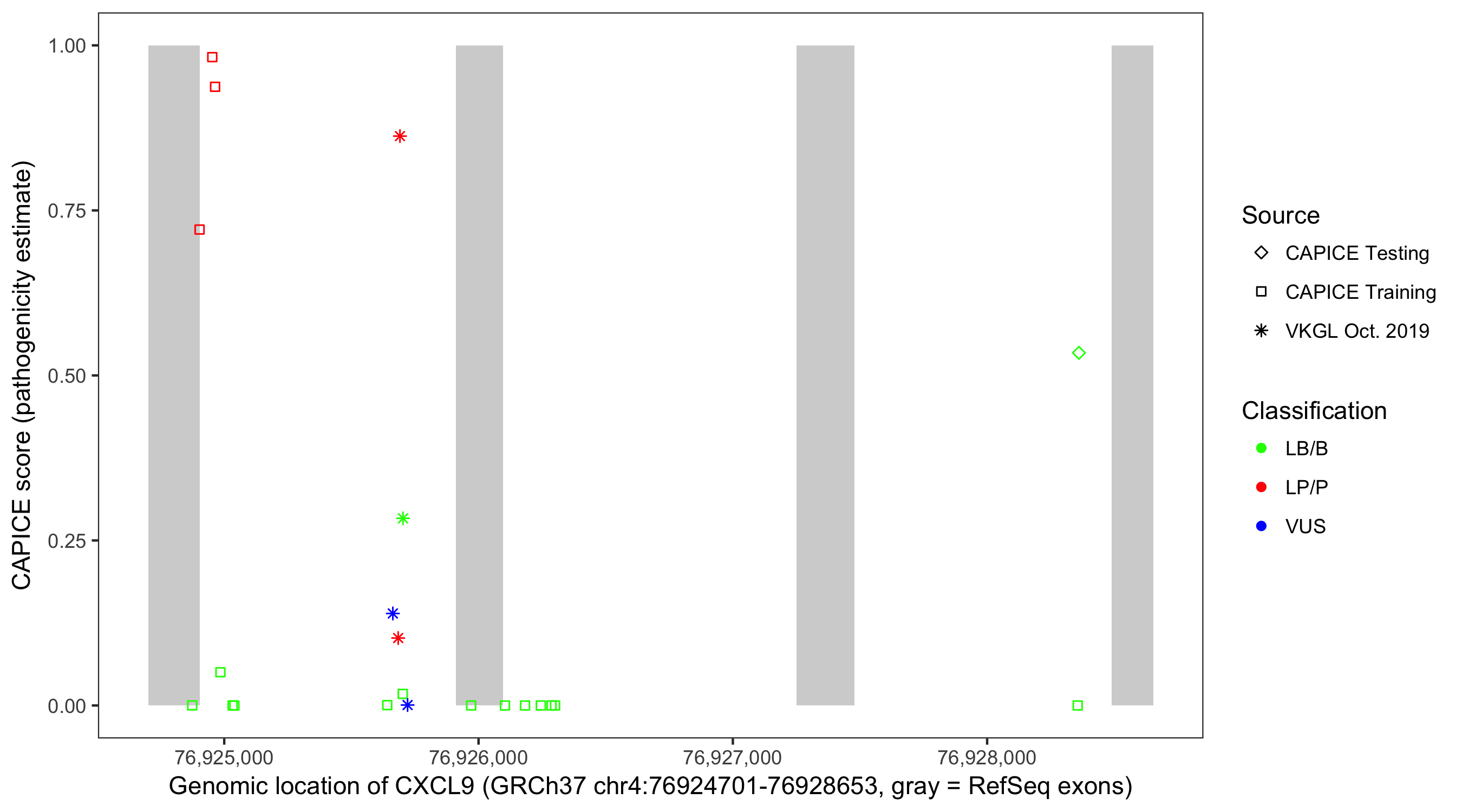 Shown are CAPICE train/test variants plus VKGL Oct 2019.