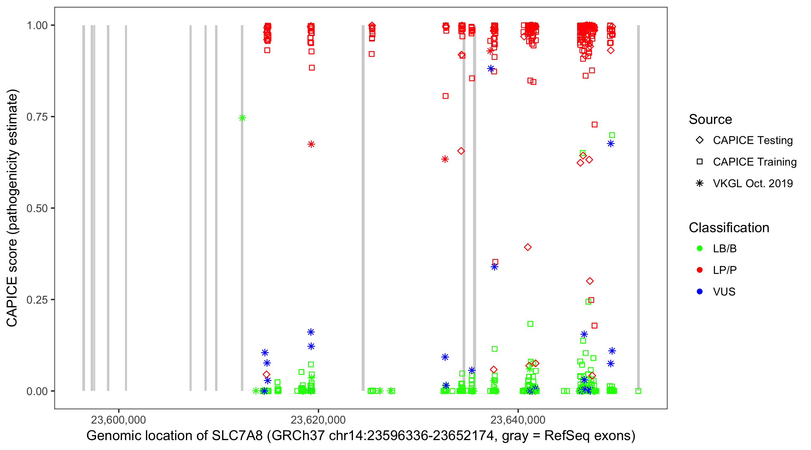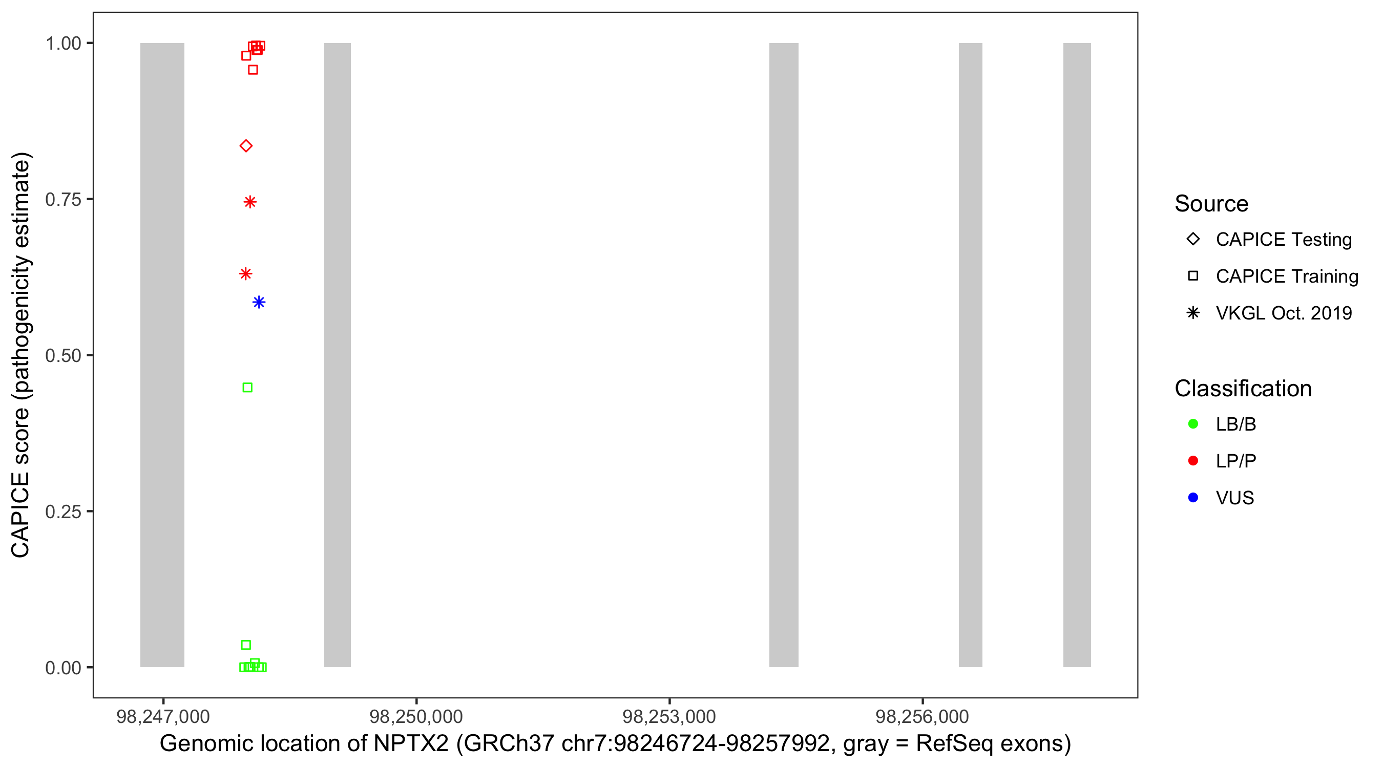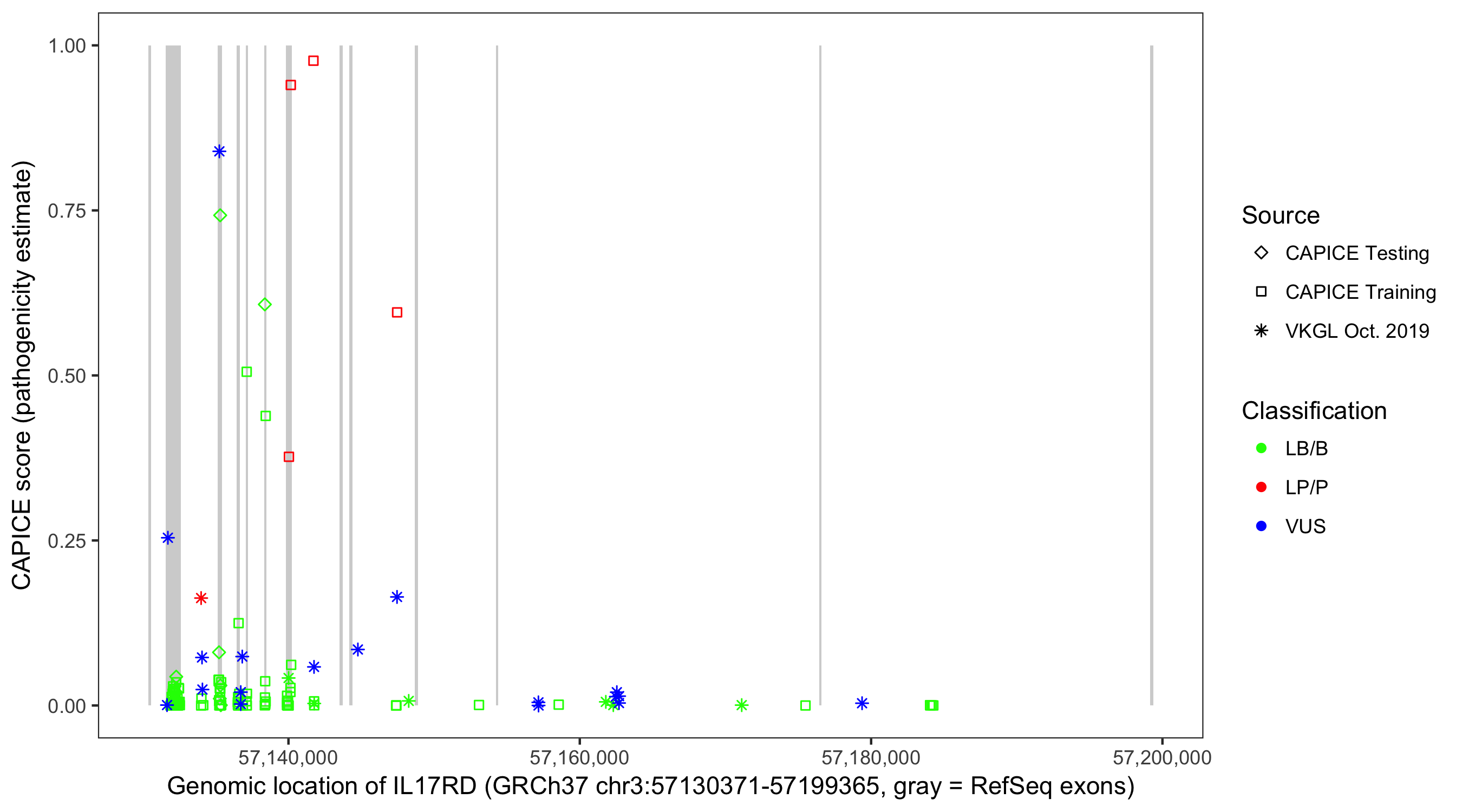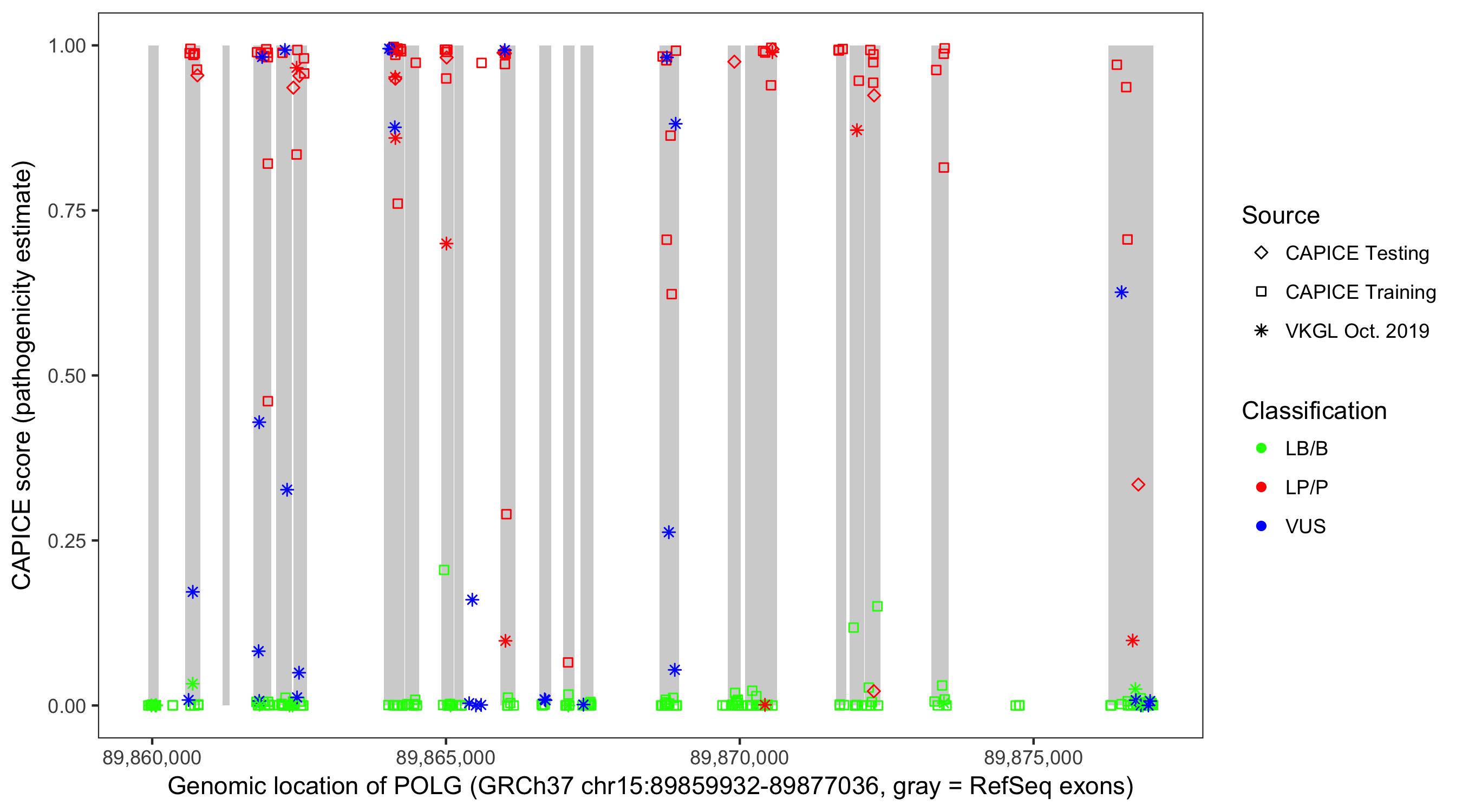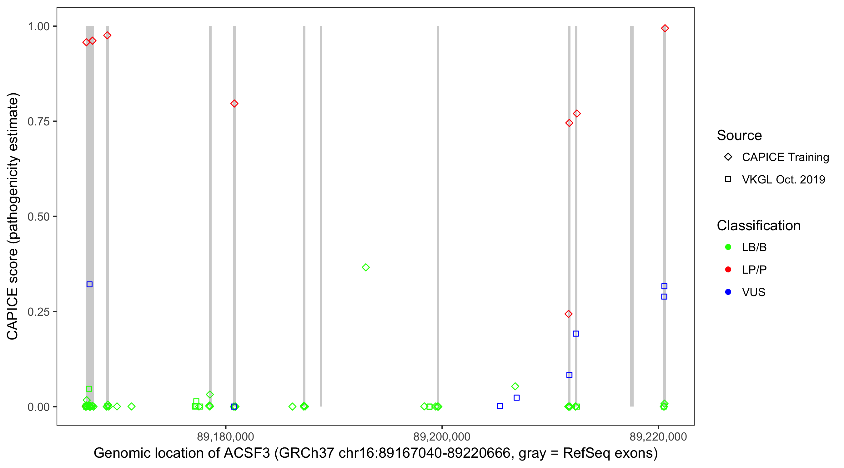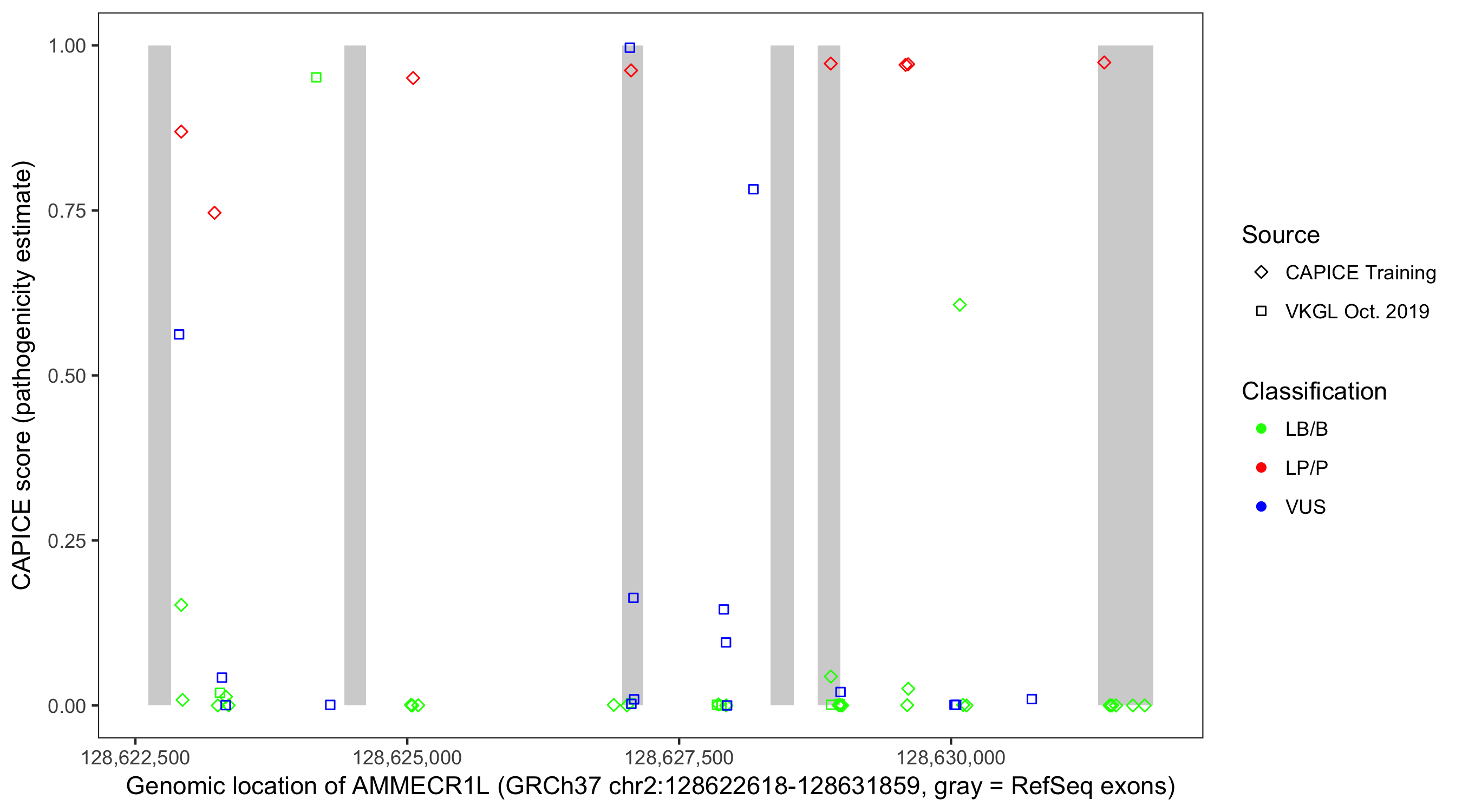 Shown are CAPICE train/test variants plus VKGL Oct 2019.
