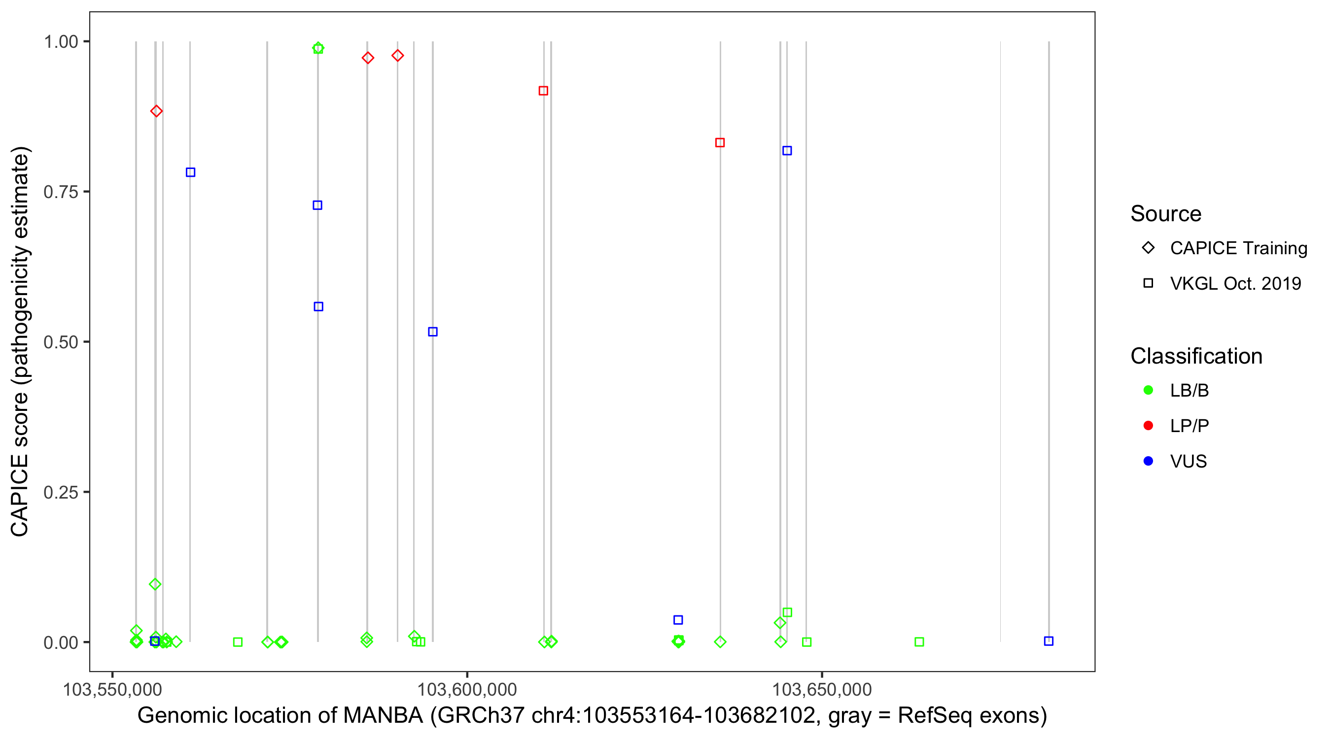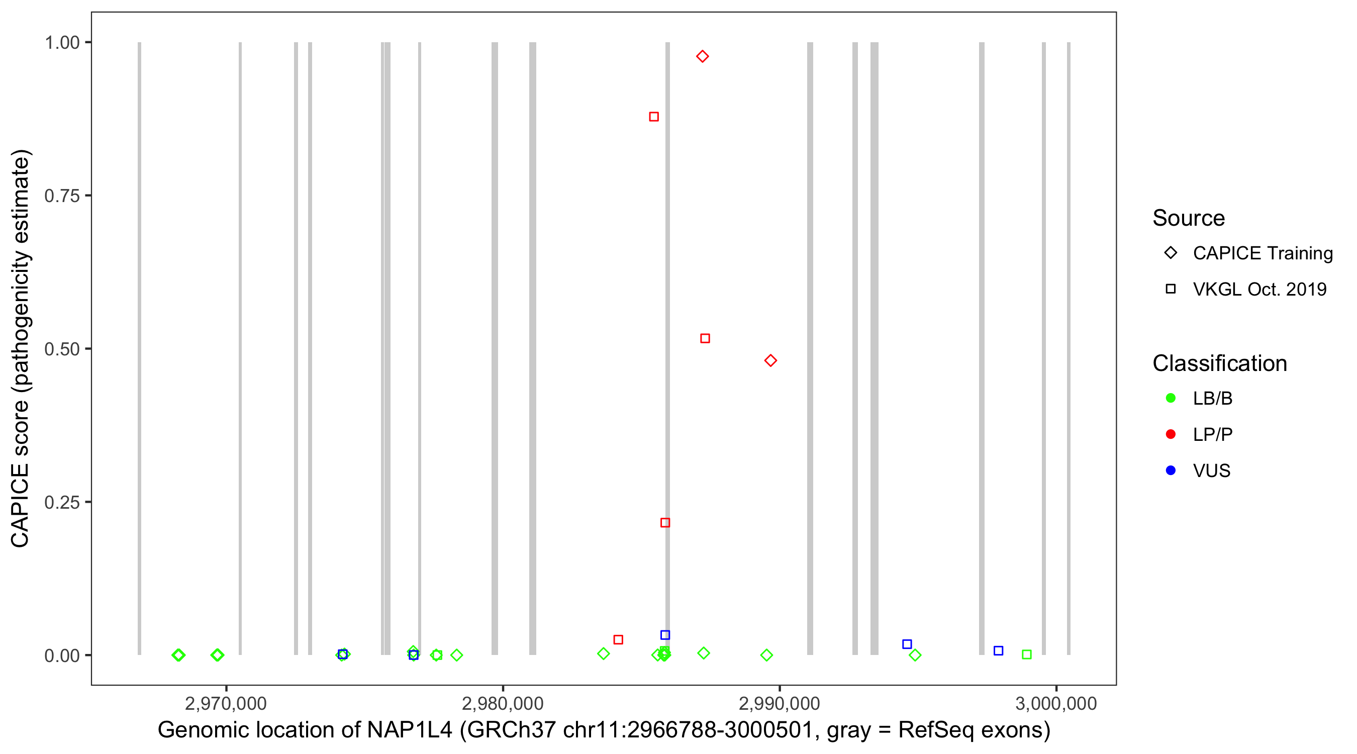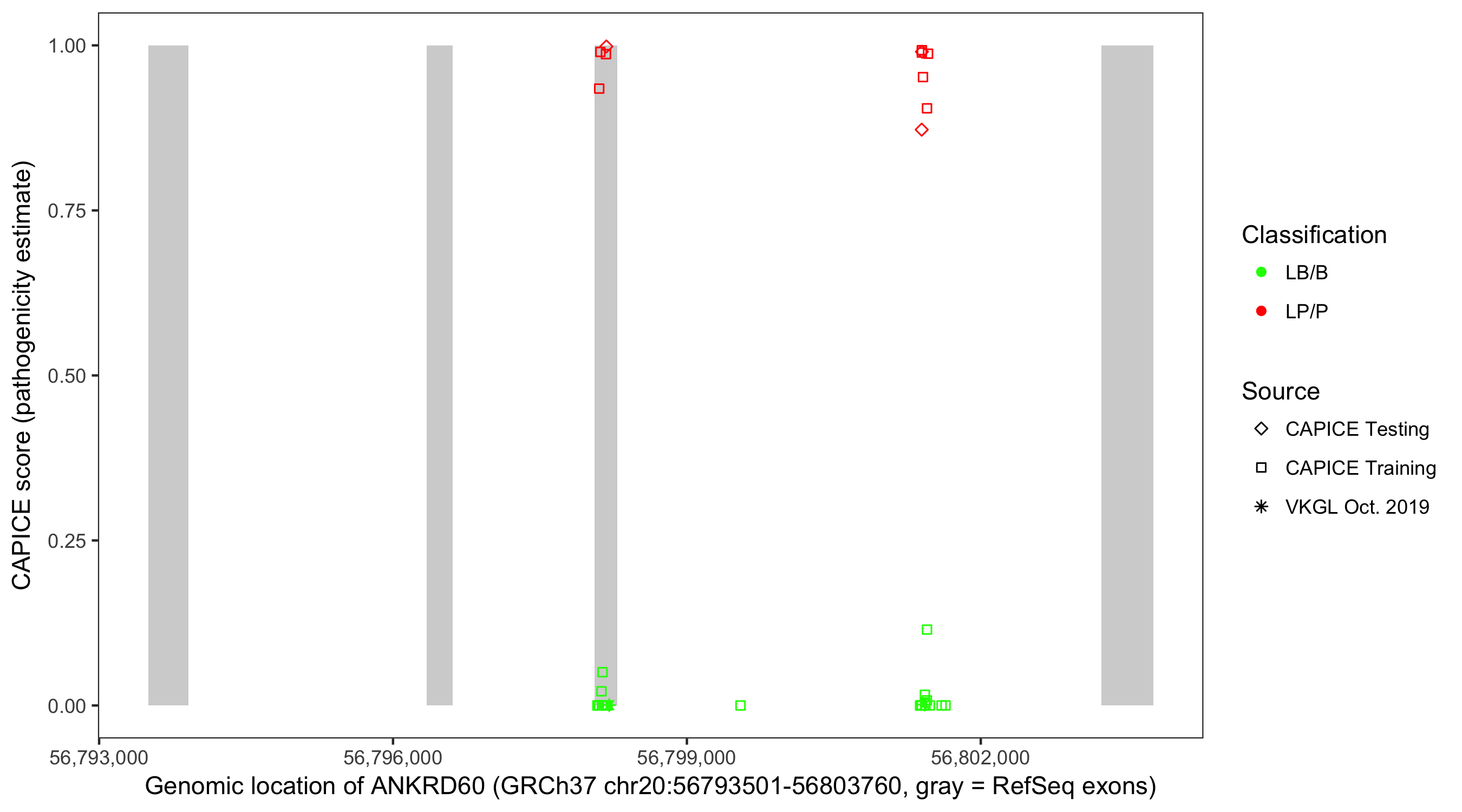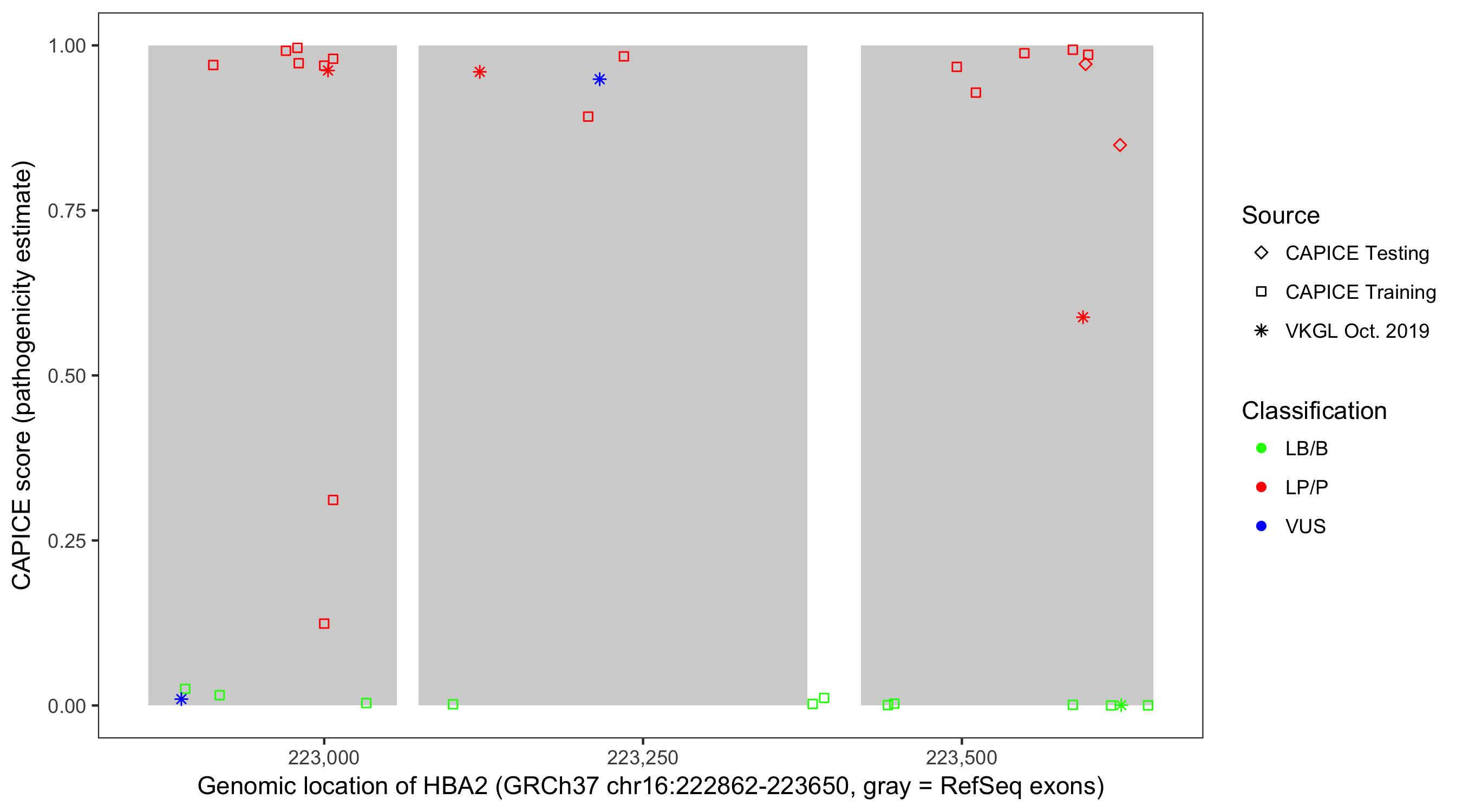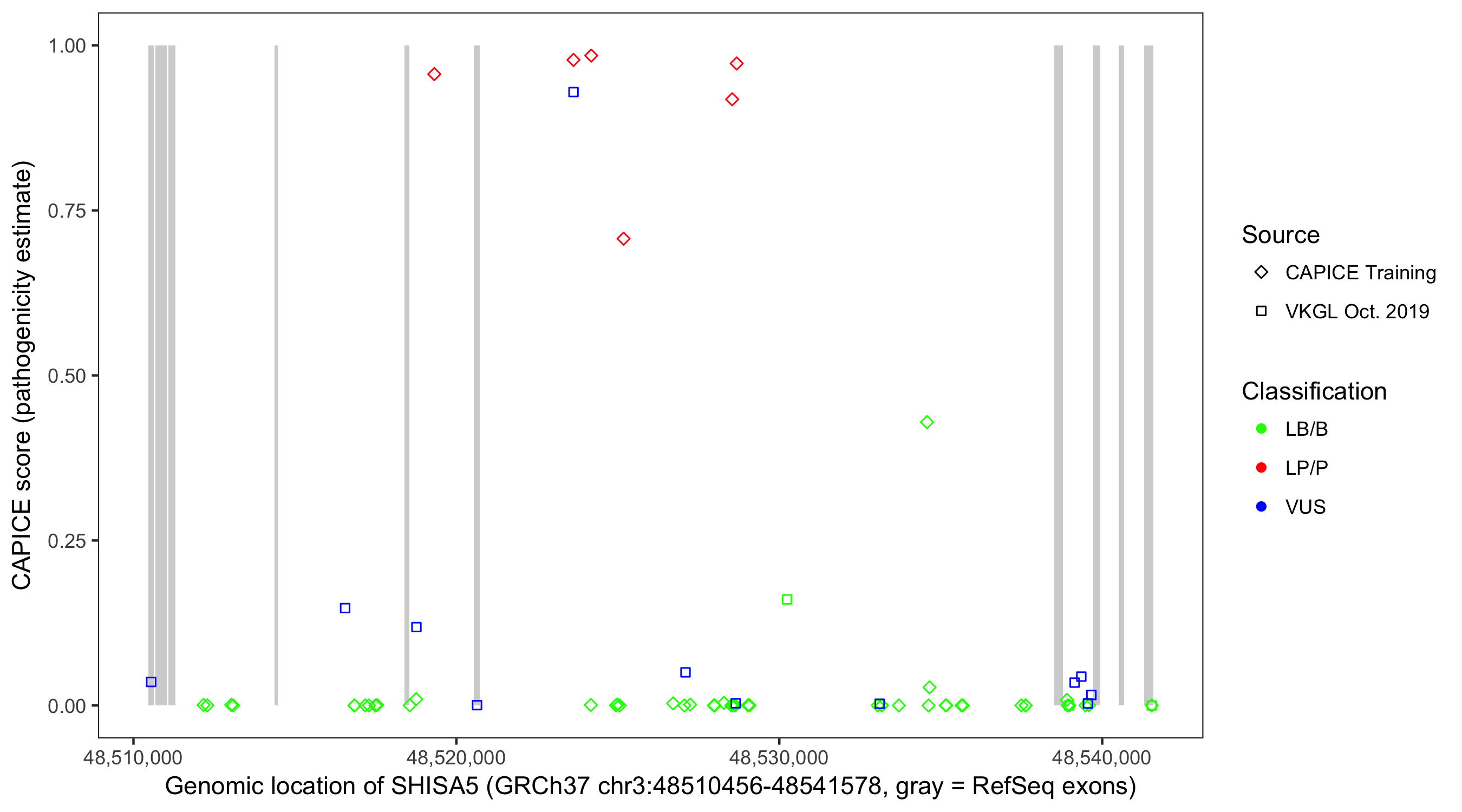 Shown are CAPICE train/test variants plus VKGL Oct 2019.