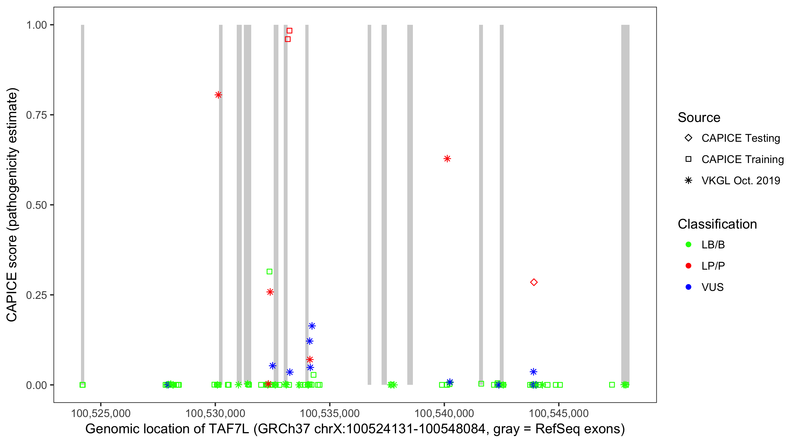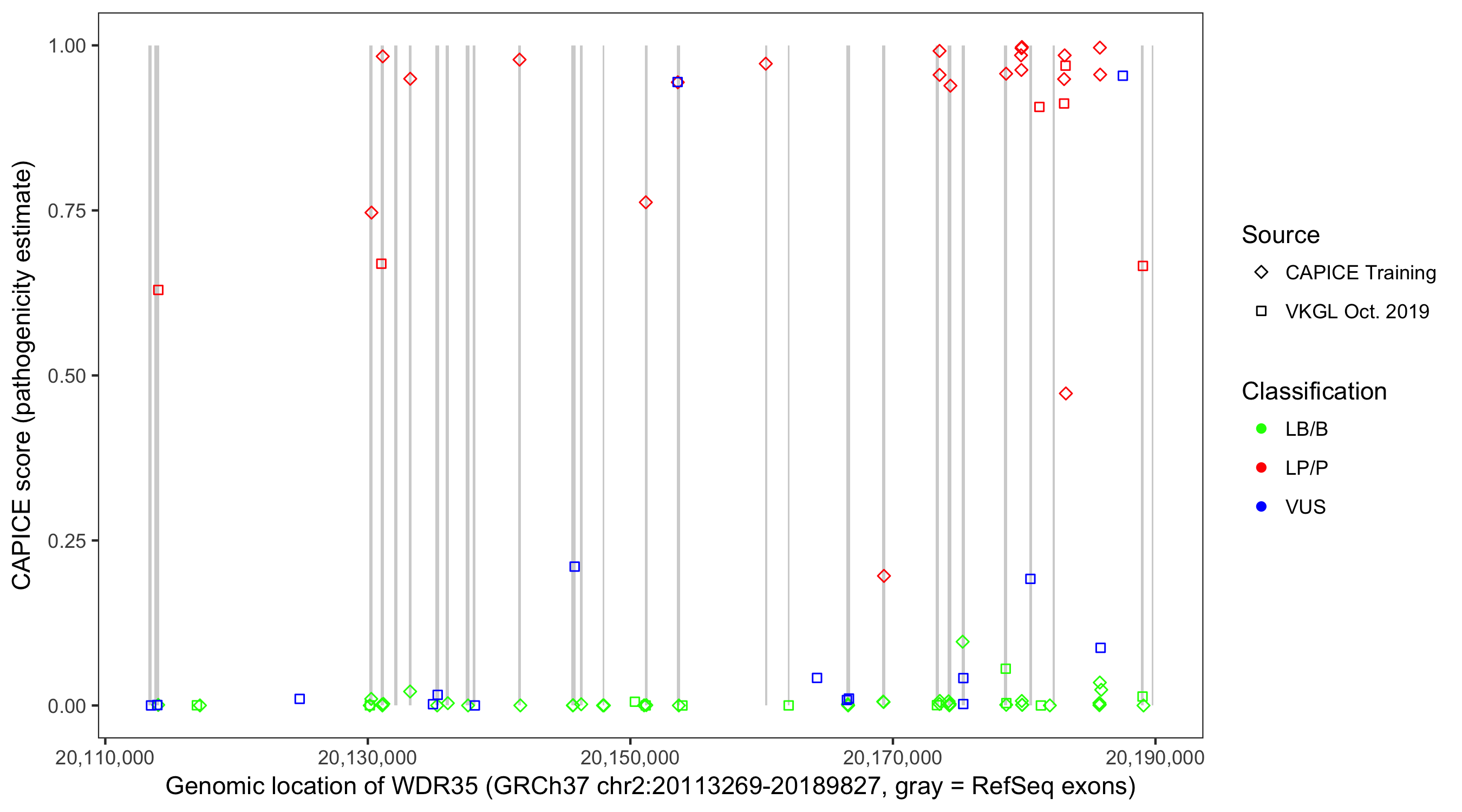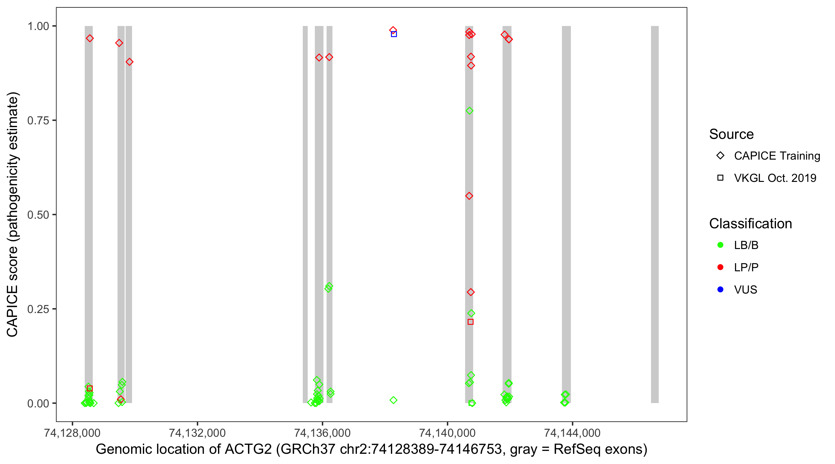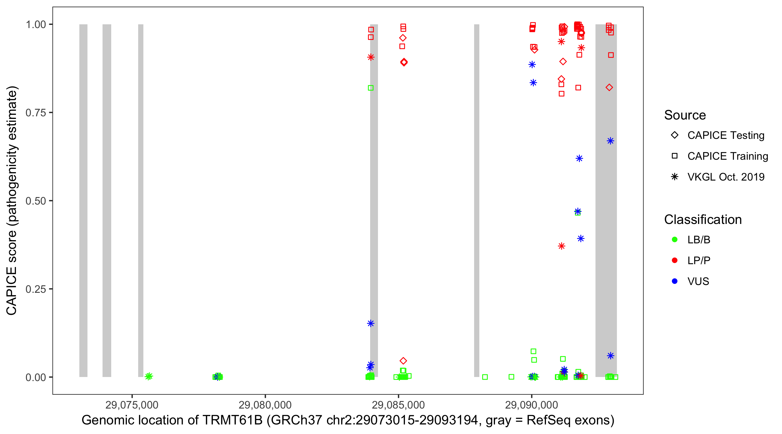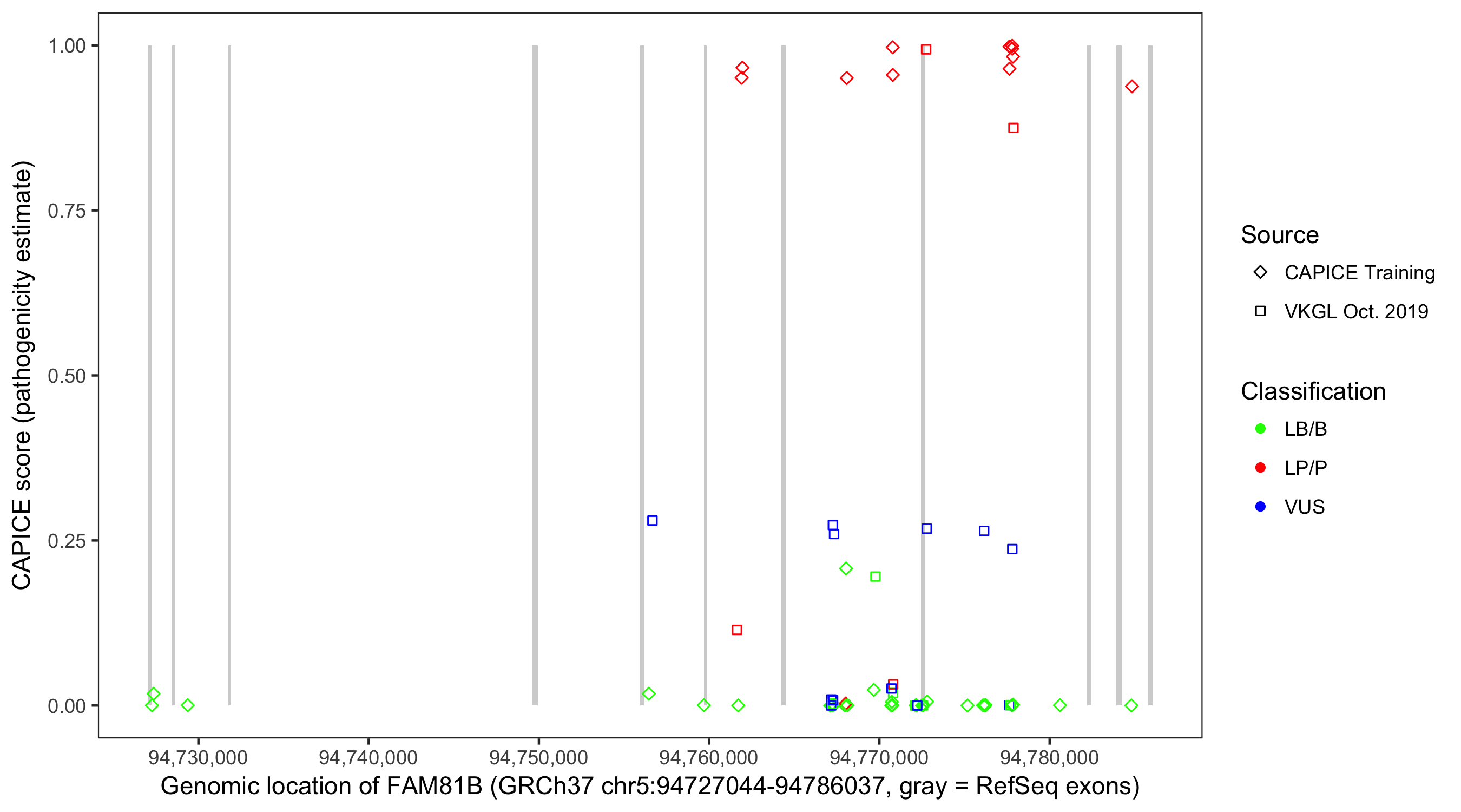 Shown are CAPICE train/test variants plus VKGL Oct 2019.