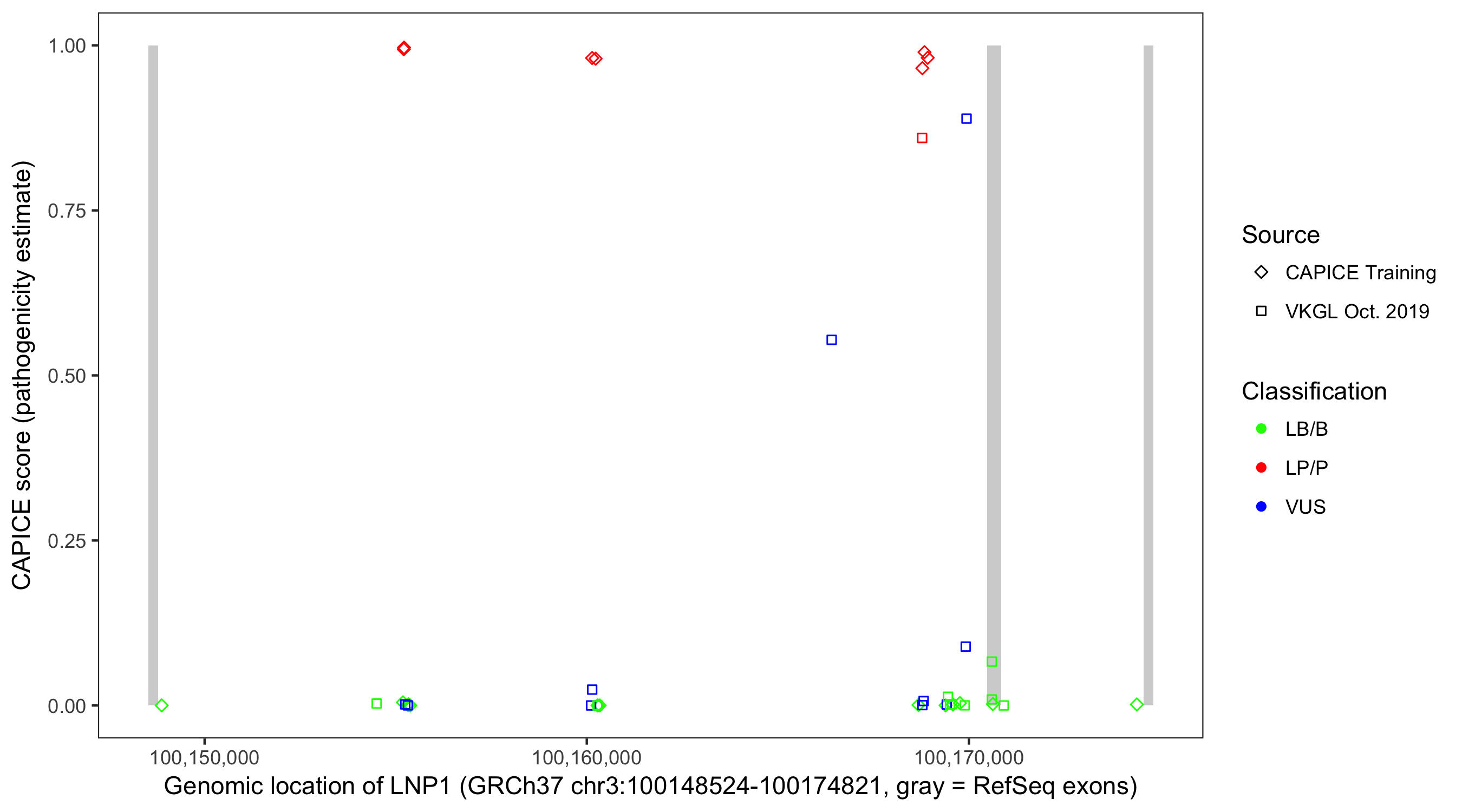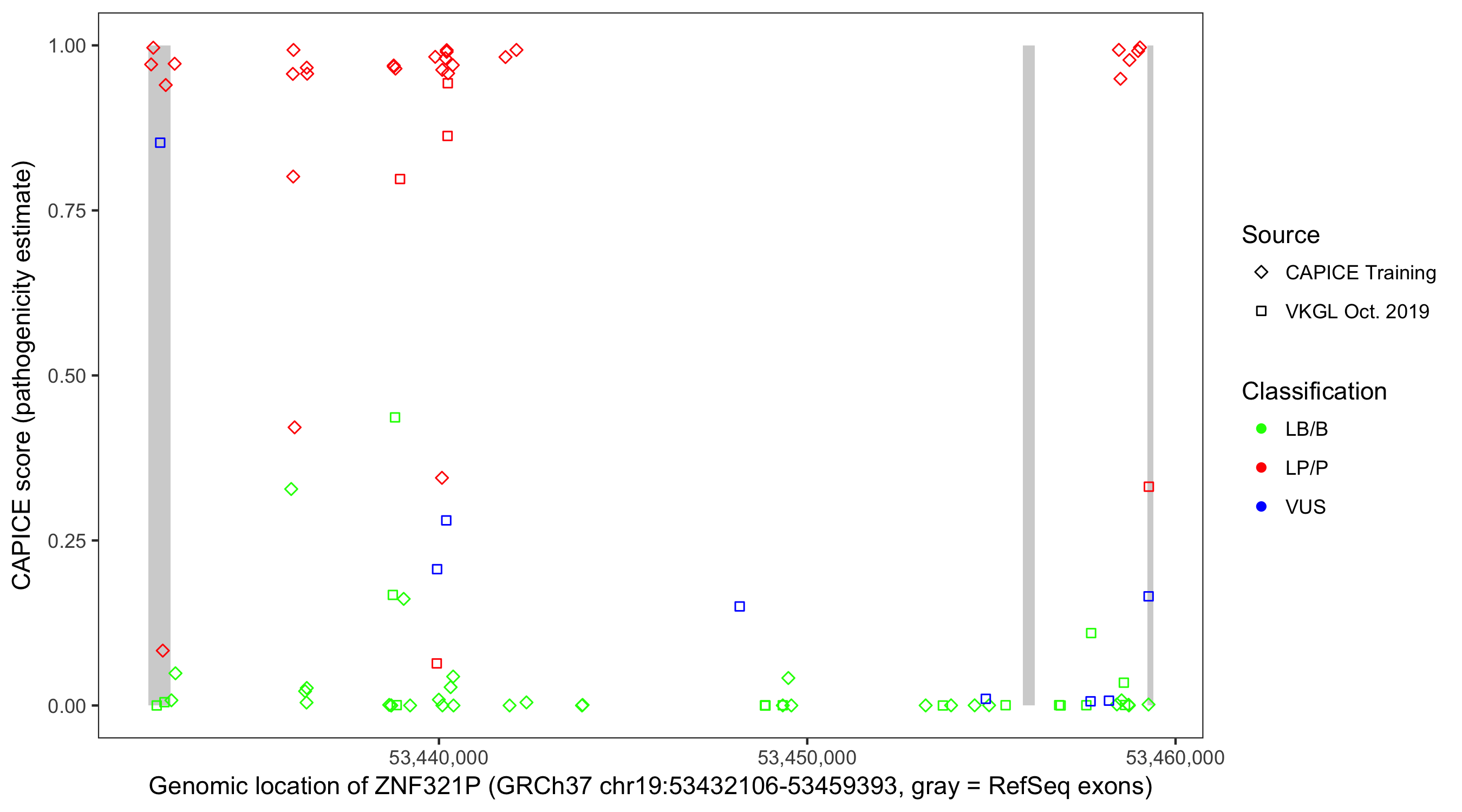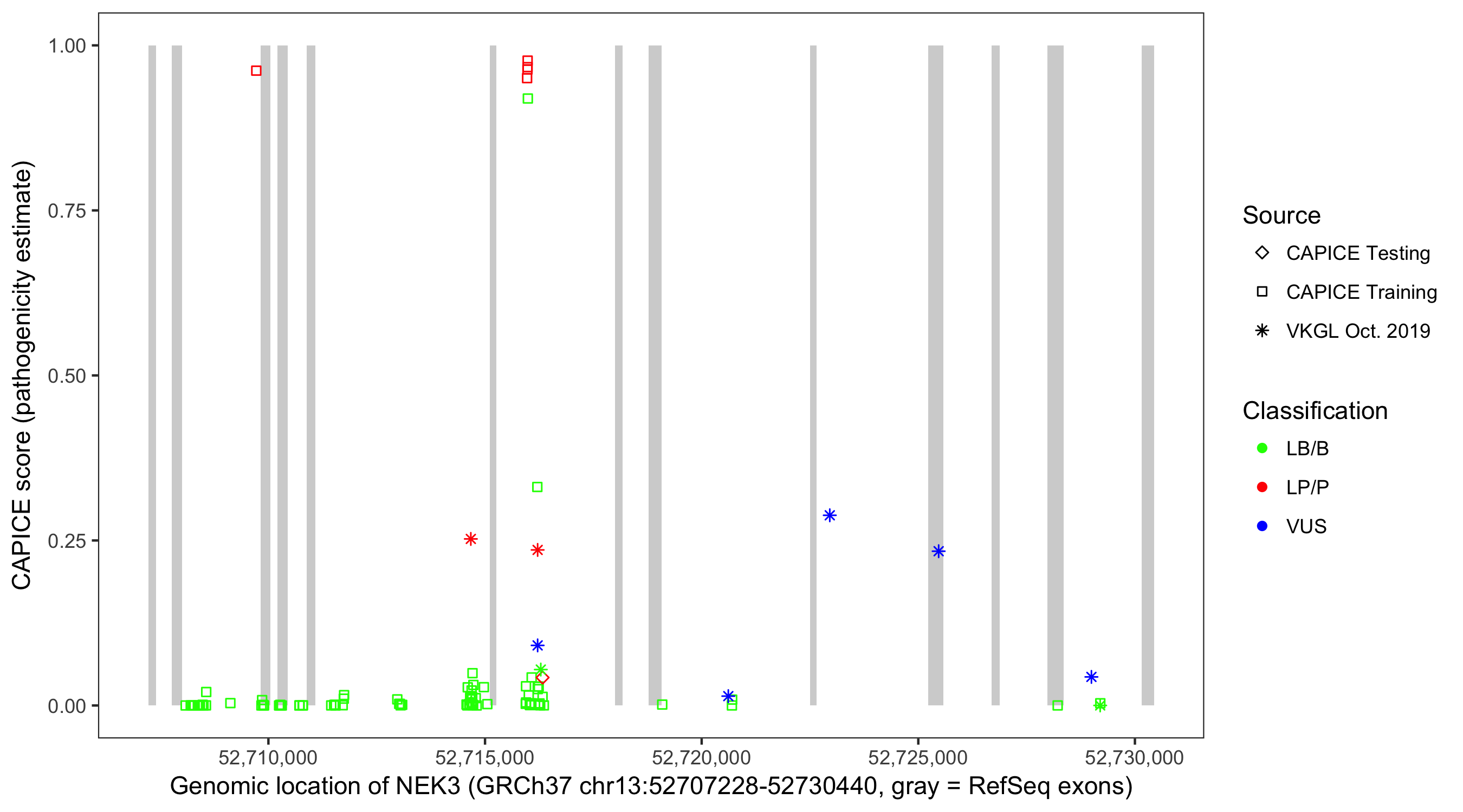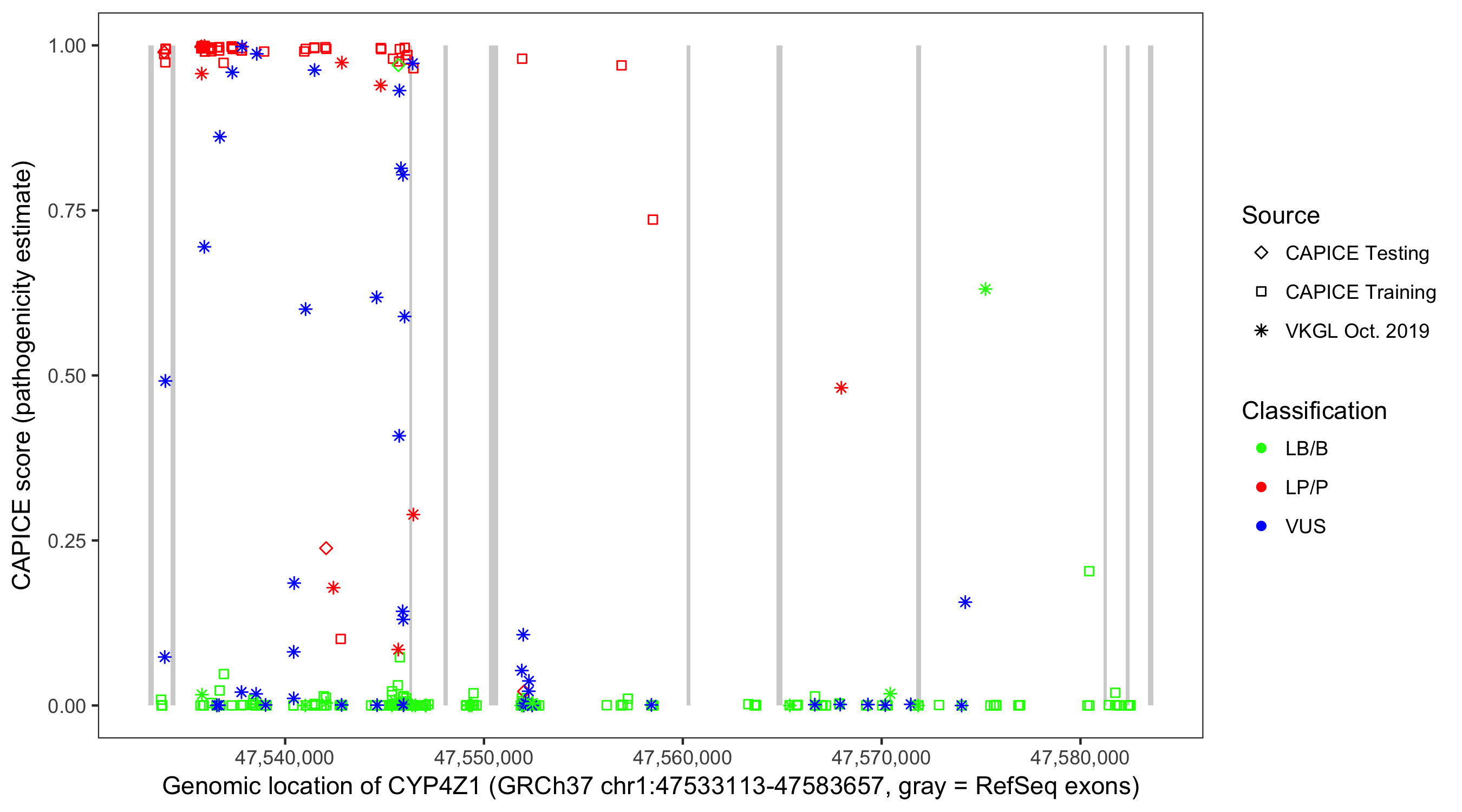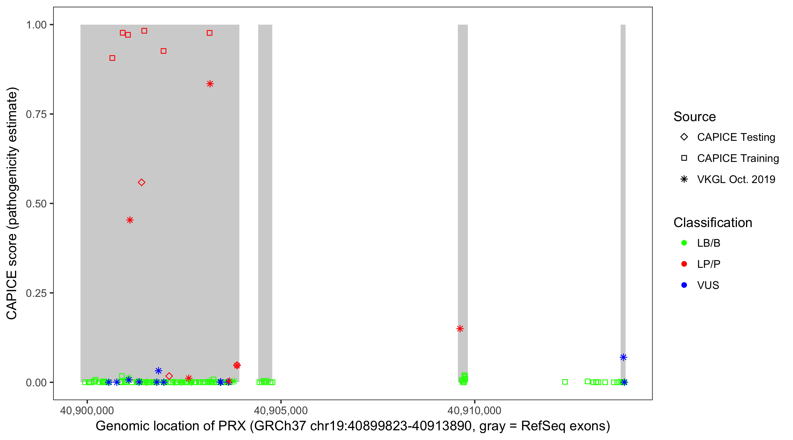 Shown are CAPICE train/test variants plus VKGL Oct 2019.