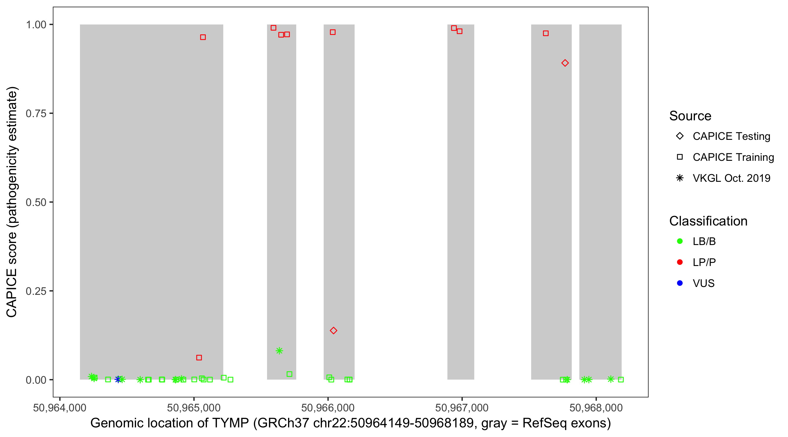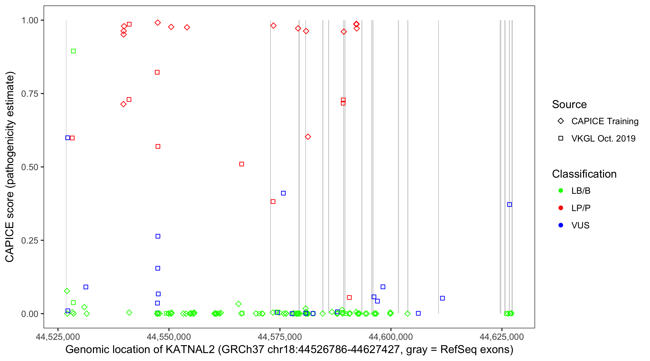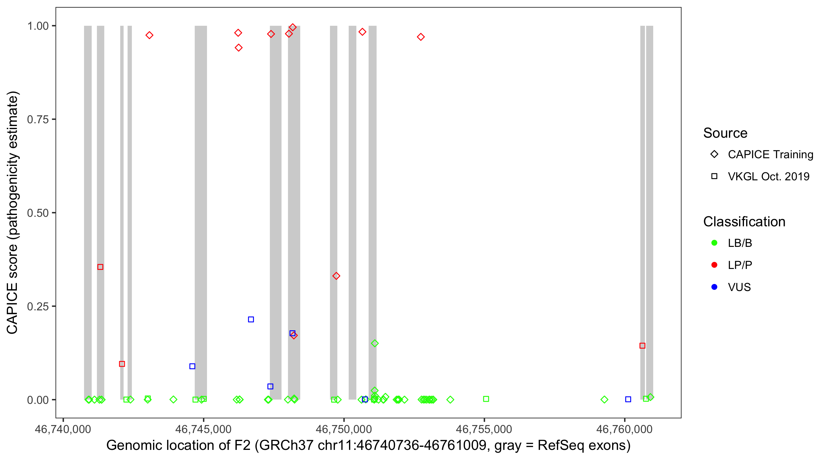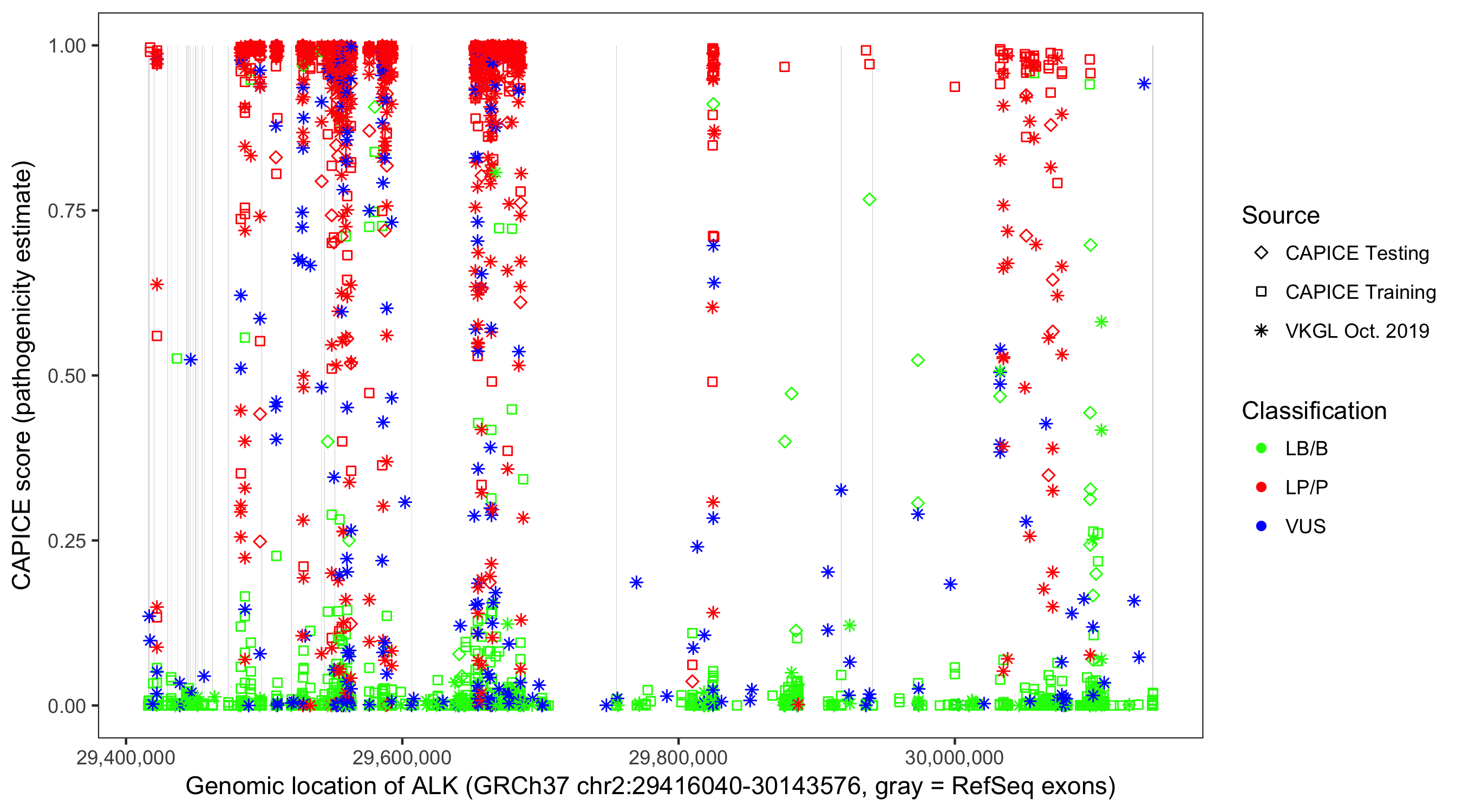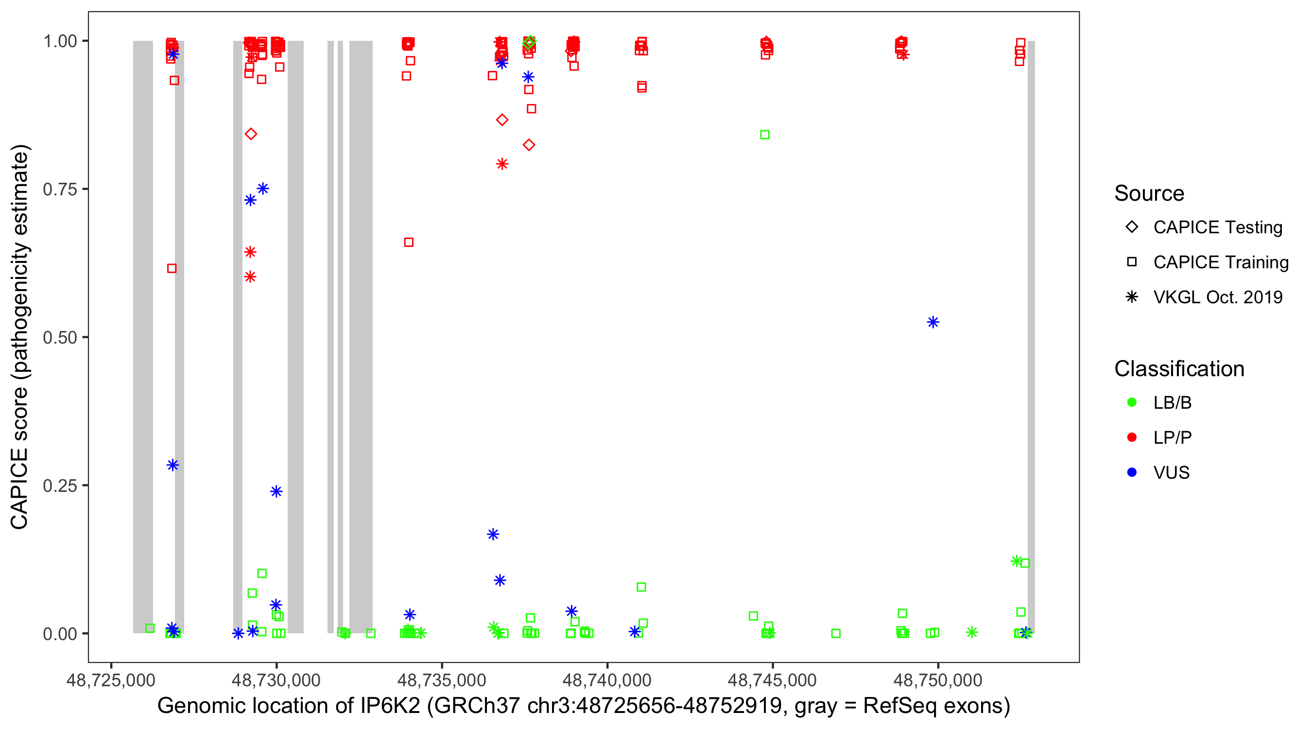 Shown are CAPICE train/test variants plus VKGL Oct 2019.
