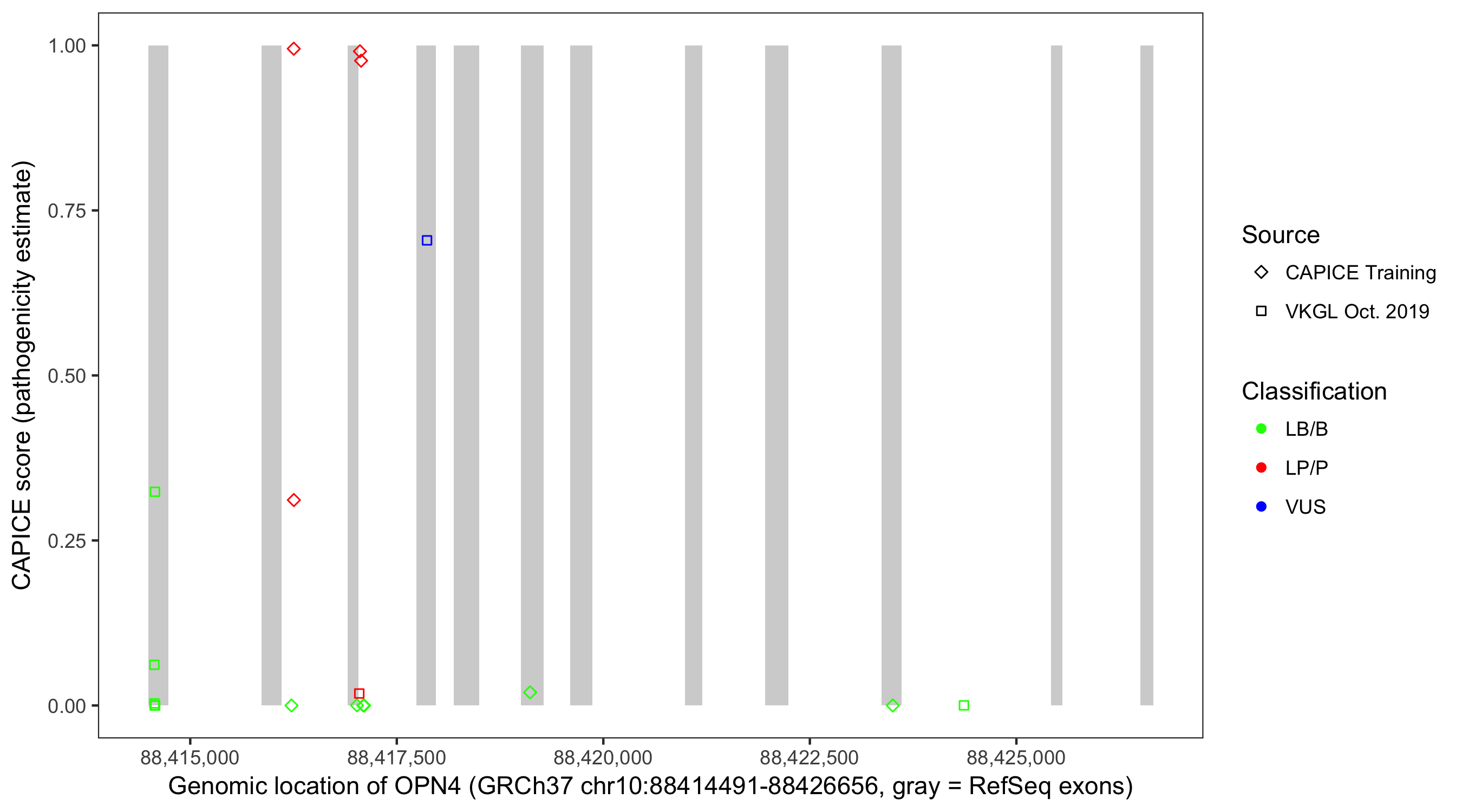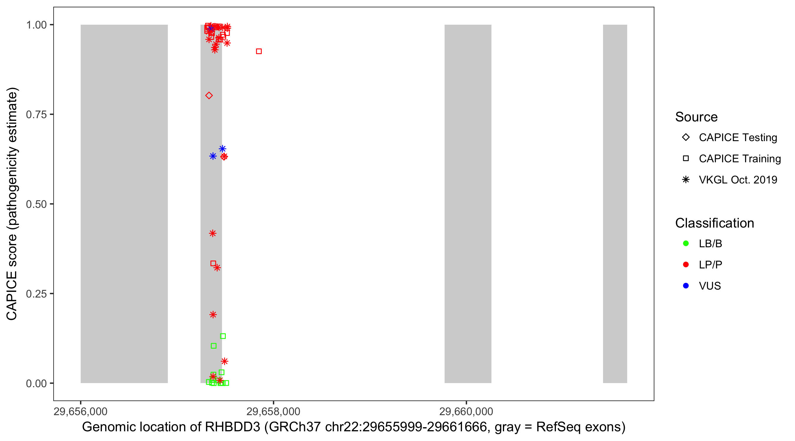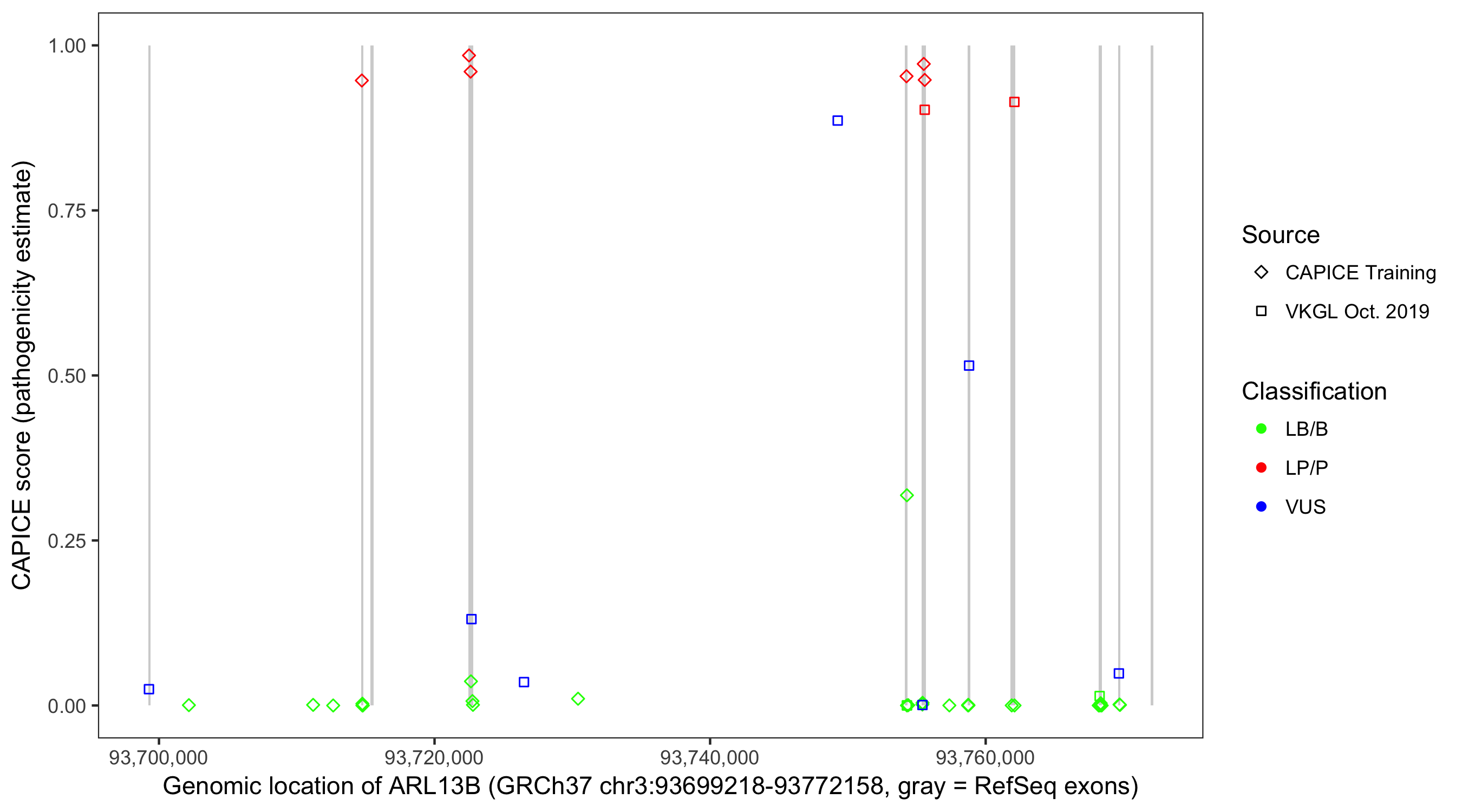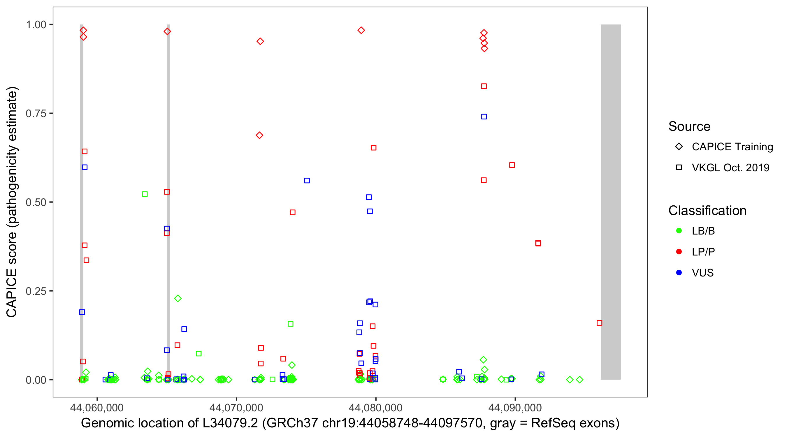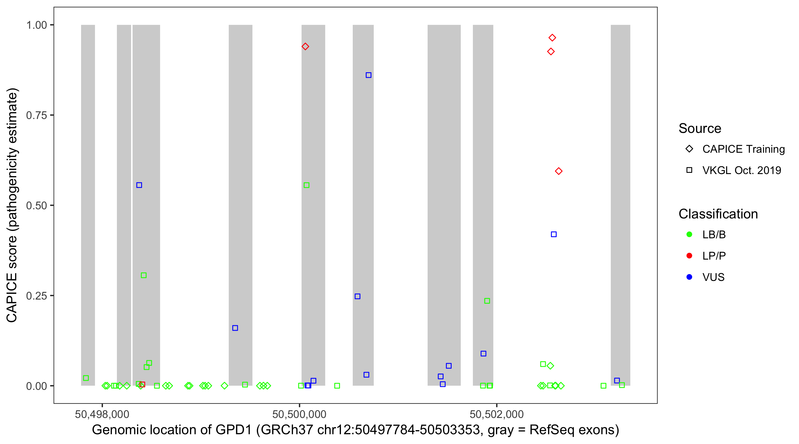 Shown are CAPICE train/test variants plus VKGL Oct 2019.
