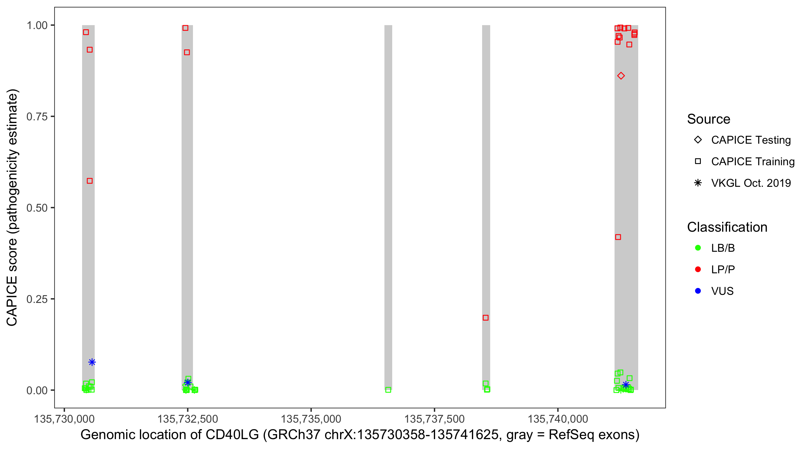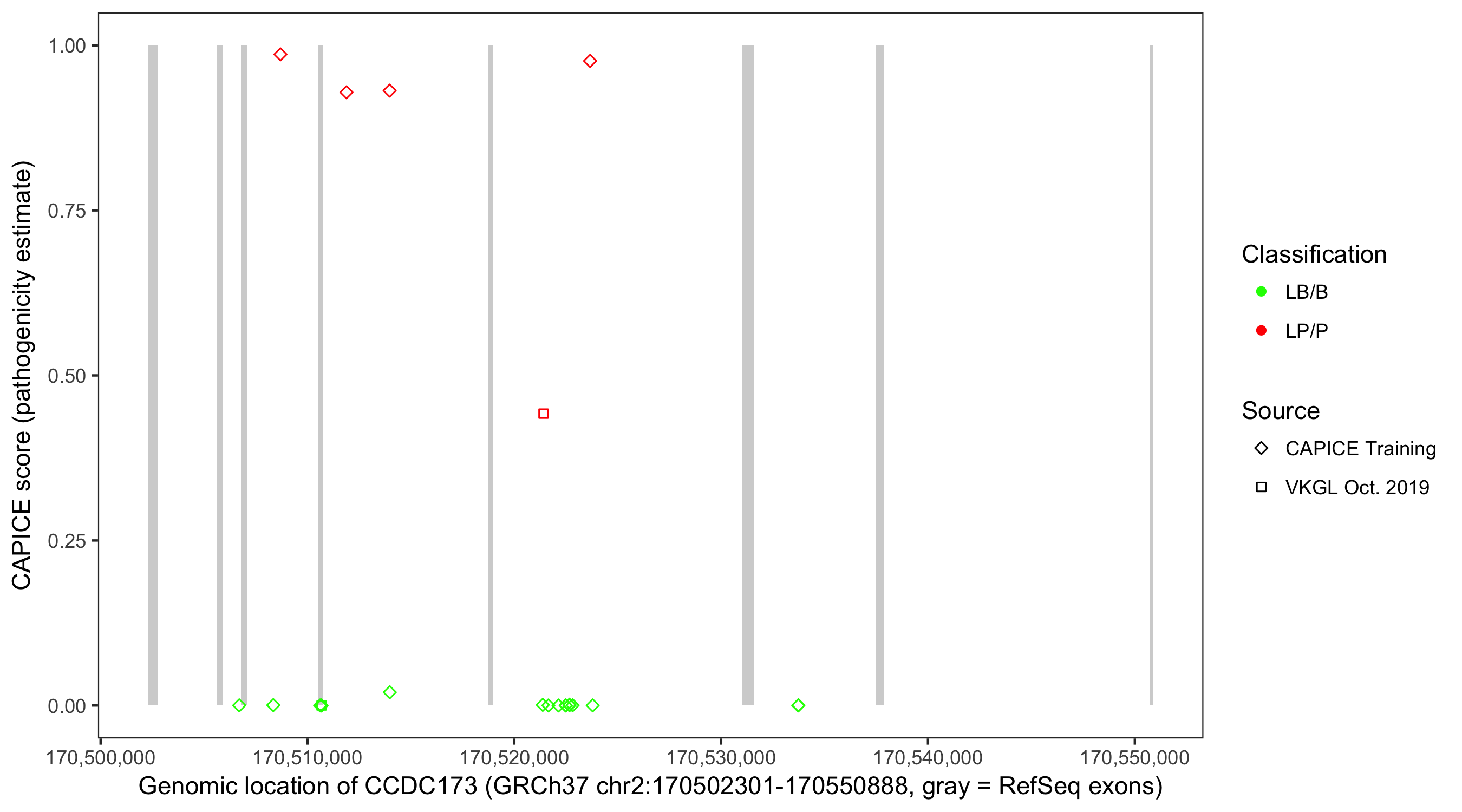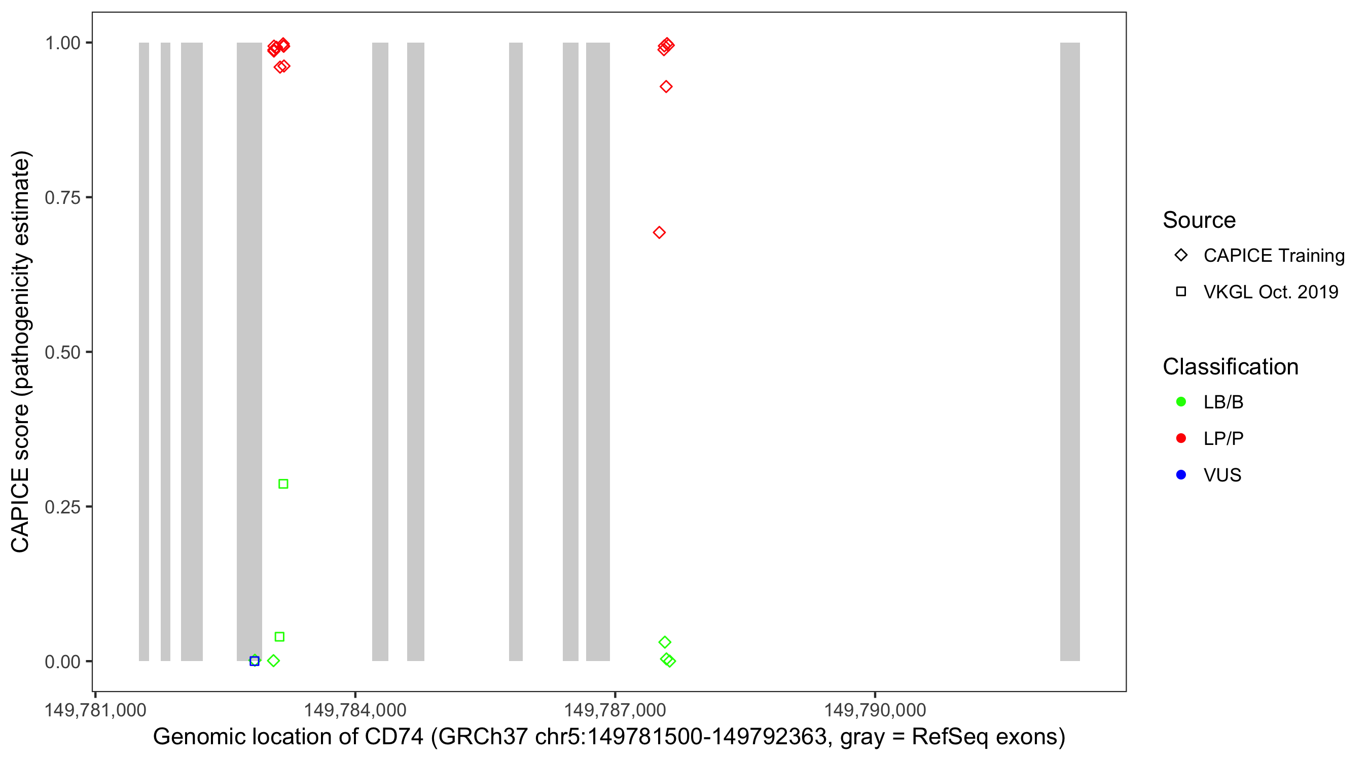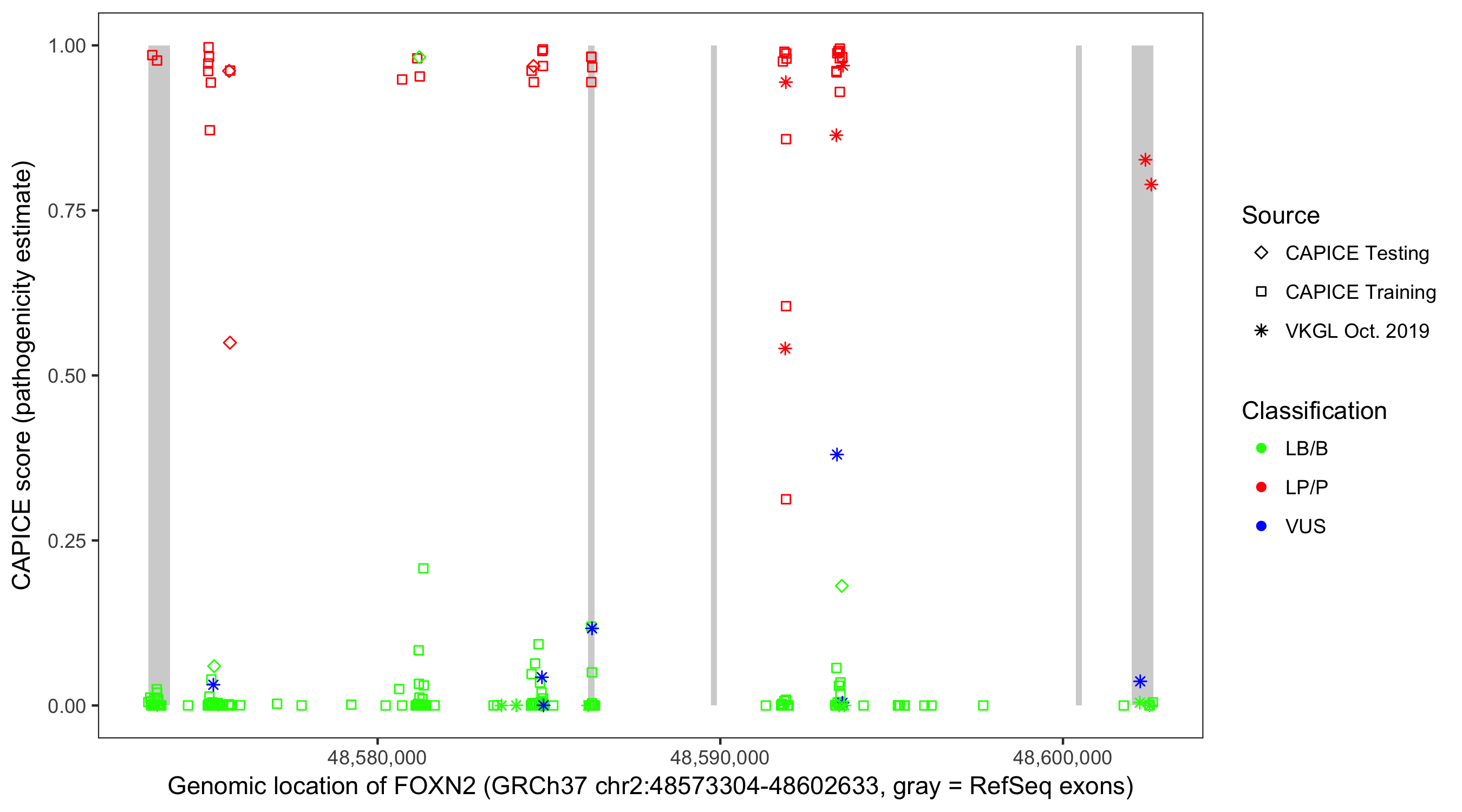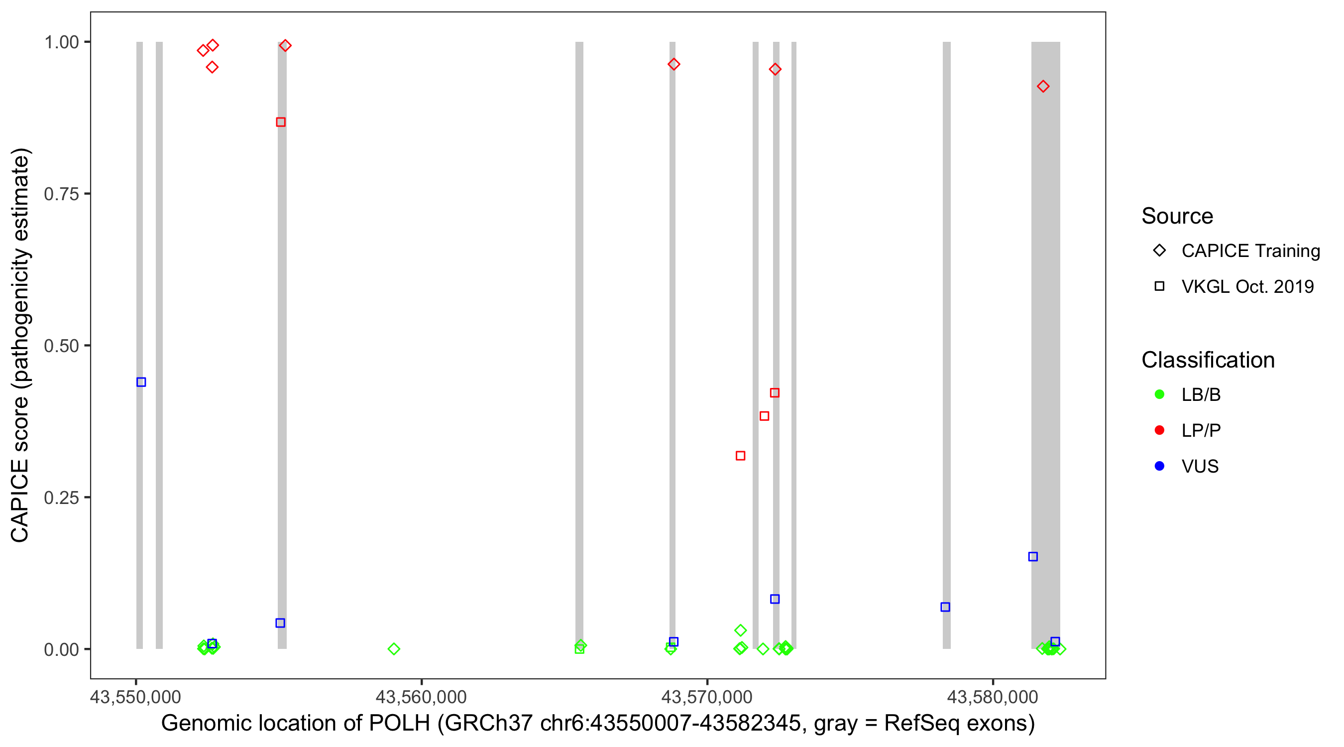 Shown are CAPICE train/test variants plus VKGL Oct 2019.
