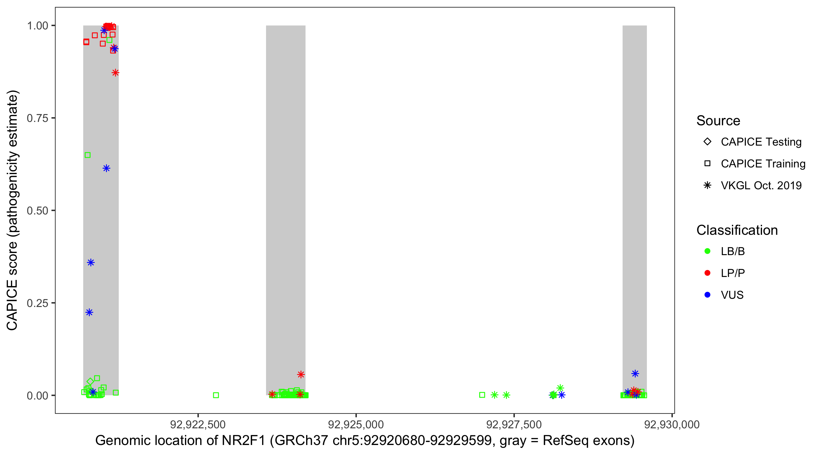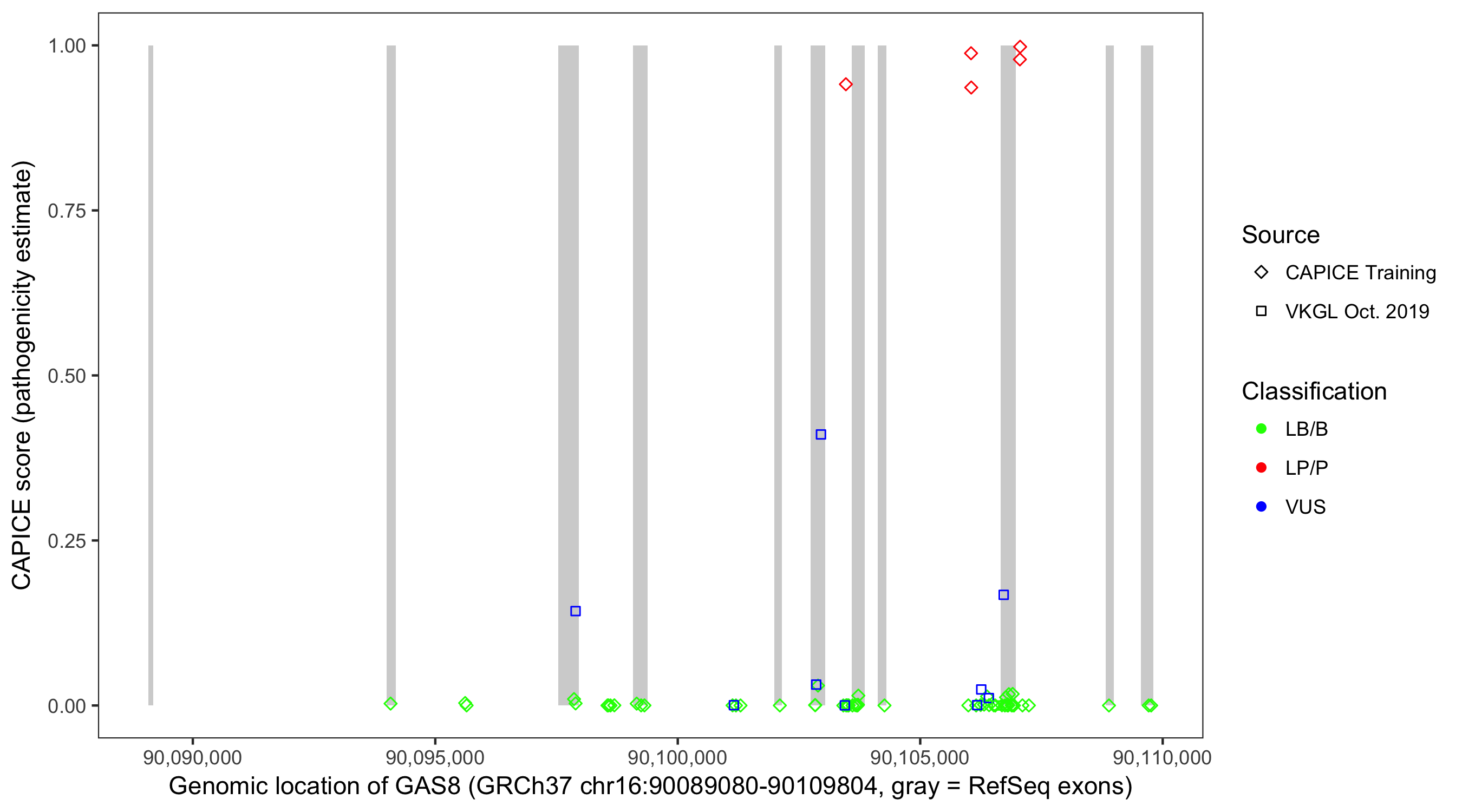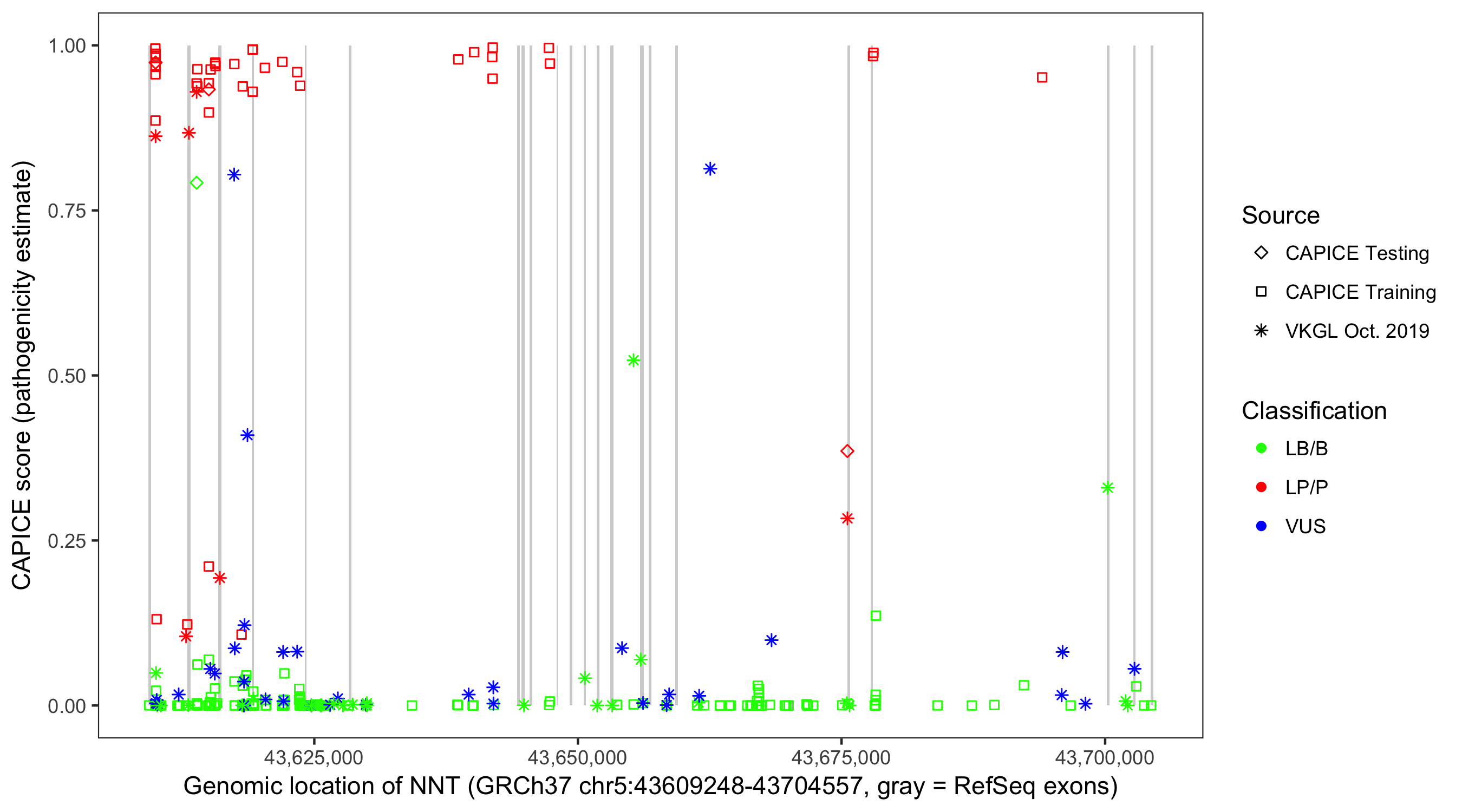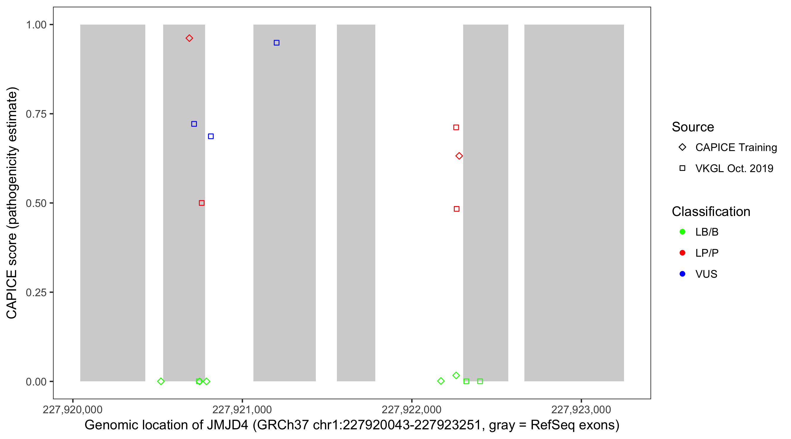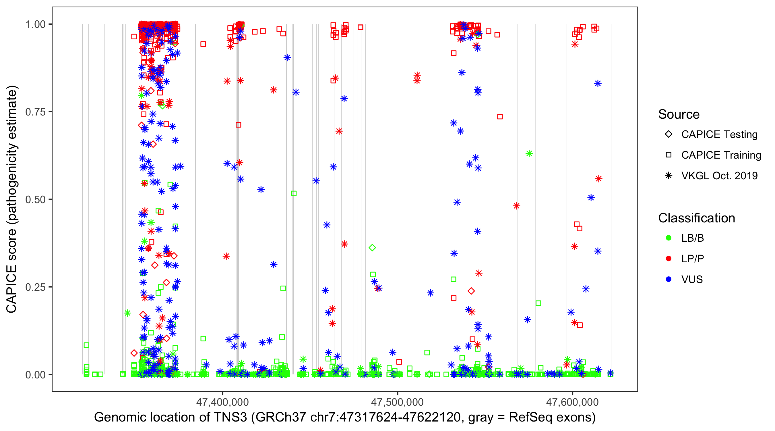 Shown are CAPICE train/test variants plus VKGL Oct 2019.