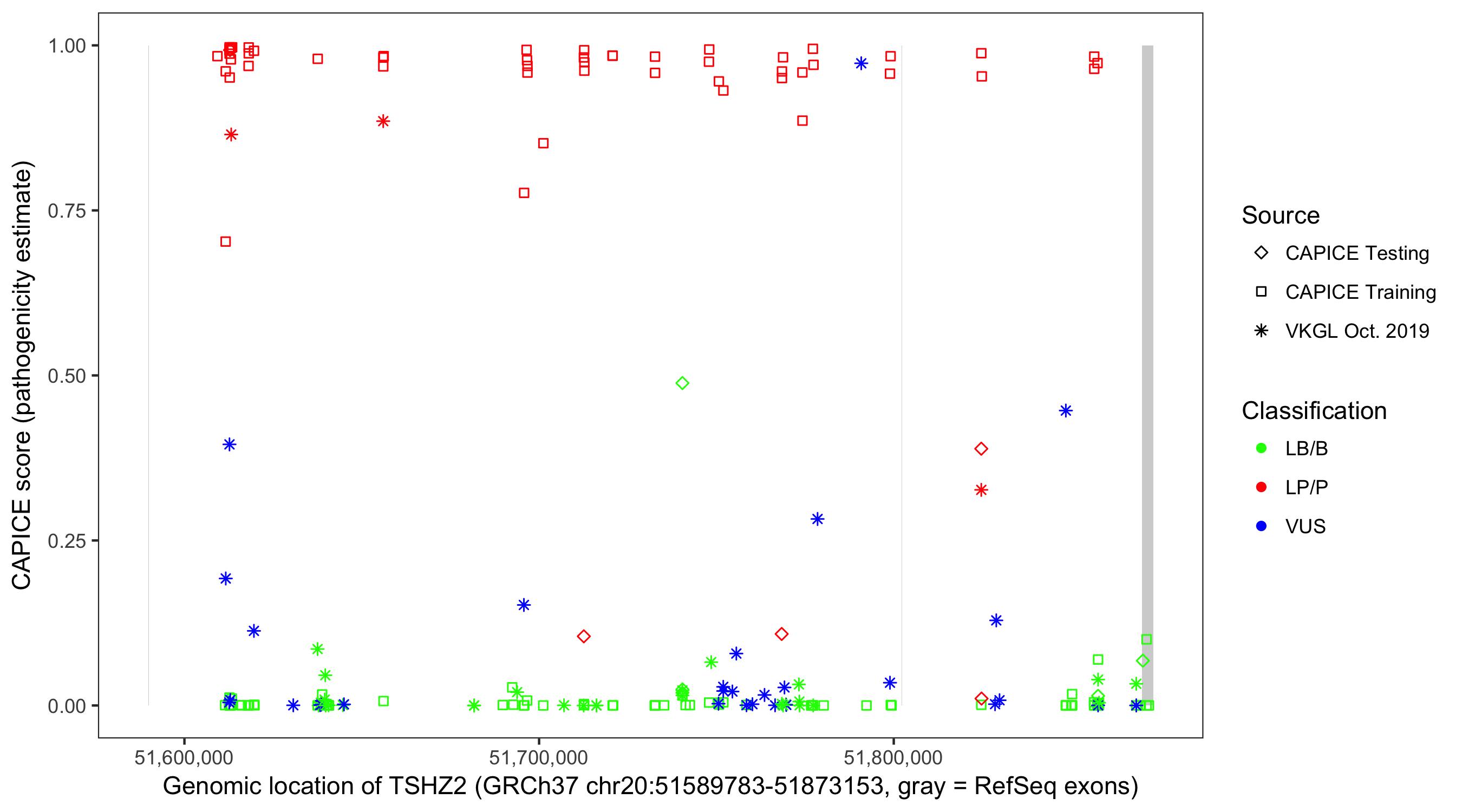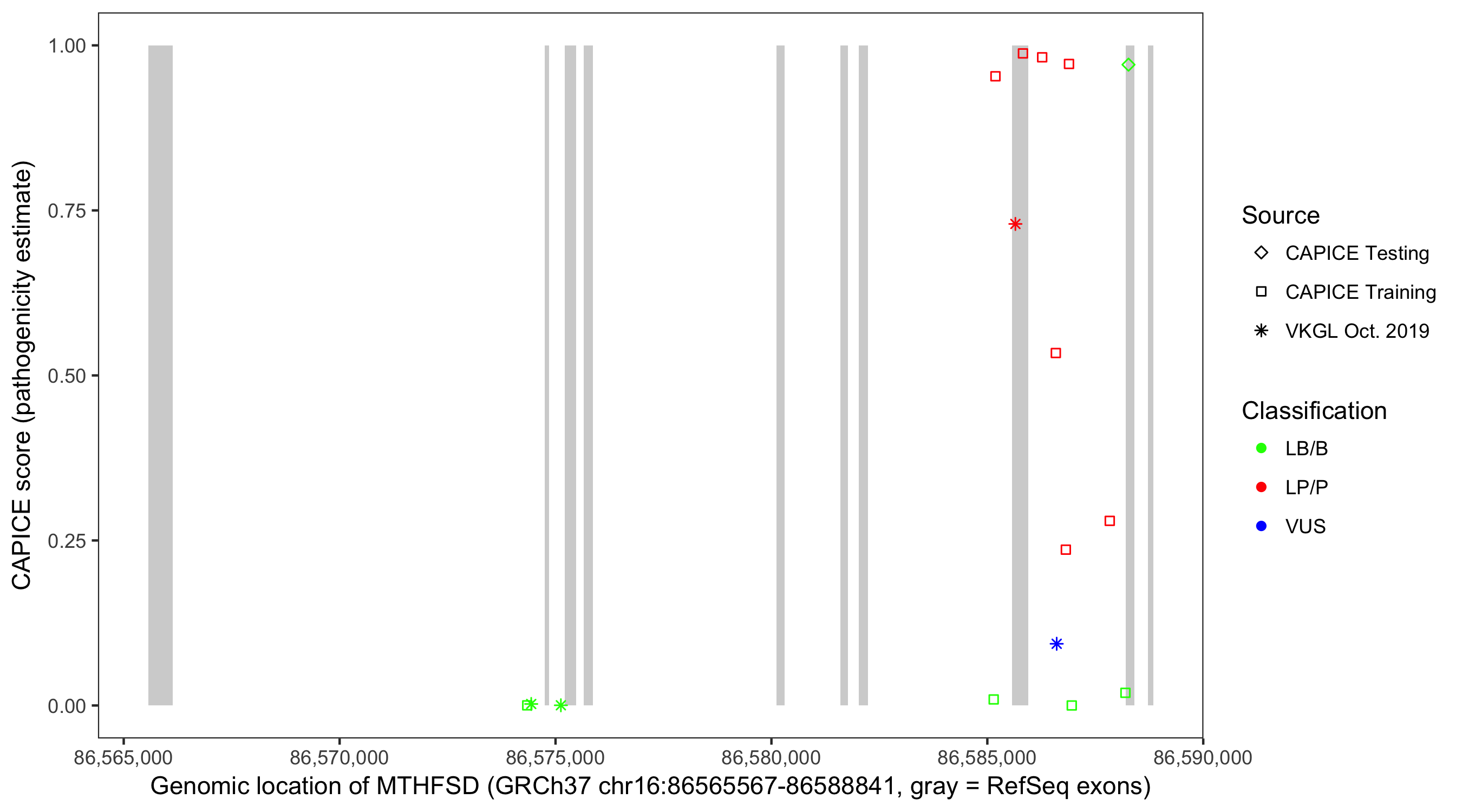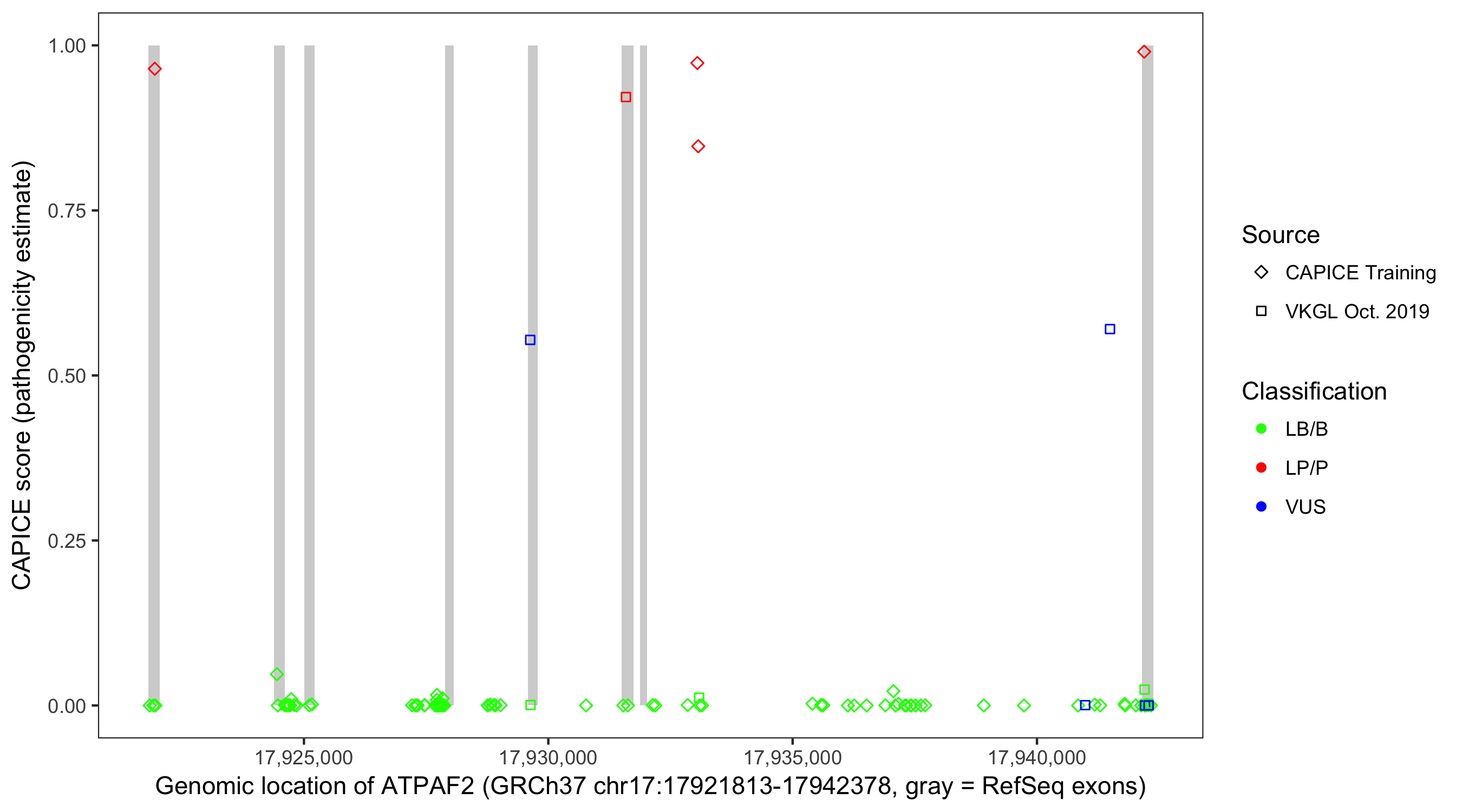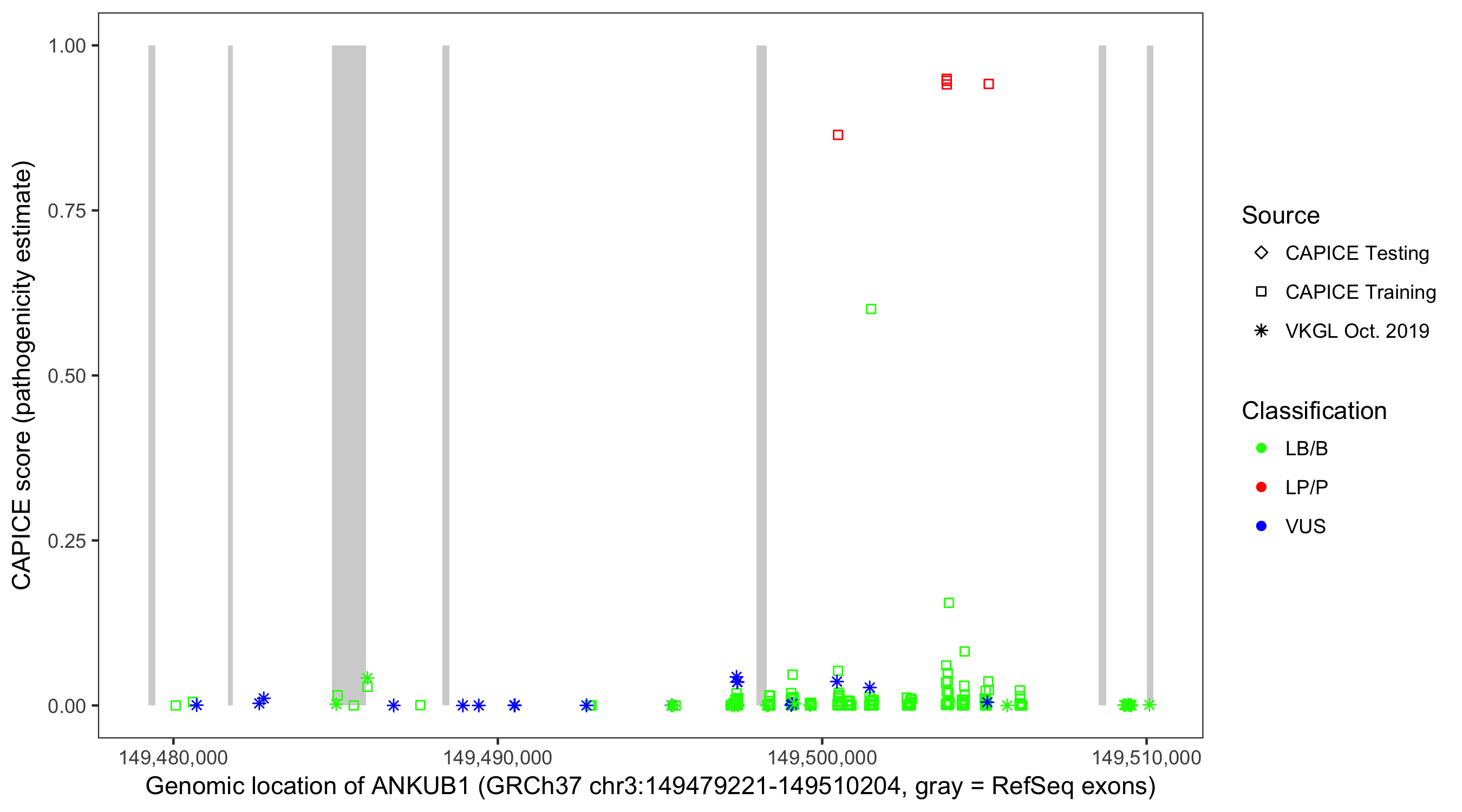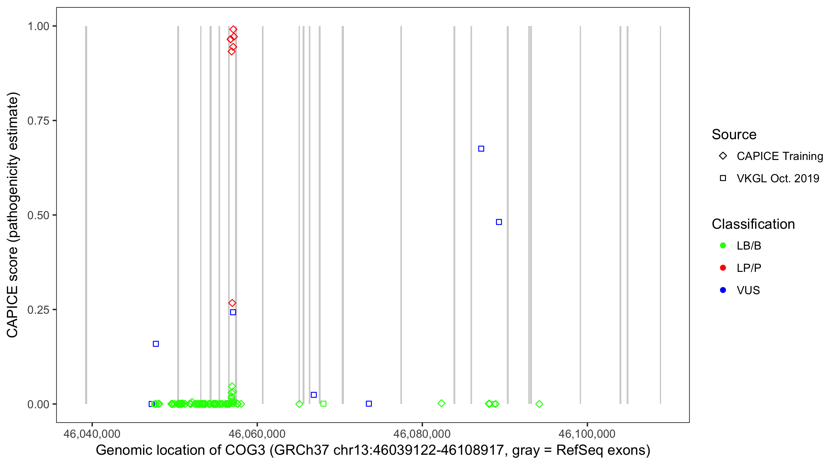 Shown are CAPICE train/test variants plus VKGL Oct 2019.