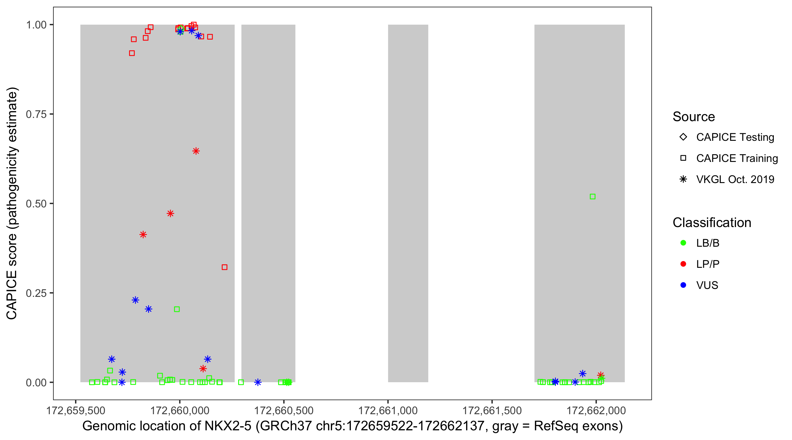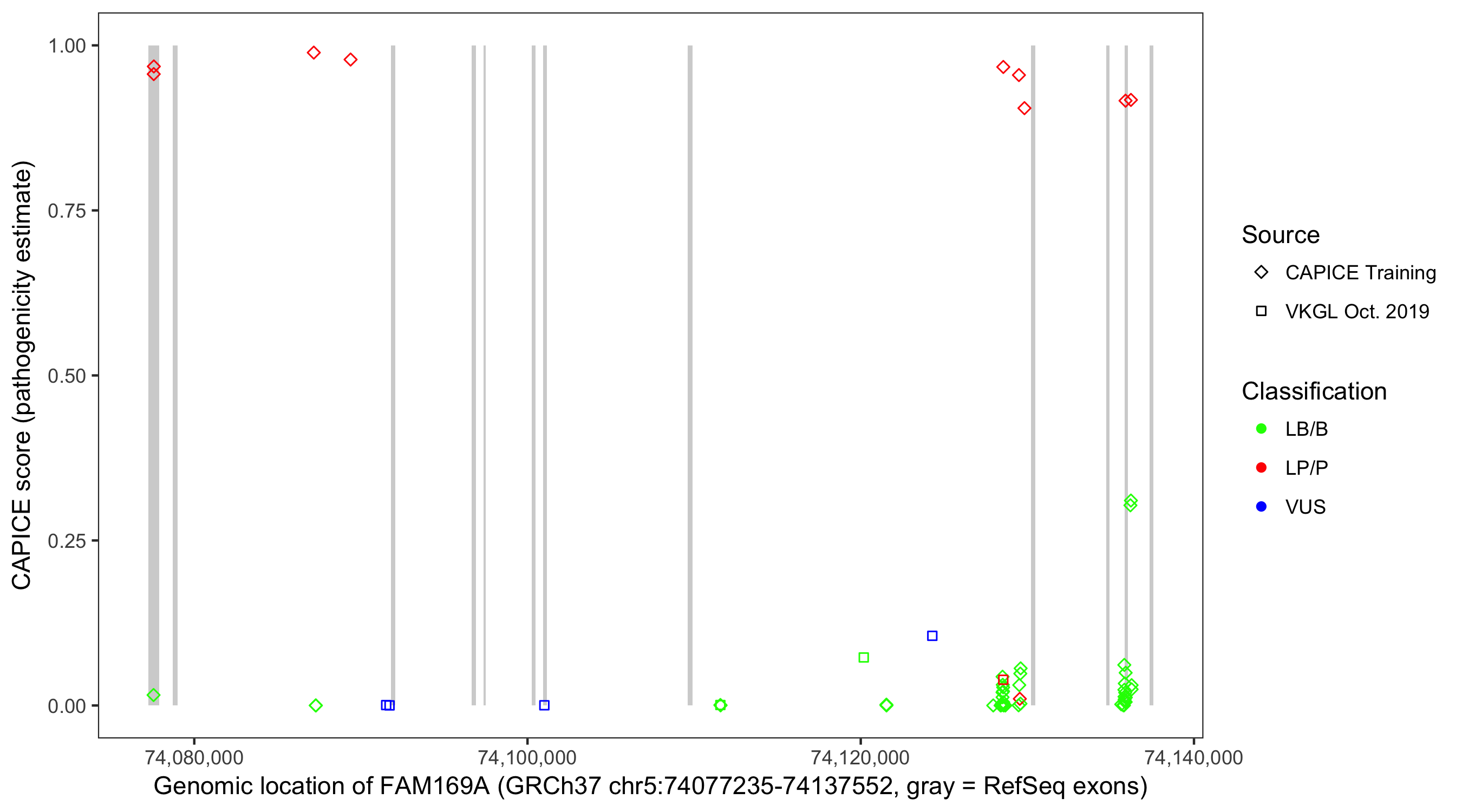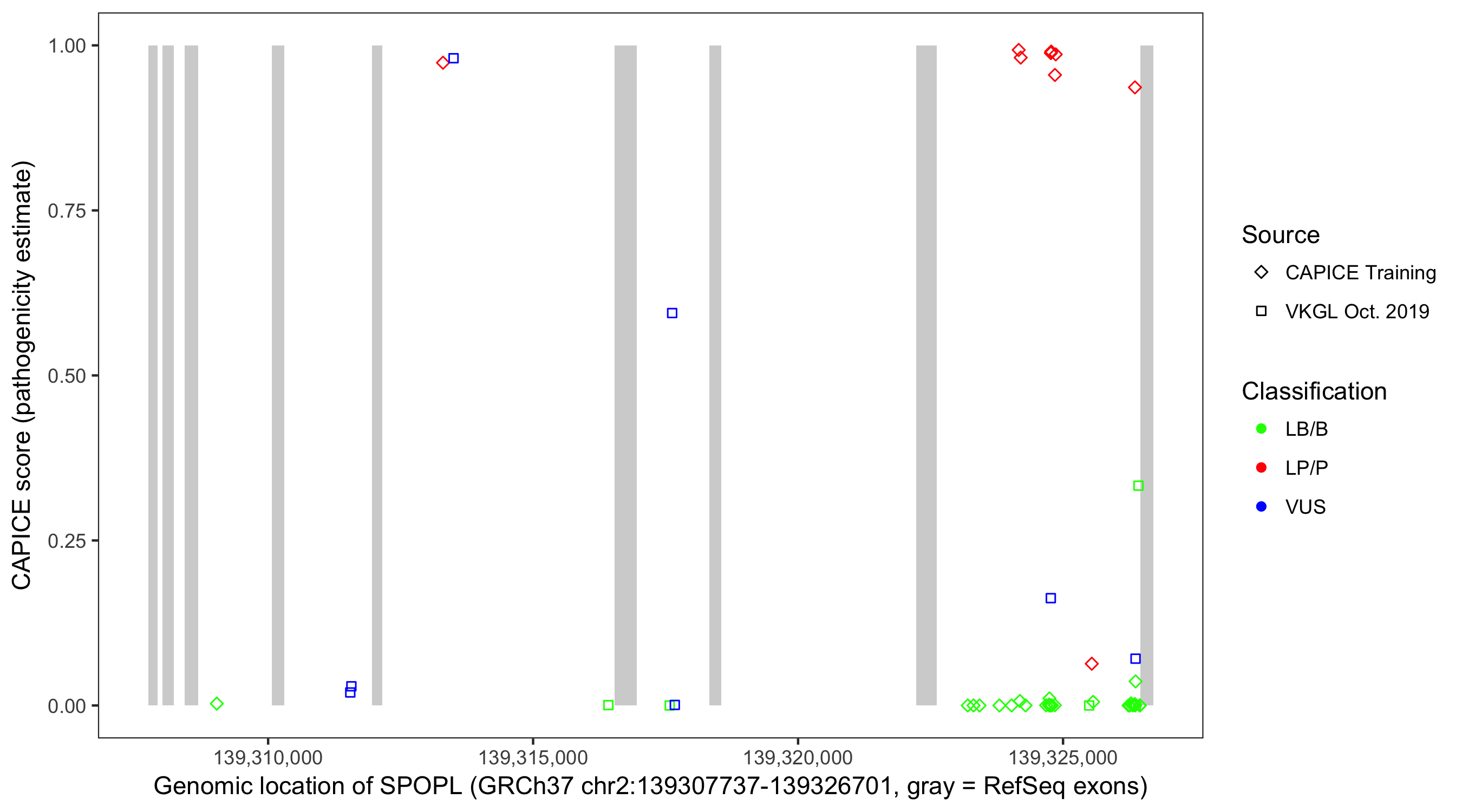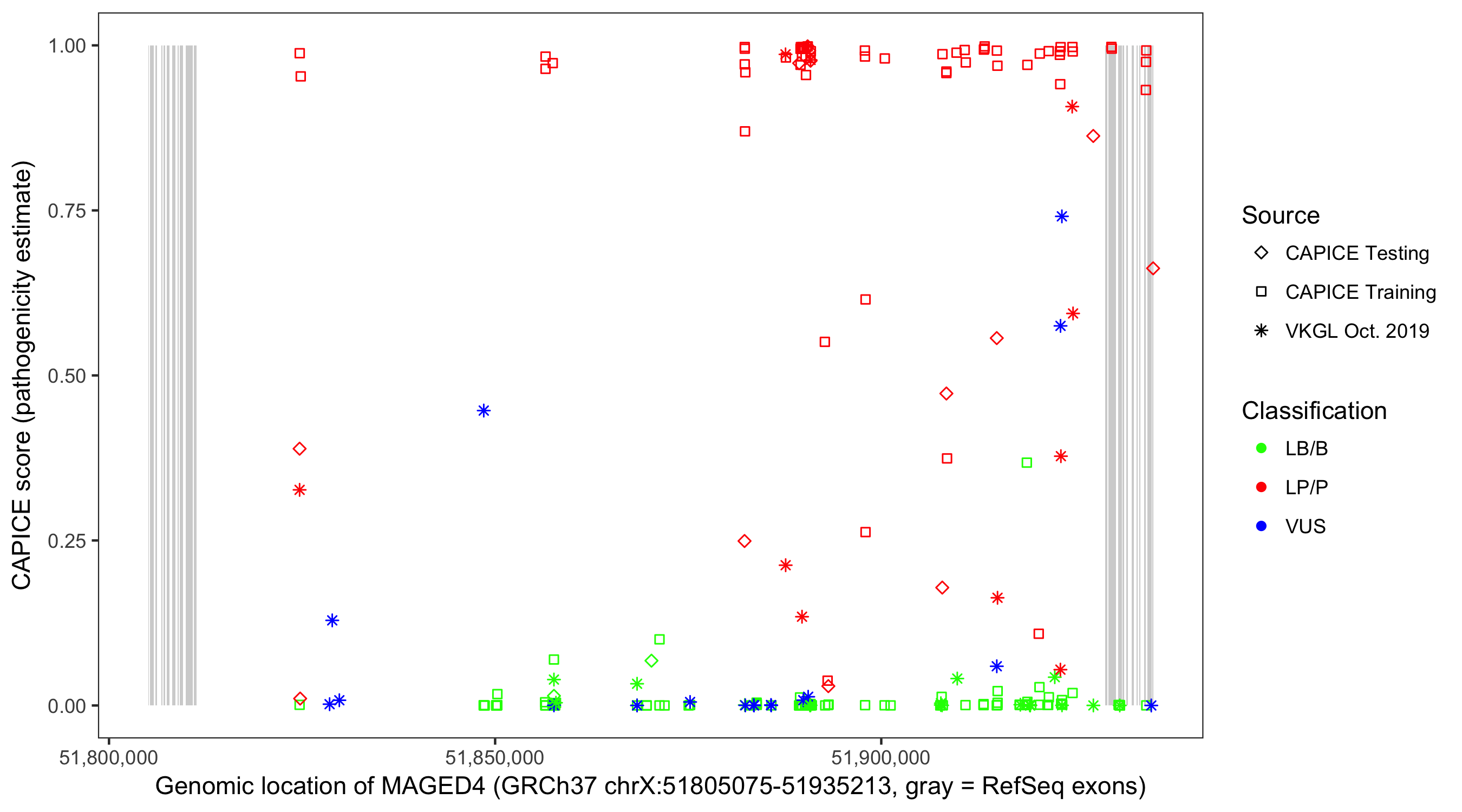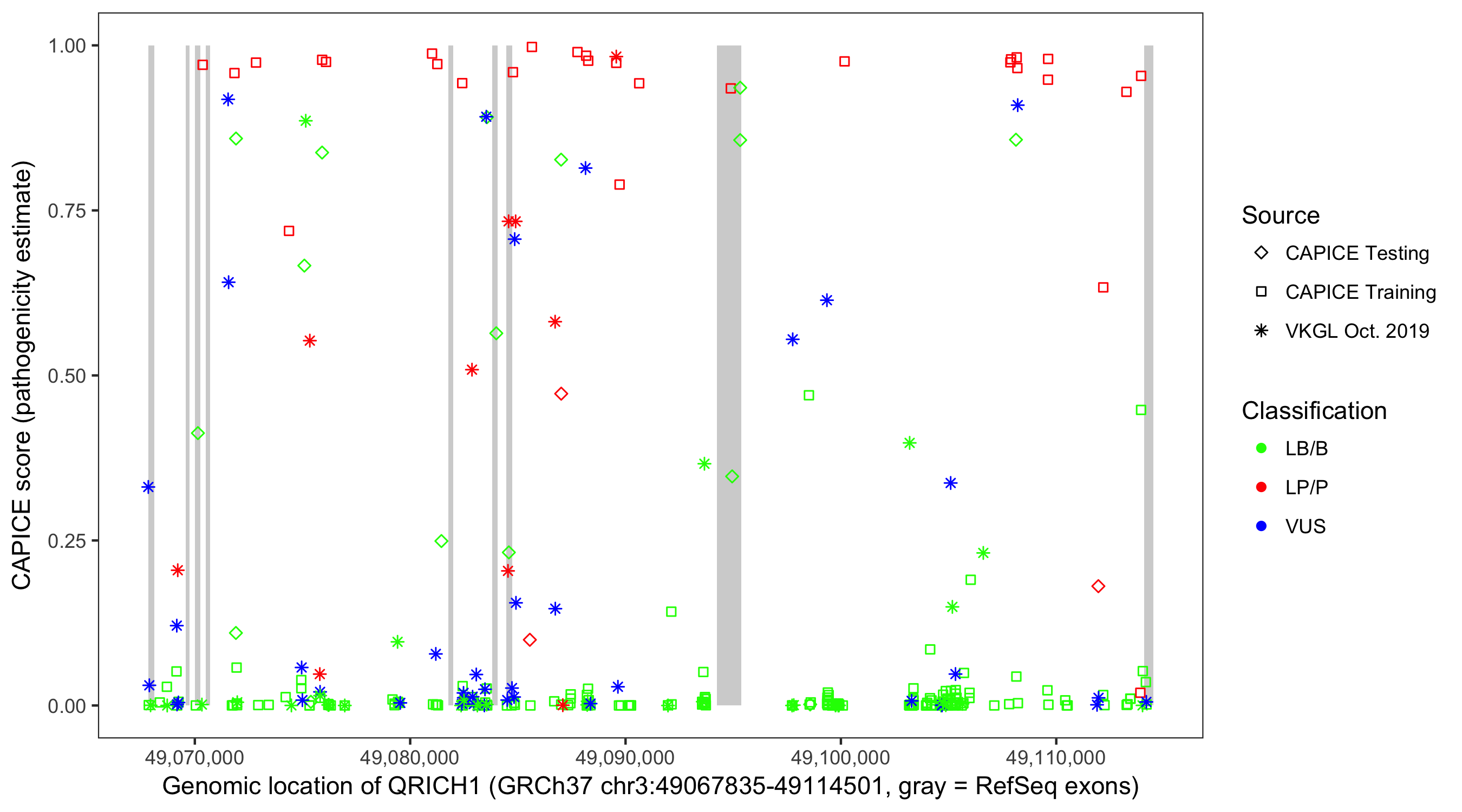 Shown are CAPICE train/test variants plus VKGL Oct 2019.