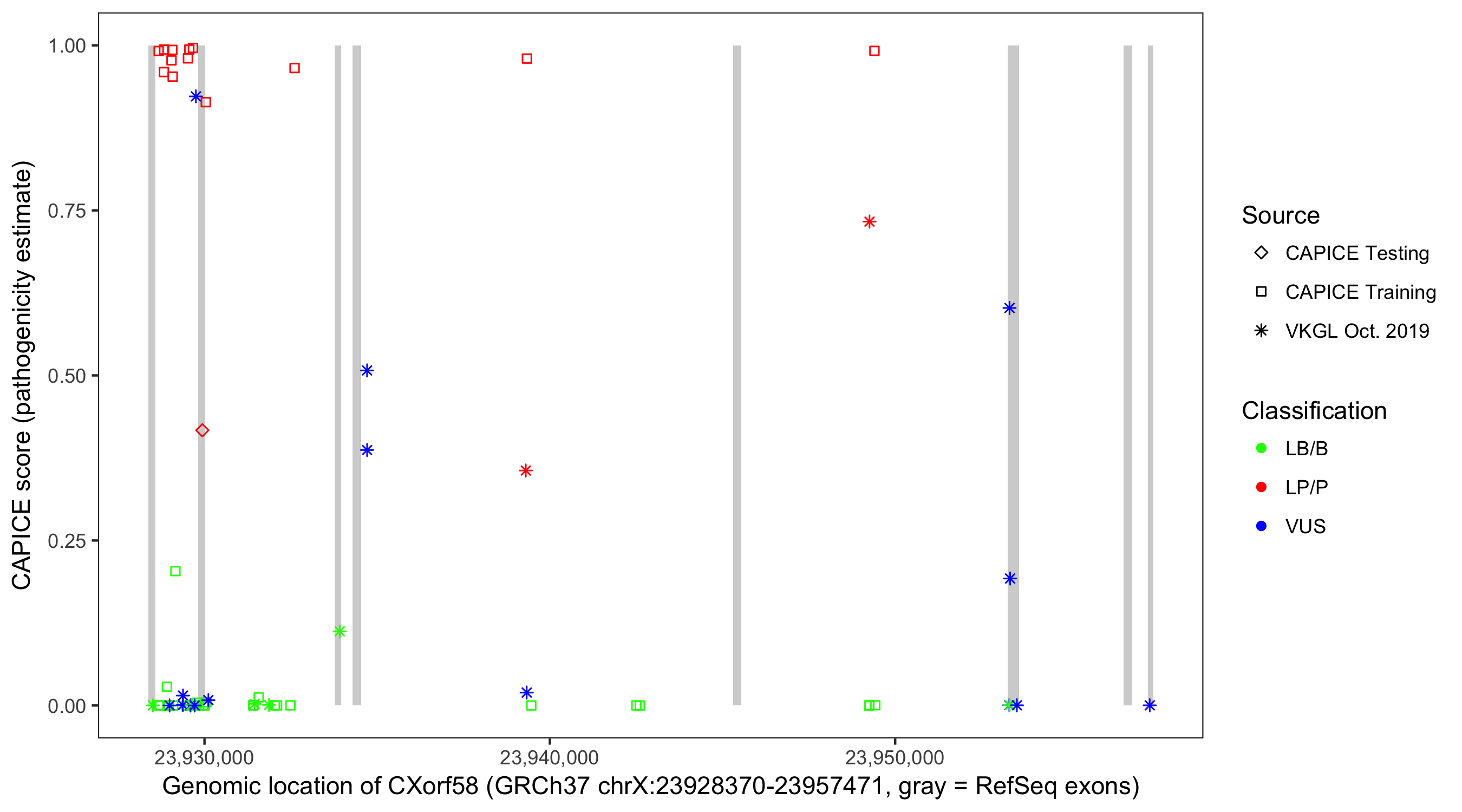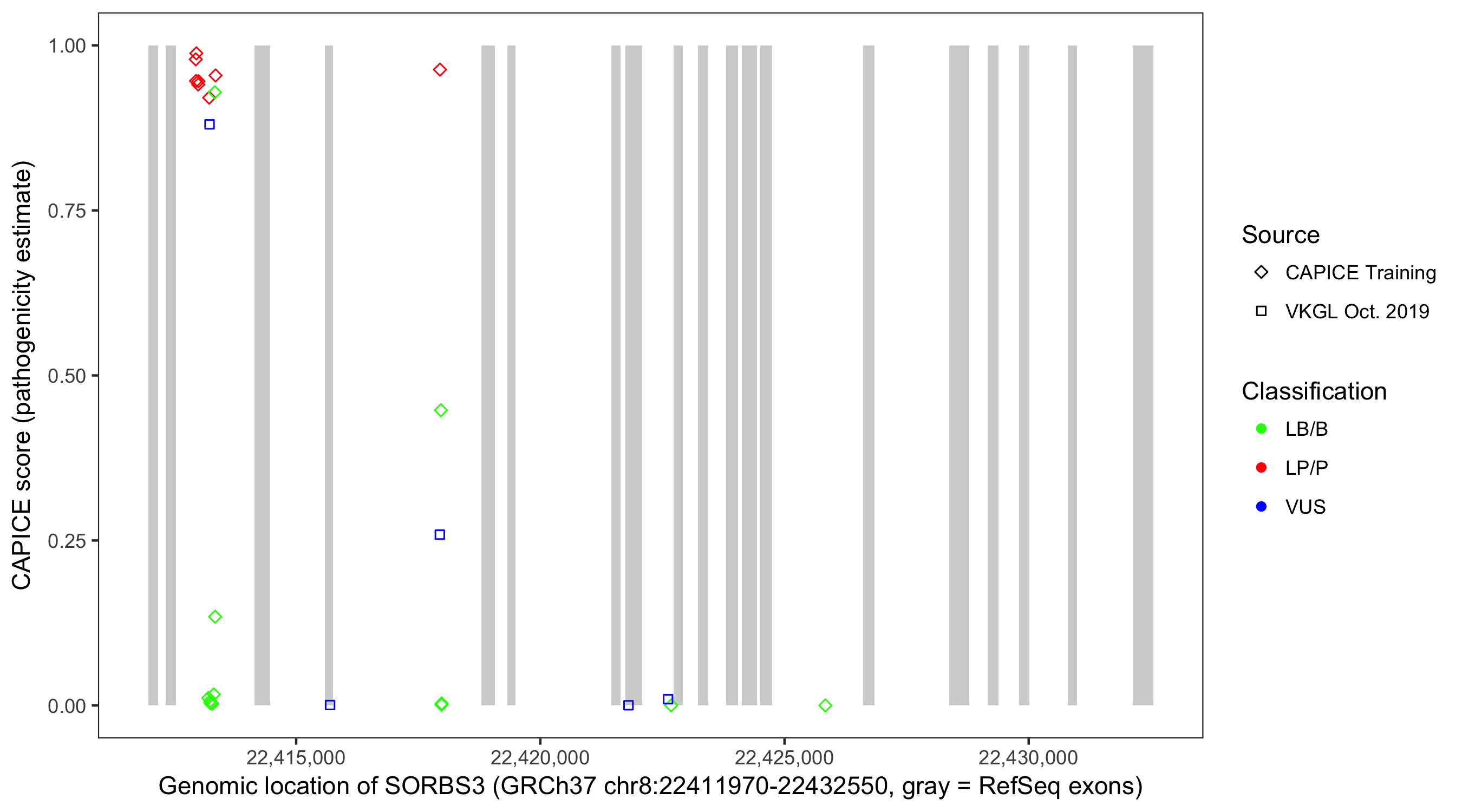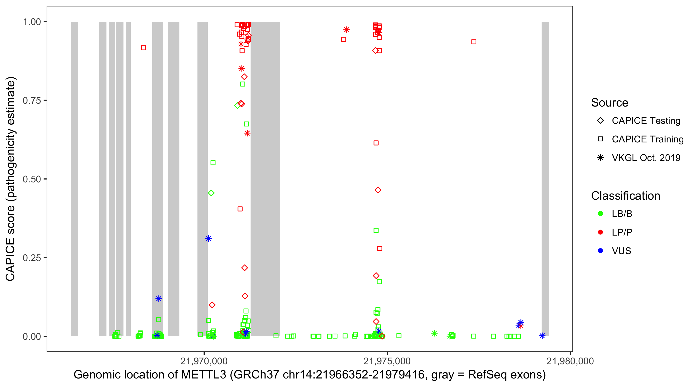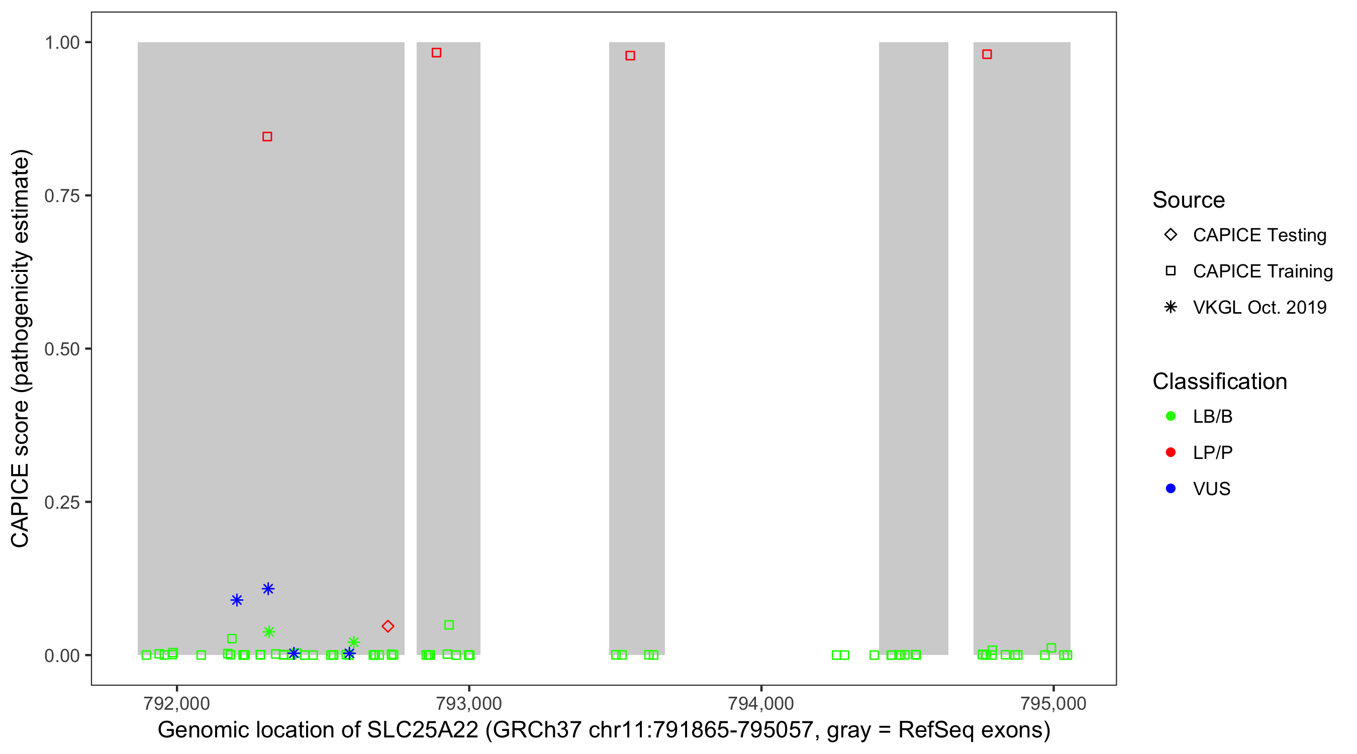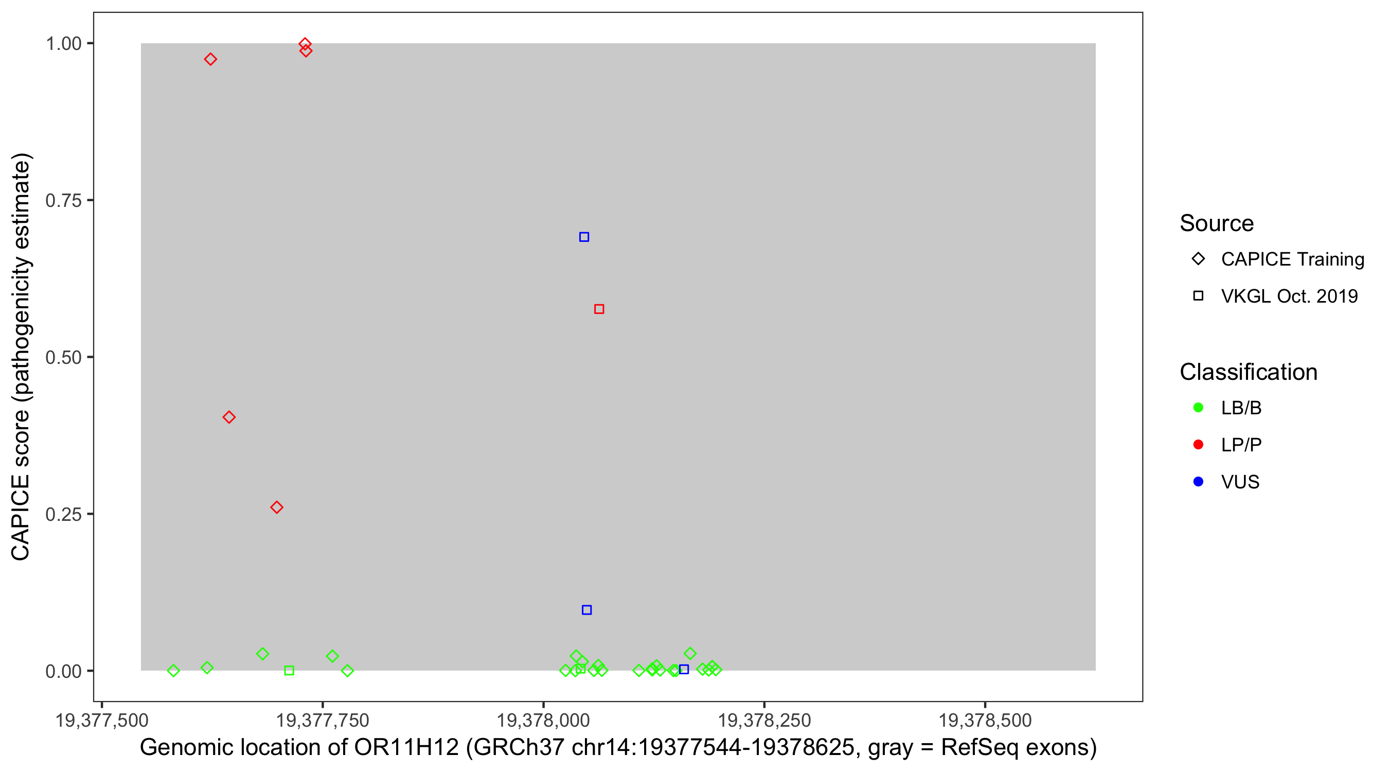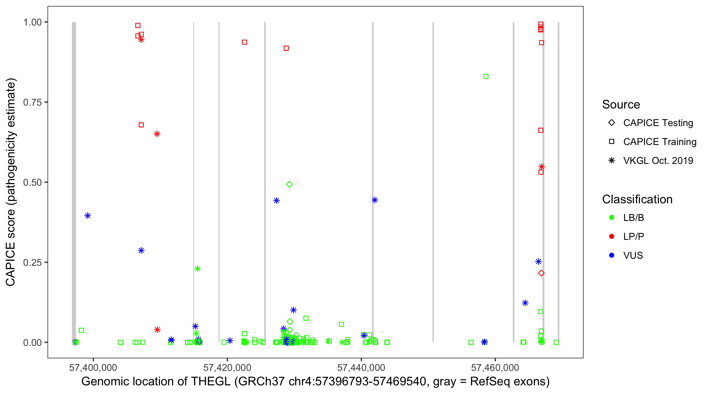 Shown are CAPICE train/test variants plus VKGL Oct 2019.